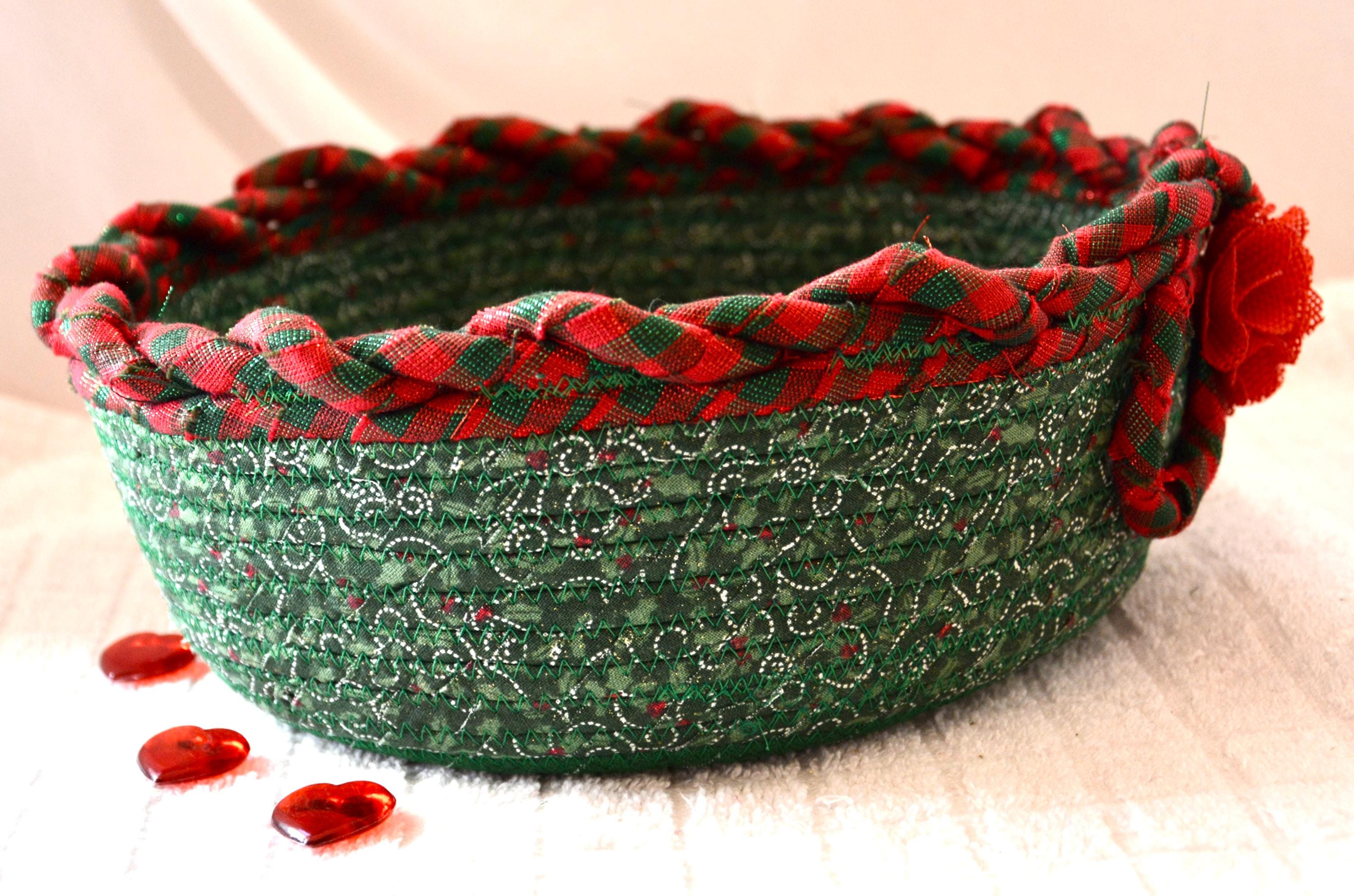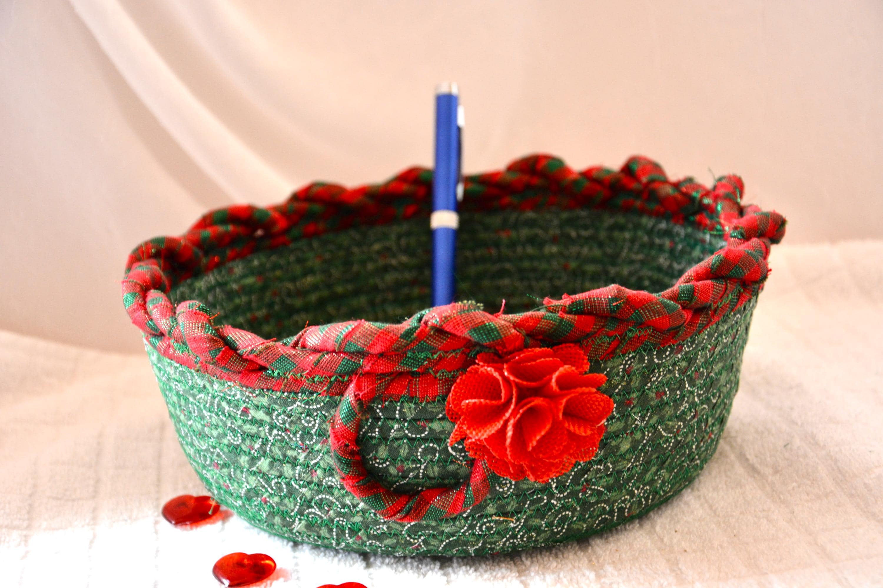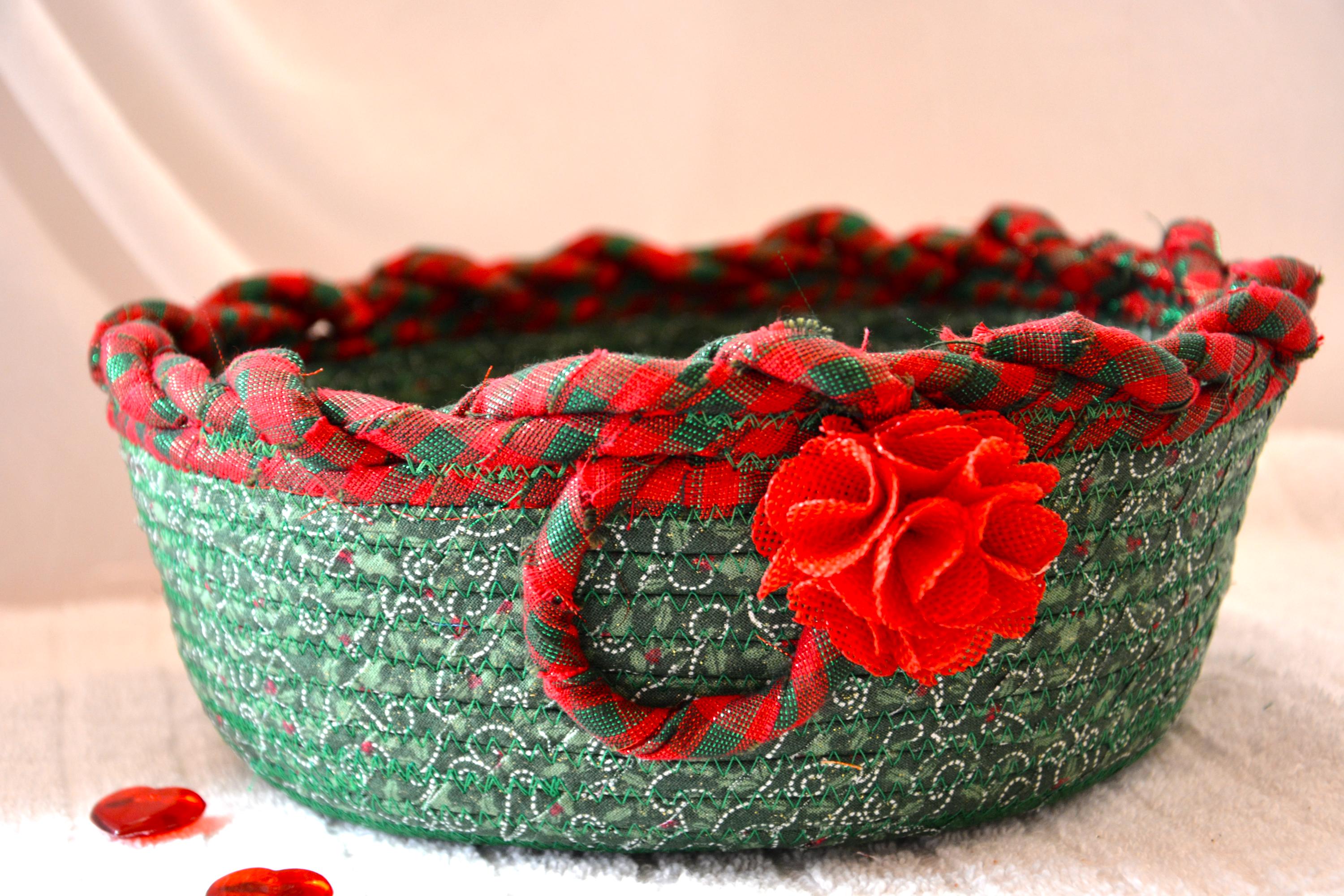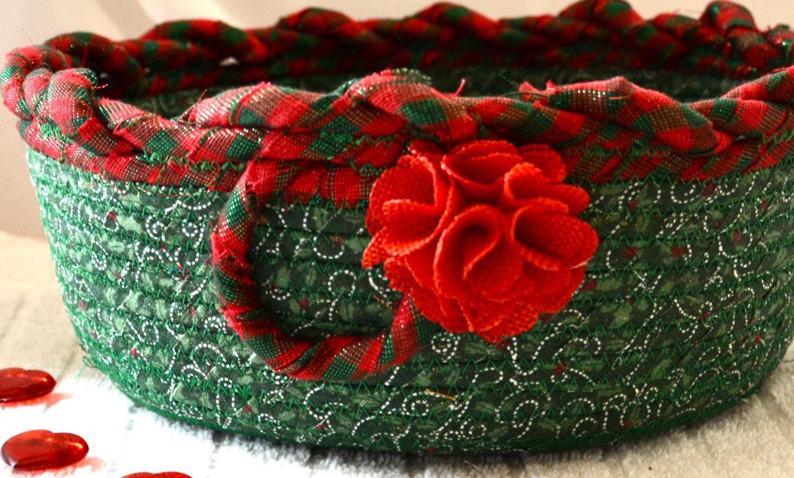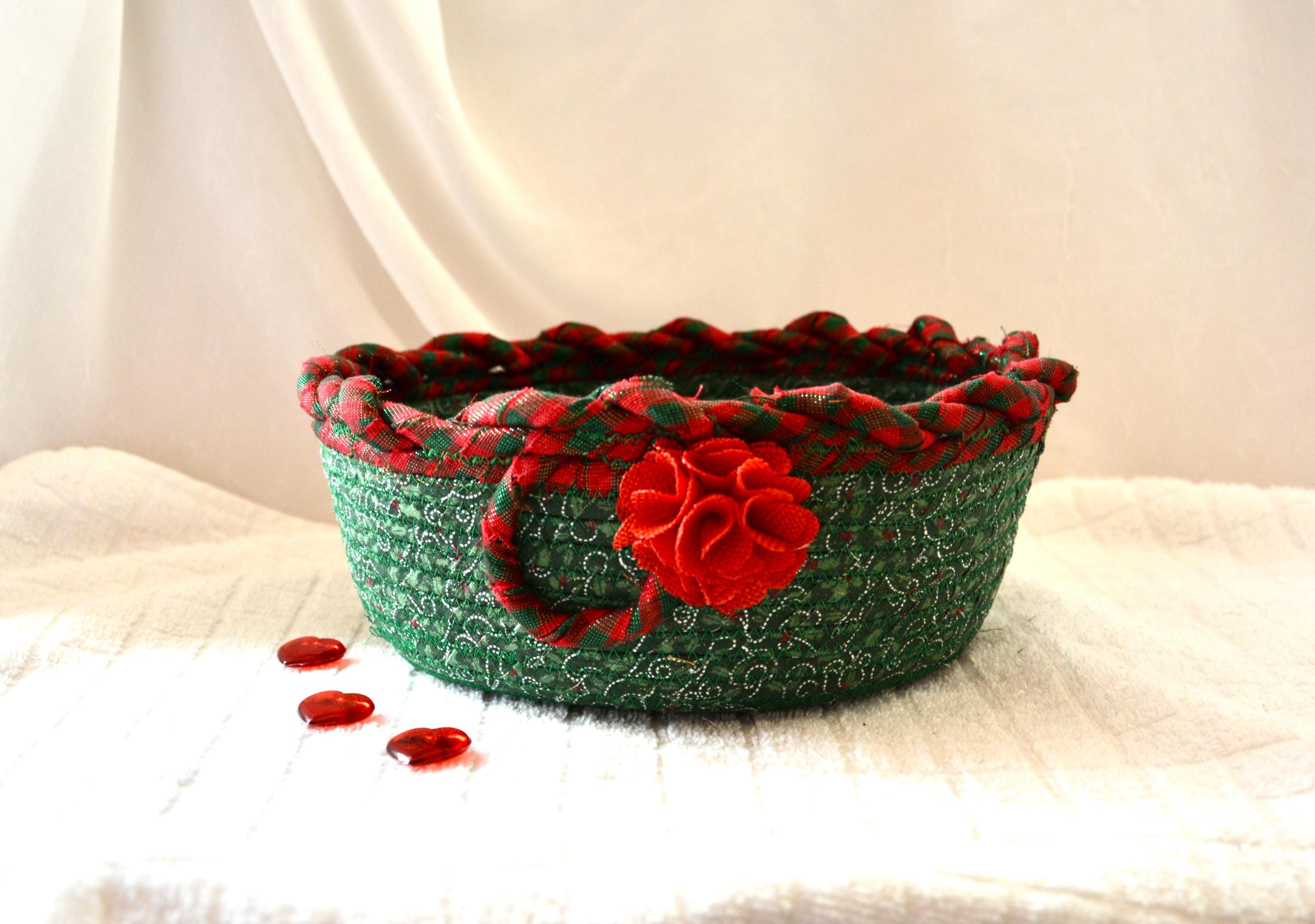 I hand wrapped these high quality fabrics around cotton line, which I then hand coiled and machine quilted to make it sturdy. I used the raw edge technique with some fray to add a wonderful shabby chic texture. I just love the pretty shiny highlights in the trim fabric! So festive! The pretty flower on the basket is included for nice accent.