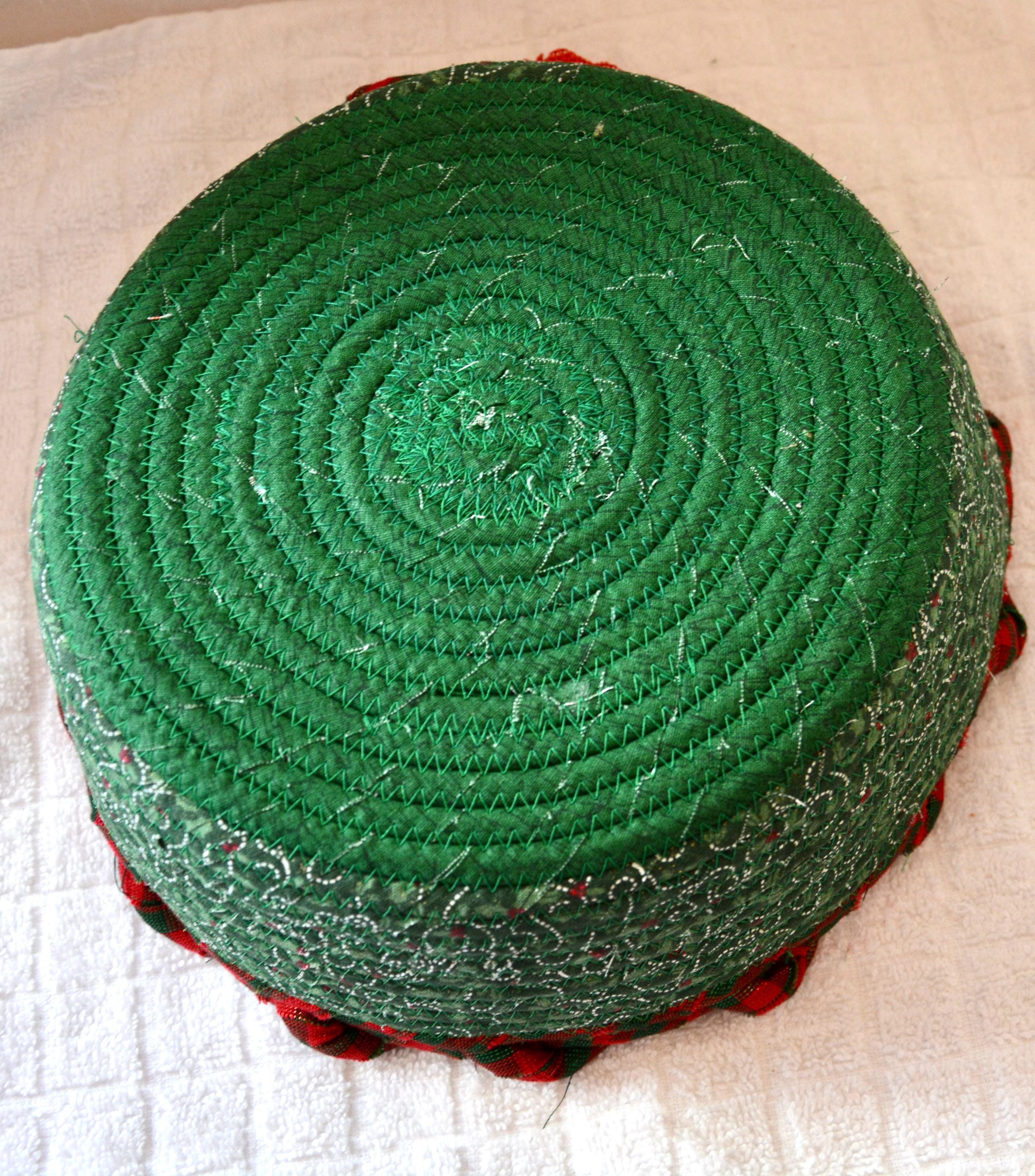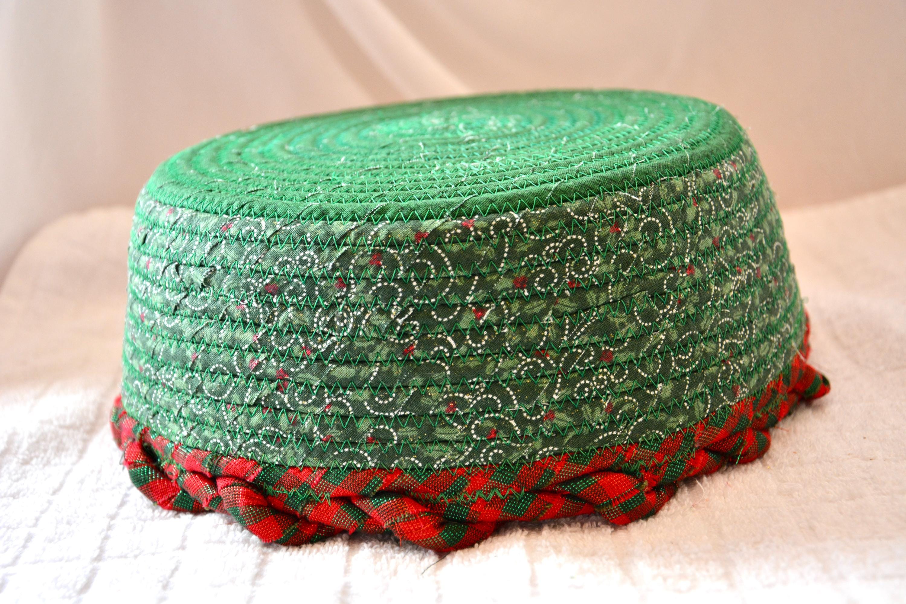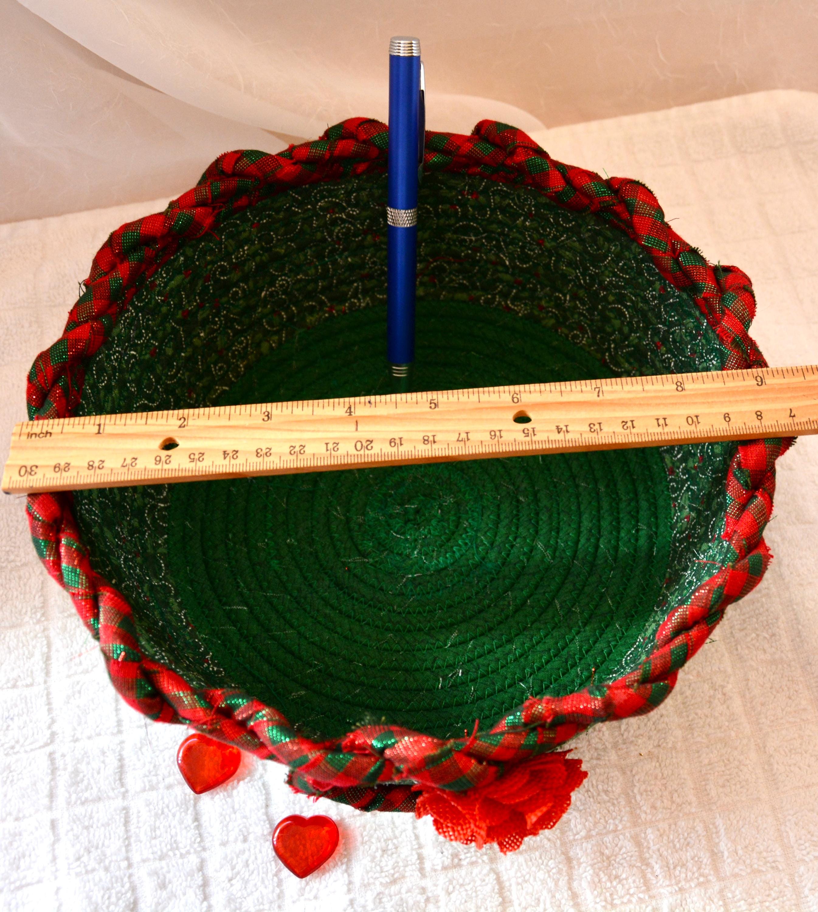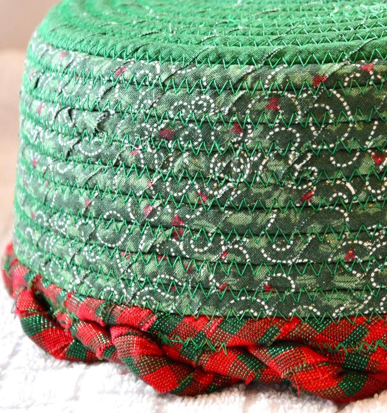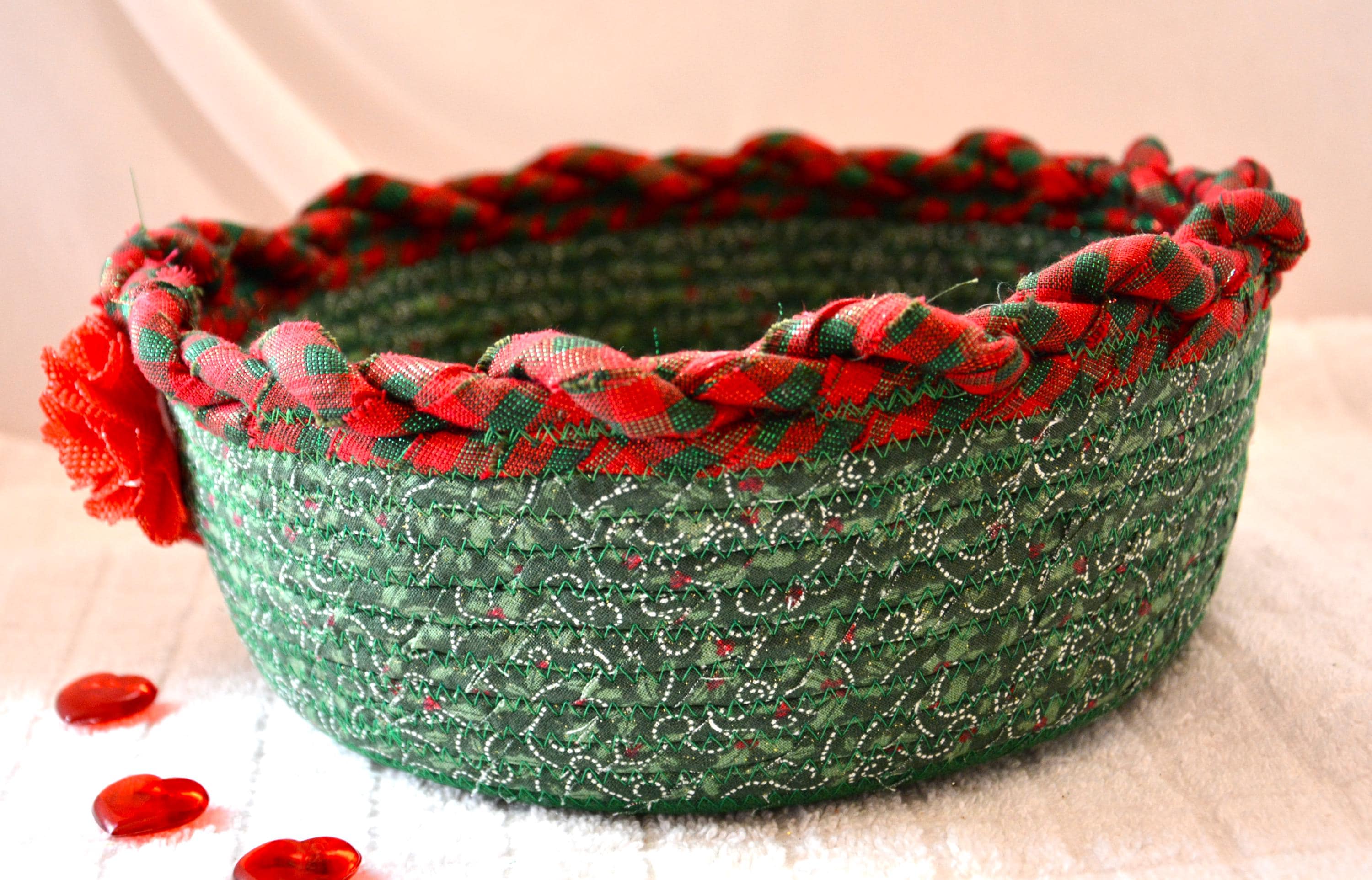 I hand wrapped these high quality fabrics around cotton line, which I then hand coiled and machine quilted to make it sturdy. I used the raw edge technique with some fray to add a wonderful shabby chic texture. I just love the pretty shiny highlights in the trim fabric! So festive! The pretty flower on the basket is included for nice accent.