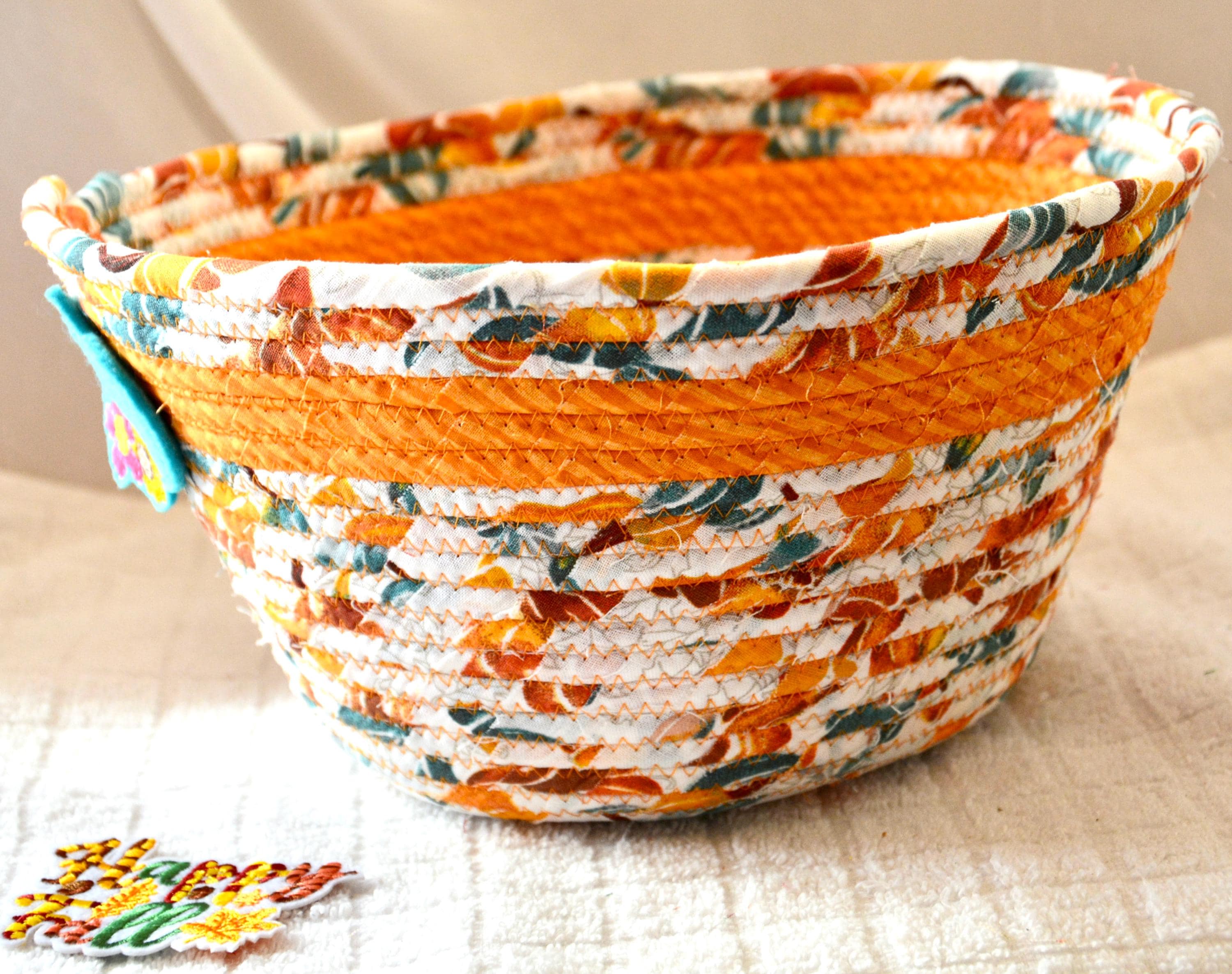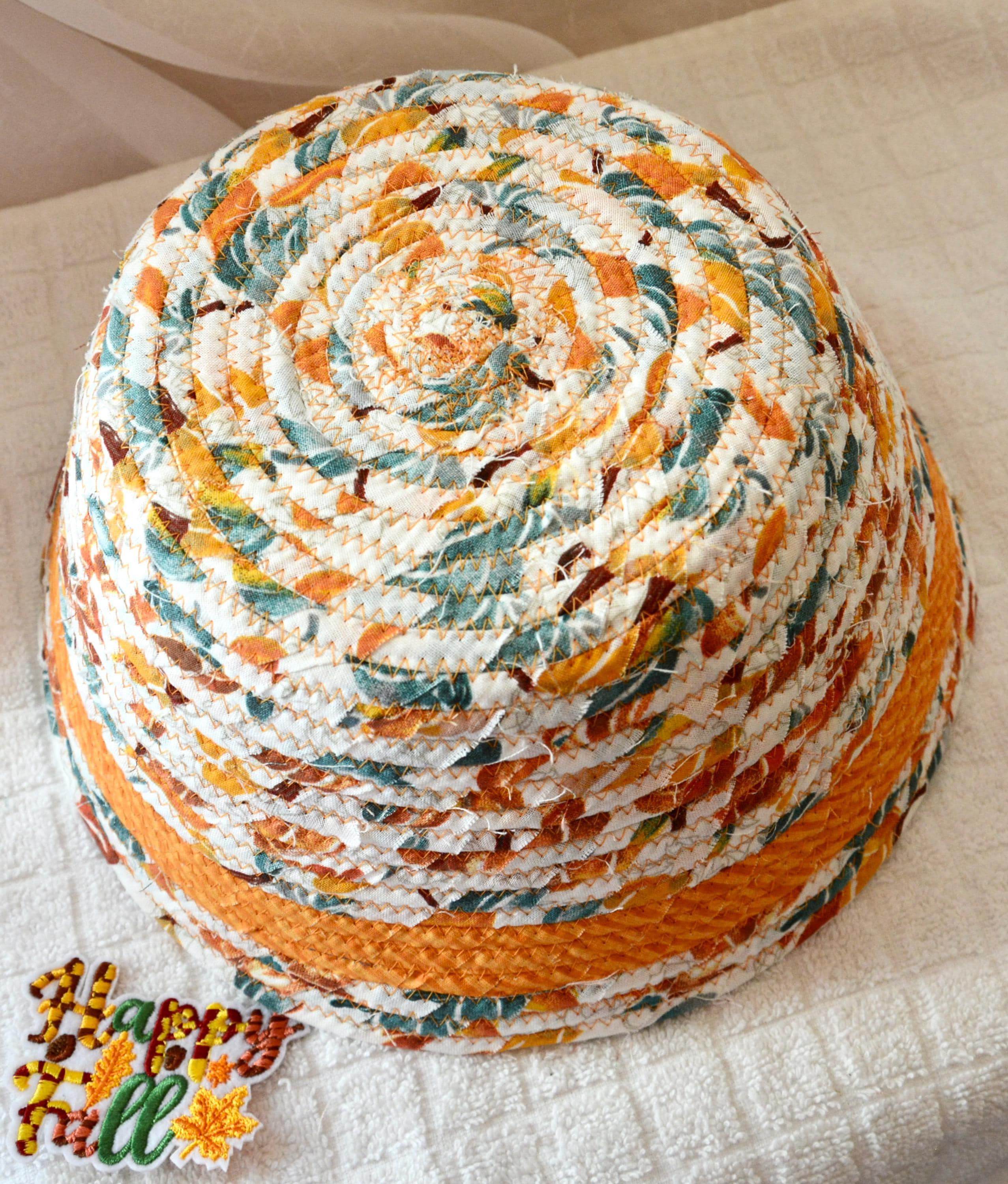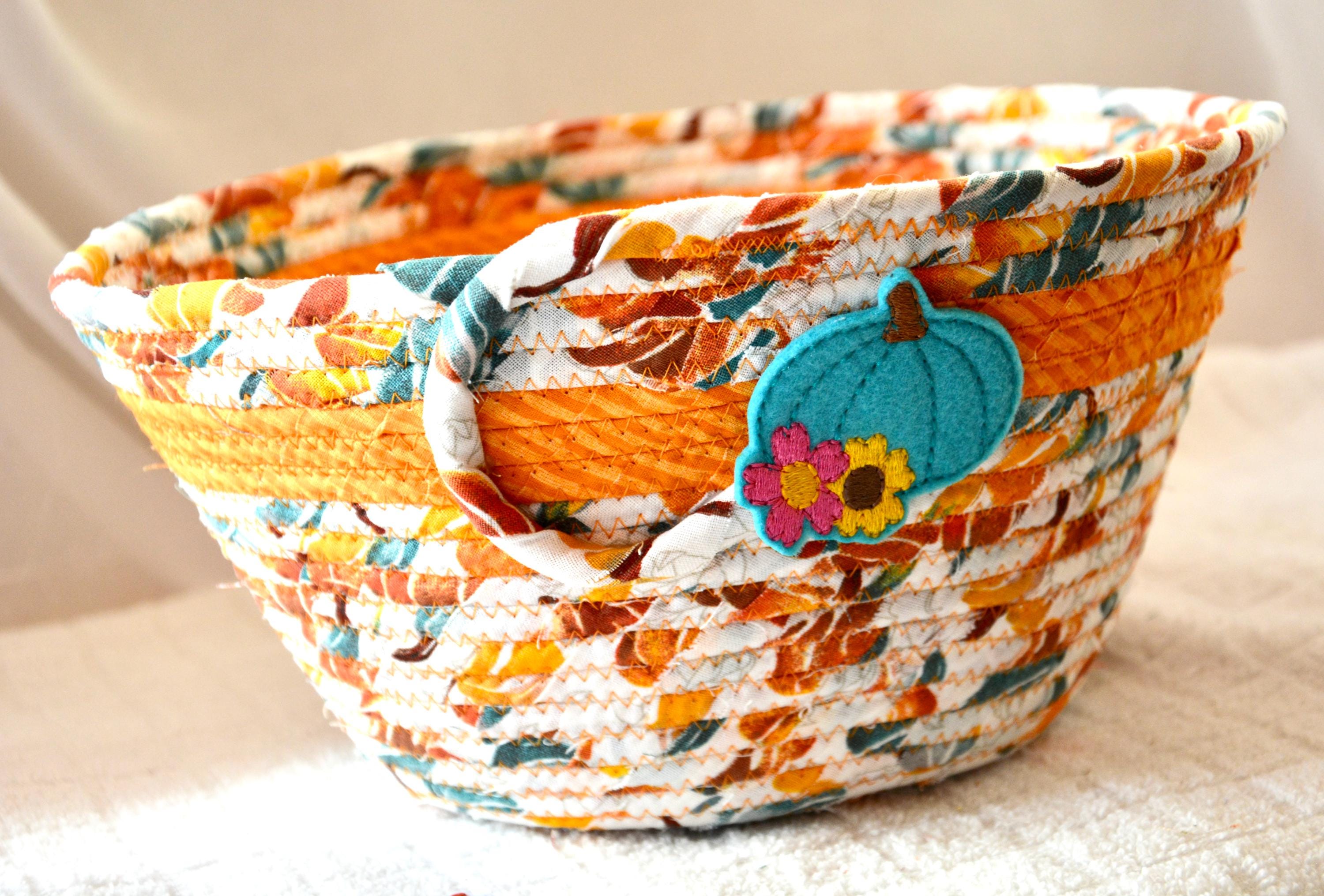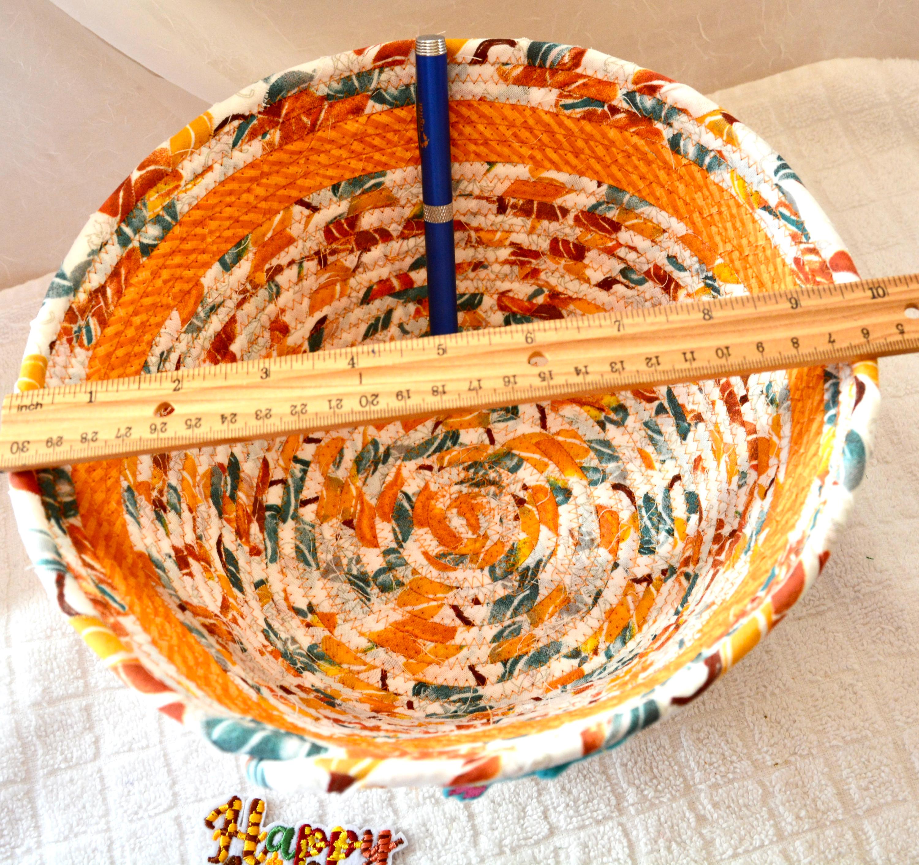 I hand wrapped these wonderful fabrics around cotton line, which I then hand coiled and machine quilted to make it sturdy. I used the raw edge technique with some fray for a great shabby chic texture. These rich fabrics show on the inside too! All fabrics are 100% cotton! I just love the beige fabric, it has rich pumpkin and teal highlights that give it a nice pop for your table! The pretty pumpkin on the basket is included for a nice accent.