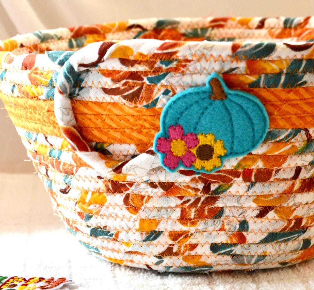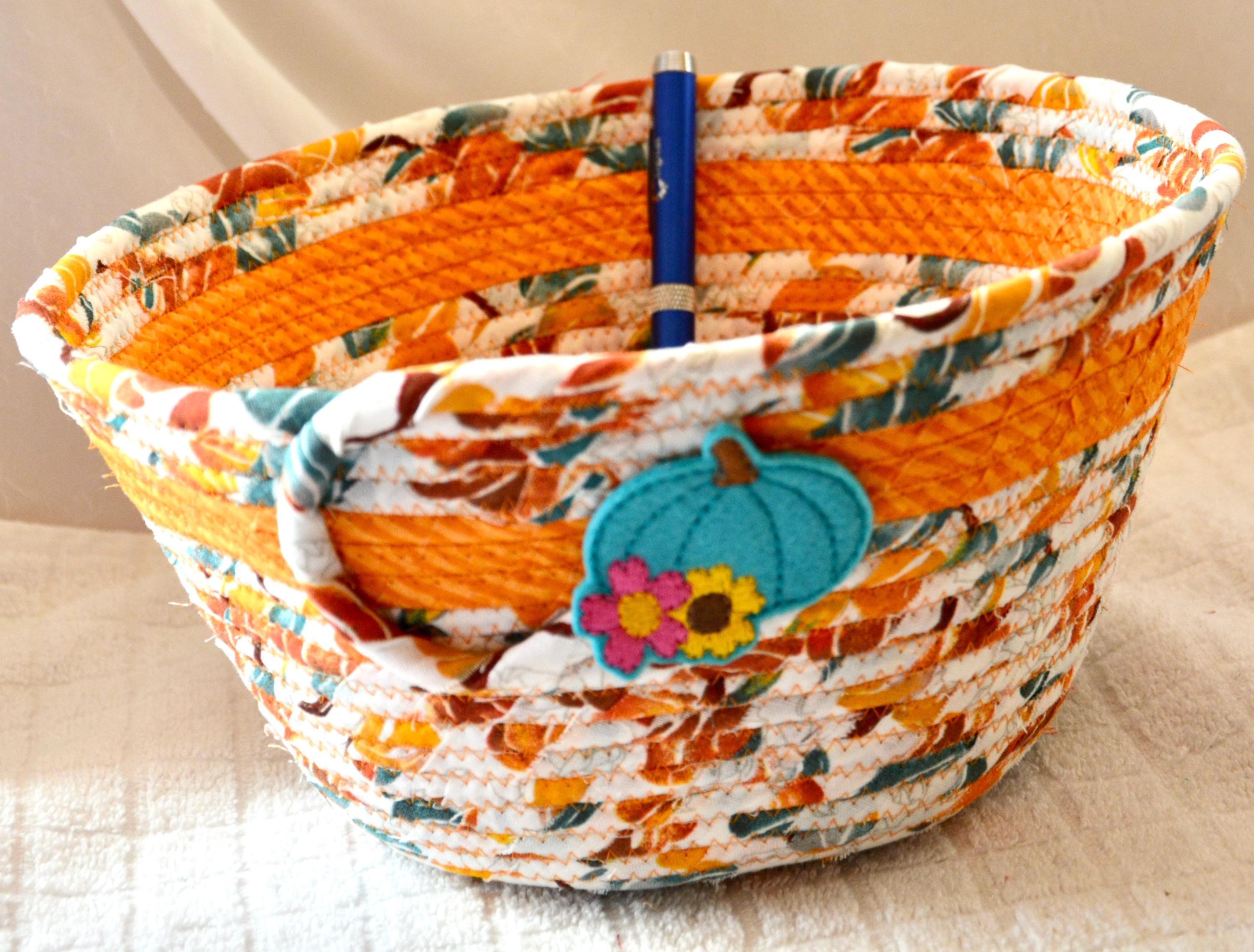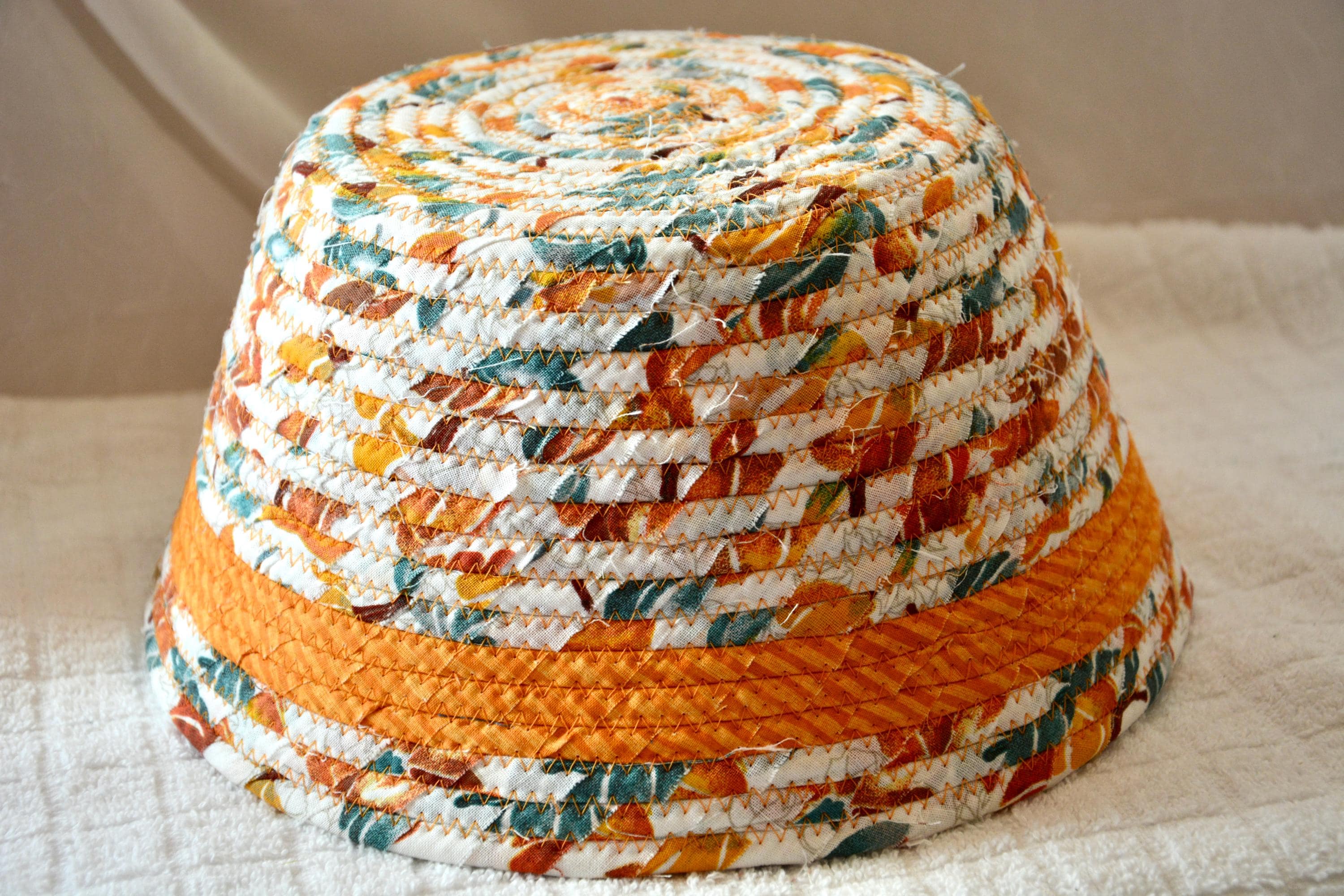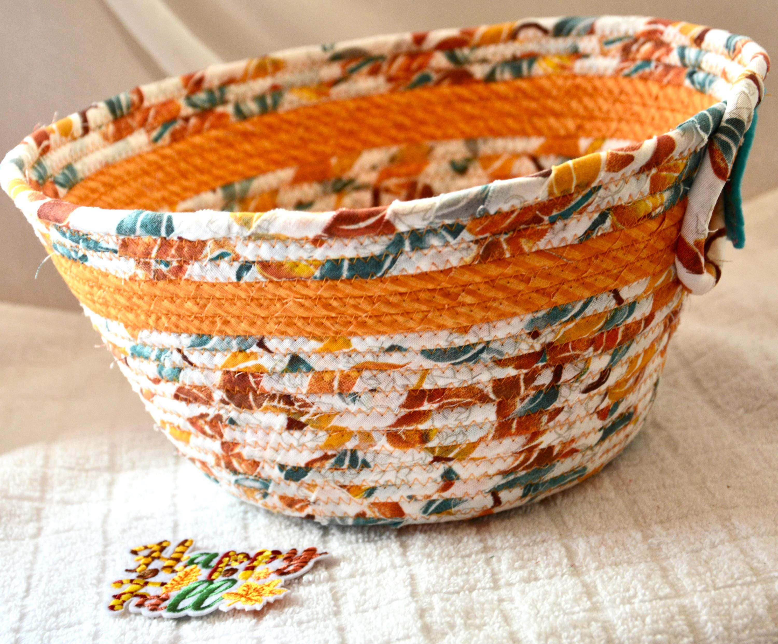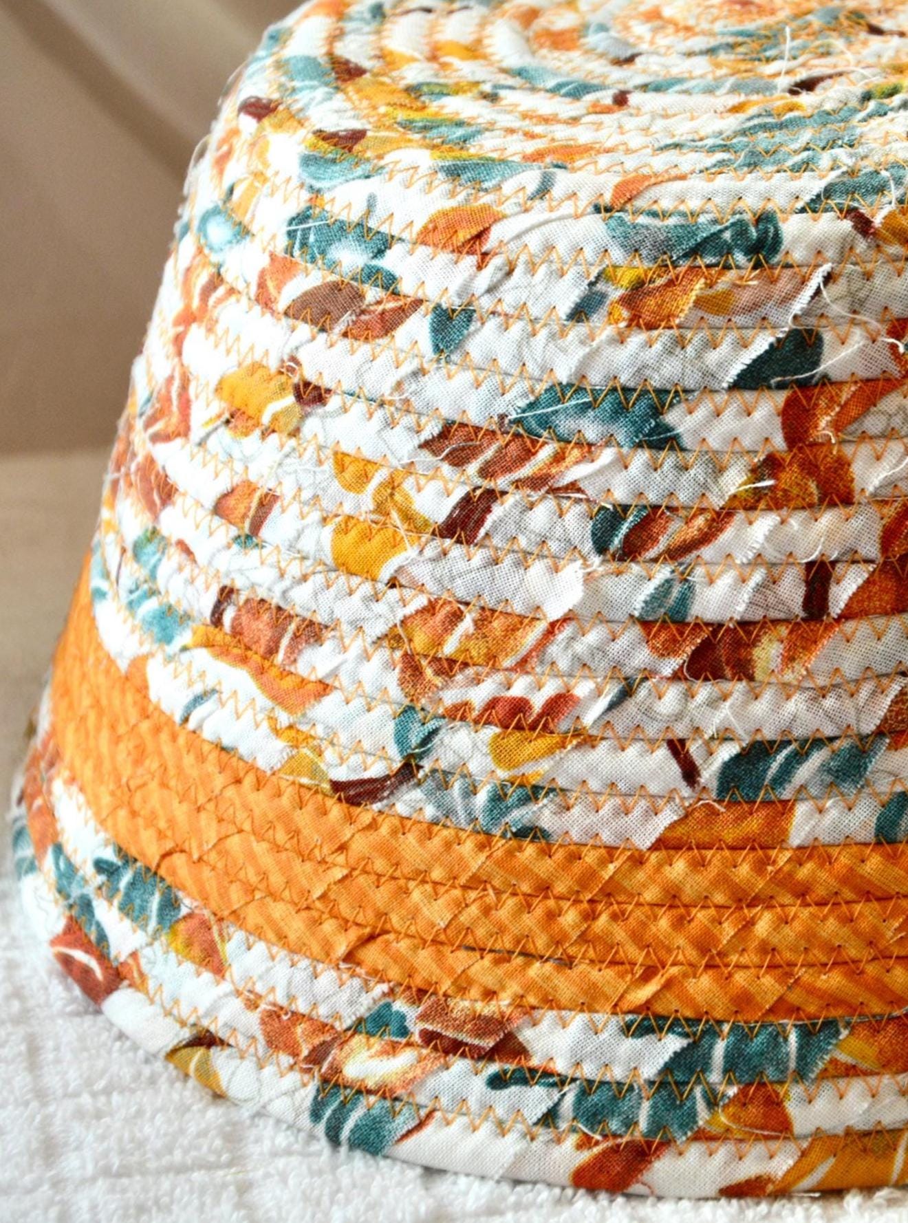 I hand wrapped these wonderful fabrics around cotton line, which I then hand coiled and machine quilted to make it sturdy. I used the raw edge technique with some fray for a great shabby chic texture. These rich fabrics show on the inside too! All fabrics are 100% cotton! I just love the beige fabric, it has rich pumpkin and teal highlights that give it a nice pop for your table! The pretty pumpkin on the basket is included for a nice accent.