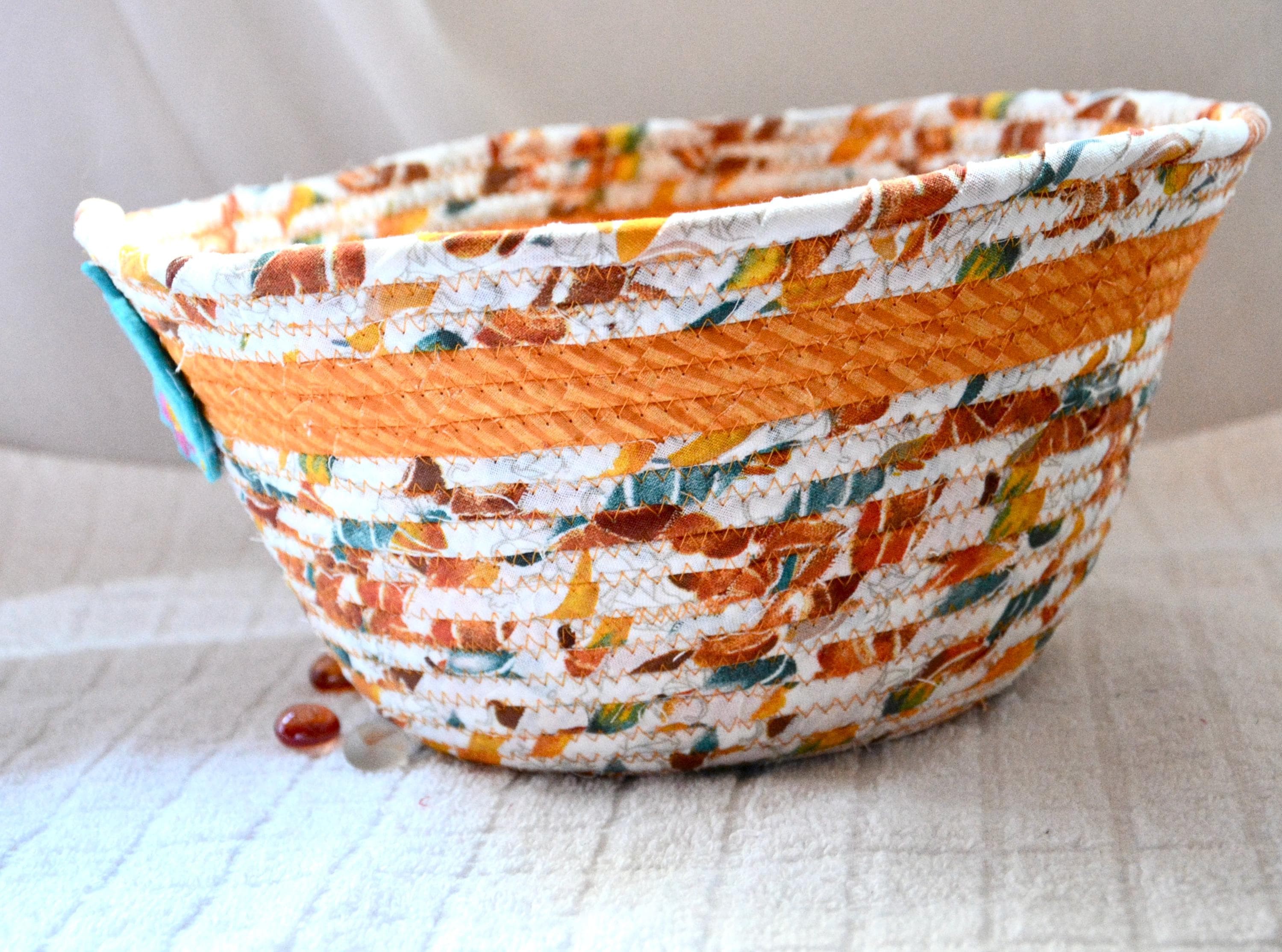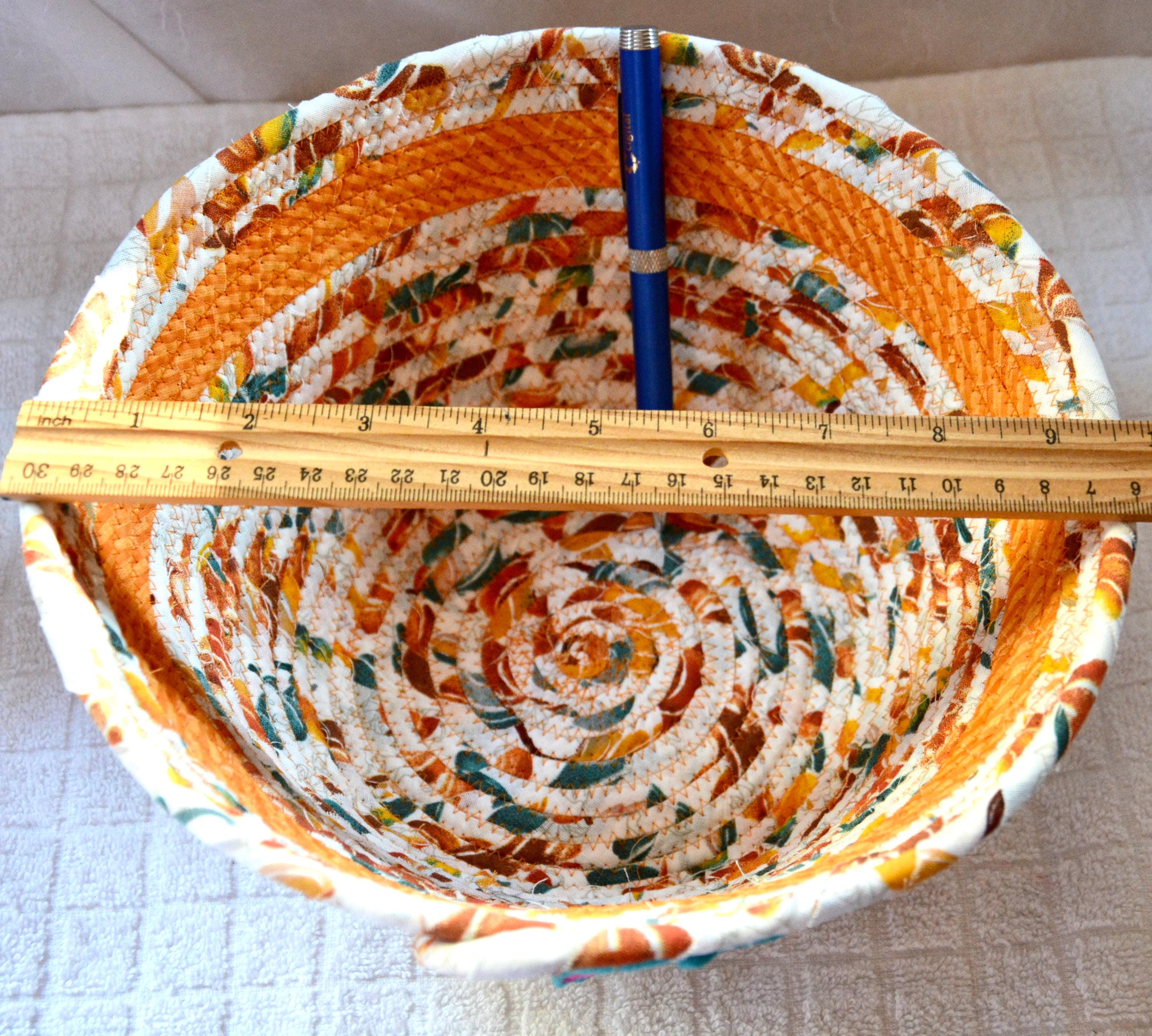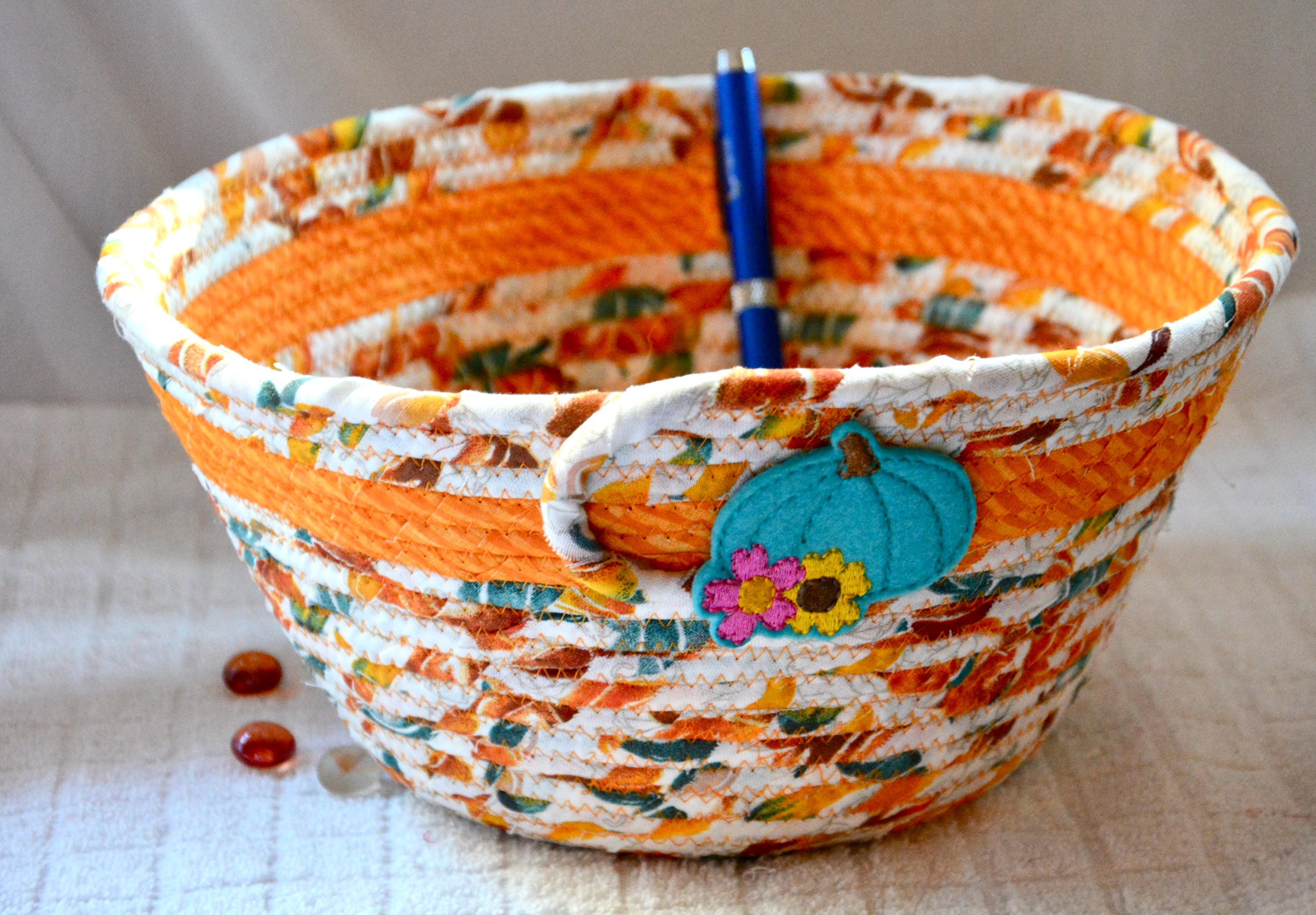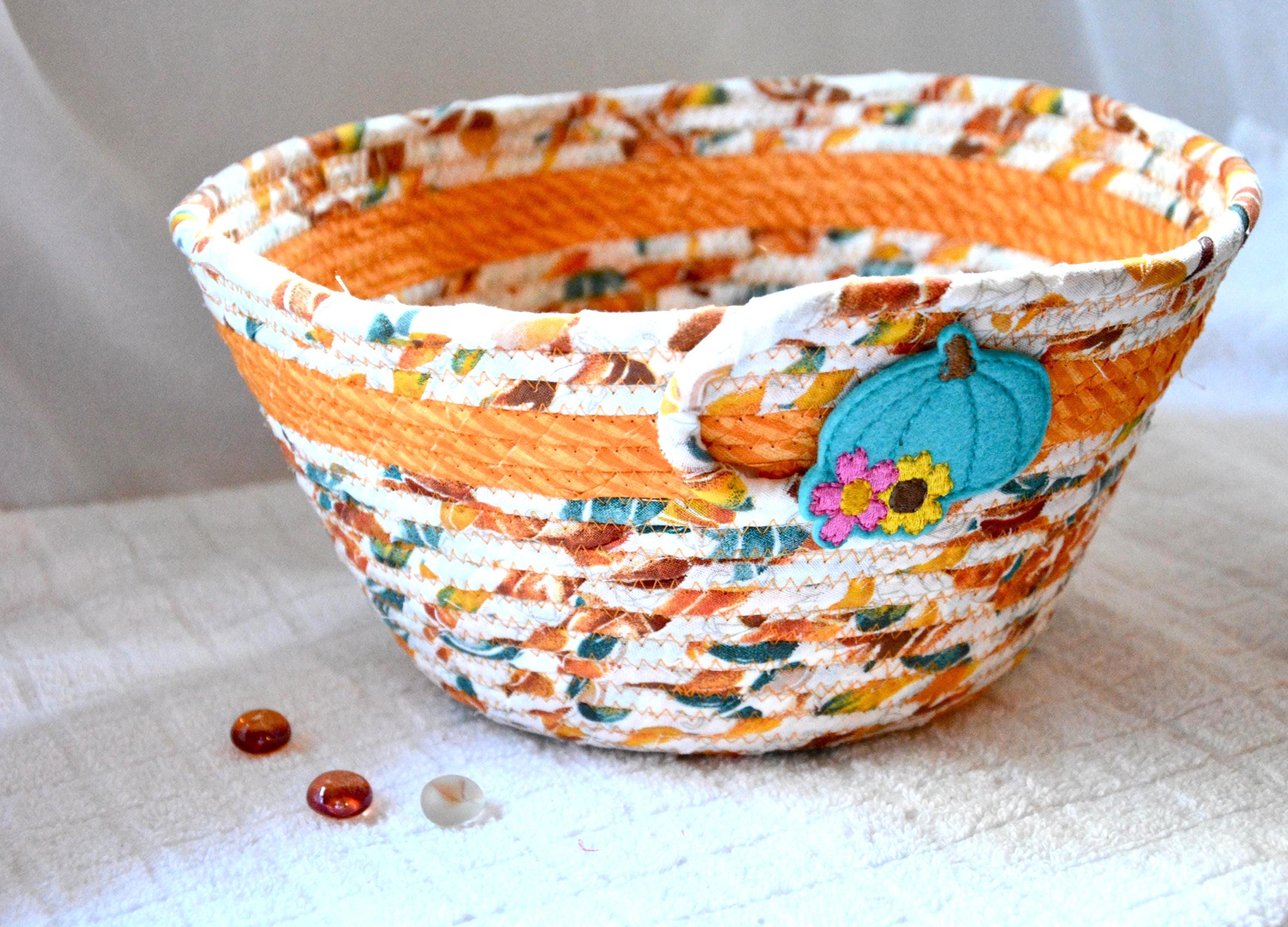I hand wrapped these wonderful fabrics around cotton line, which I then hand coiled and machine quilted to make it sturdy. I used the raw edge technique with some fray for a great shabby chic texture. These rich fabrics show on the inside too! All fabrics are 100% cotton! I just love the beige fabric, it has rich pumpkin and teal highlights that give it a nice pop for your table! The pretty pumpkin on the basket is included for a nice accent.