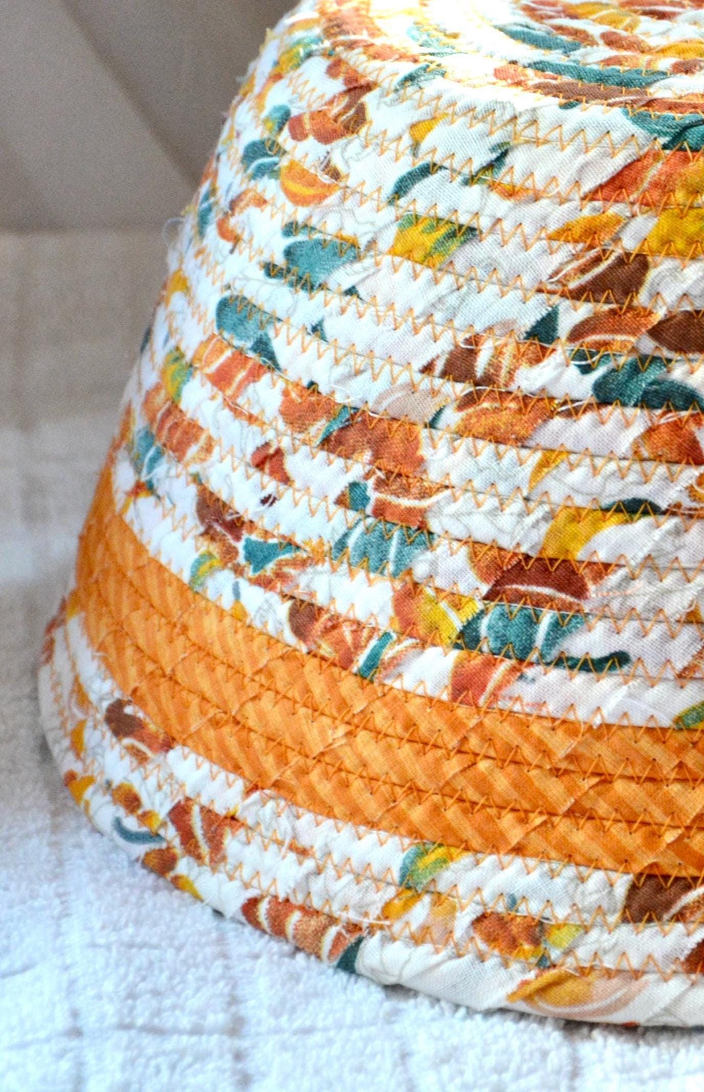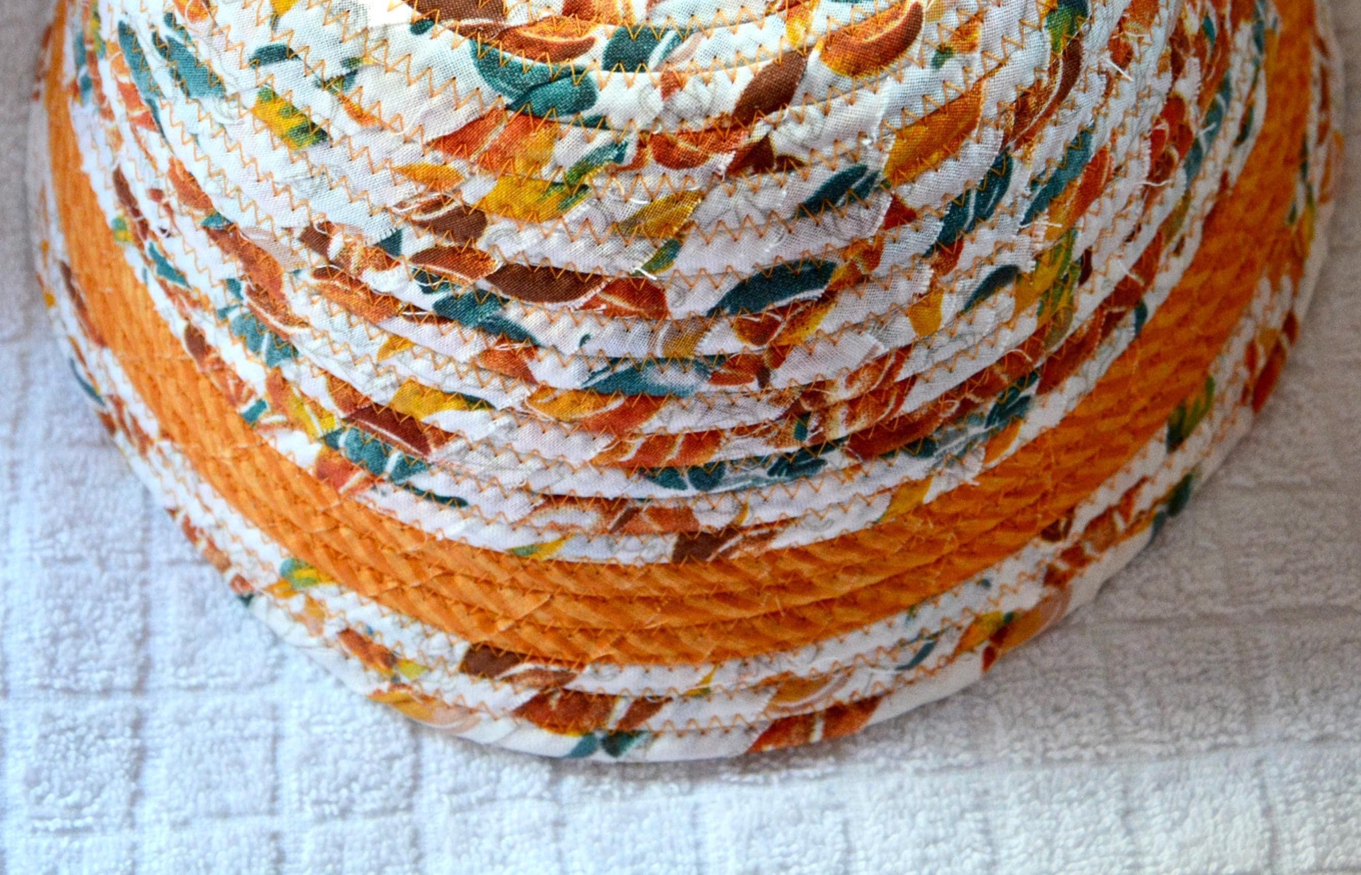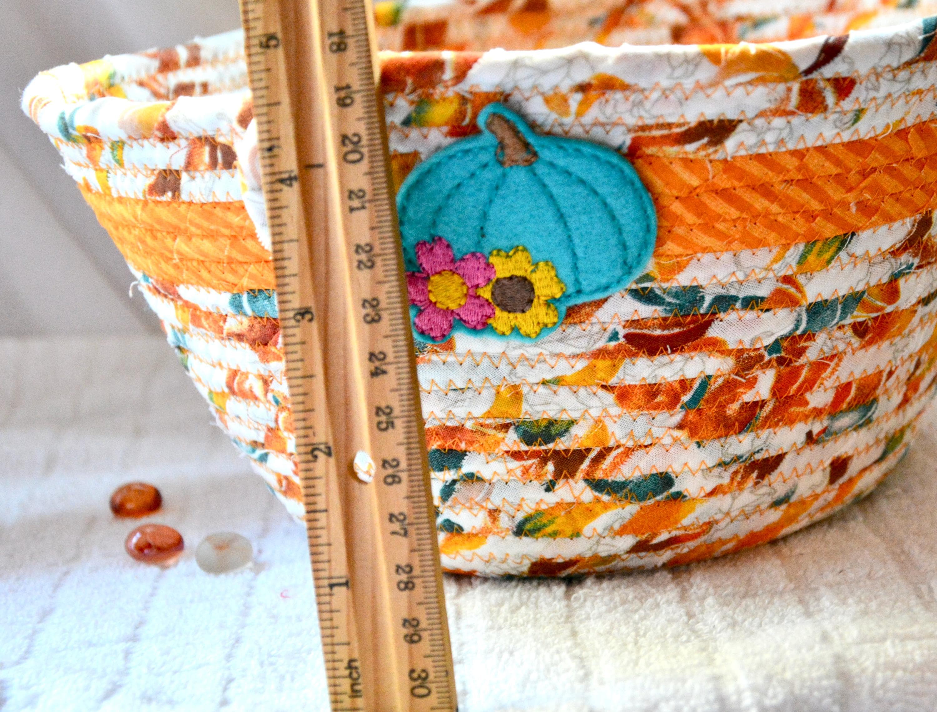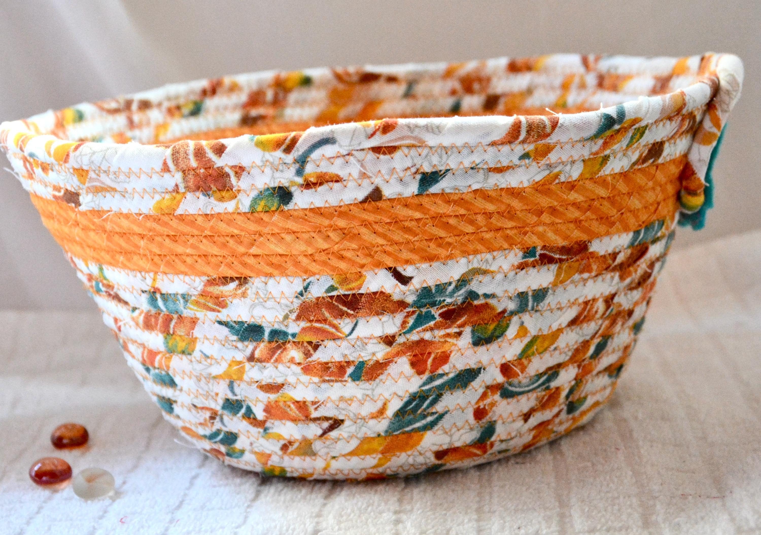 I hand wrapped these wonderful fabrics around cotton line, which I then hand coiled and machine quilted to make it sturdy. I used the raw edge technique with some fray for a great shabby chic texture. These rich fabrics show on the inside too! All fabrics are 100% cotton! I just love the beige fabric, it has rich pumpkin and teal highlights that give it a nice pop for your table! The pretty pumpkin on the basket is included for a nice accent.