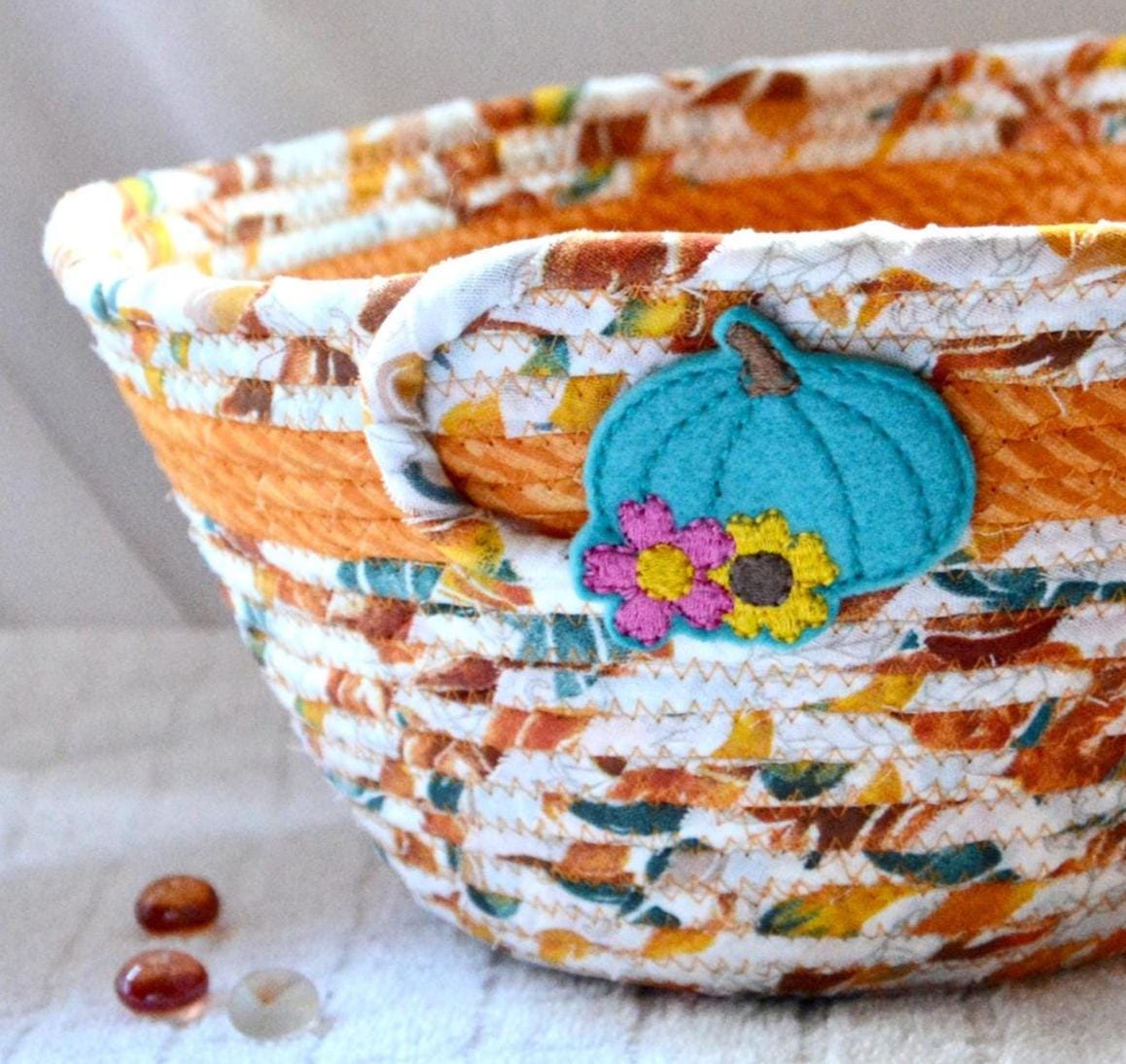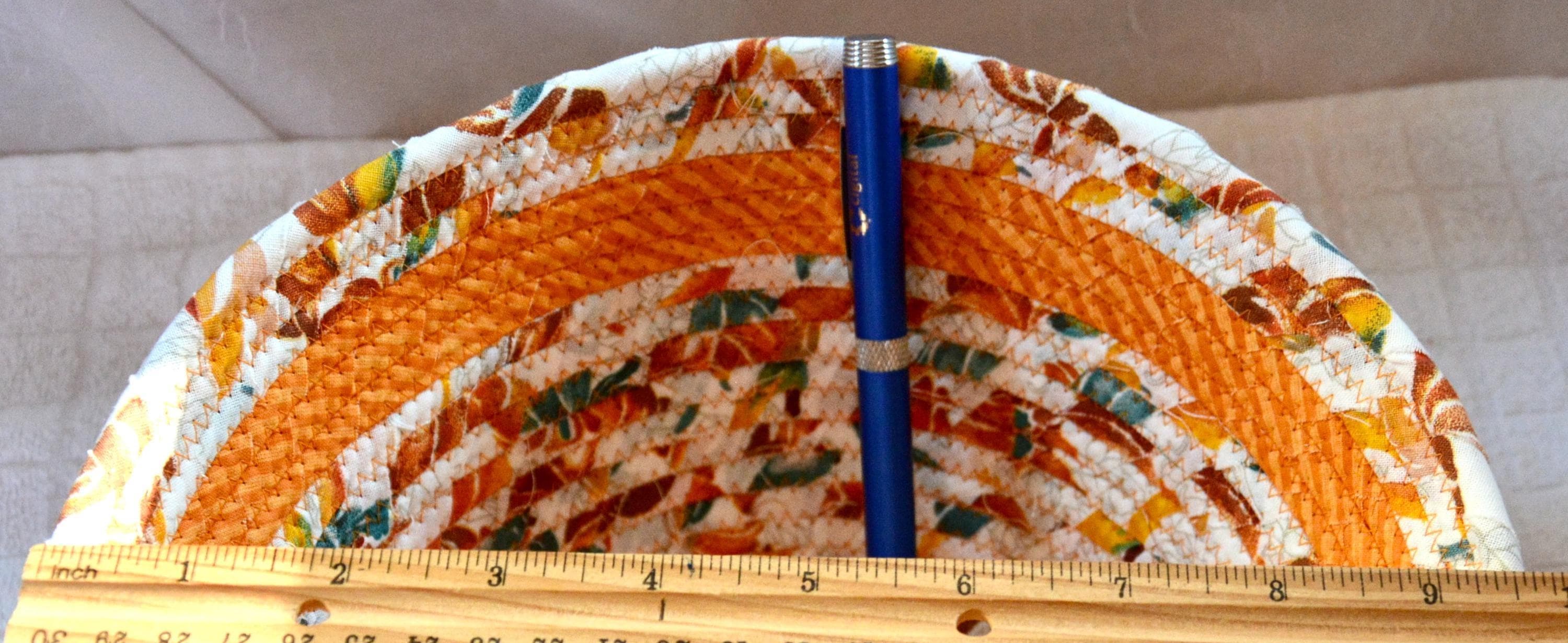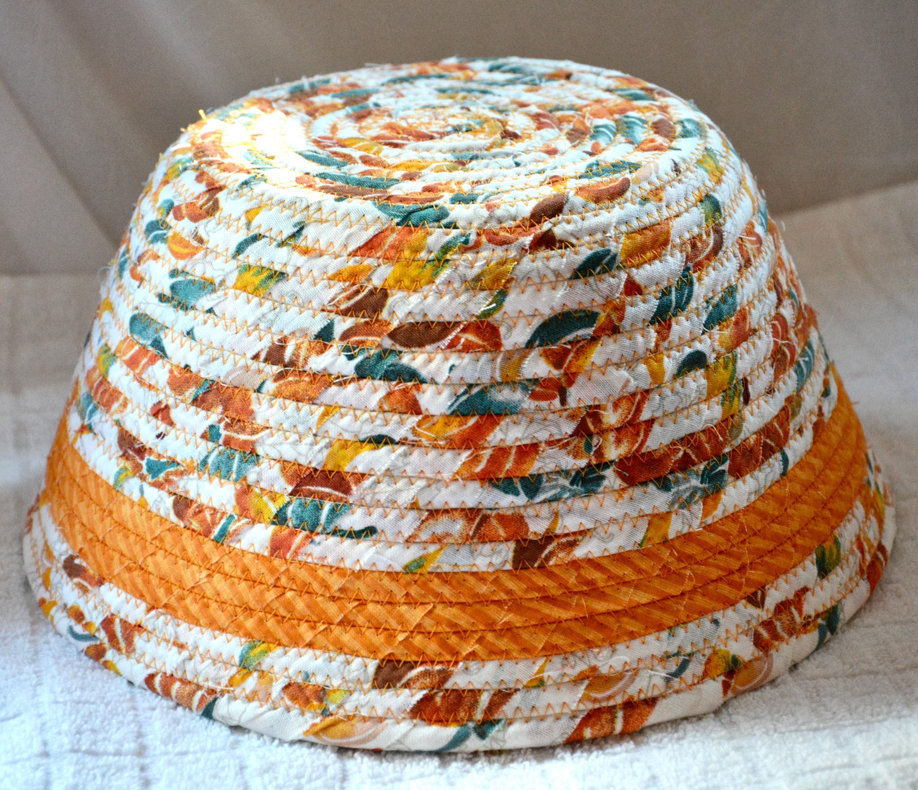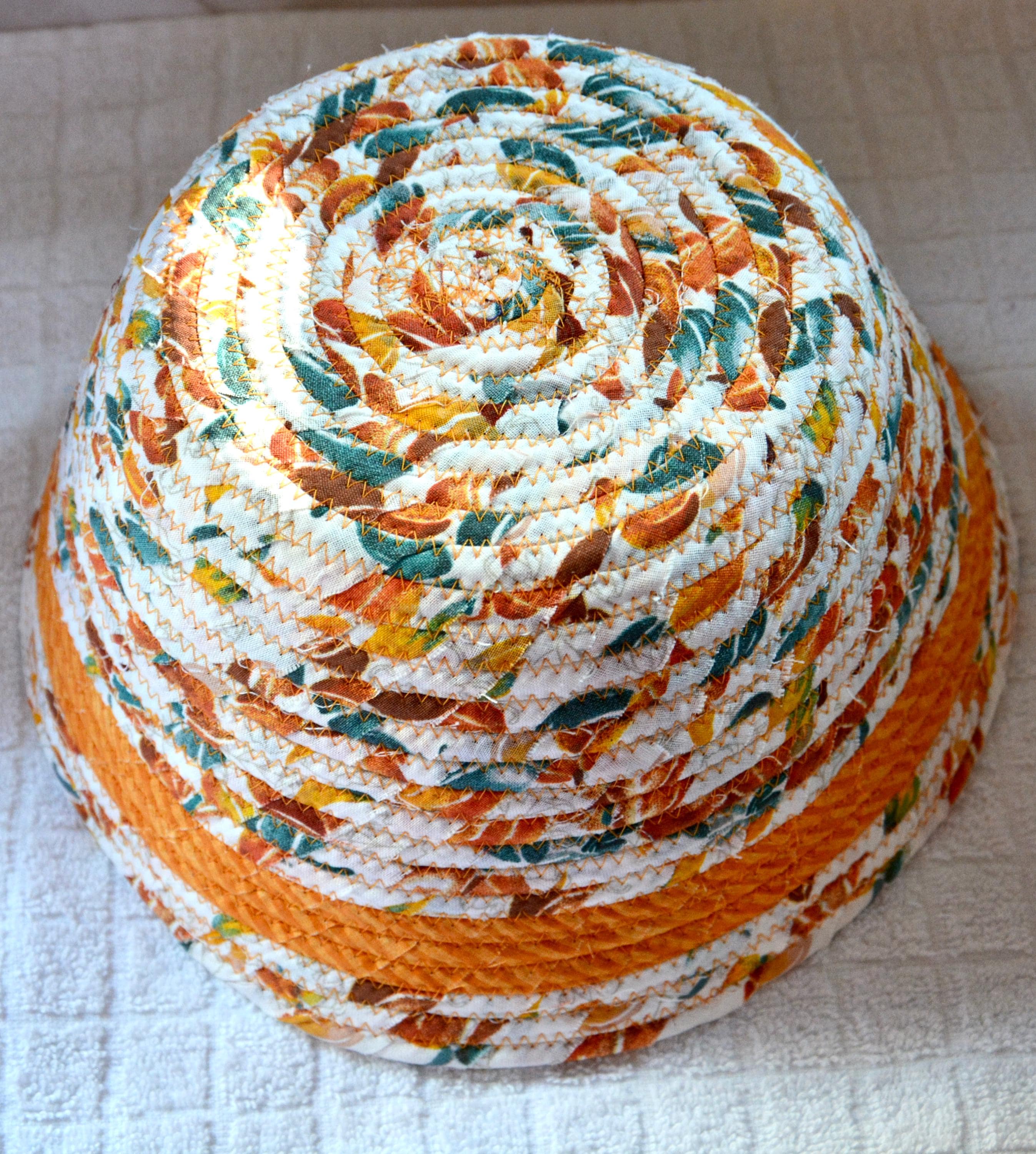 I hand wrapped these wonderful fabrics around cotton line, which I then hand coiled and machine quilted to make it sturdy. I used the raw edge technique with some fray for a great shabby chic texture. These rich fabrics show on the inside too! All fabrics are 100% cotton! I just love the beige fabric, it has rich pumpkin and teal highlights that give it a nice pop for your table! The pretty pumpkin on the basket is included for a nice accent.