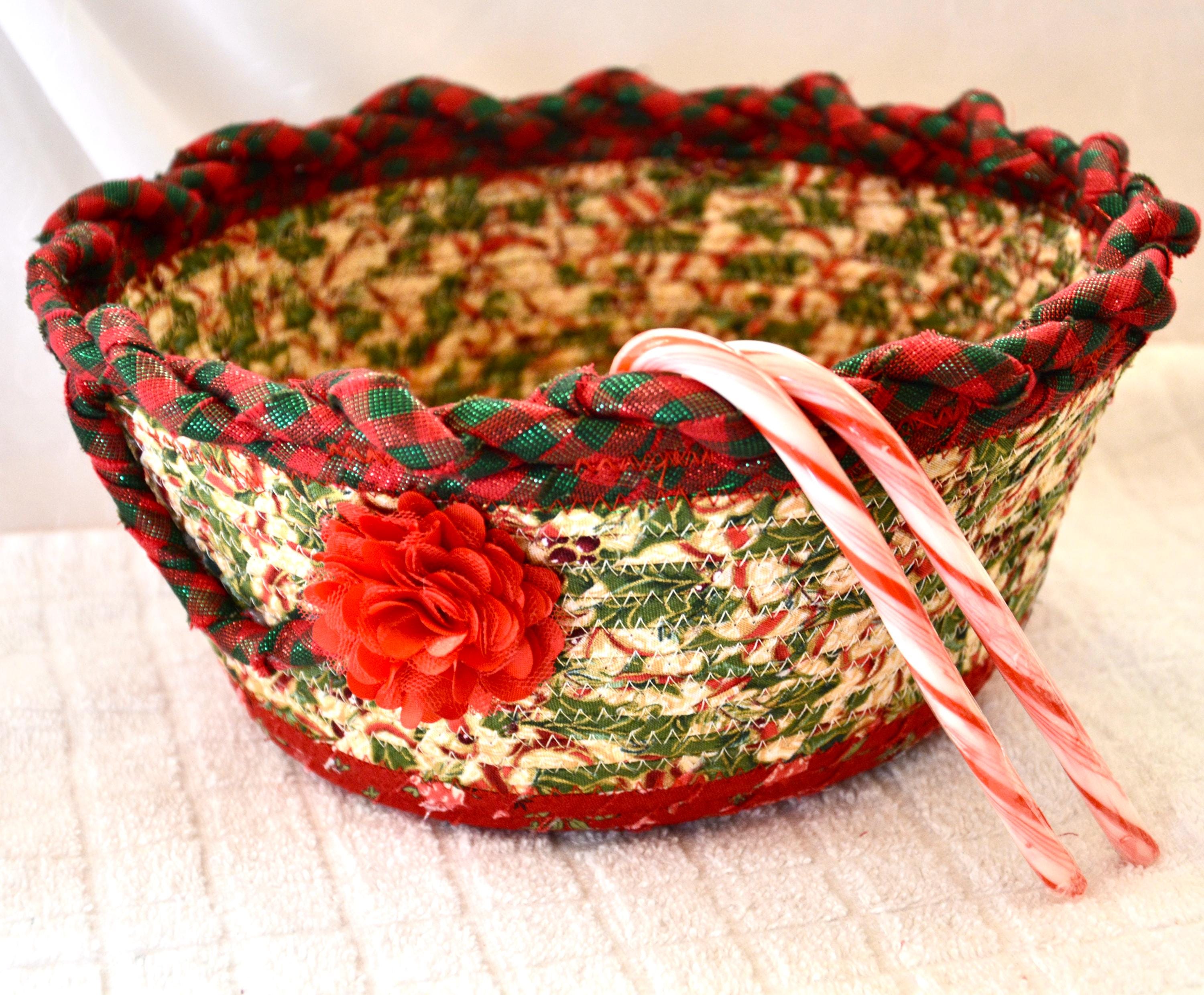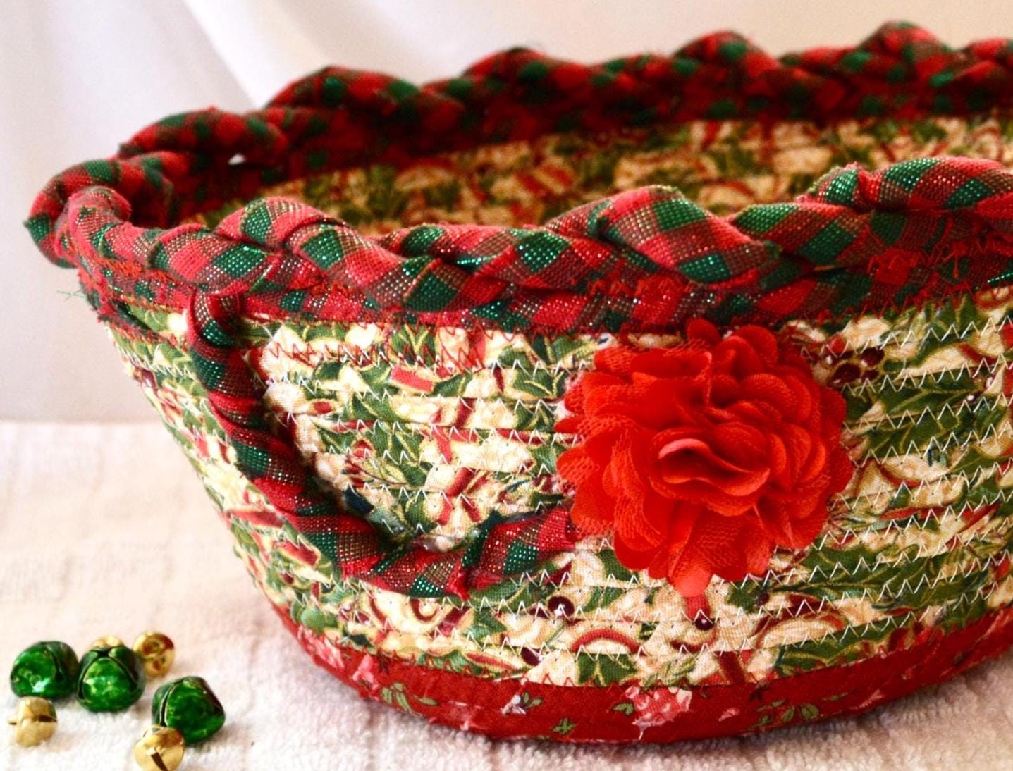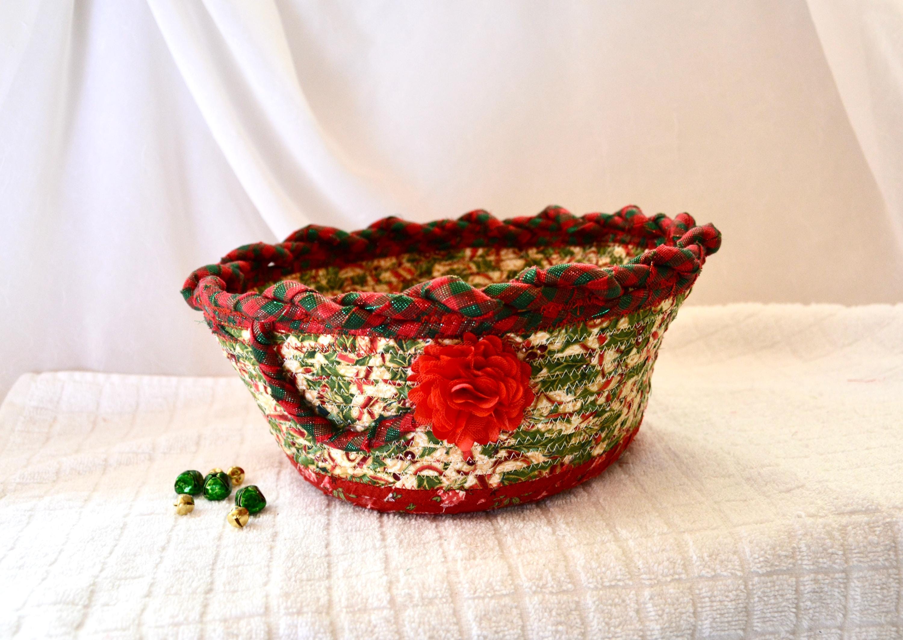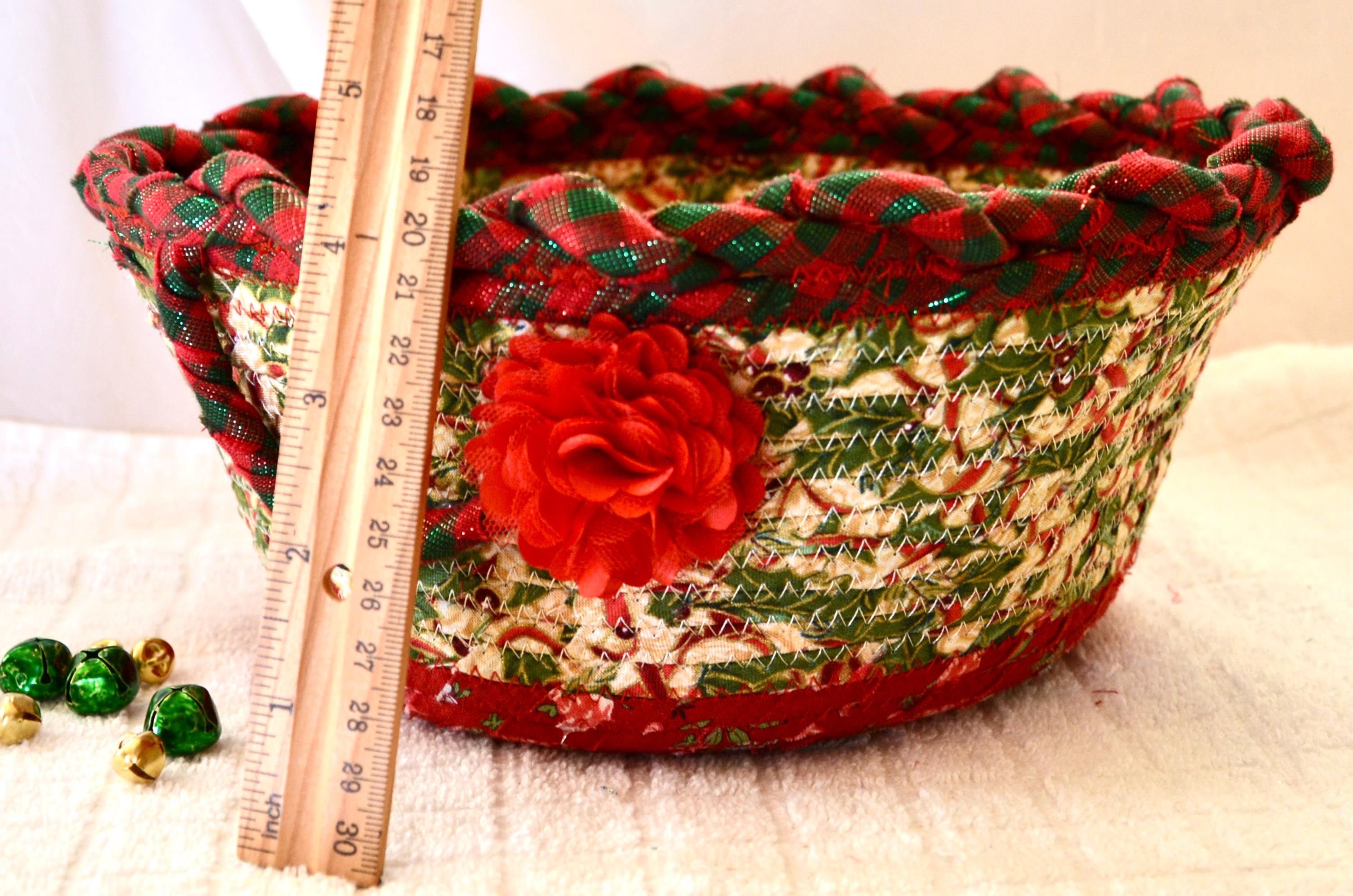 I hand wrapped these high quality fabrics around cotton line, which I then hand coiled and machine quilted to make it sturdy. I used the raw edge technique with some fray to add a wonderful shabby chic texture. I just love the pretty shiny highlights in the trim fabric! So festive! The pretty flower on the basket is included for nice accent.