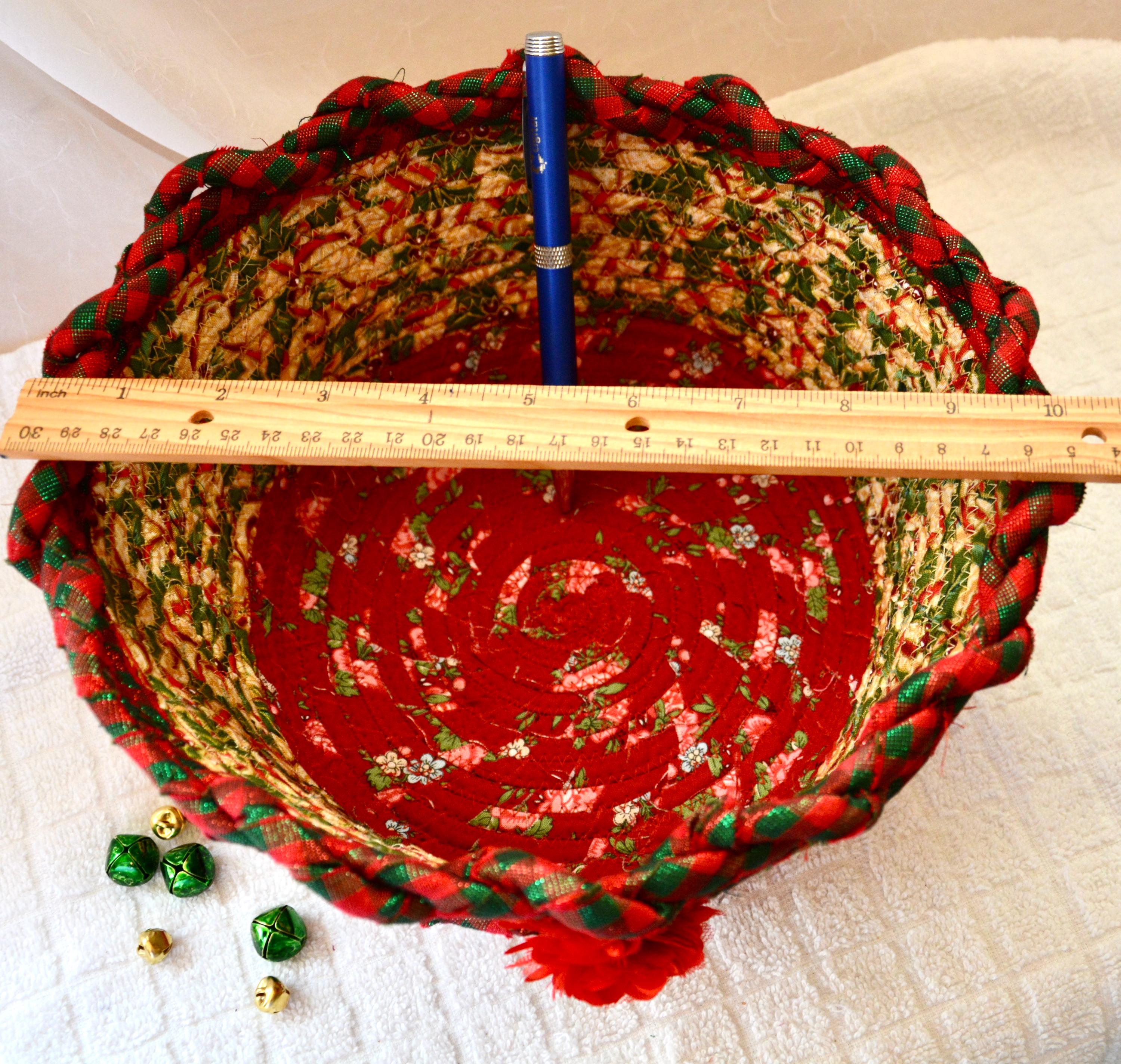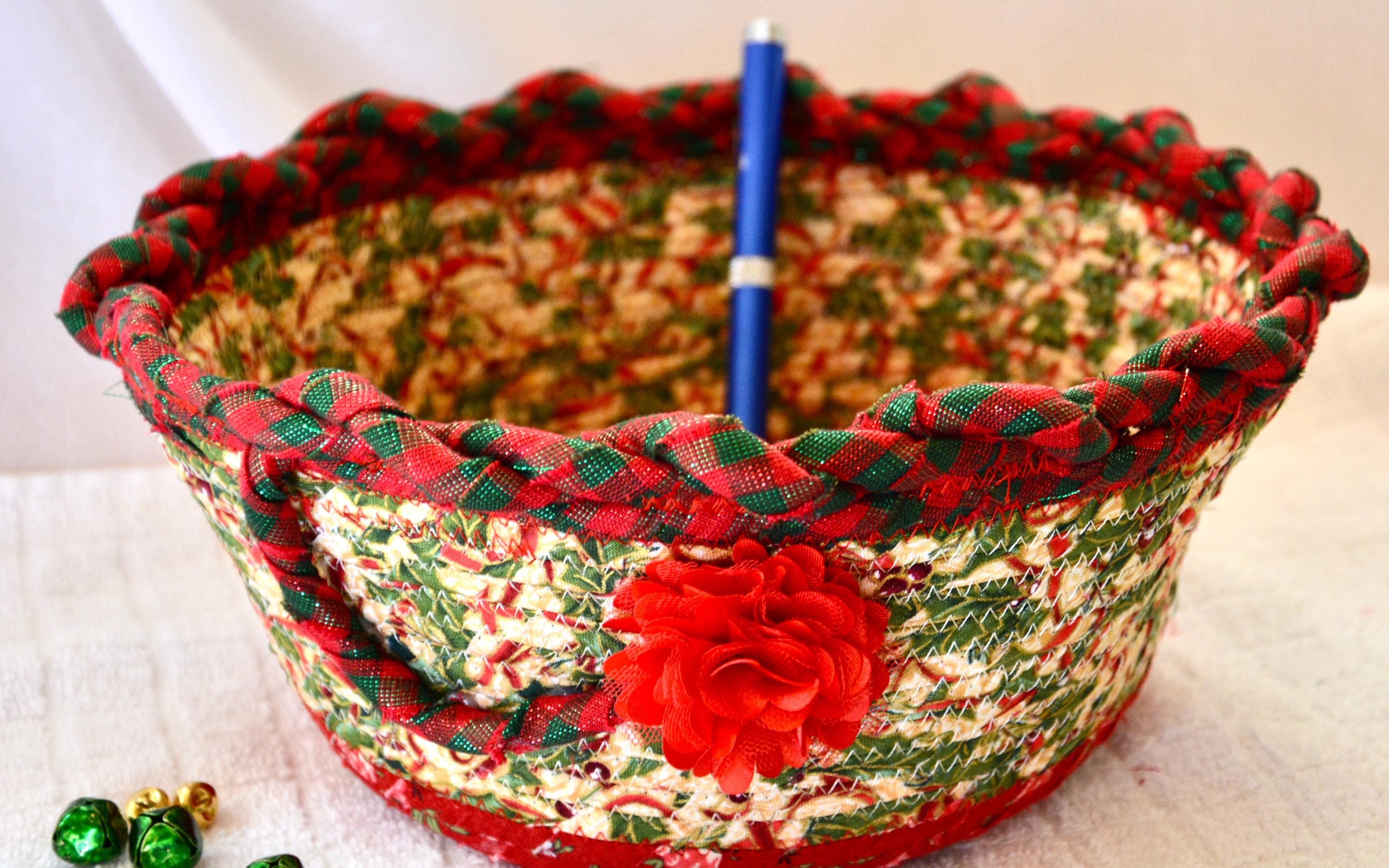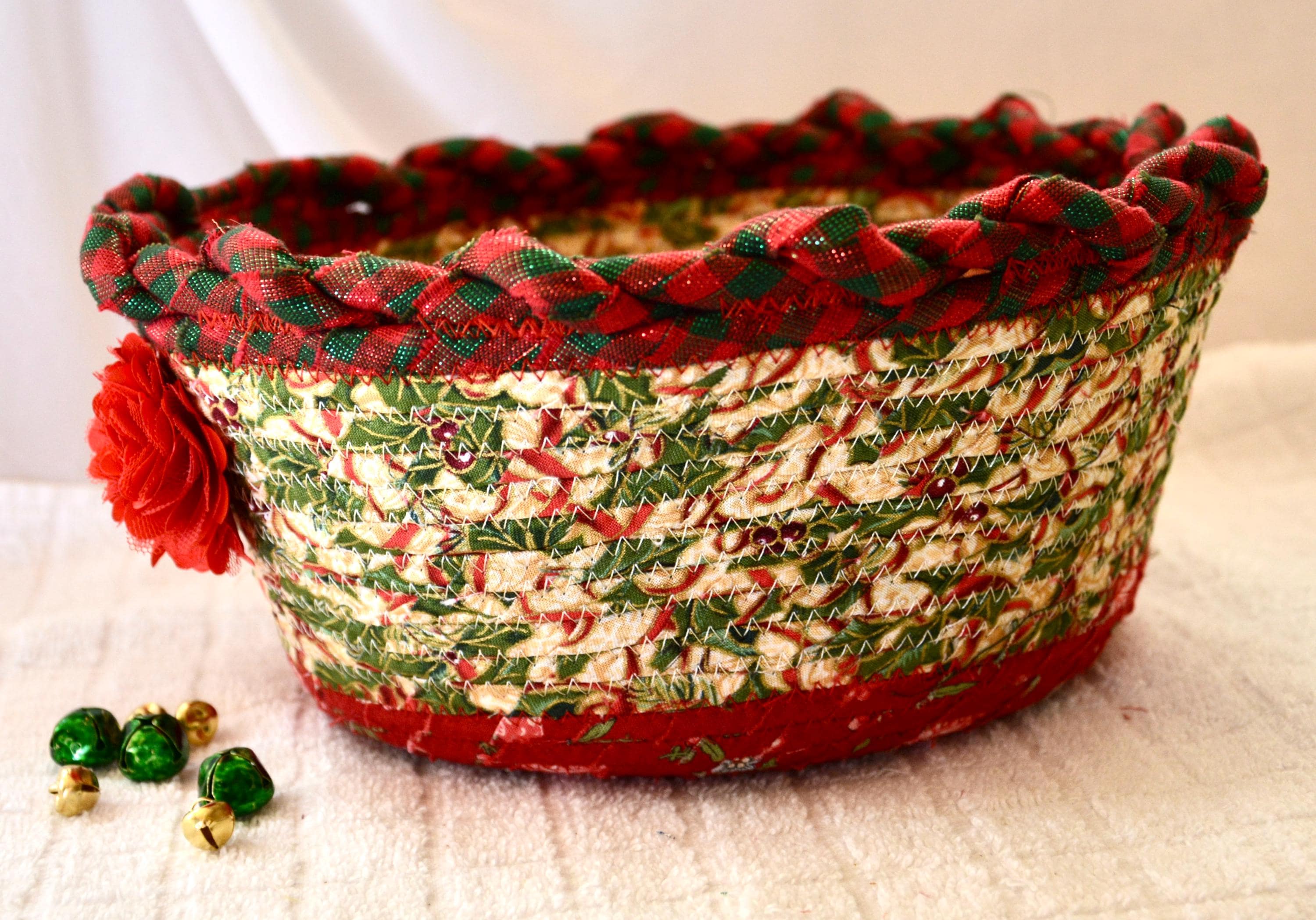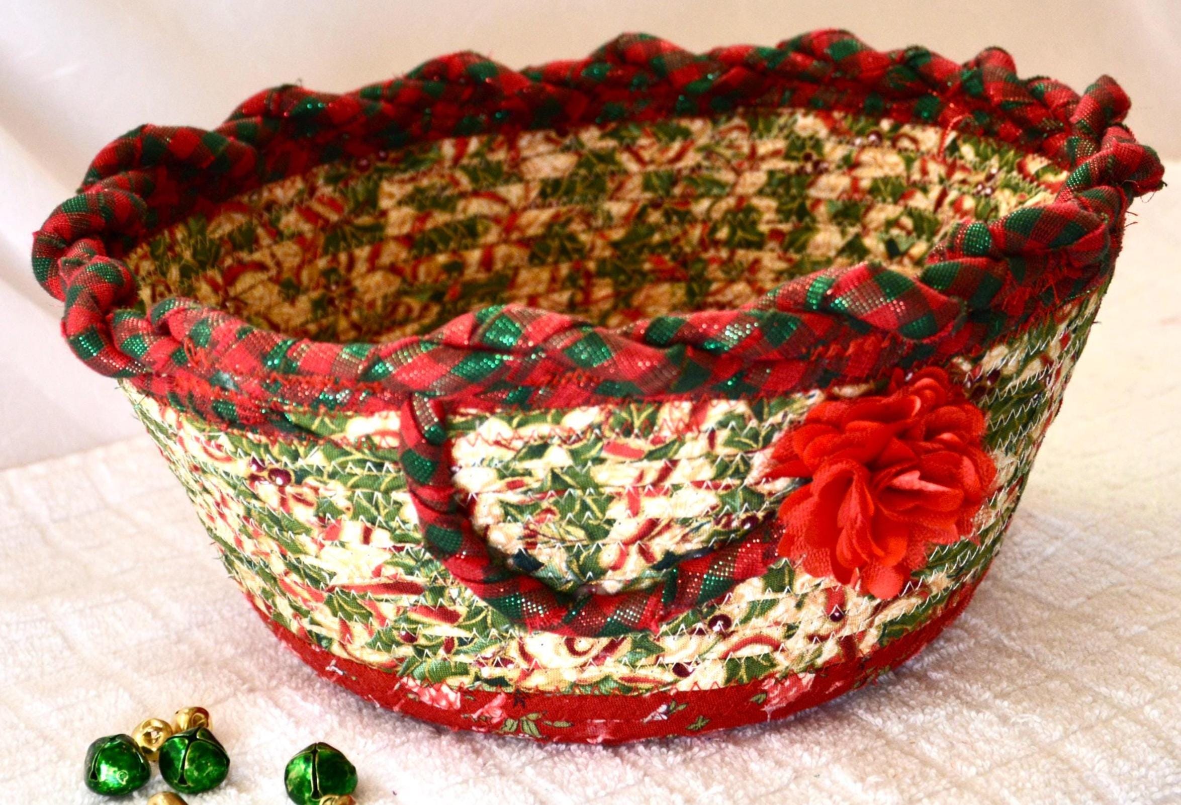 I hand wrapped these high quality fabrics around cotton line, which I then hand coiled and machine quilted to make it sturdy. I used the raw edge technique with some fray to add a wonderful shabby chic texture. I just love the pretty shiny highlights in the trim fabric! So festive! The pretty flower on the basket is included for nice accent.