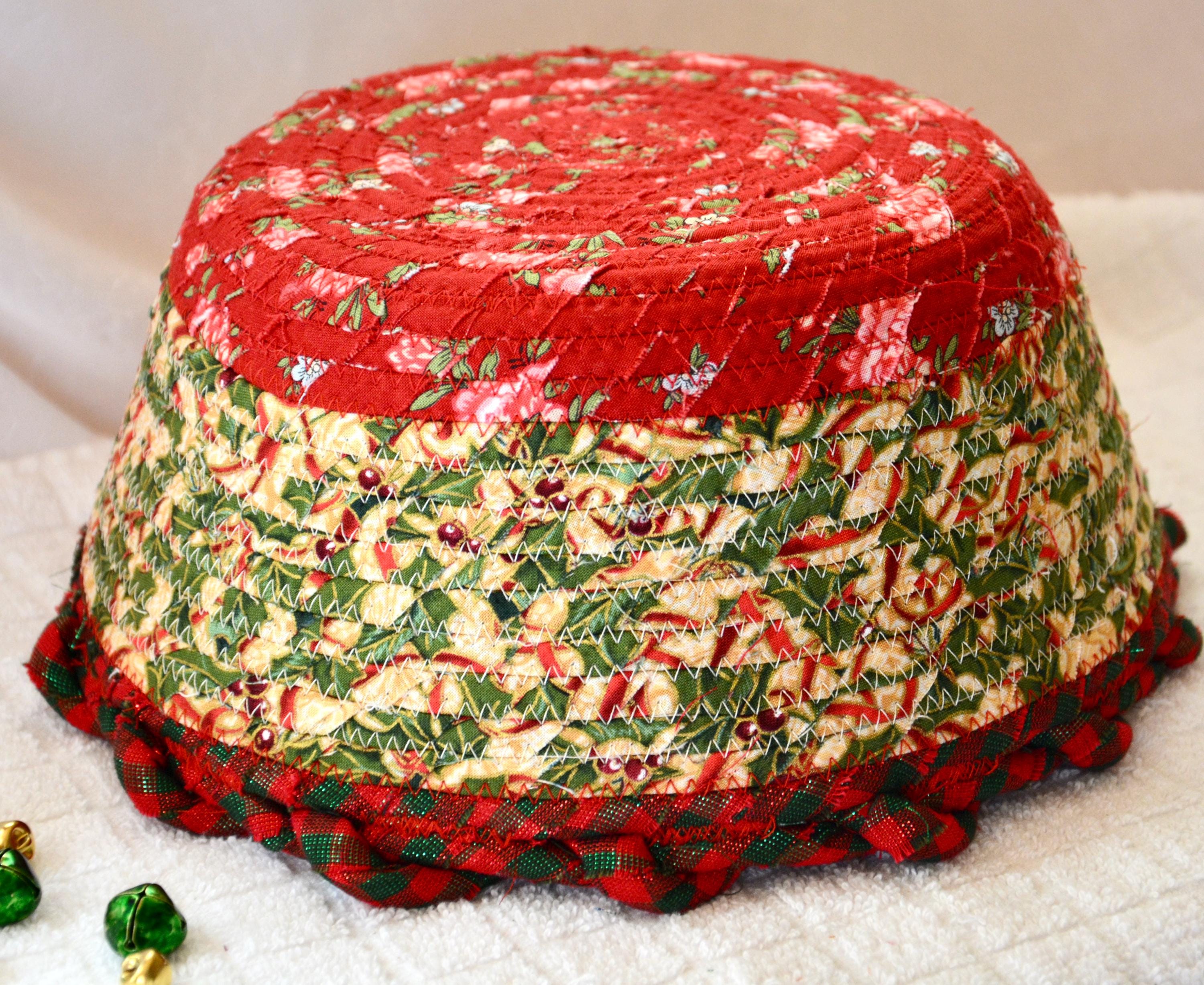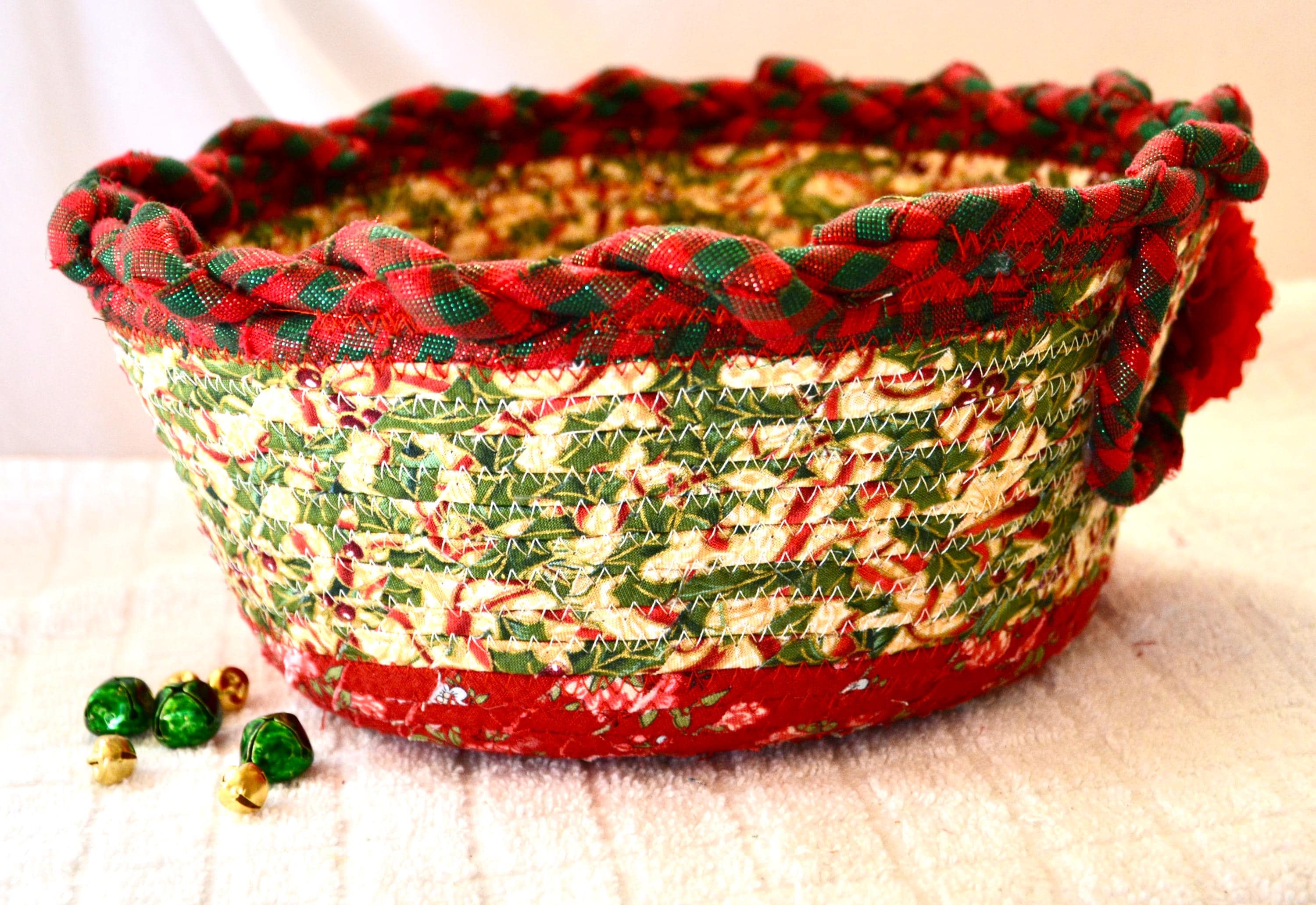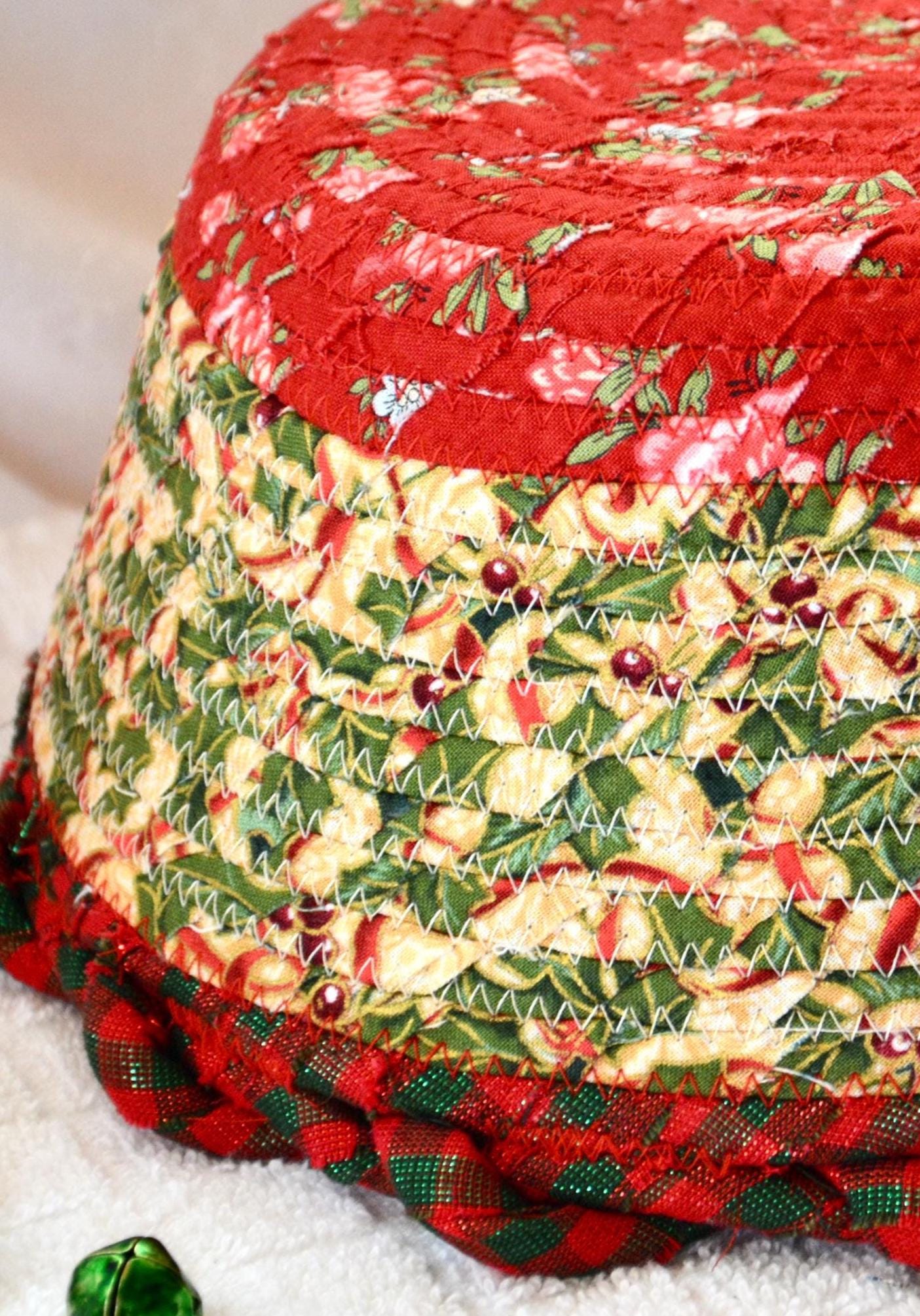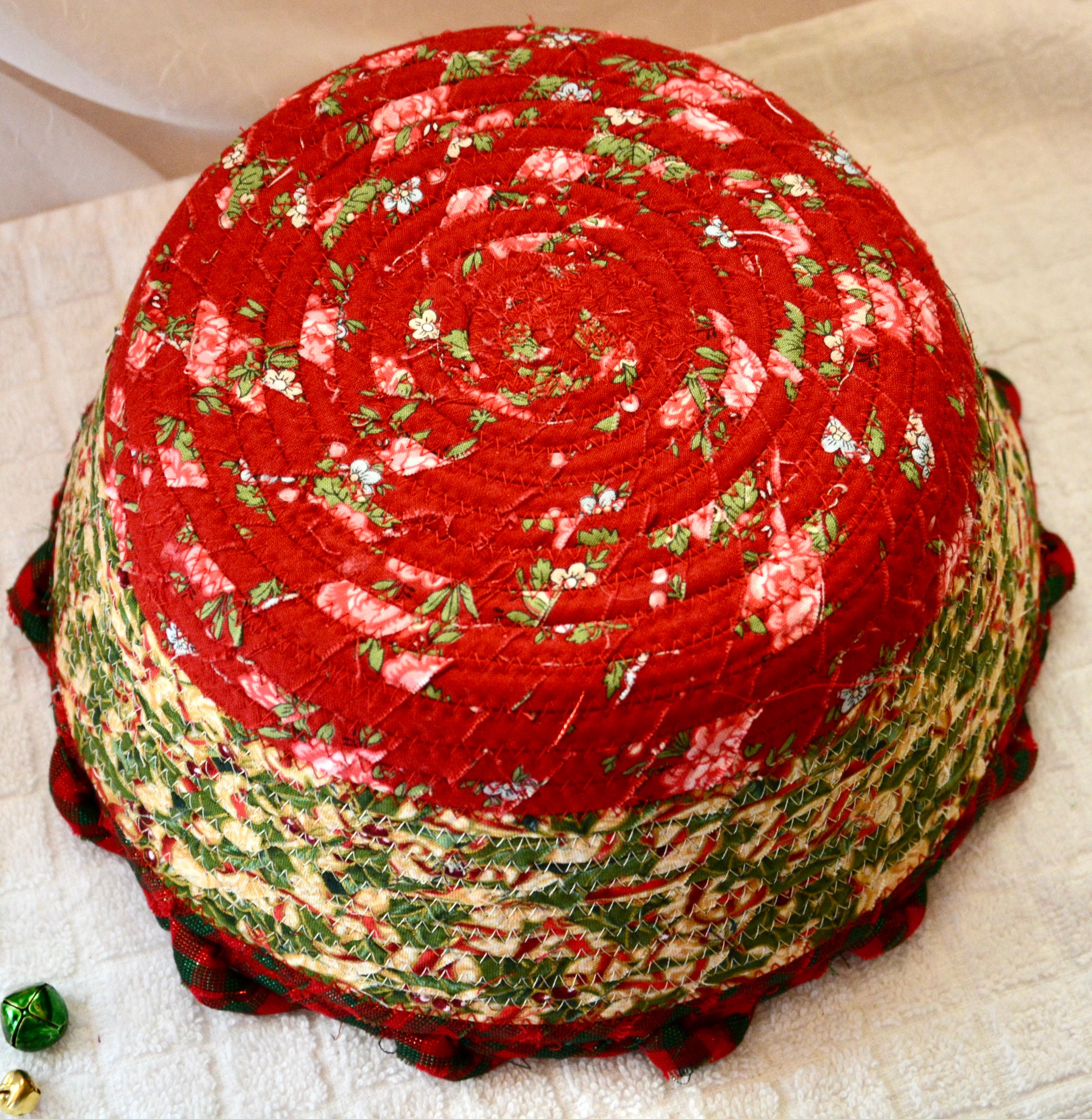 I hand wrapped these high quality fabrics around cotton line, which I then hand coiled and machine quilted to make it sturdy. I used the raw edge technique with some fray to add a wonderful shabby chic texture. I just love the pretty shiny highlights in the trim fabric! So festive! The pretty flower on the basket is included for nice accent.
