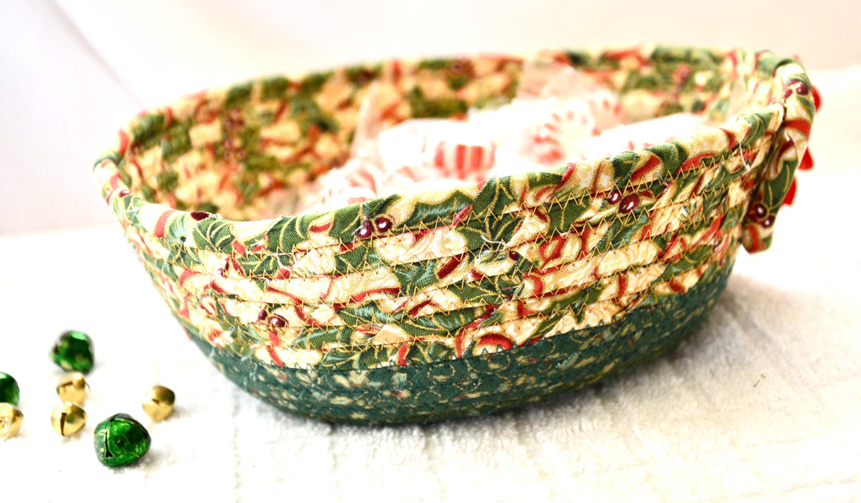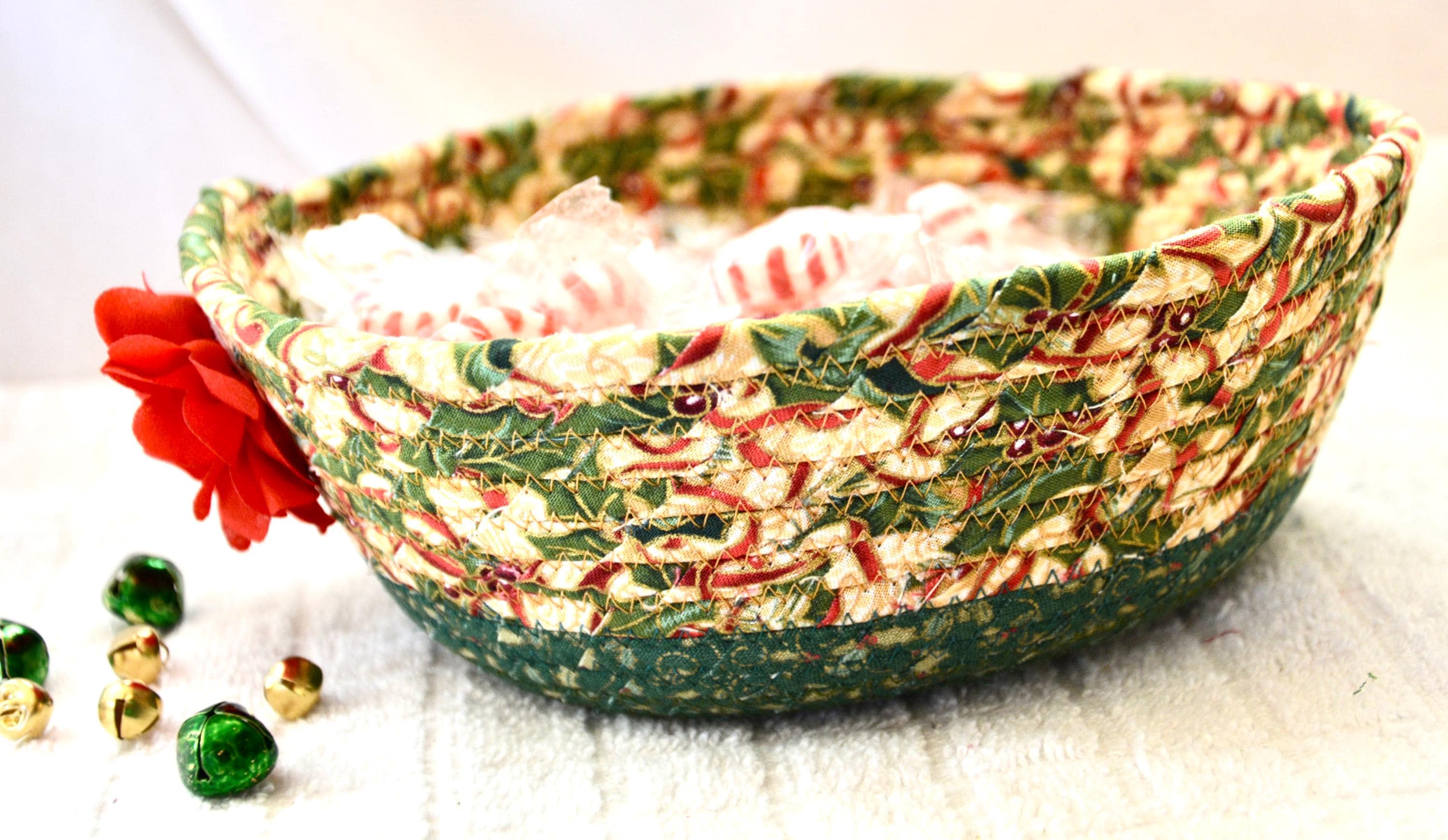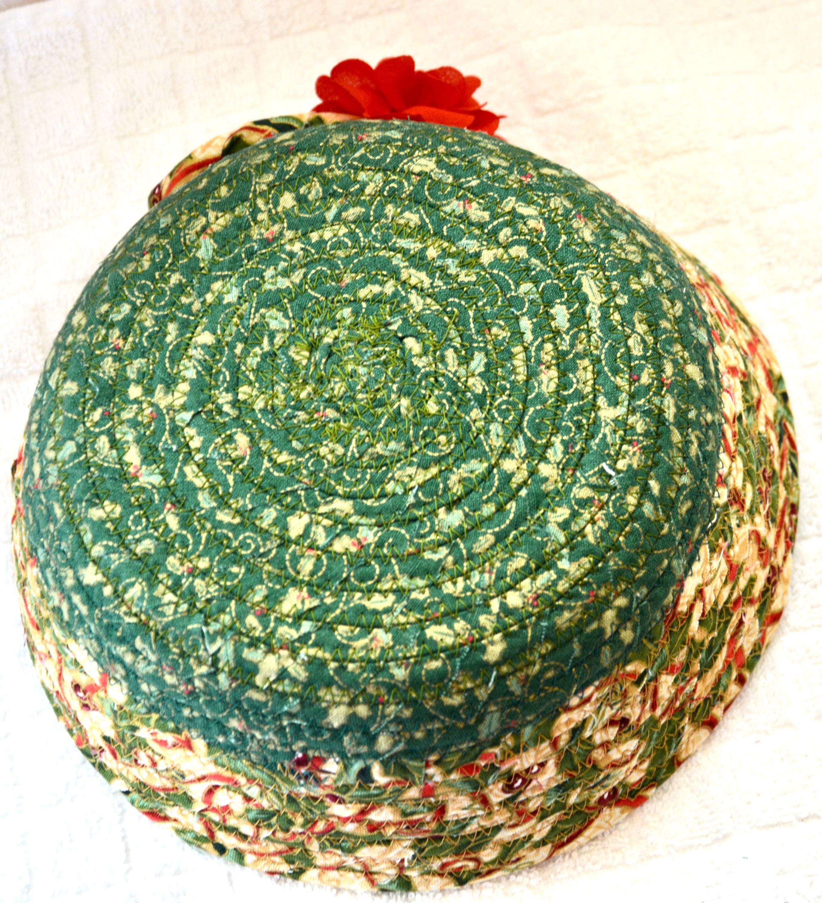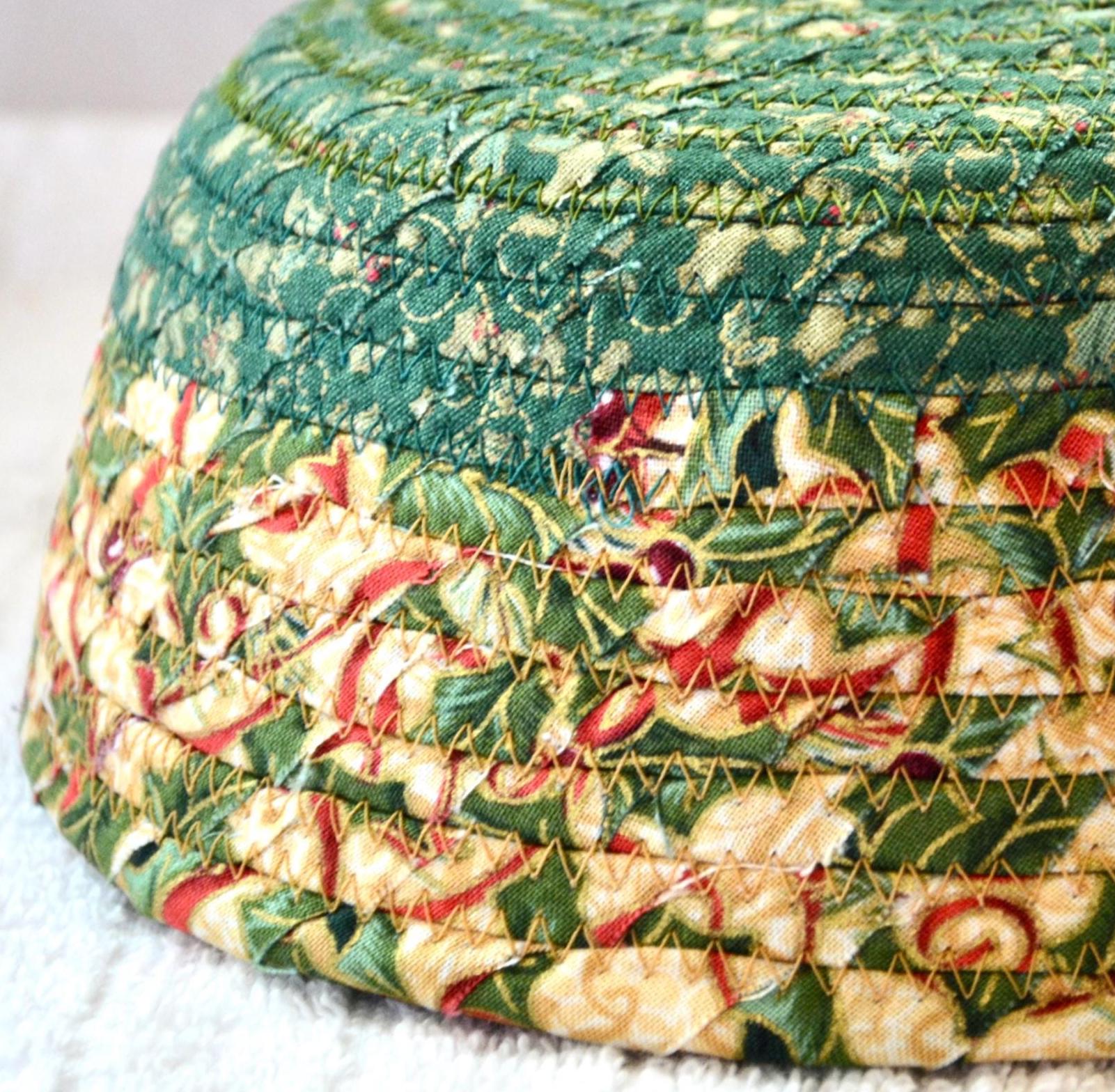 I hand wrapped these high quality 100% cotton fabrics around cotton line, which I then hand coiled and machine quilted to make it sturdy. I used the raw edge technique with some fray to add a wonderful shabby chic texture.