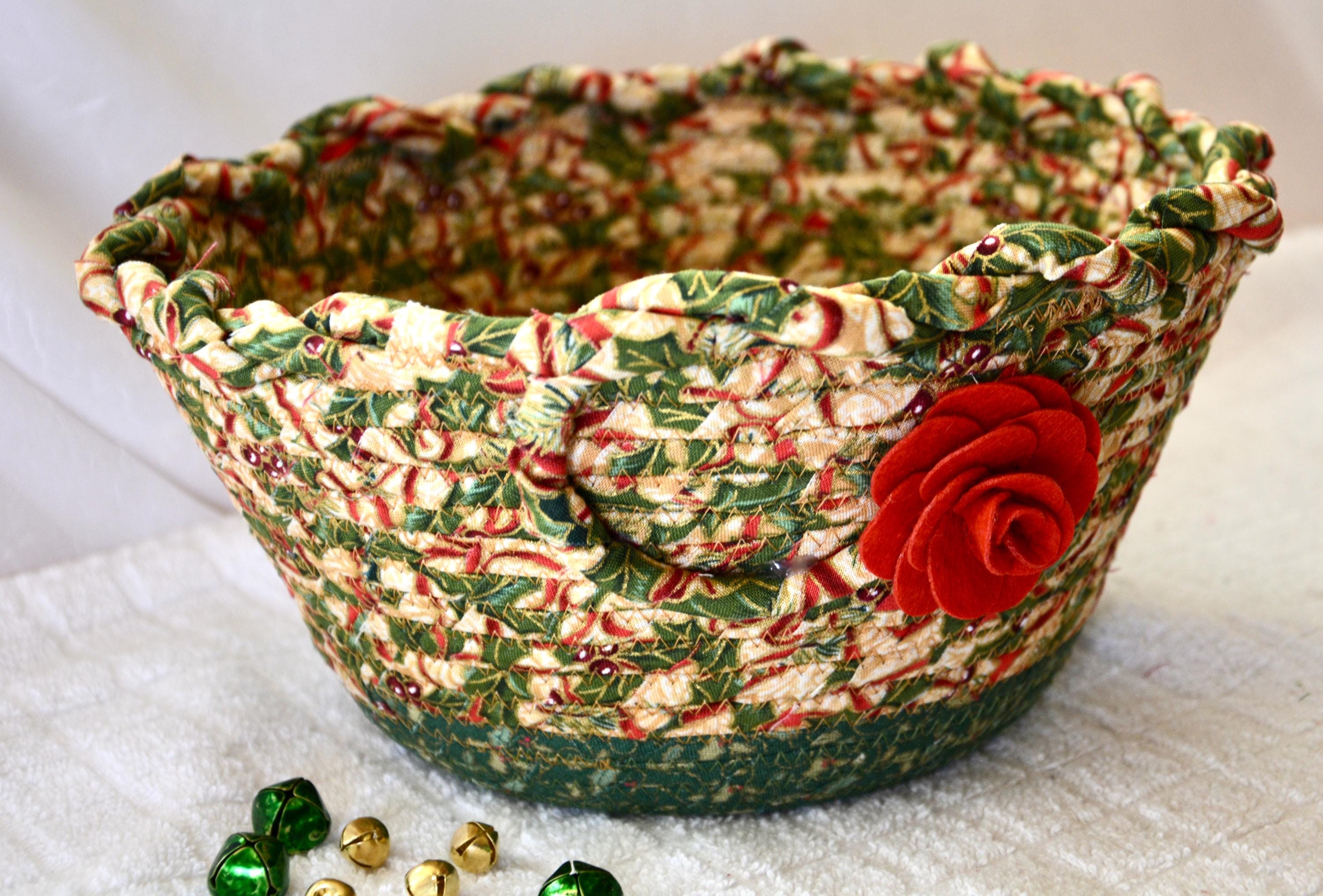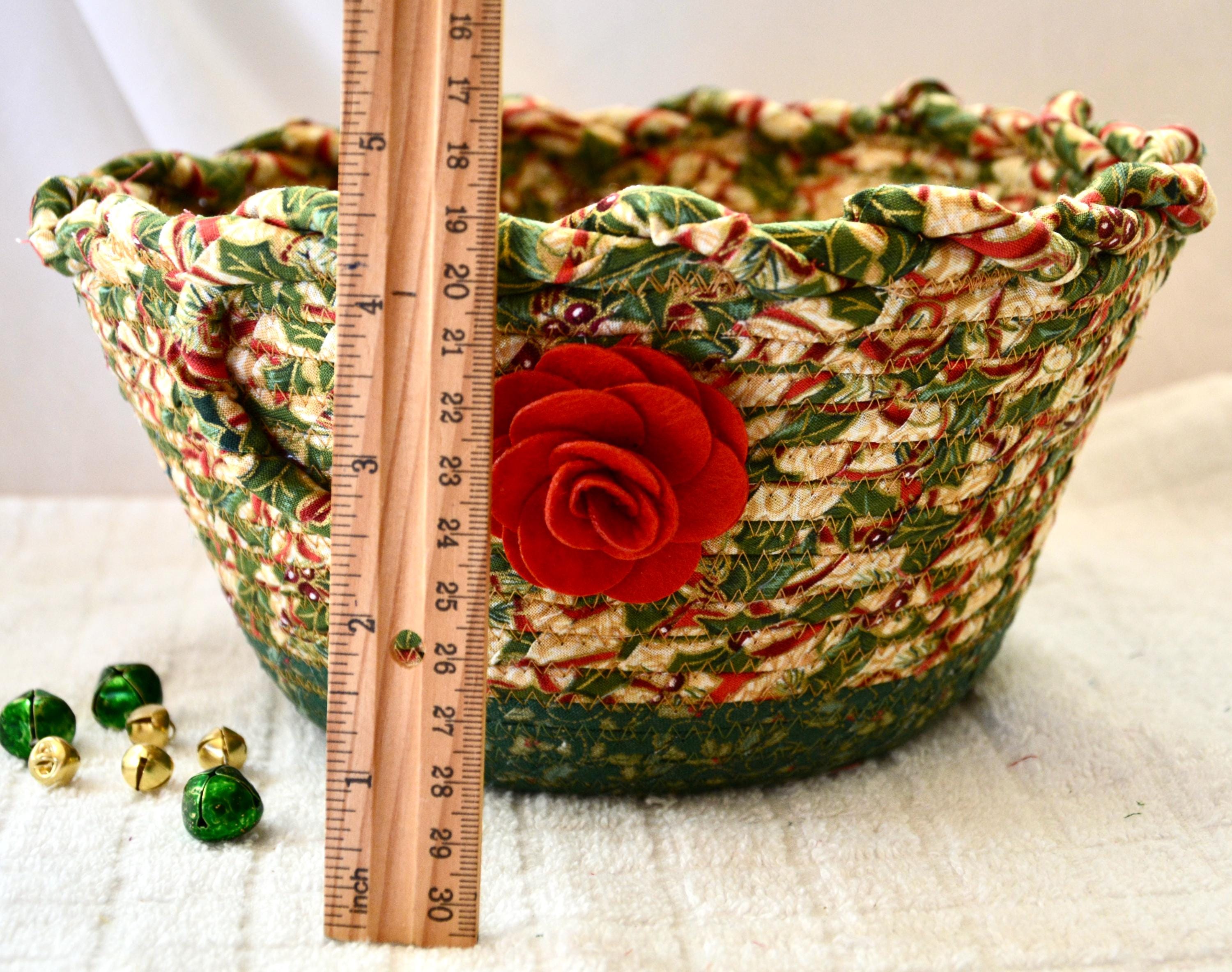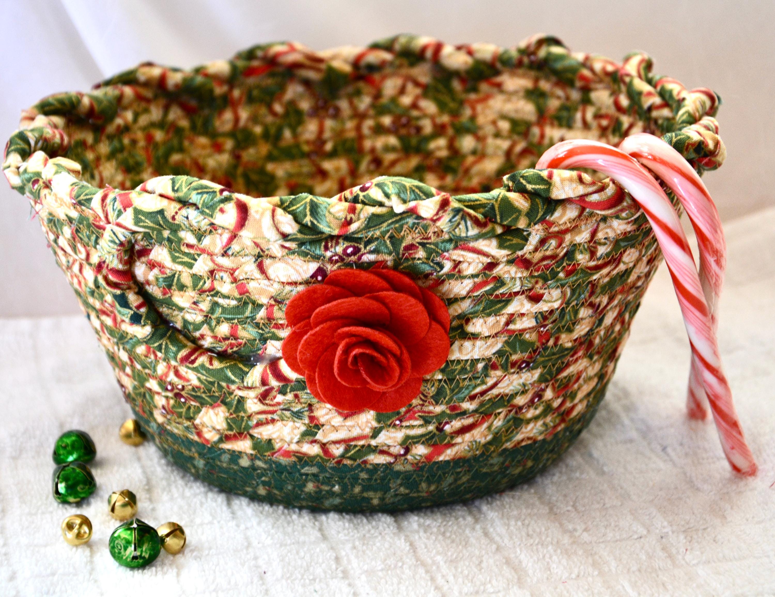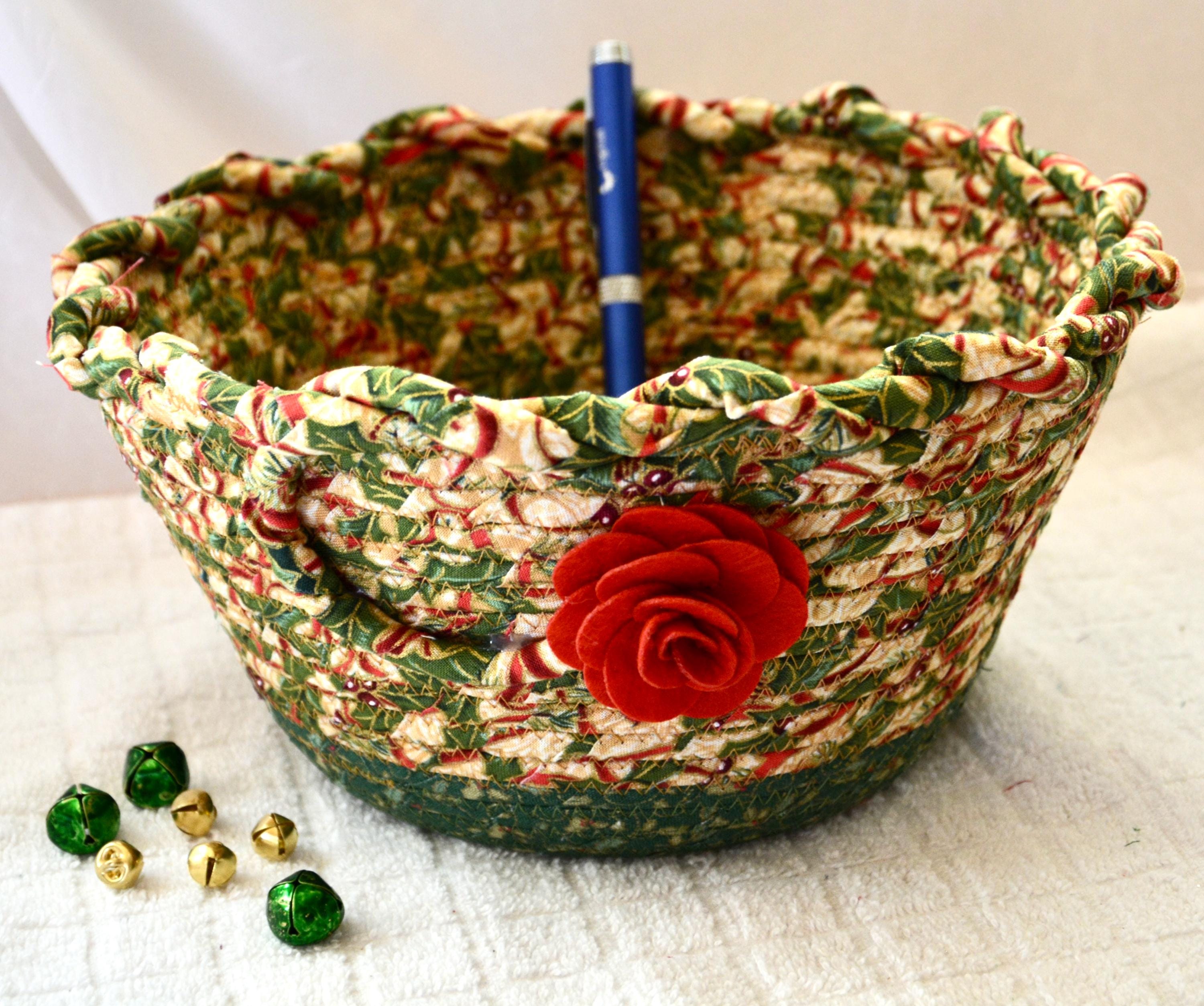 I hand wrapped these high quality fabrics around cotton line, which I then hand coiled and machine quilted to make it sturdy. I used the raw edge technique with some fray to add a wonderful shabby chic texture. I just love the pretty gold highlights in this holly berry fabric! So festive! The pretty flower on the basket is included for nice accent.