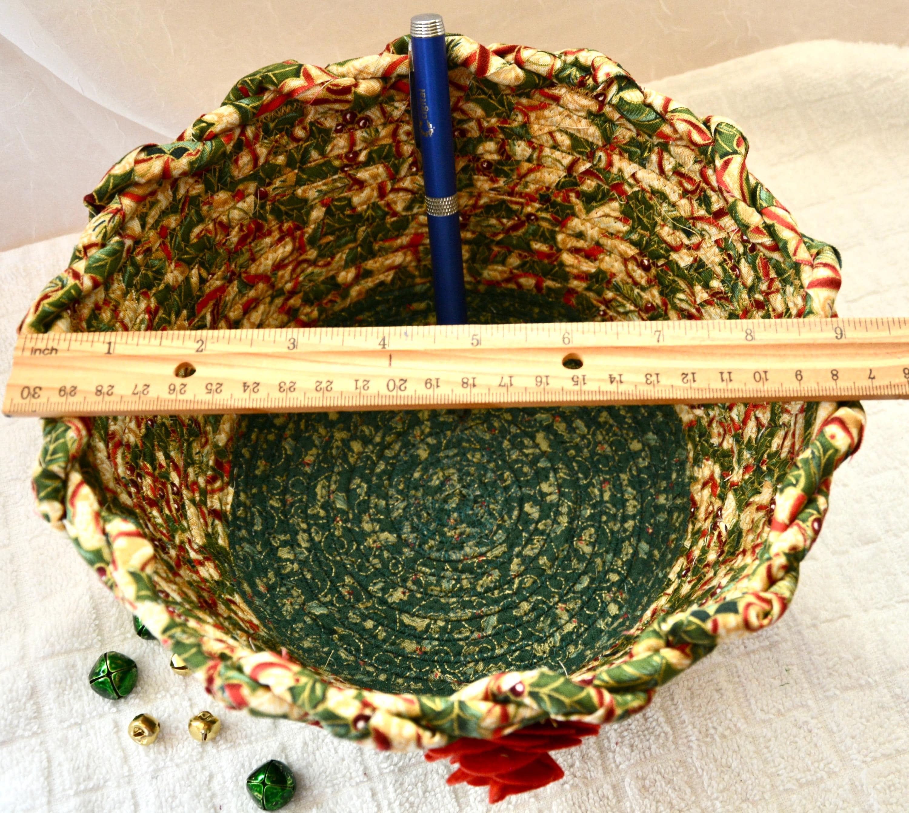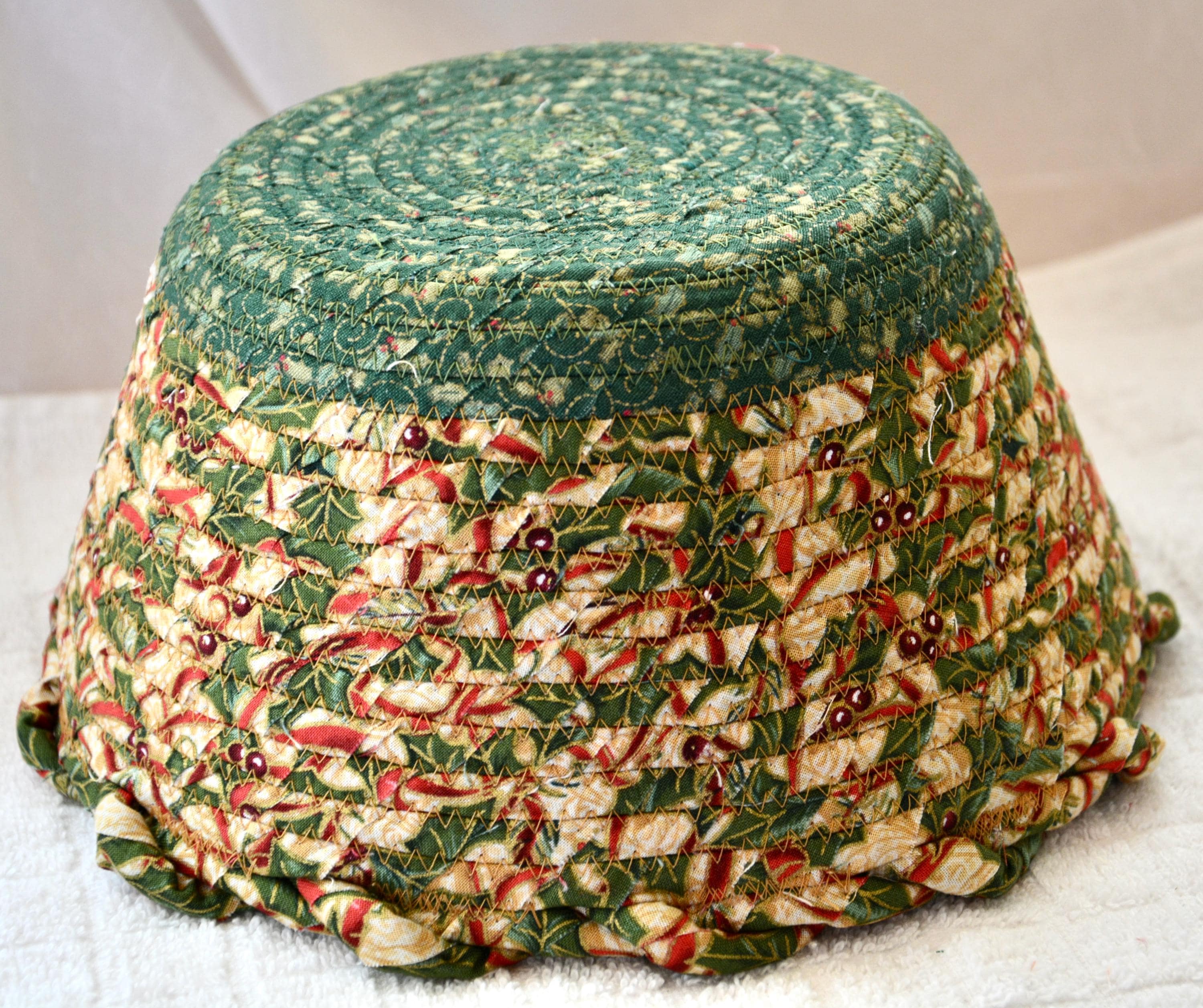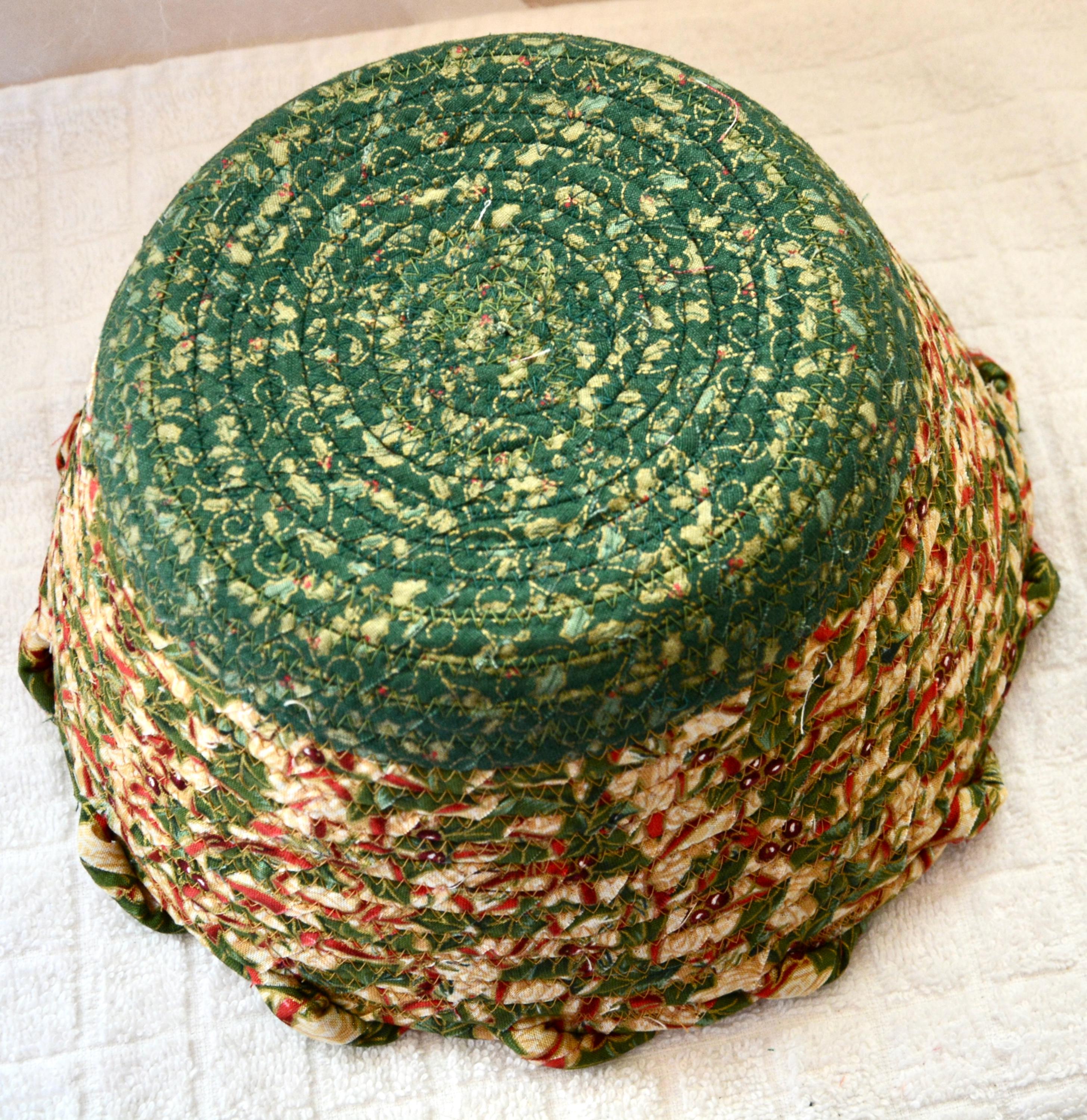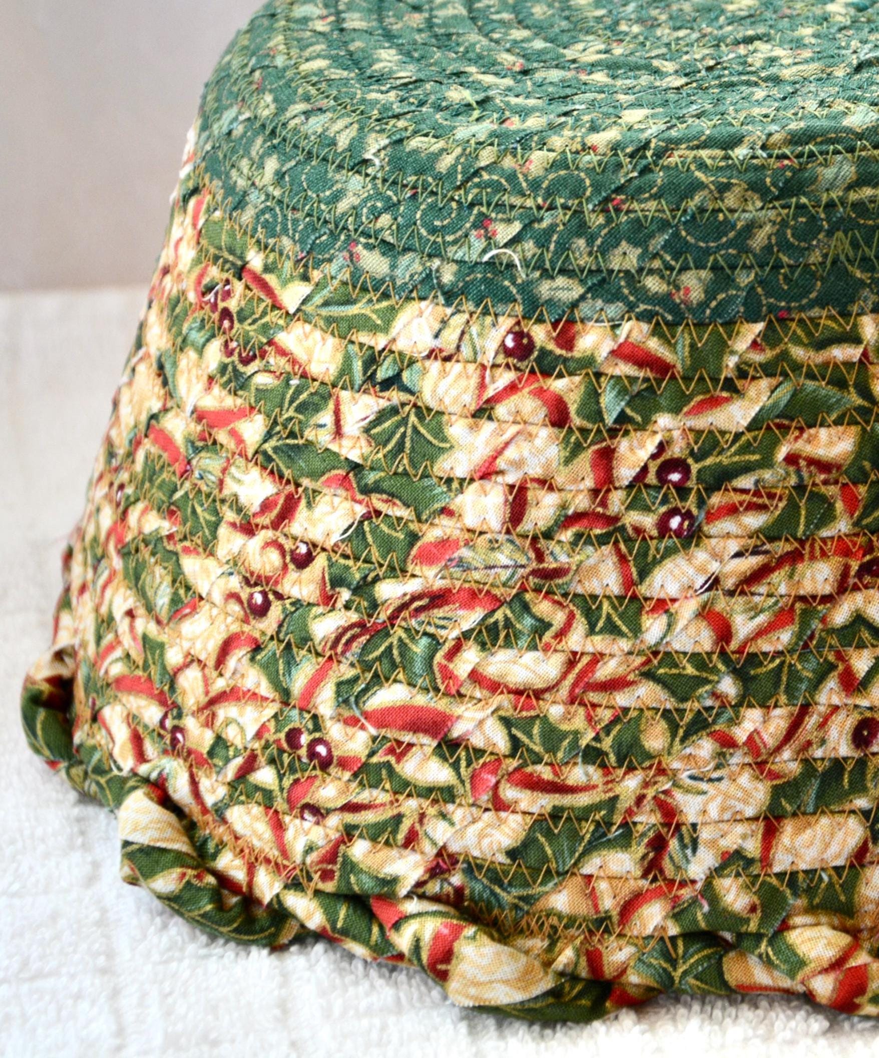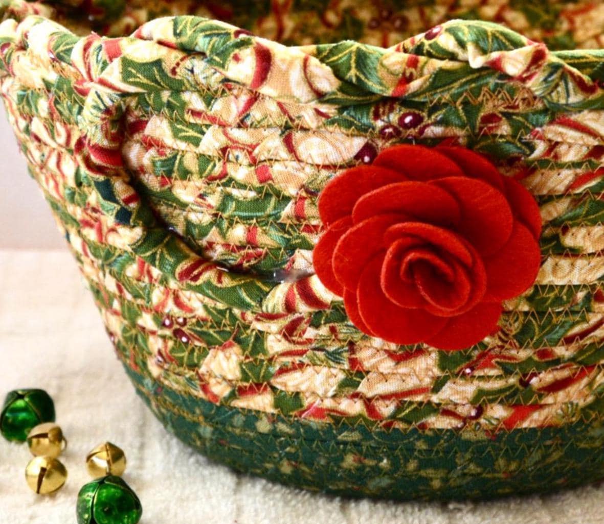 I hand wrapped these high quality fabrics around cotton line, which I then hand coiled and machine quilted to make it sturdy. I used the raw edge technique with some fray to add a wonderful shabby chic texture. I just love the pretty gold highlights in this holly berry fabric! So festive! The pretty flower on the basket is included for nice accent.