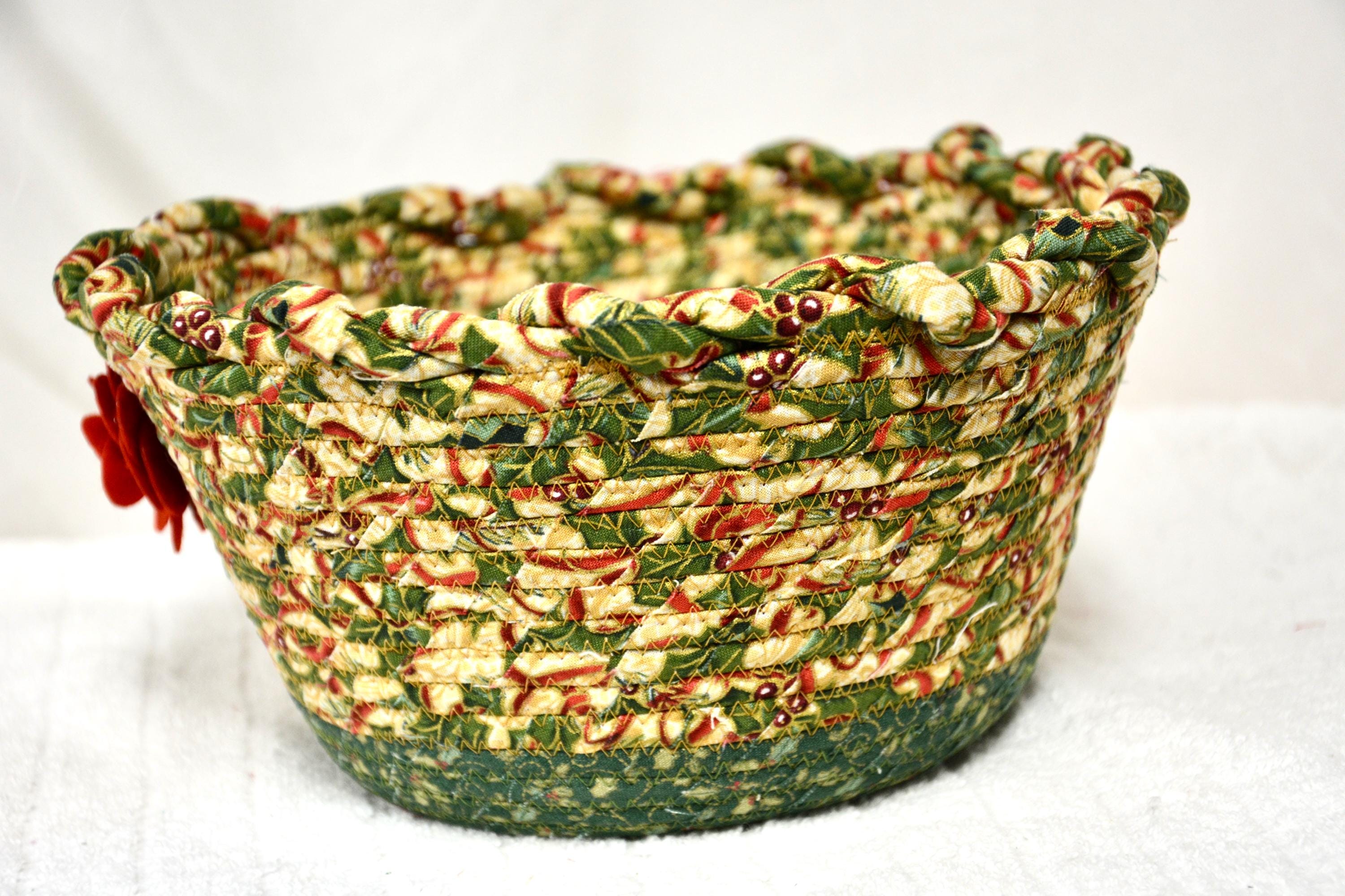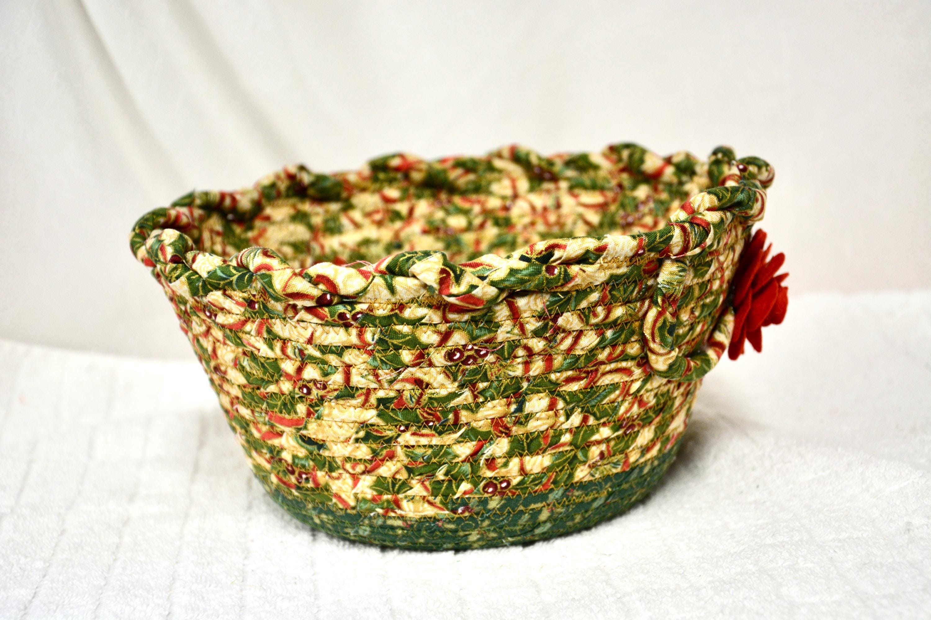 I hand wrapped these high quality fabrics around cotton line, which I then hand coiled and machine quilted to make it sturdy. I used the raw edge technique with some fray to add a wonderful shabby chic texture. I just love the pretty gold highlights in this holly berry fabric! So festive! The pretty flower on the basket is included for nice accent.