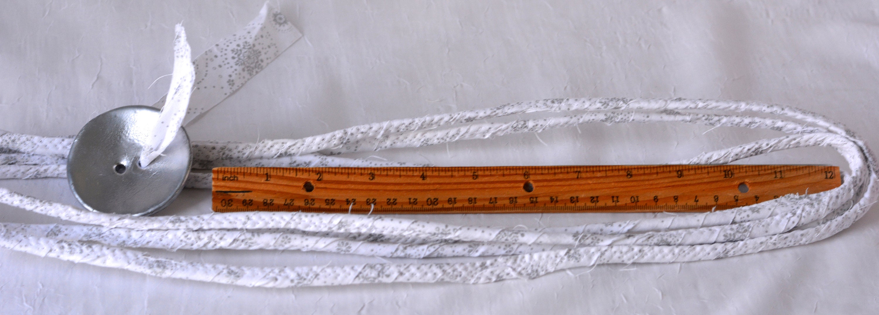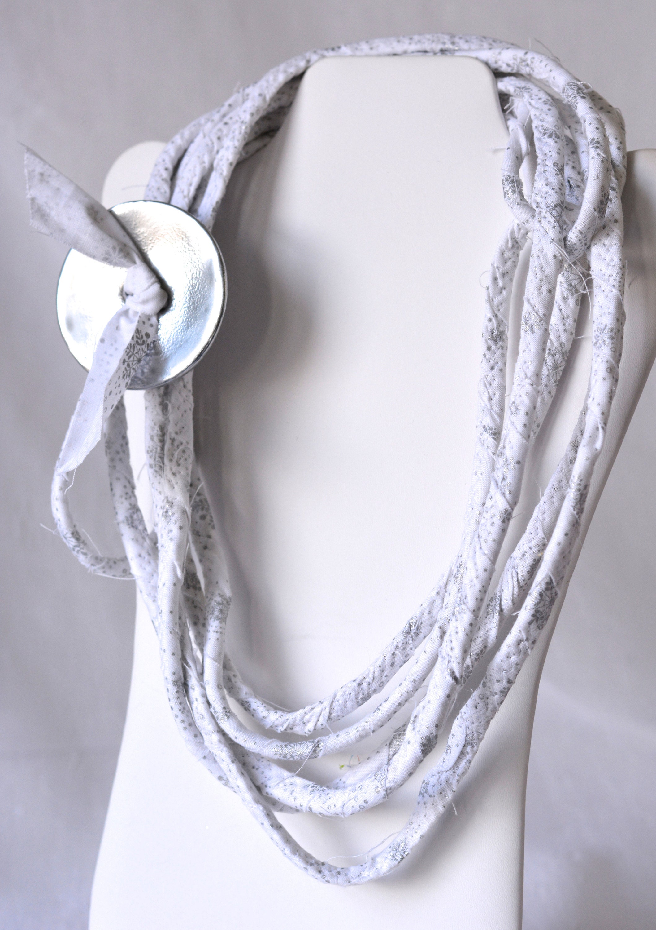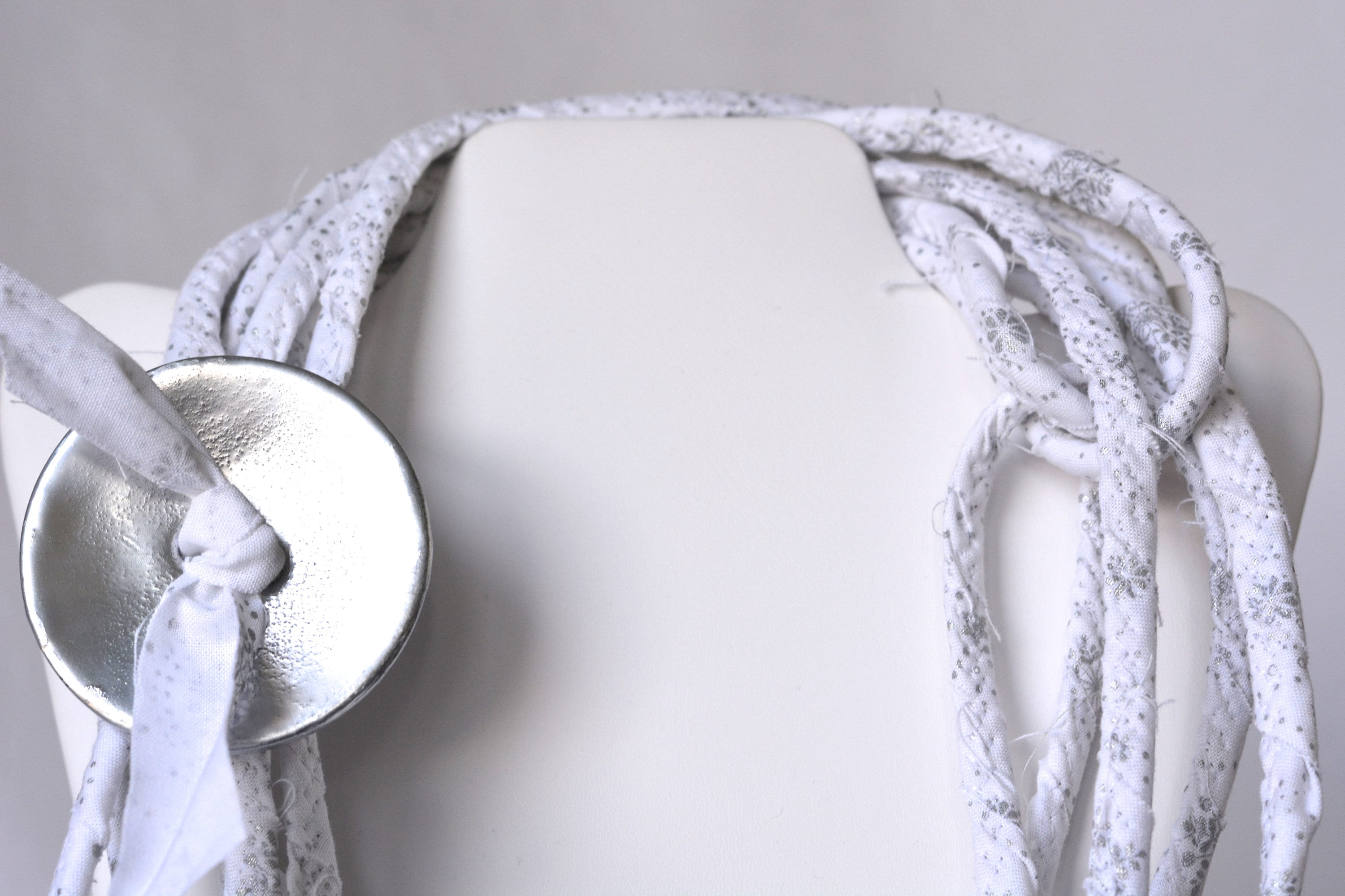 I hand wrapped this modern white fabric around cotton line, which I then machine quilted with a decorative stitch. I used the raw edge technique with some fray for a great shabby chic texture. This wonderful fabric is 100% cotton! Love the silver metallic highlights! The attached pictures just don't show enough of the silver metallic snowflakes, the sunlight just reflects it. The pretty silver button can be tied to as many strands as you like, so it will look different every time you wear it. Add tassels, tie knots and twist it up! Have Fun!