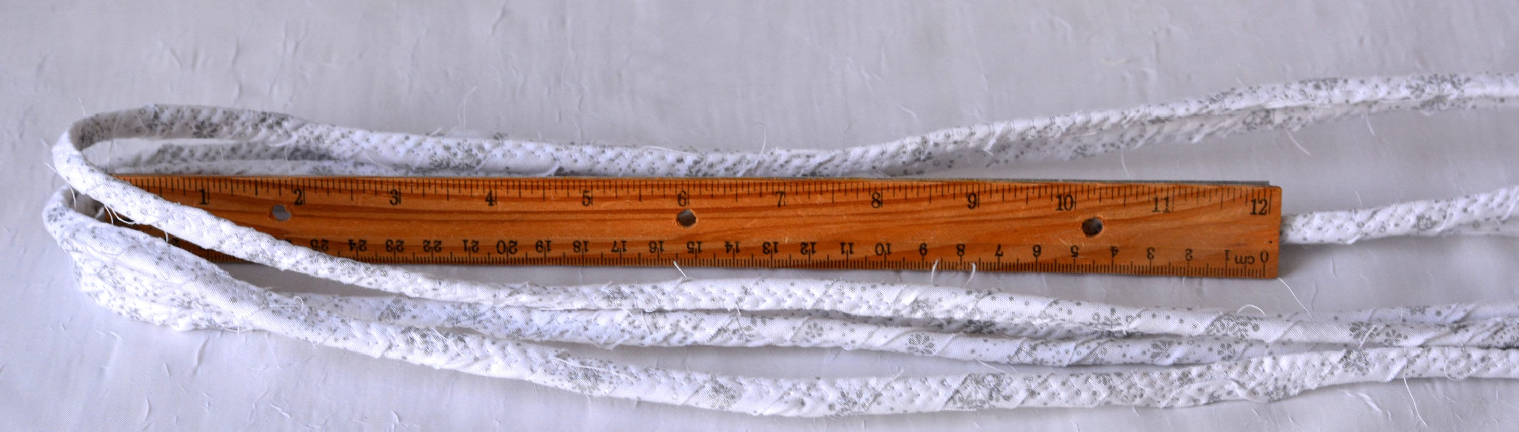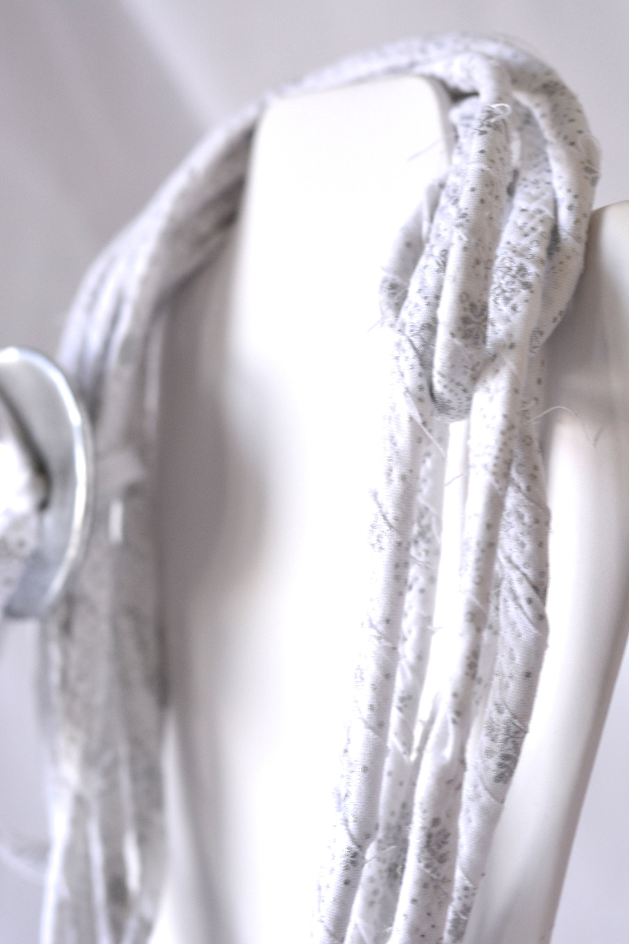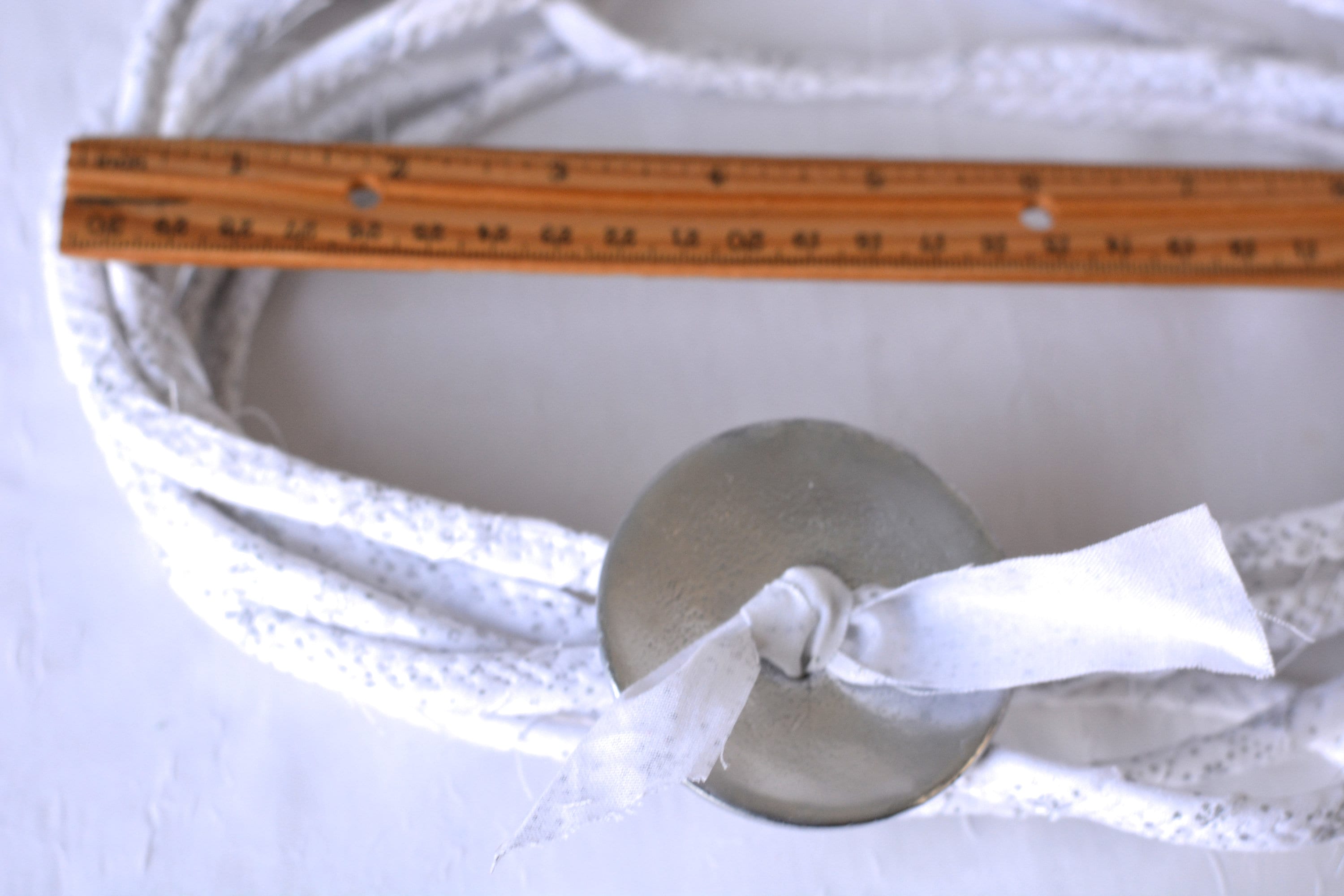I hand wrapped this modern white fabric around cotton line, which I then machine quilted with a decorative stitch. I used the raw edge technique with some fray for a great shabby chic texture. This wonderful fabric is 100% cotton! Love the silver metallic highlights! The attached pictures just don't show enough of the silver metallic snowflakes, the sunlight just reflects it. The pretty silver button can be tied to as many strands as you like, so it will look different every time you wear it. Add tassels, tie knots and twist it up! Have Fun!