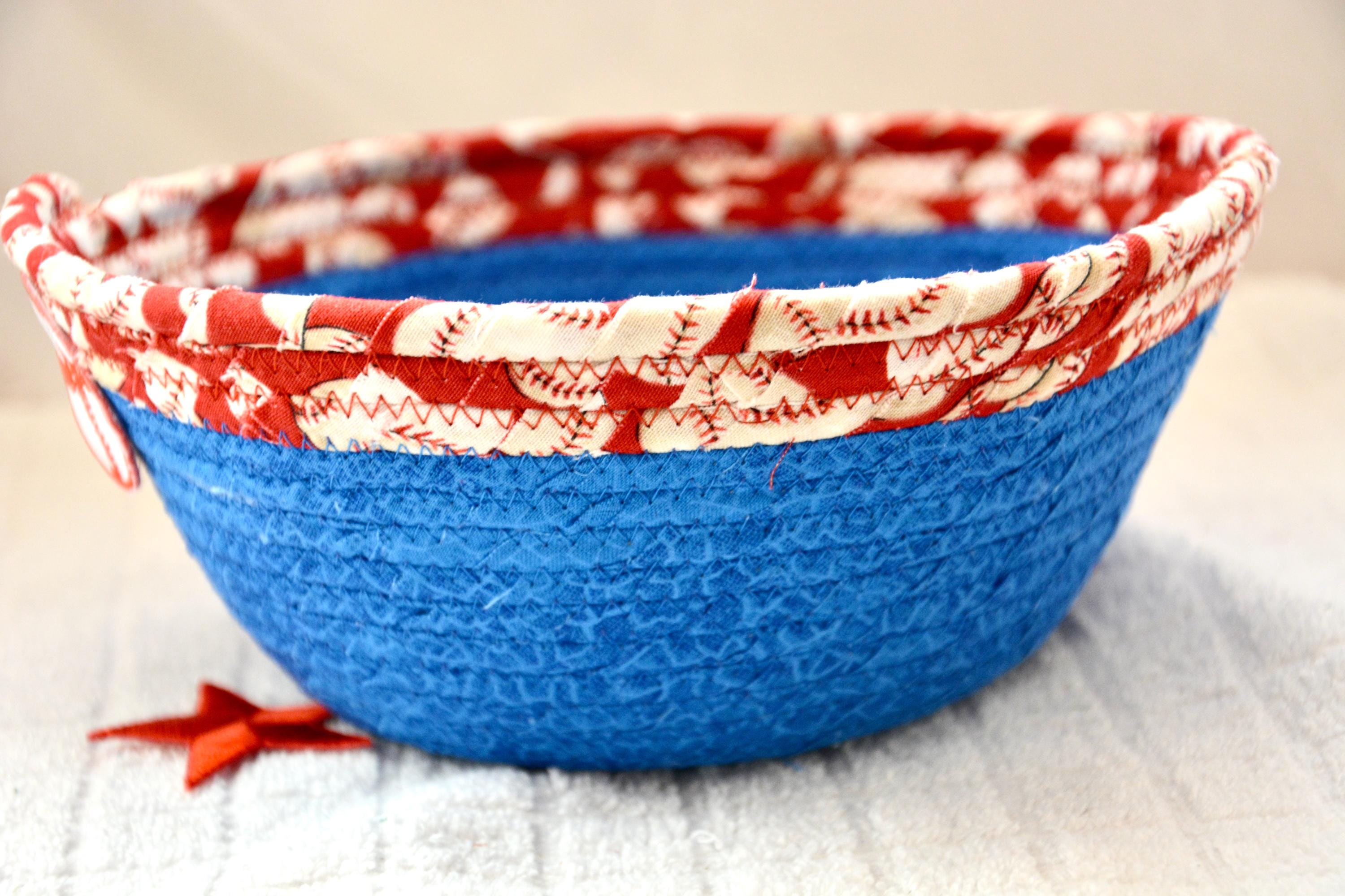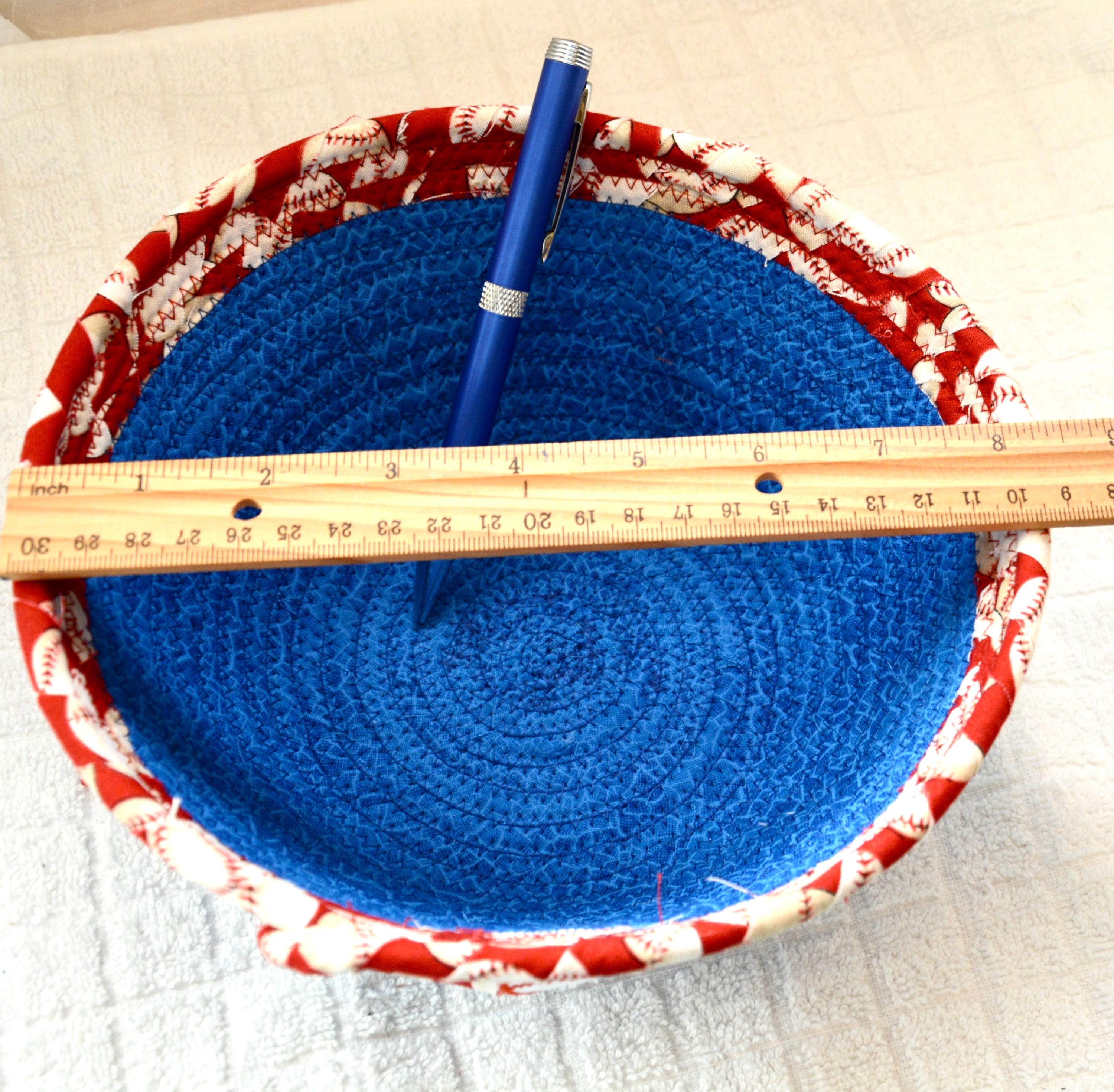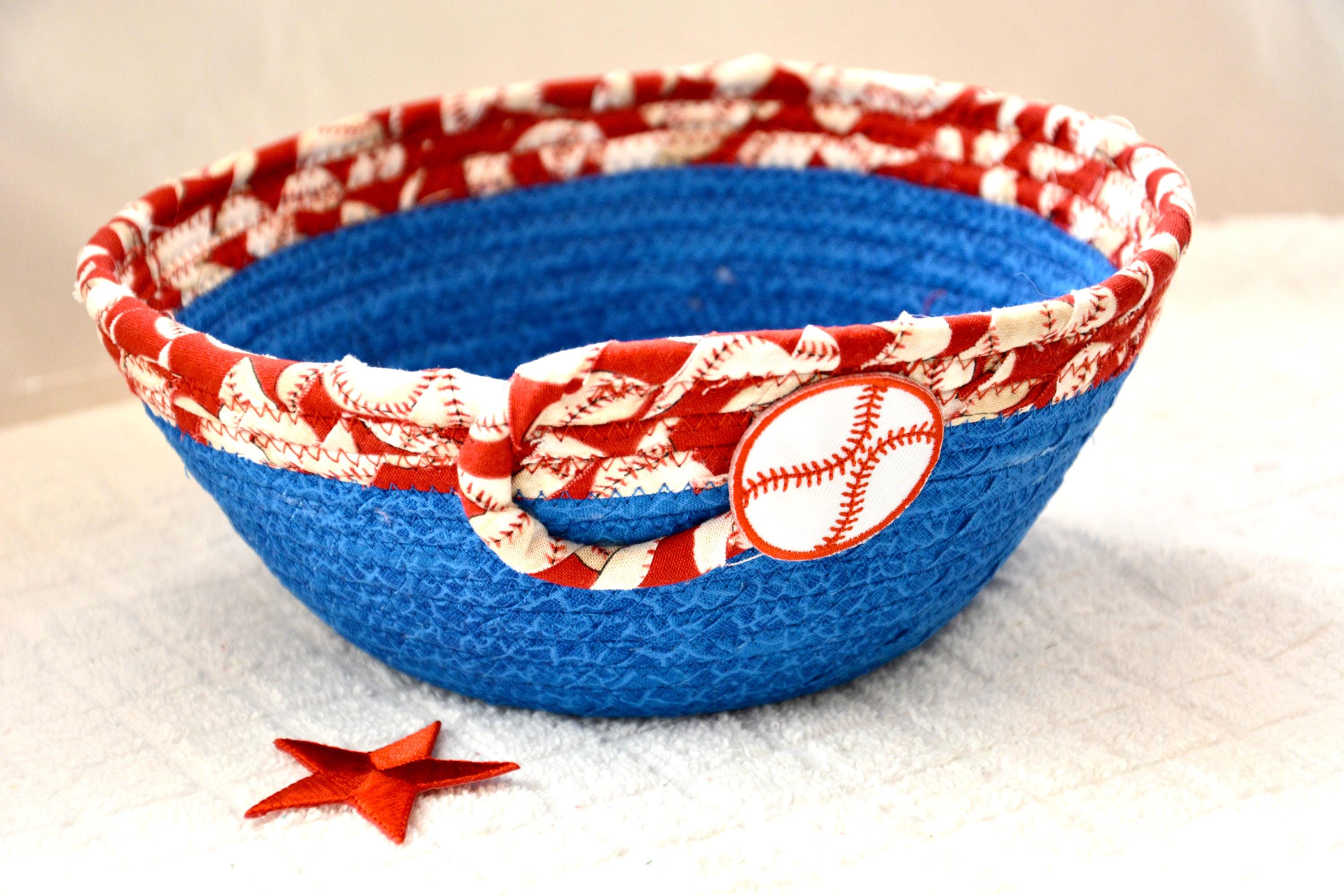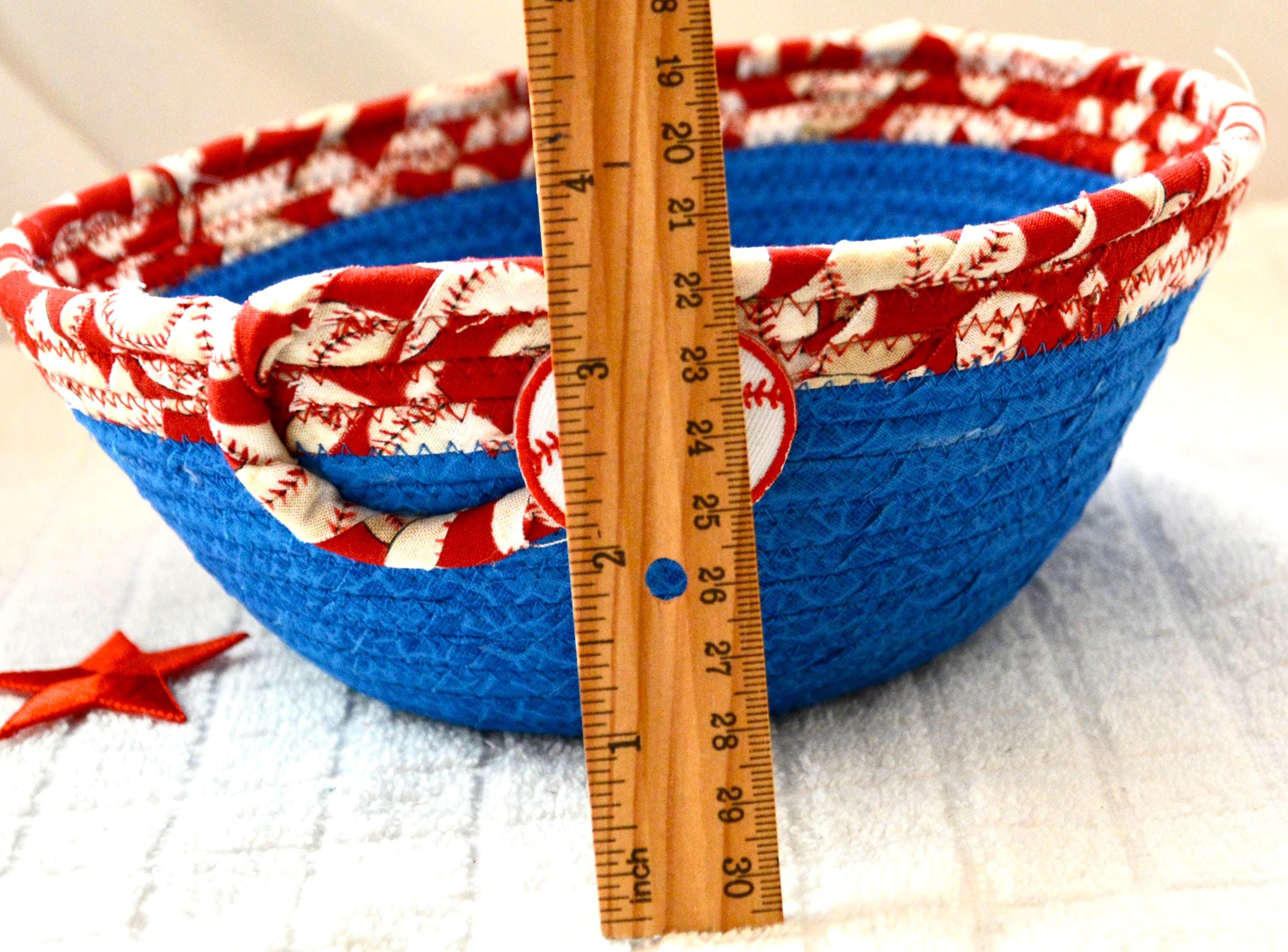 I hand wrapped these festive fabrics around cotton line, which I then hand coiled and machine quilted to make it sturdy. I used the raw edge technique with some fray to add texture. These fun fabrics are high quality 100% cotton and show on the inside of this lovely basket too! The cute baseball appliqué on the basket is included for a nice accent. Please see picture with the pen and ruler to help gauge the basket size.