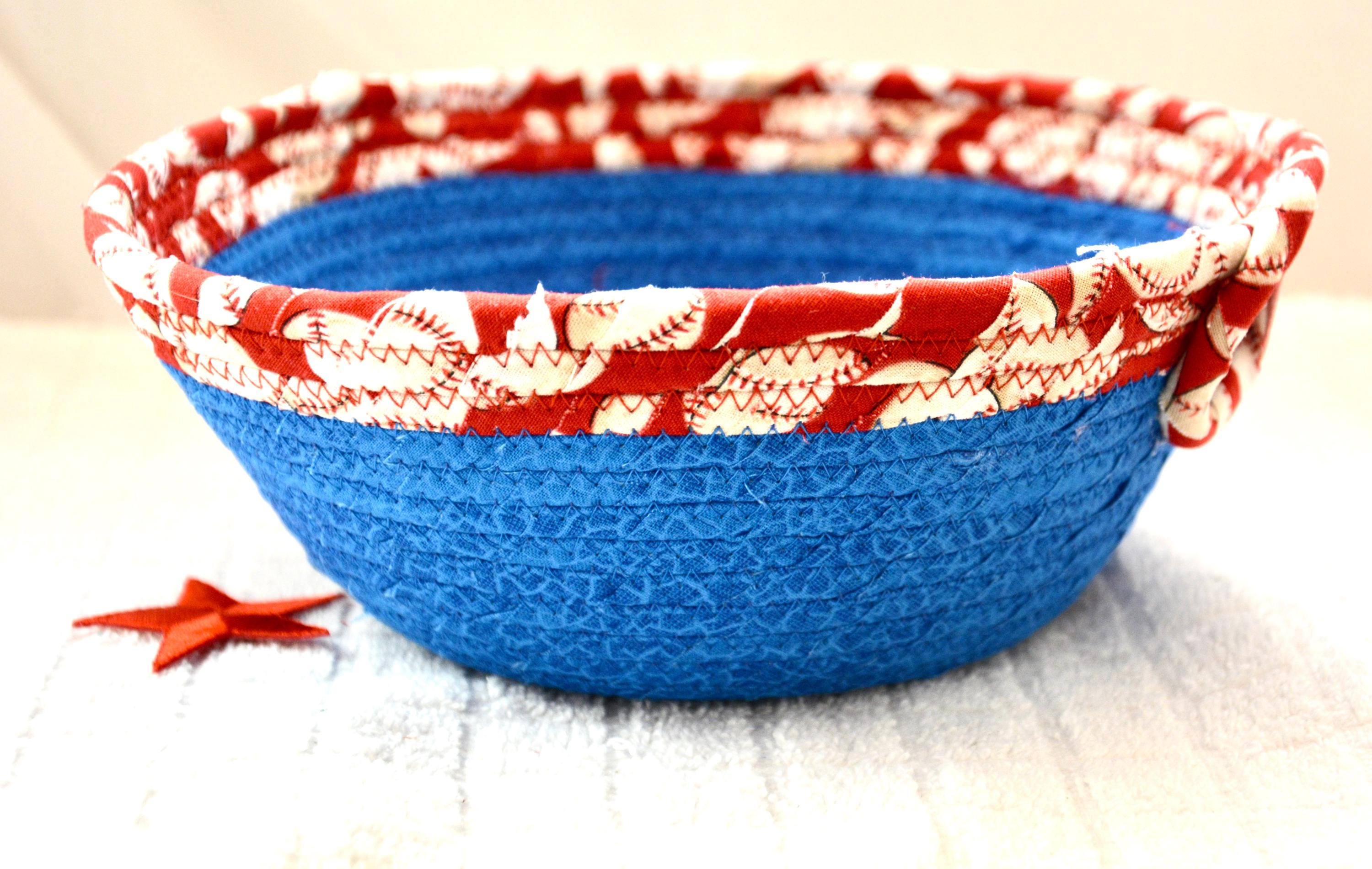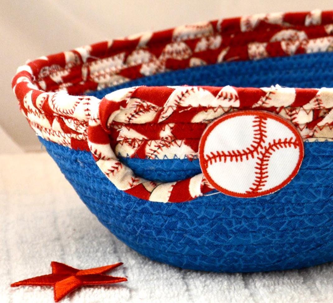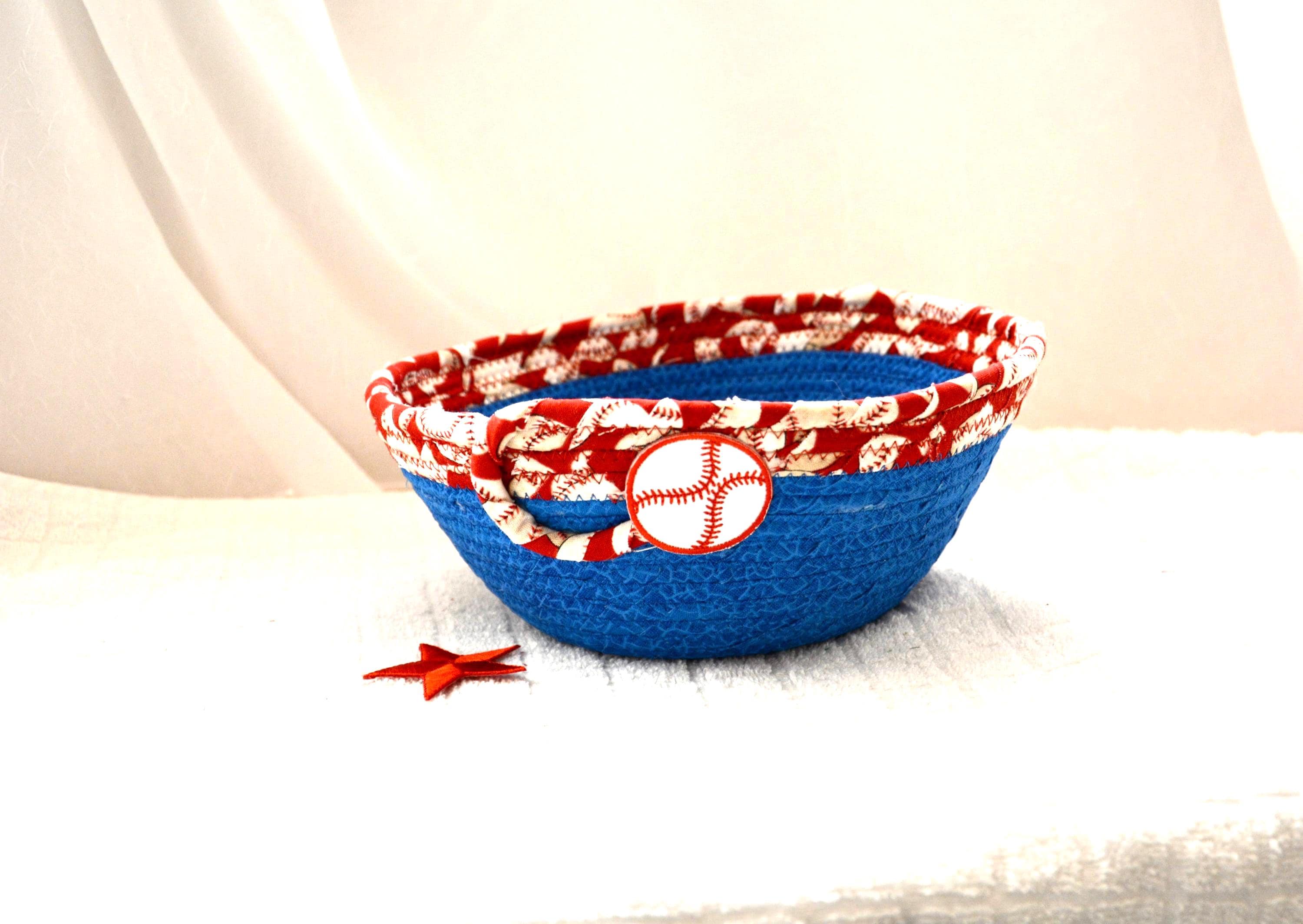 I hand wrapped these festive fabrics around cotton line, which I then hand coiled and machine quilted to make it sturdy. I used the raw edge technique with some fray to add texture. These fun fabrics are high quality 100% cotton and show on the inside of this lovely basket too! The cute baseball appliqué on the basket is included for a nice accent. Please see picture with the pen and ruler to help gauge the basket size.