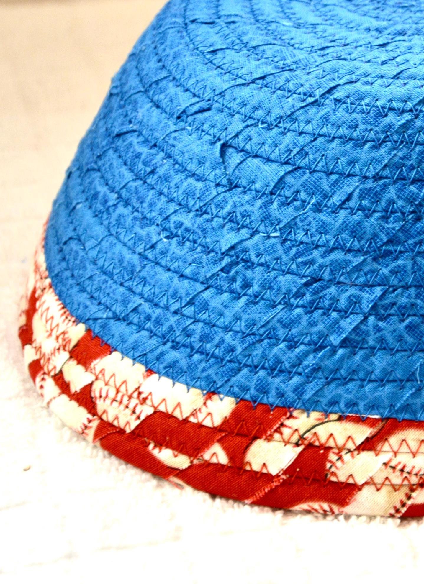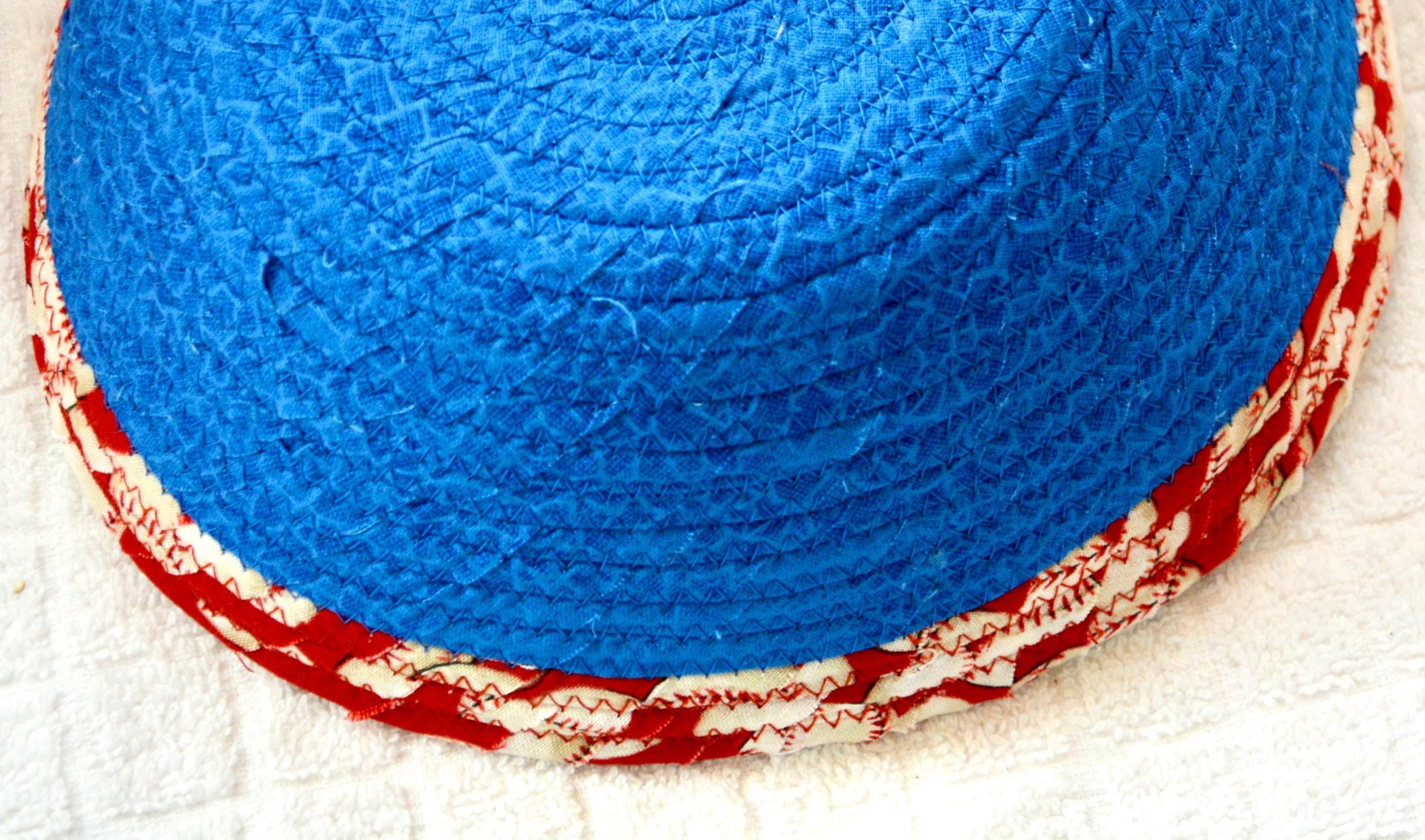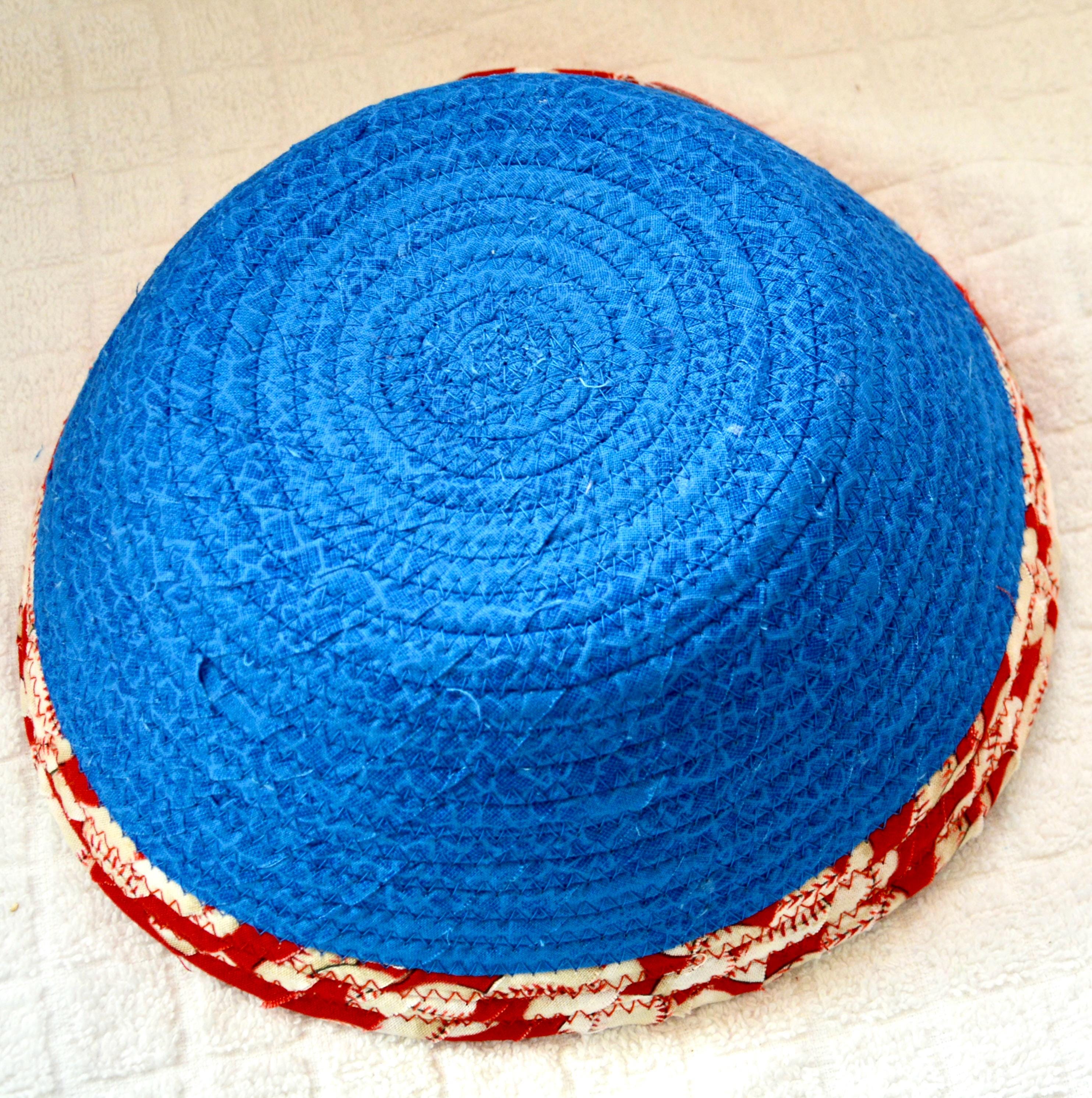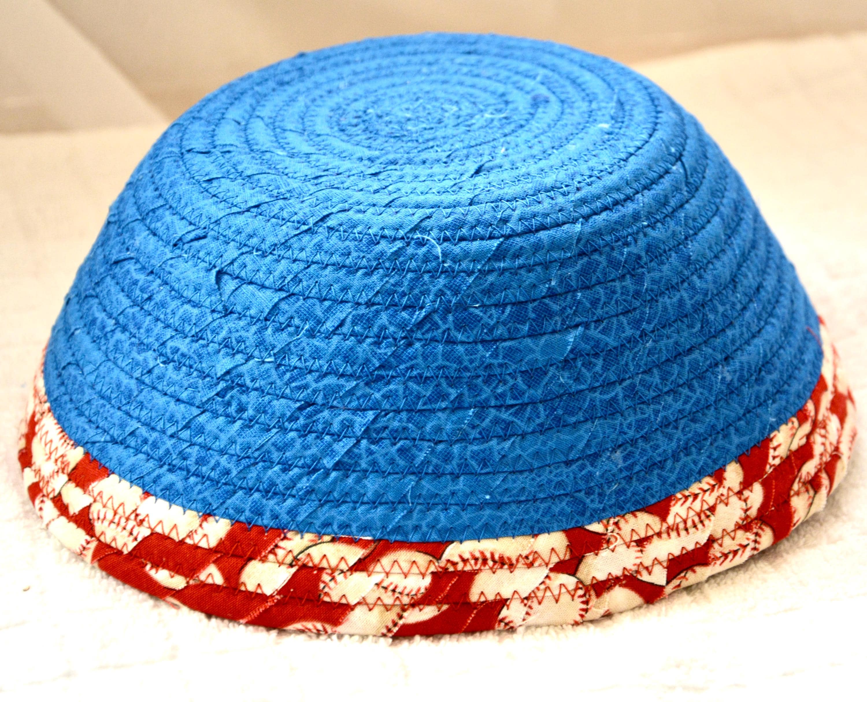 I hand wrapped these festive fabrics around cotton line, which I then hand coiled and machine quilted to make it sturdy. I used the raw edge technique with some fray to add texture. These fun fabrics are high quality 100% cotton and show on the inside of this lovely basket too! The cute baseball appliqué on the basket is included for a nice accent. Please see picture with the pen and ruler to help gauge the basket size.