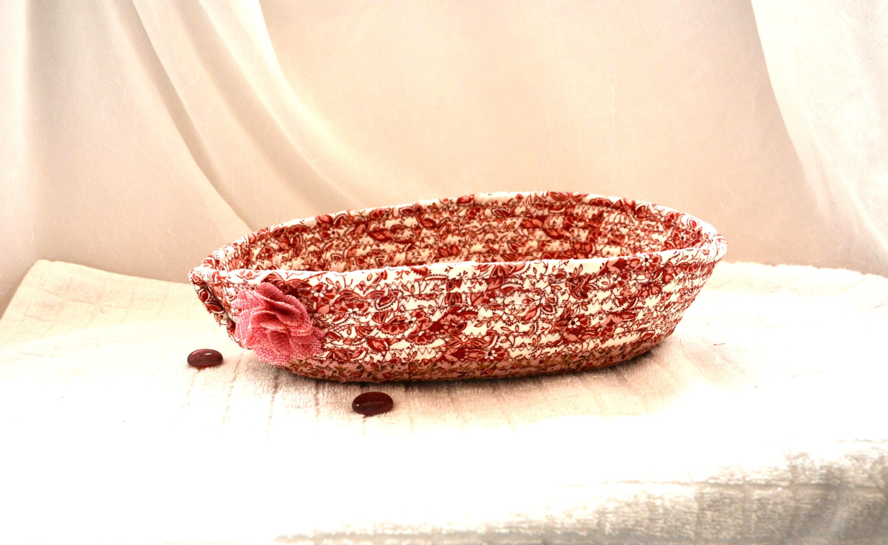 I hand wrapped these lovely floral fabrics around cotton line, which I then hand coiled and machine quilted to make it sturdy. I used the raw edge technique with some fray for a great shabby chic texture. 100% cotton fabric and shows on the inside of the basket too!