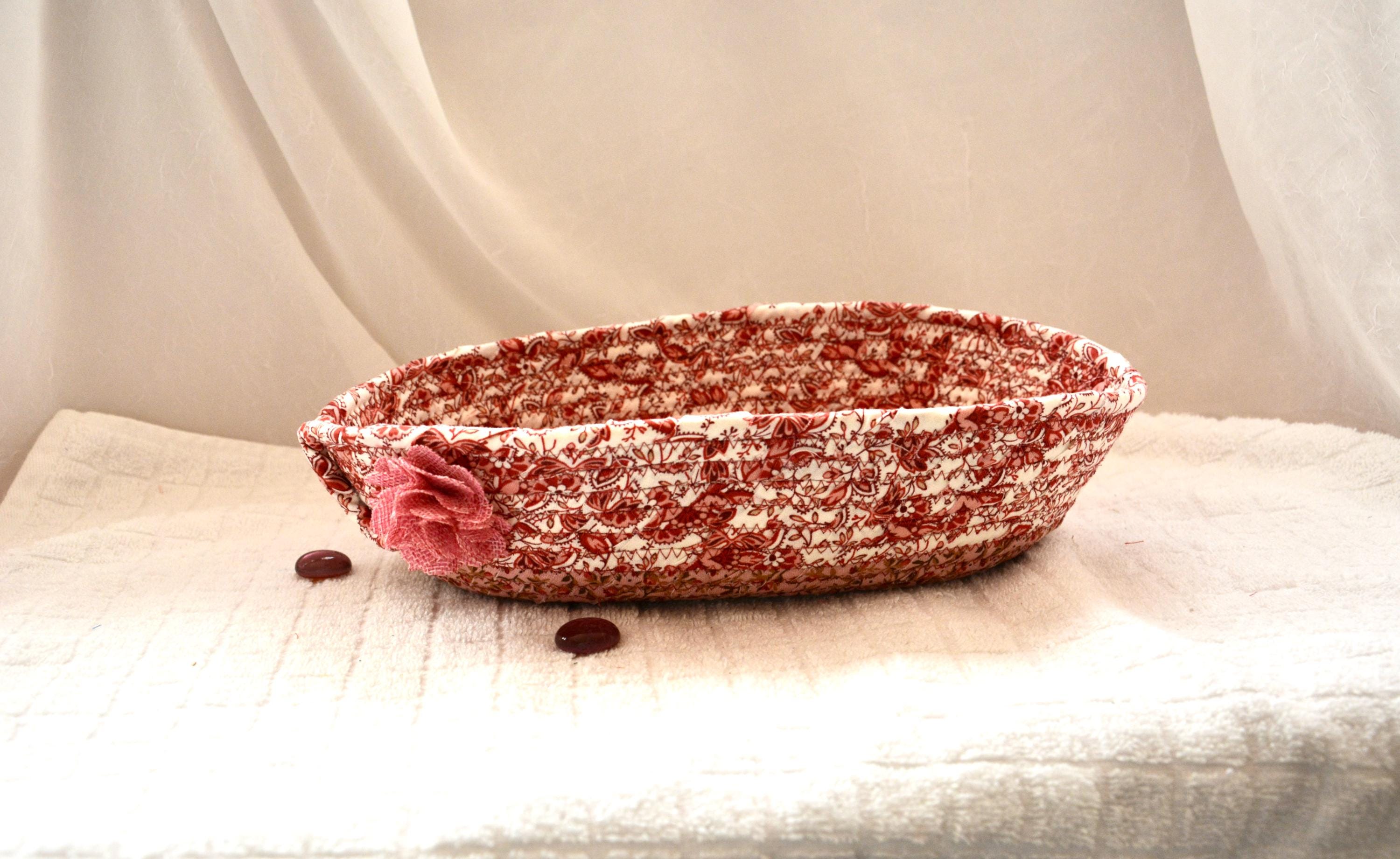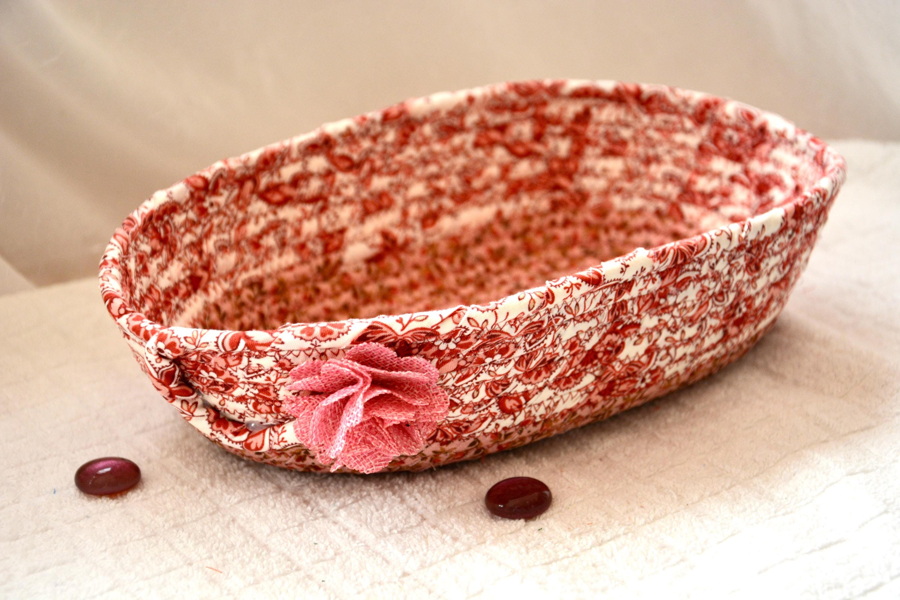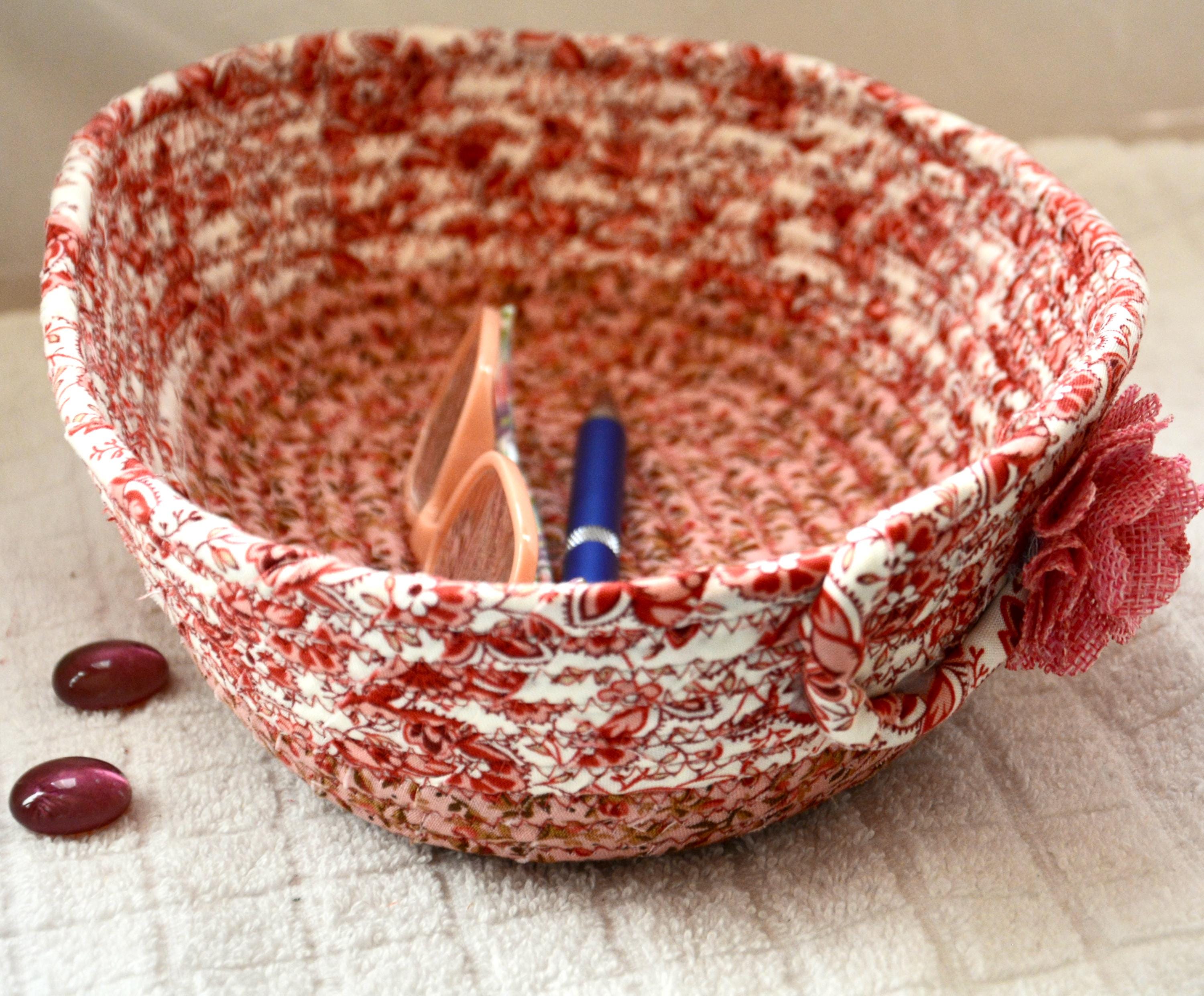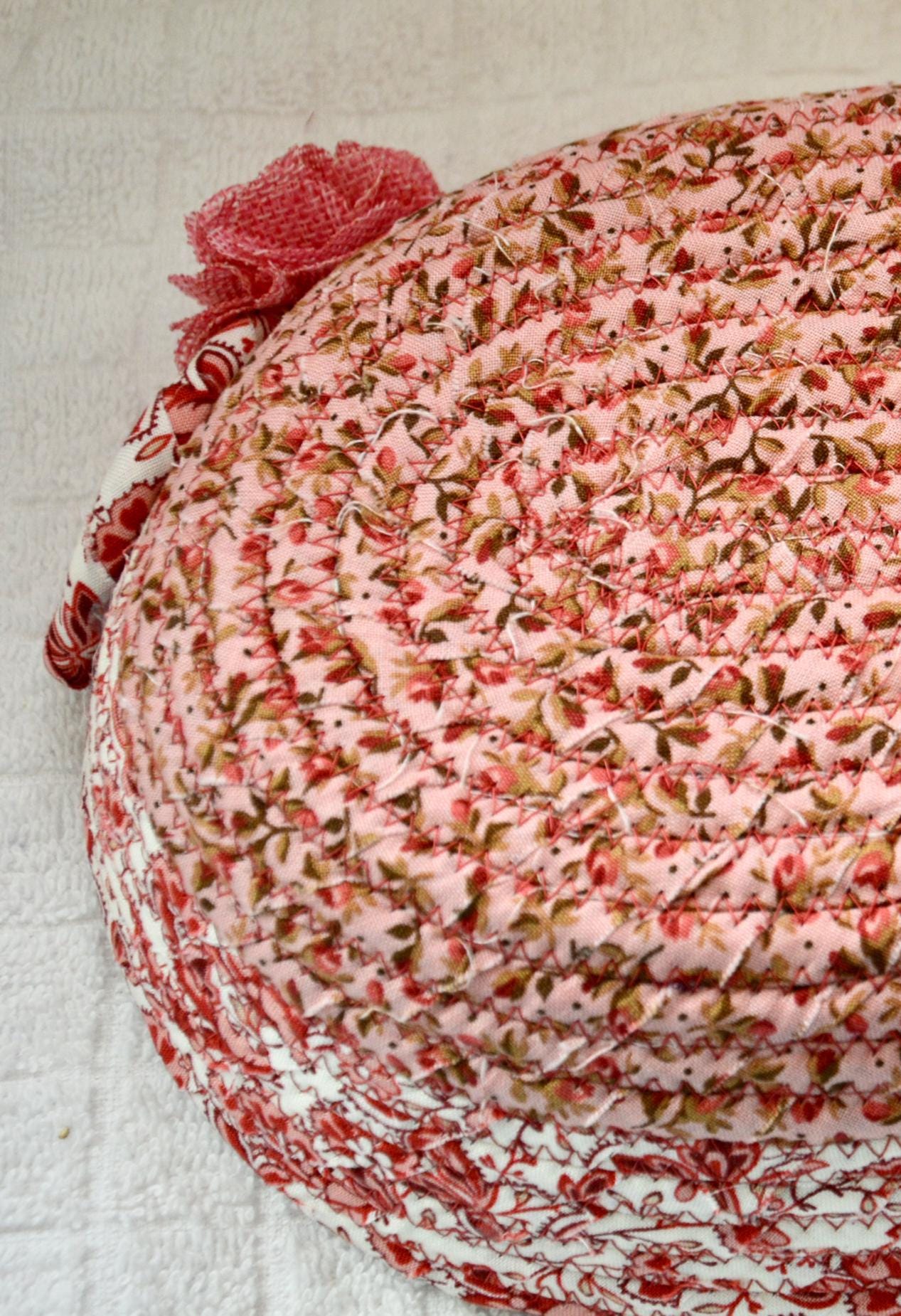 I hand wrapped these lovely floral fabrics around cotton line, which I then hand coiled and machine quilted to make it sturdy. I used the raw edge technique with some fray for a great shabby chic texture. 100% cotton fabric and shows on the inside of the basket too!