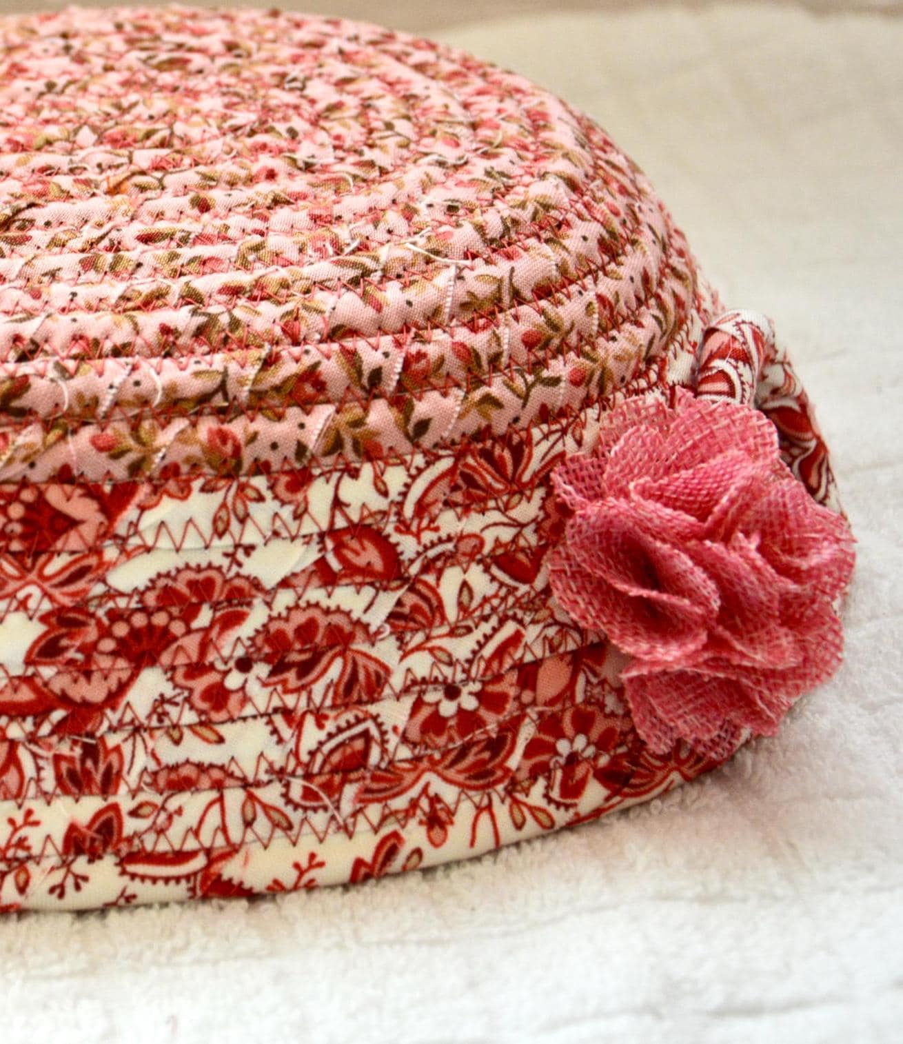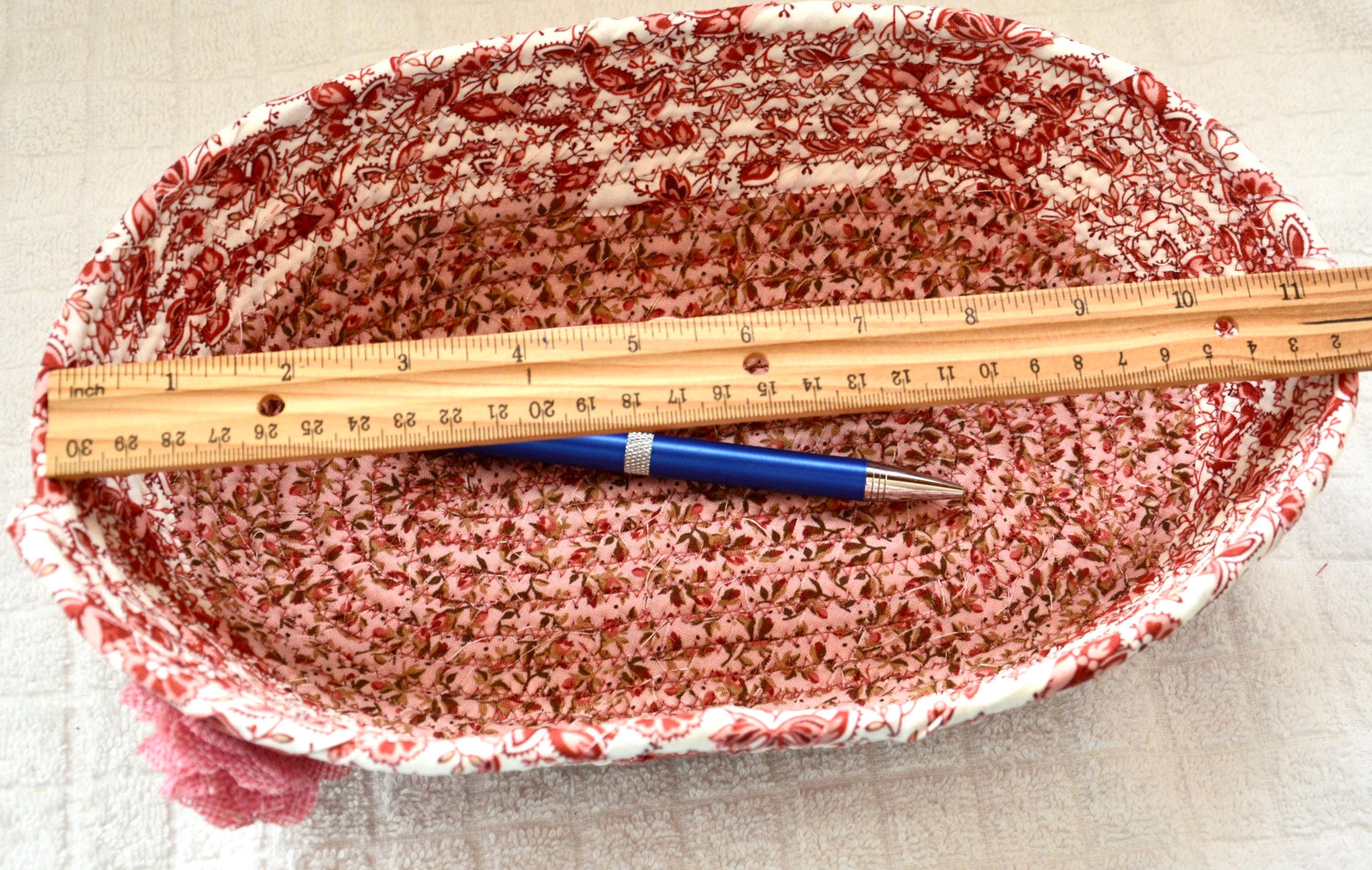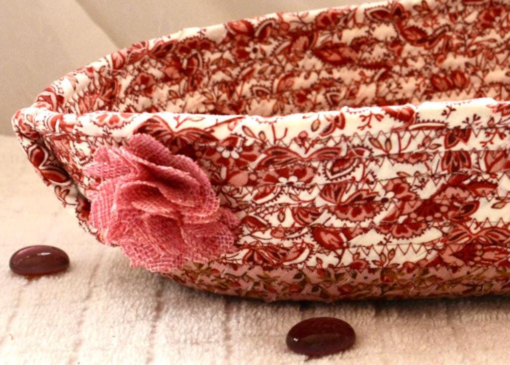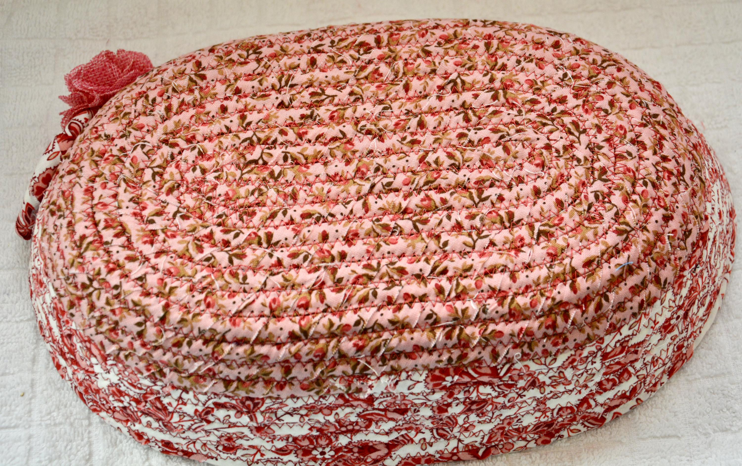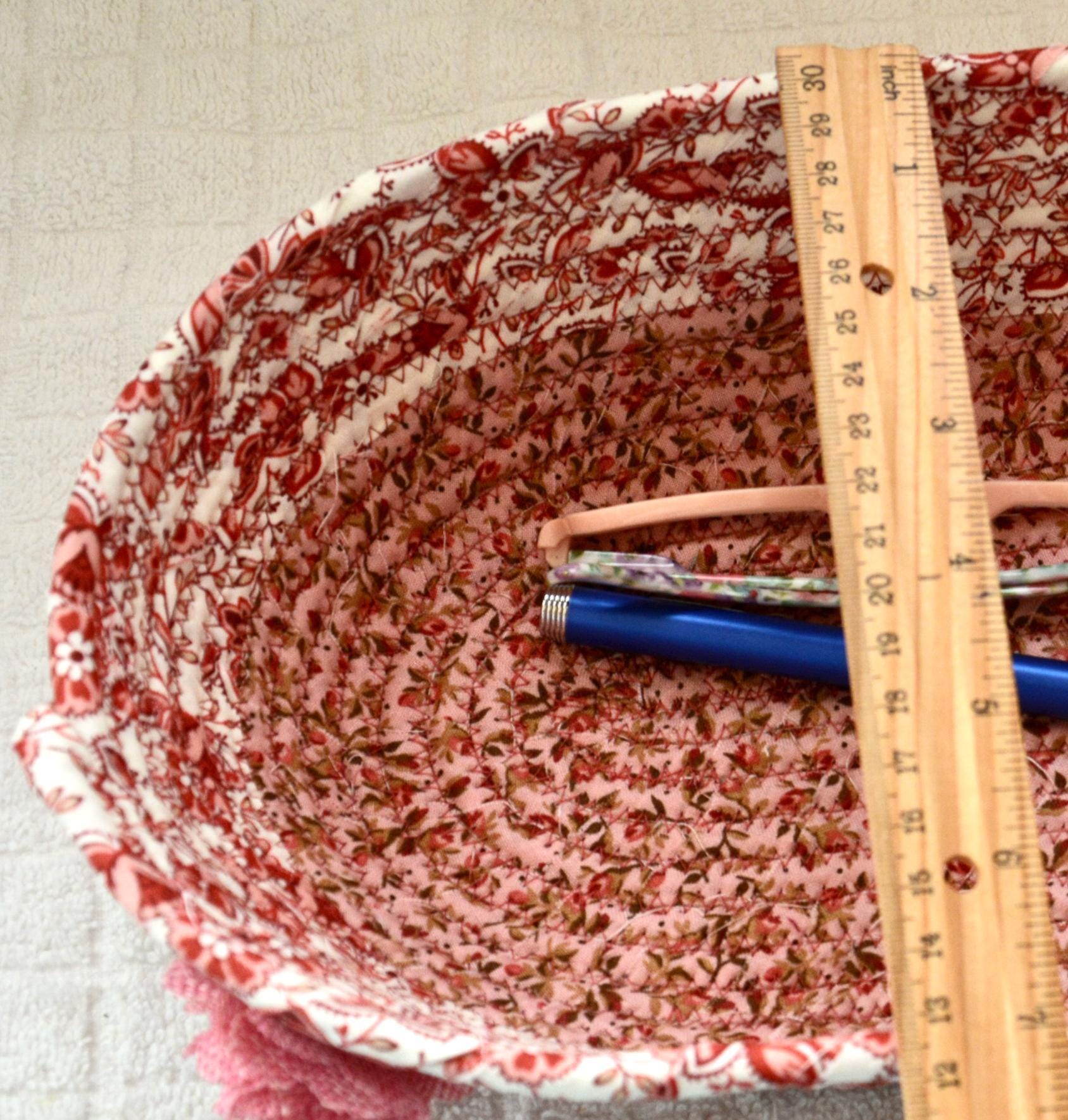 I hand wrapped these lovely floral fabrics around cotton line, which I then hand coiled and machine quilted to make it sturdy. I used the raw edge technique with some fray for a great shabby chic texture. 100% cotton fabric and shows on the inside of the basket too!