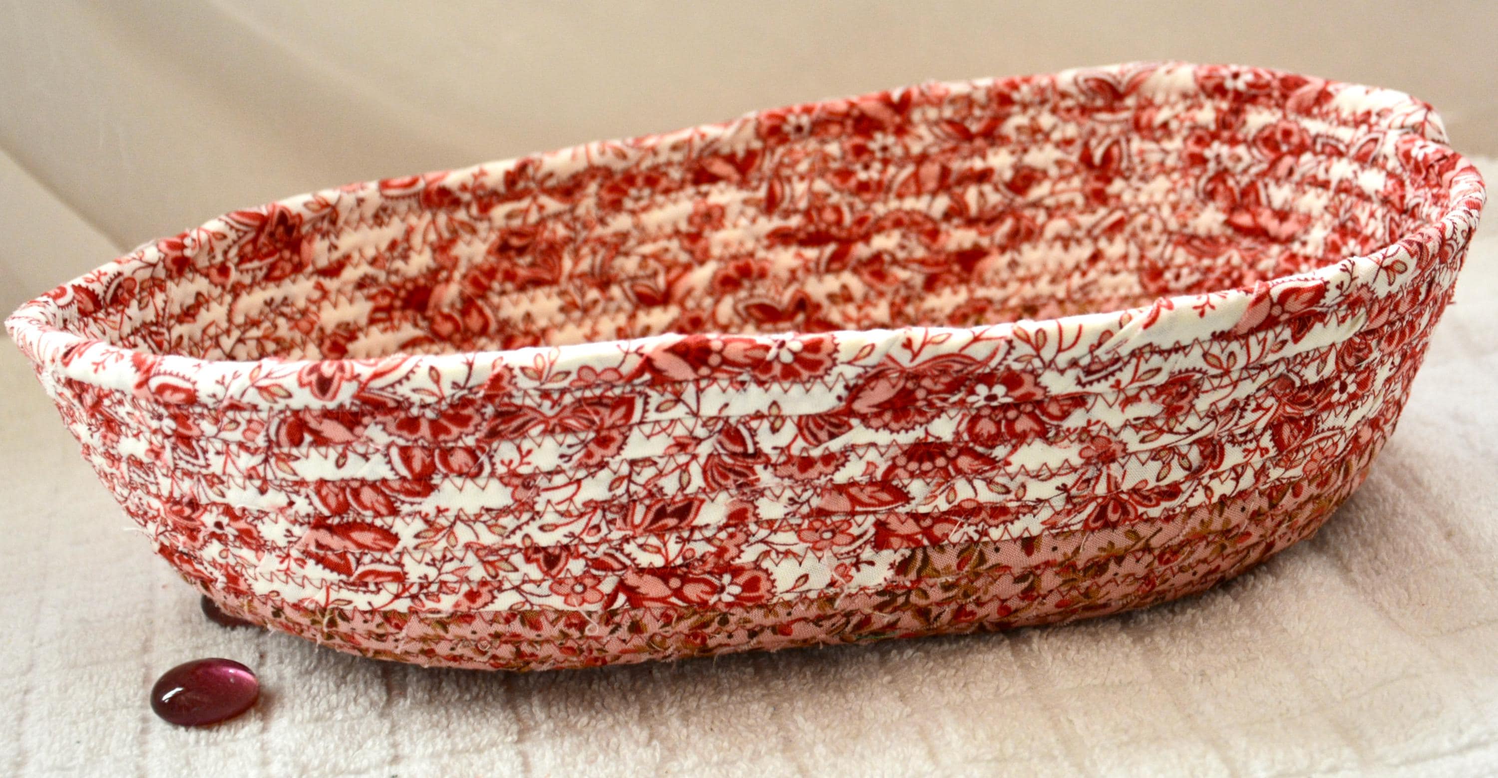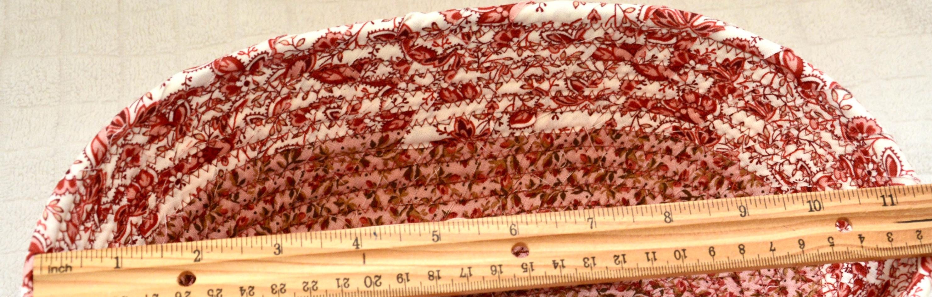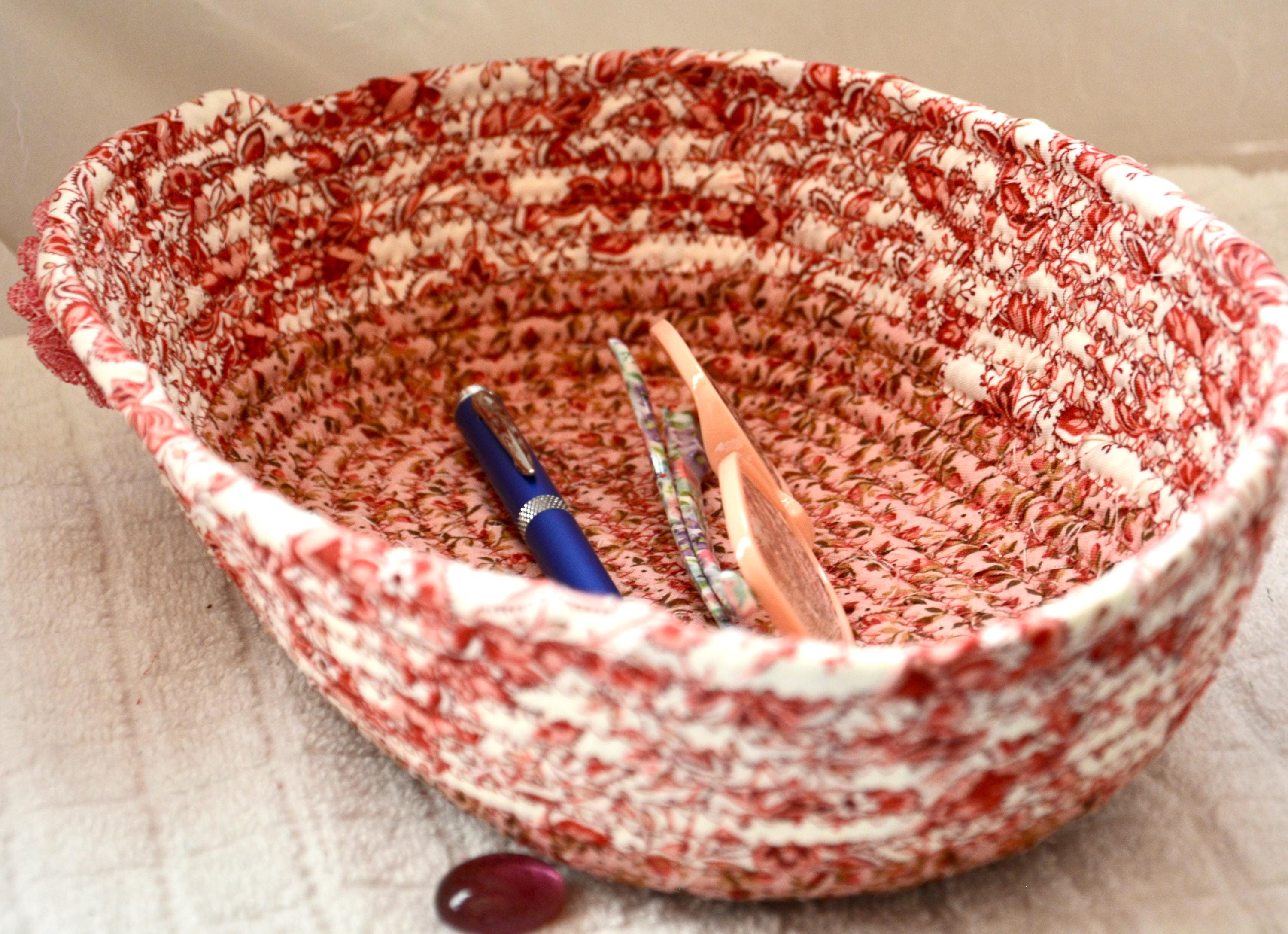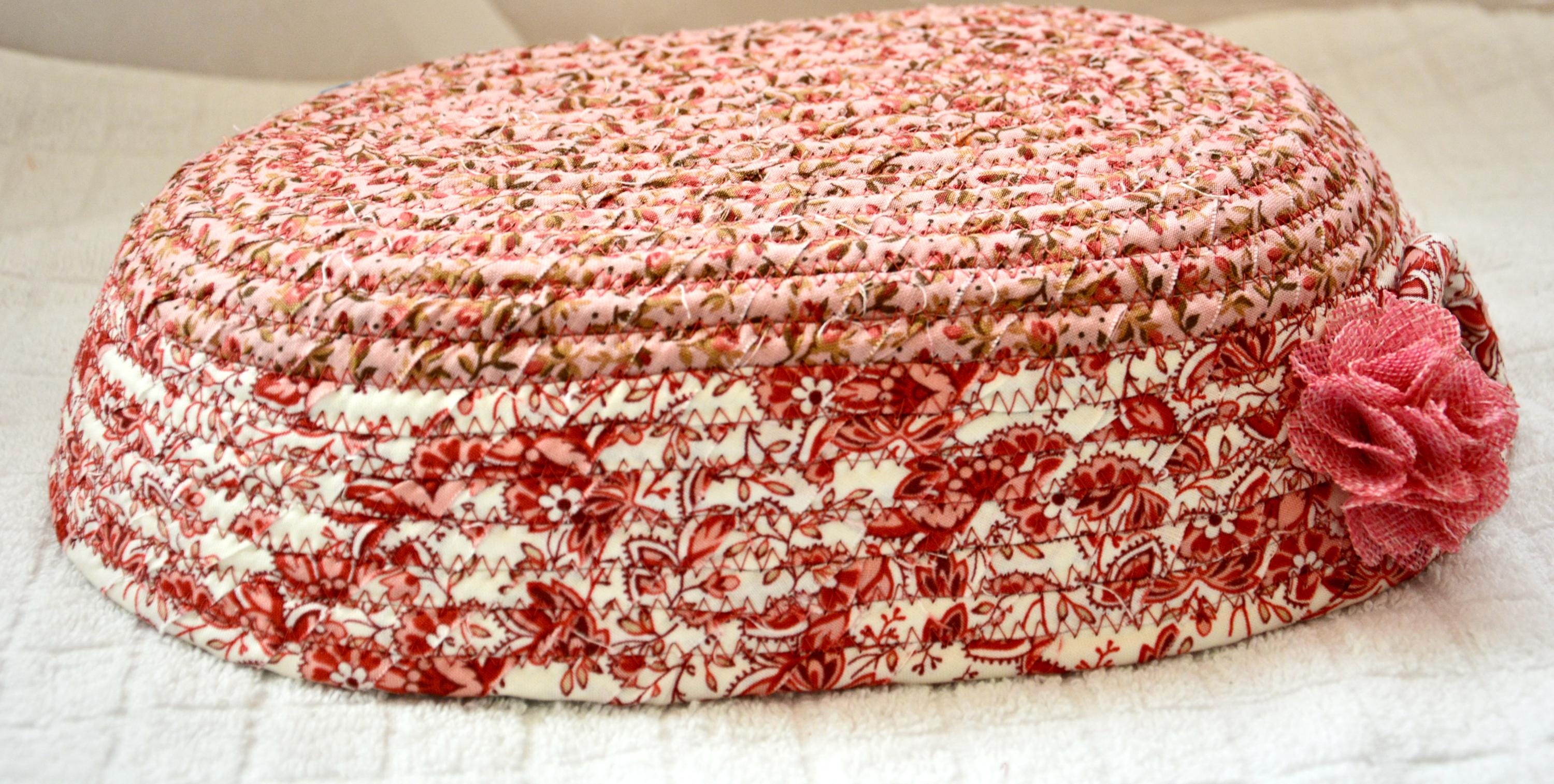 I hand wrapped these lovely floral fabrics around cotton line, which I then hand coiled and machine quilted to make it sturdy. I used the raw edge technique with some fray for a great shabby chic texture. 100% cotton fabric and shows on the inside of the basket too!