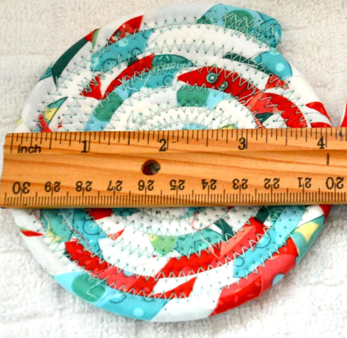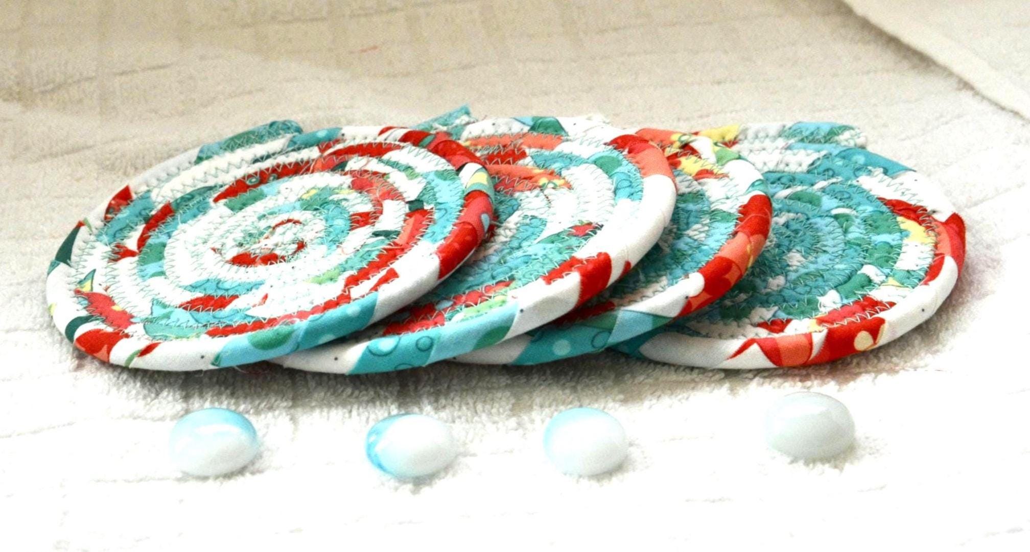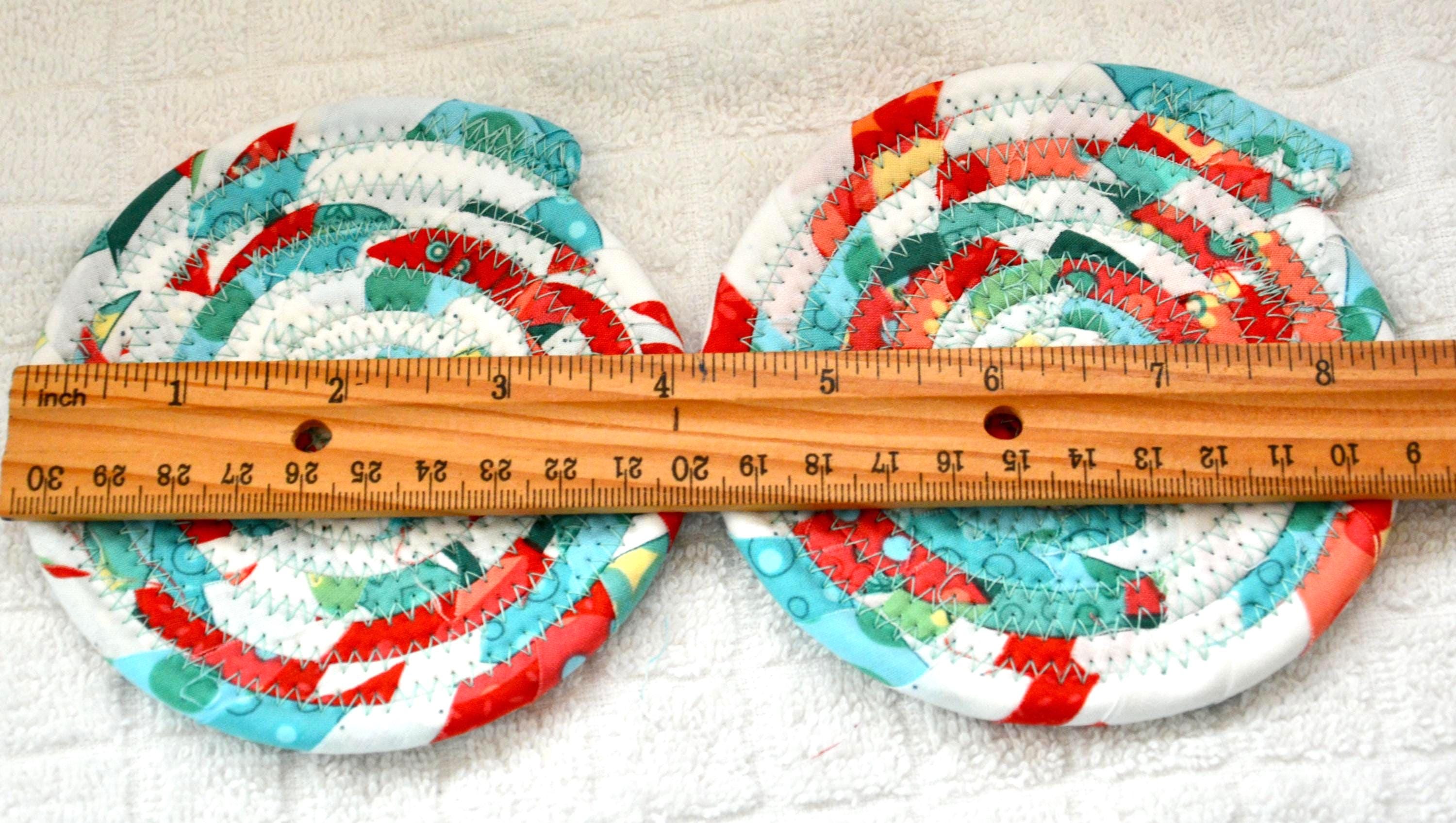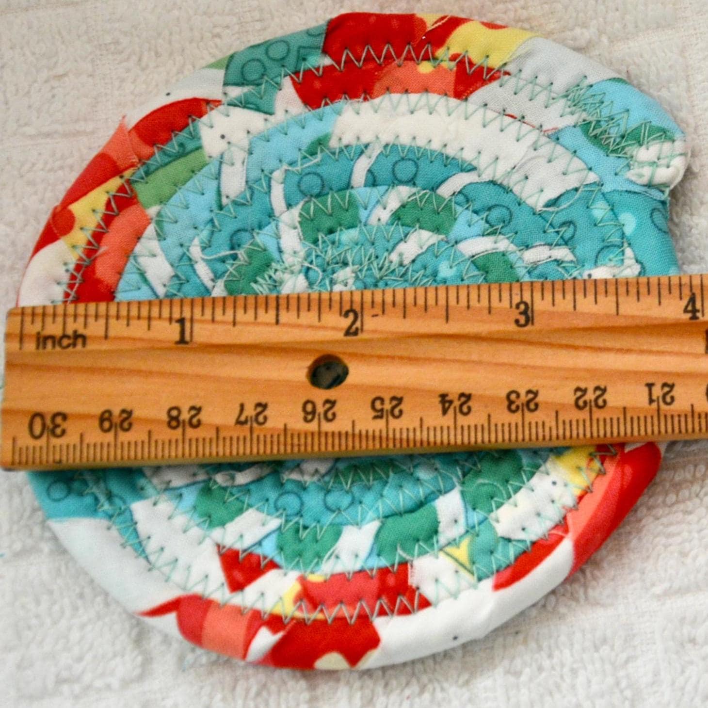I hand wrapped this colorful fabric around cotton line, which I then hand coiled and machine quilted to make it sturdy. I used the raw edge technique with some fray to add a shabby chic texture. I created this pretty coaster mug rug set in my smoke-free home studio. Flower, bead, ruler, mug props not included.