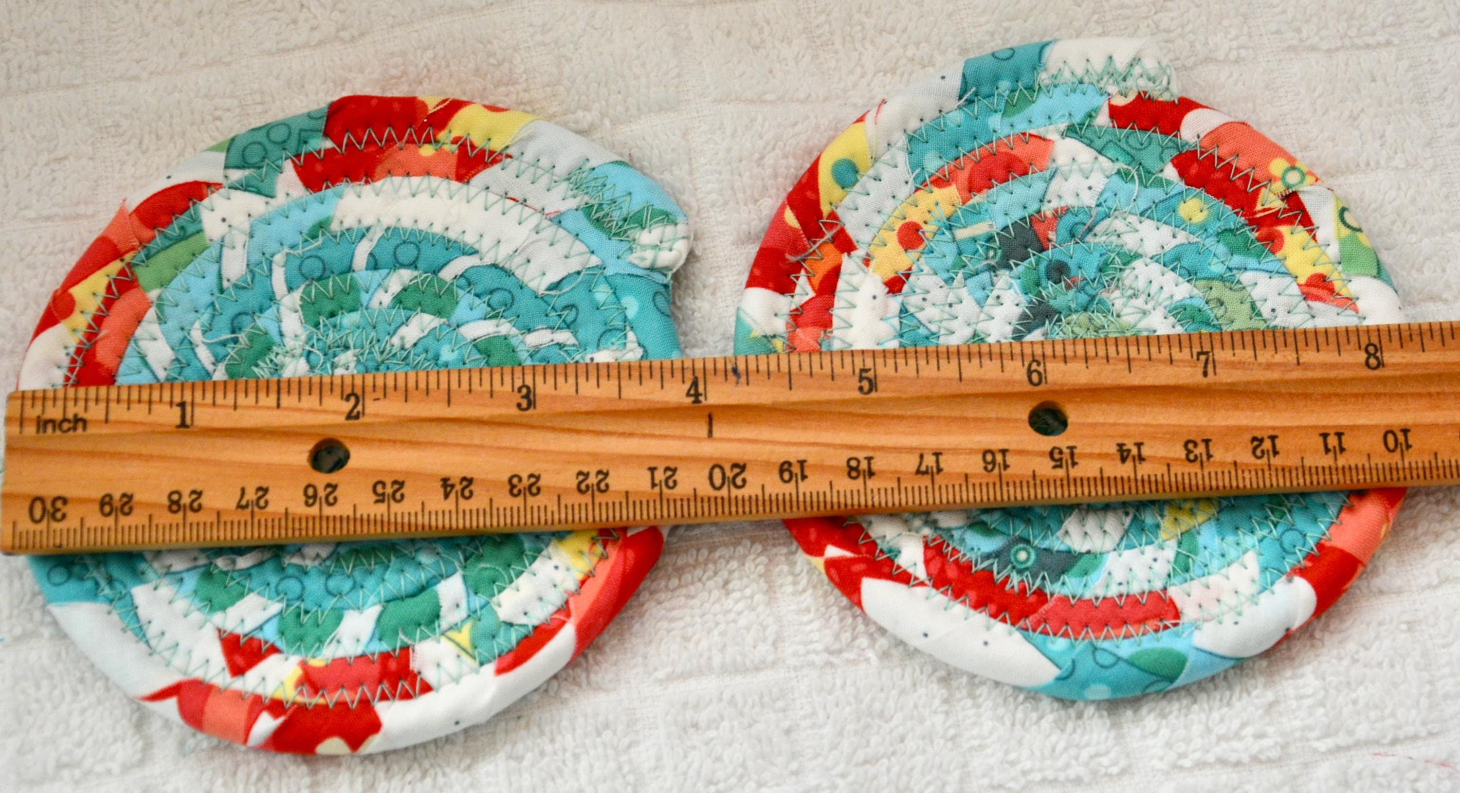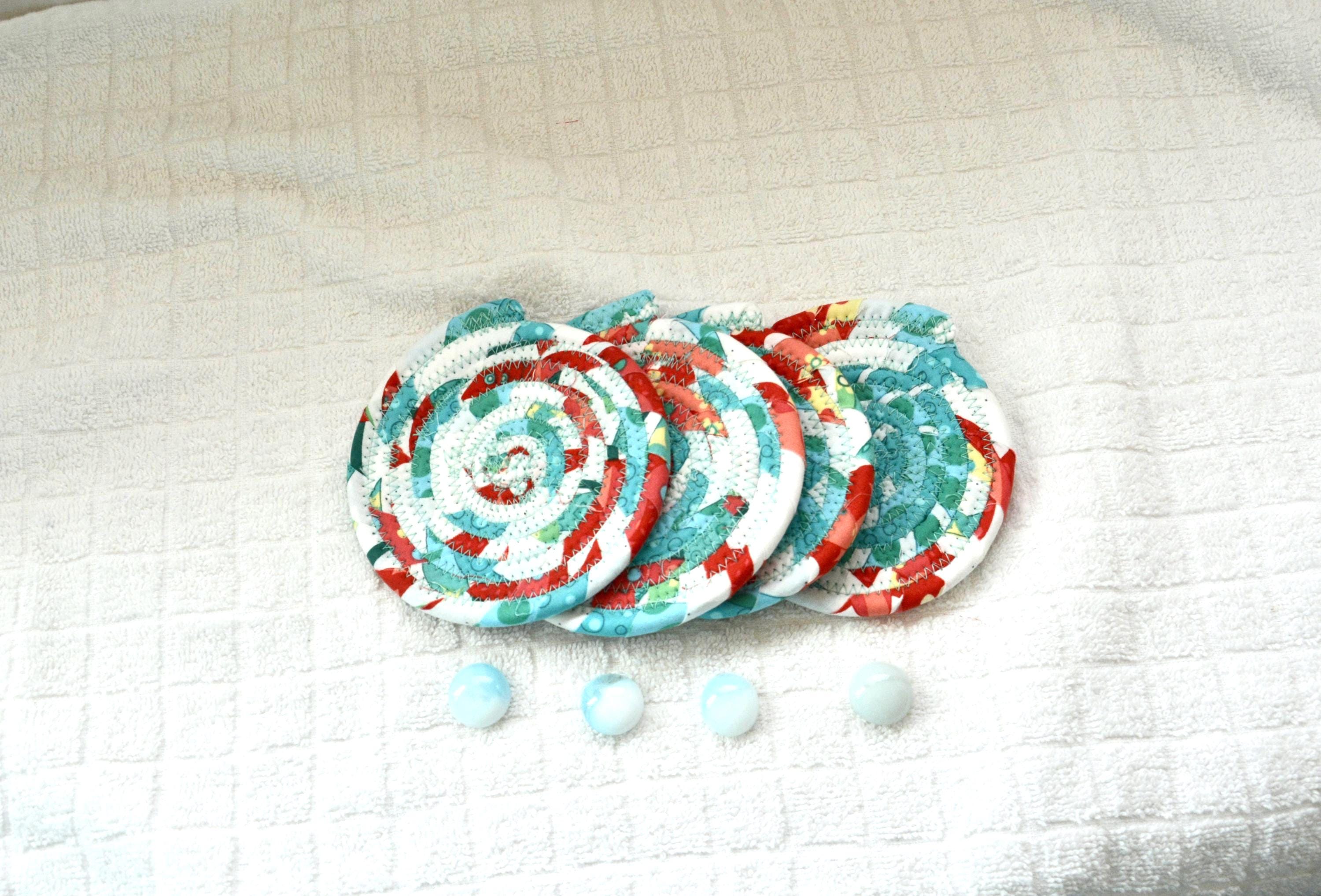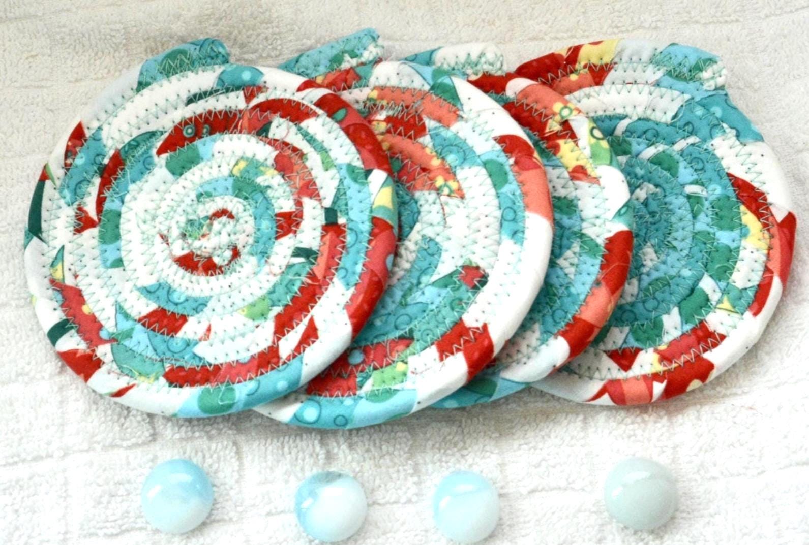 I hand wrapped this colorful fabric around cotton line, which I then hand coiled and machine quilted to make it sturdy. I used the raw edge technique with some fray to add a shabby chic texture. I created this pretty coaster mug rug set in my smoke-free home studio. Flower, bead, ruler, mug props not included.