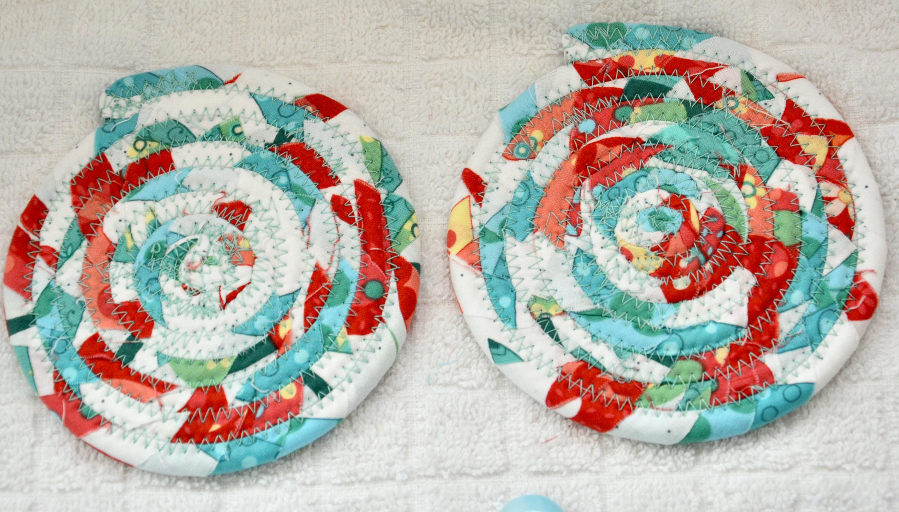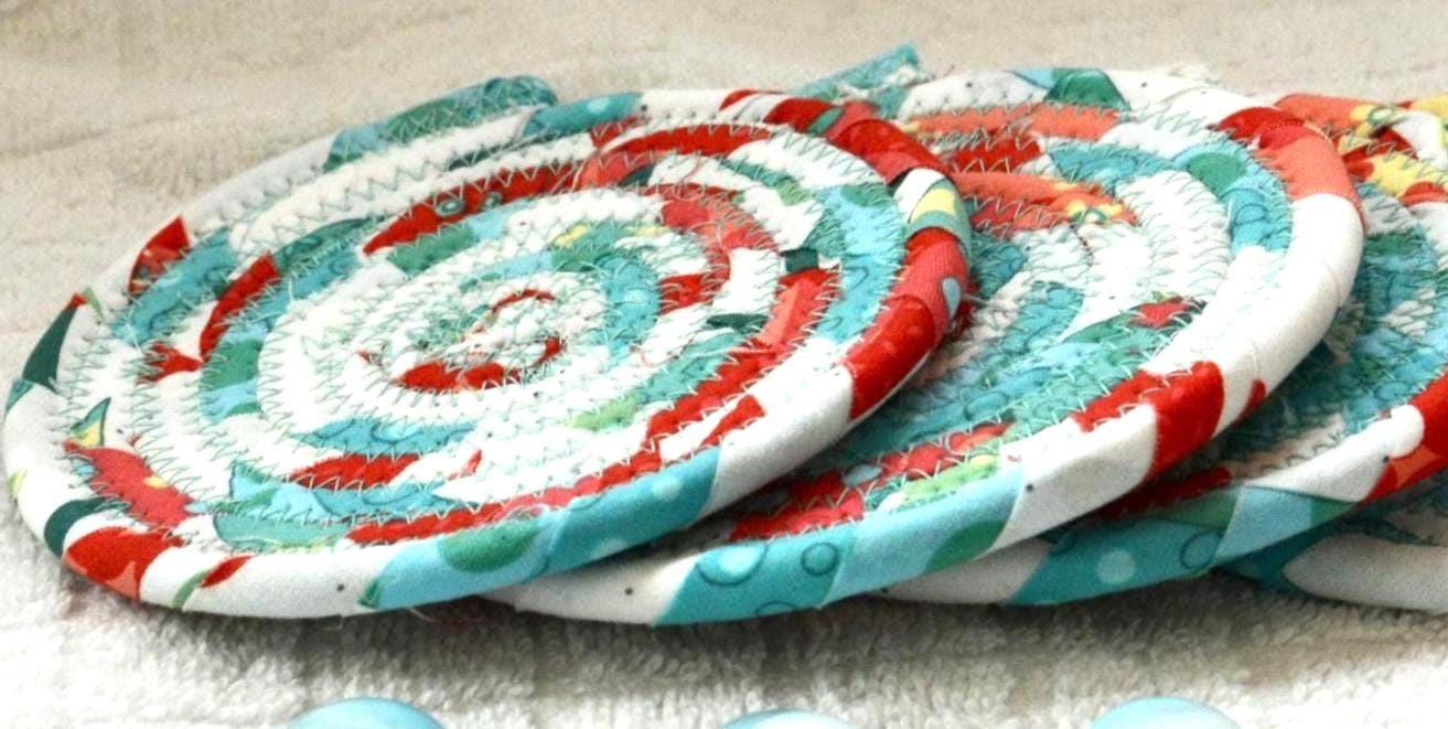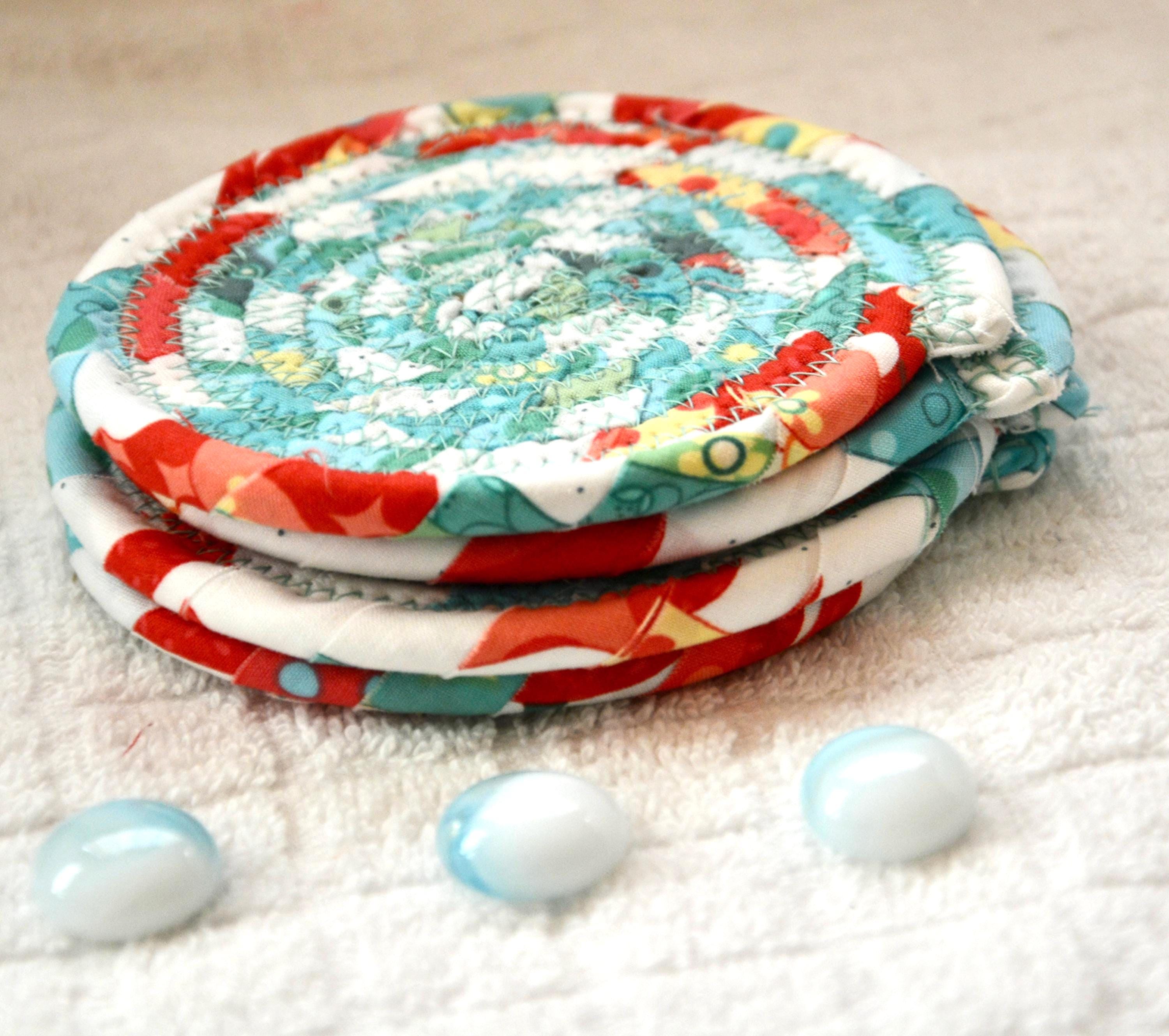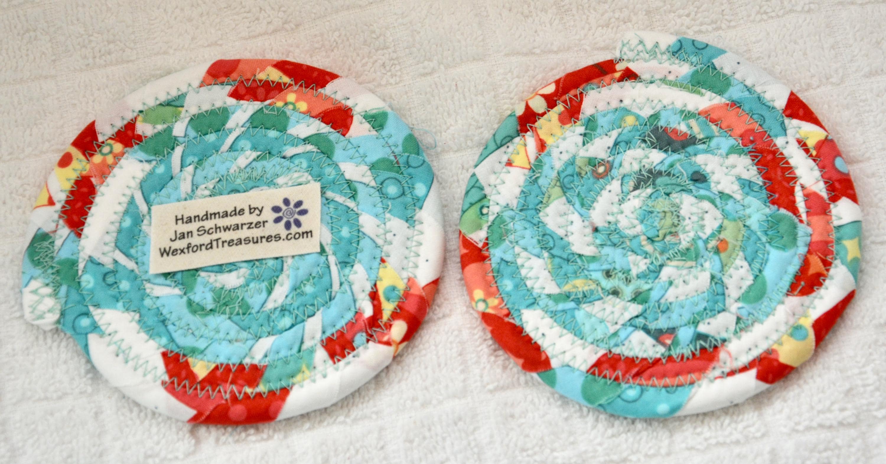 I hand wrapped this colorful fabric around cotton line, which I then hand coiled and machine quilted to make it sturdy. I used the raw edge technique with some fray to add a shabby chic texture. I created this pretty coaster mug rug set in my smoke-free home studio. Flower, bead, ruler, mug props not included.