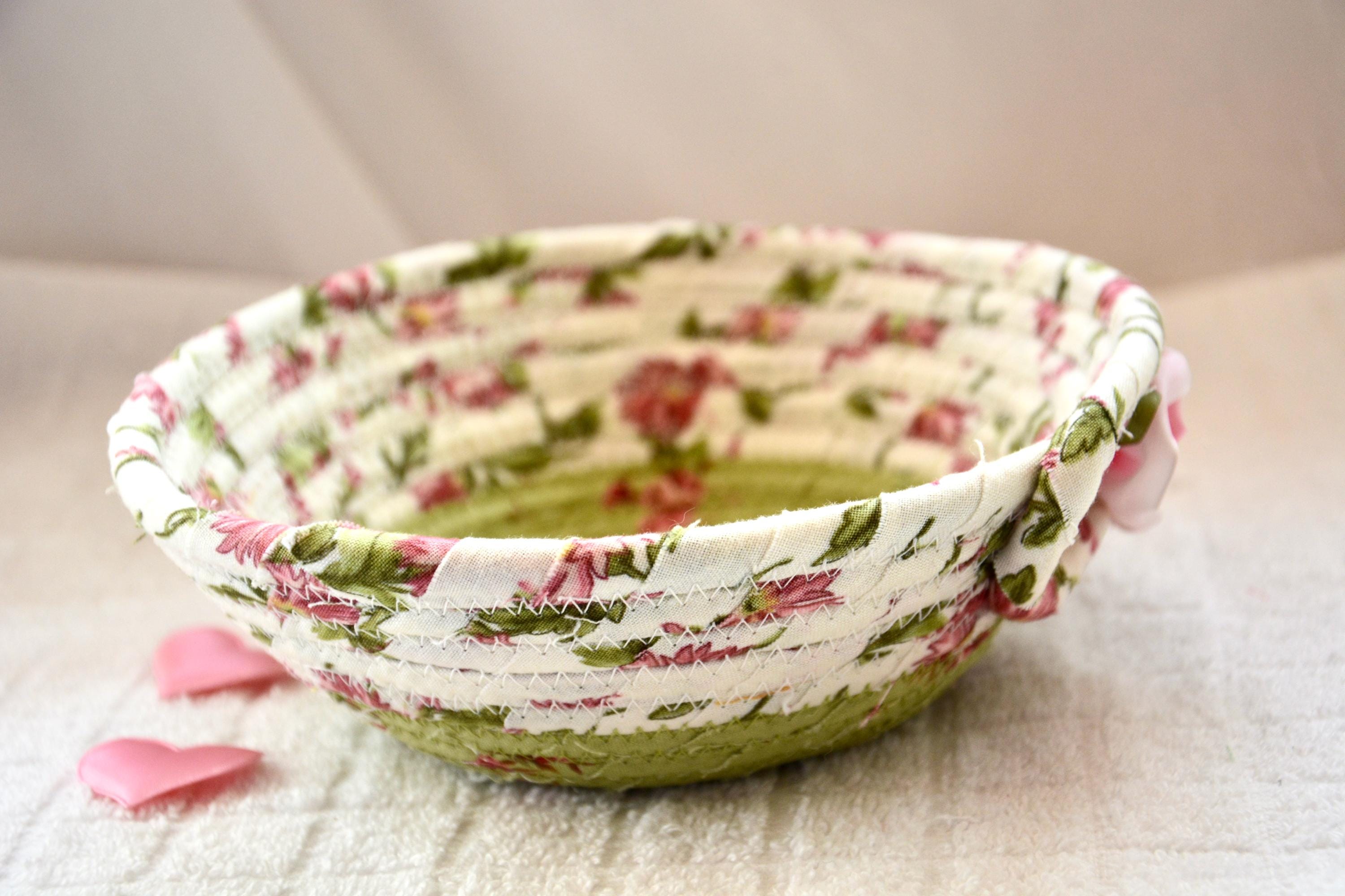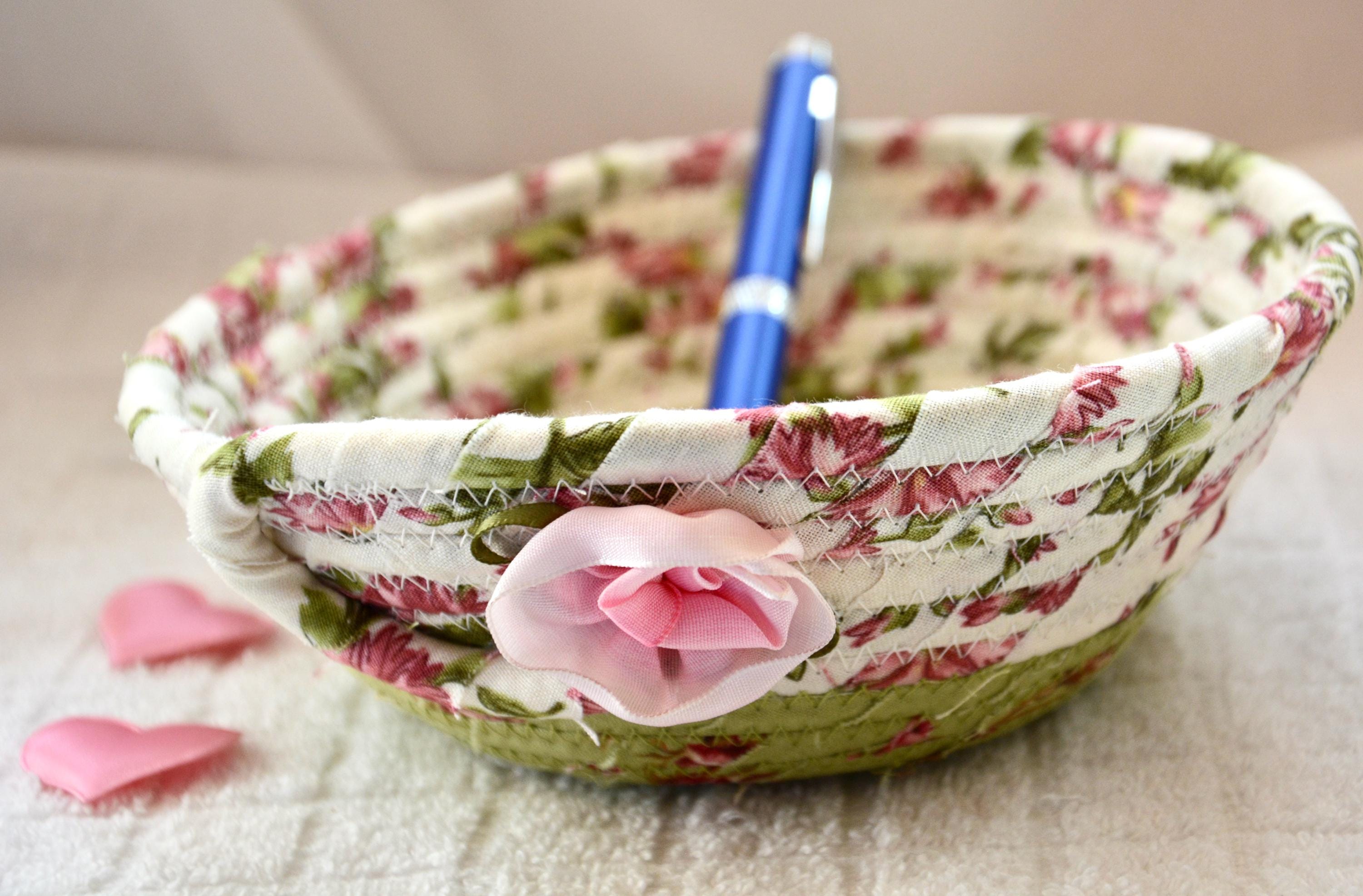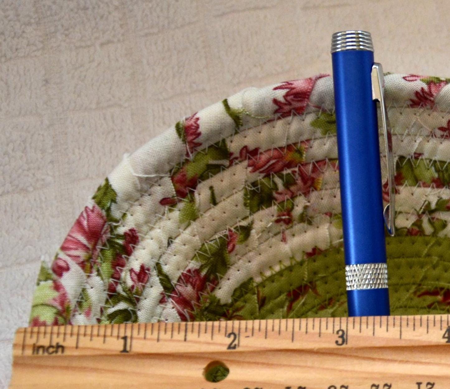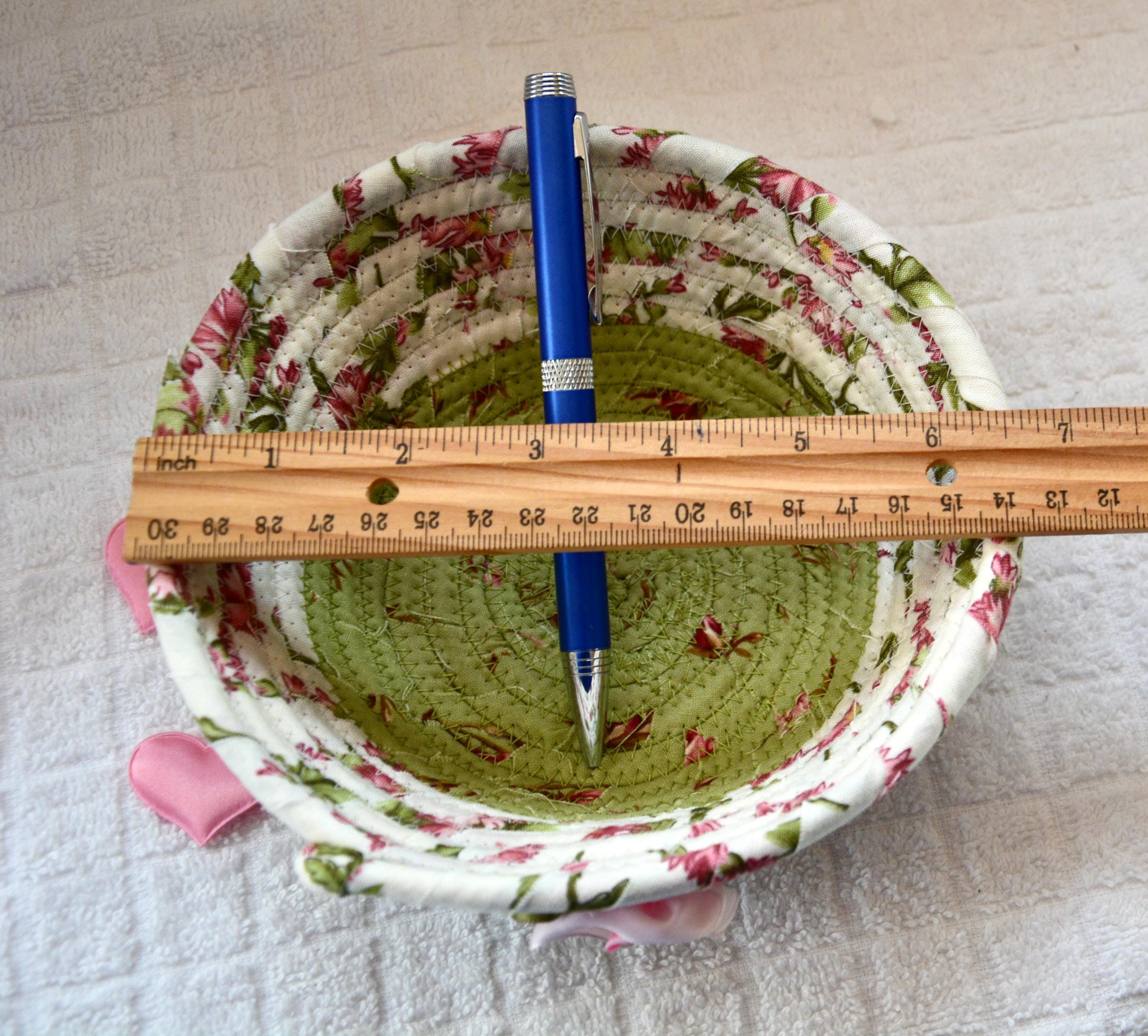 I hand wrapped these wonderful fabrics around cotton line, which I then hand coiled and machine quilted to make it sturdy. I used the raw edge technique with some fray to add texture. Both fabrics are high quality 100% cotton and both show on the inside of this fun basket too! The pretty flower on the basket is included for a nice accent. Please see picture with the pen to help gauge the basket size.