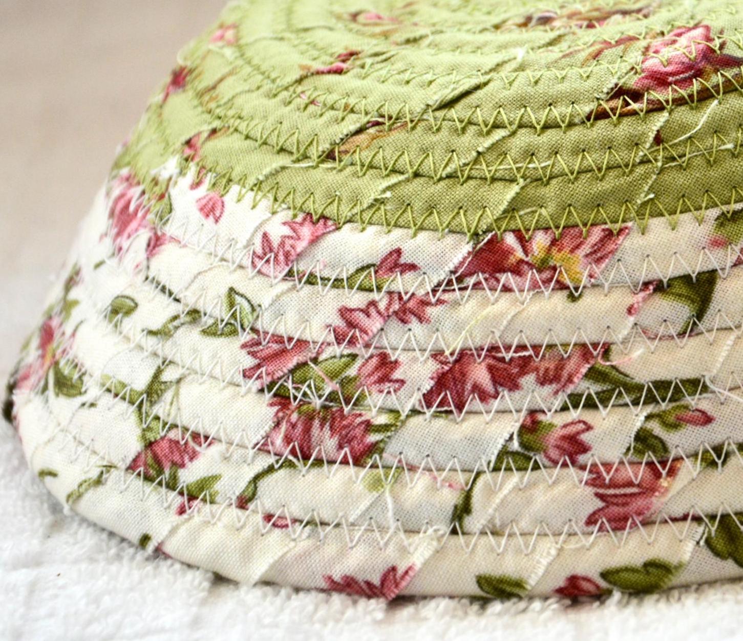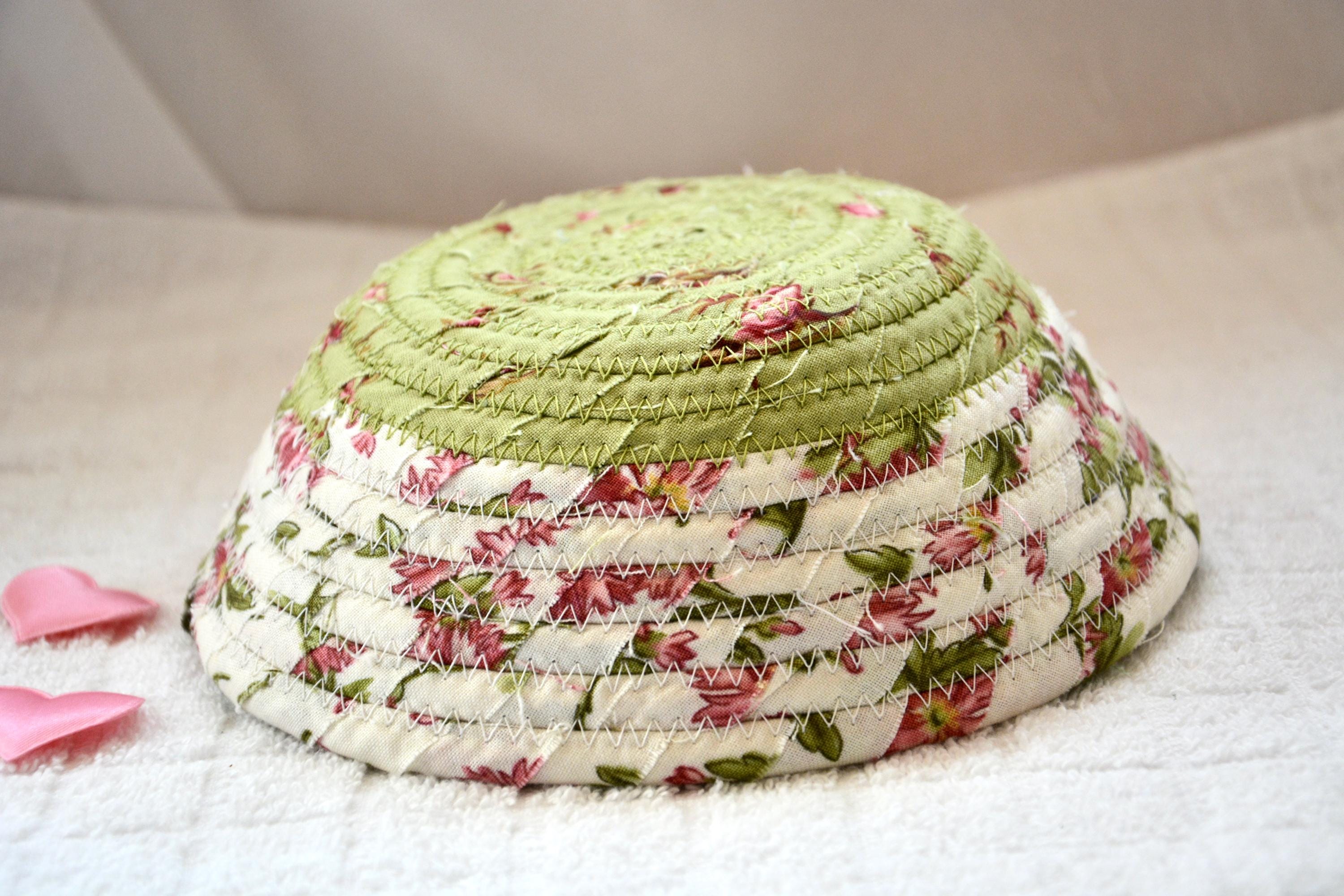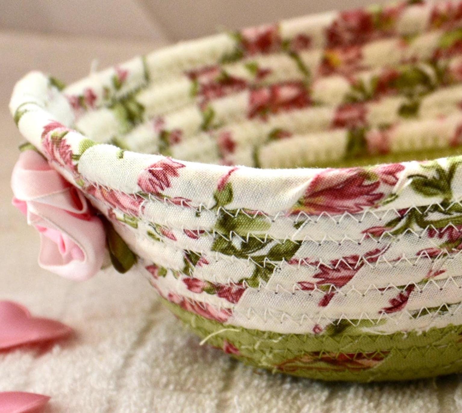 I hand wrapped these wonderful fabrics around cotton line, which I then hand coiled and machine quilted to make it sturdy. I used the raw edge technique with some fray to add texture. Both fabrics are high quality 100% cotton and both show on the inside of this fun basket too! The pretty flower on the basket is included for a nice accent. Please see picture with the pen to help gauge the basket size.