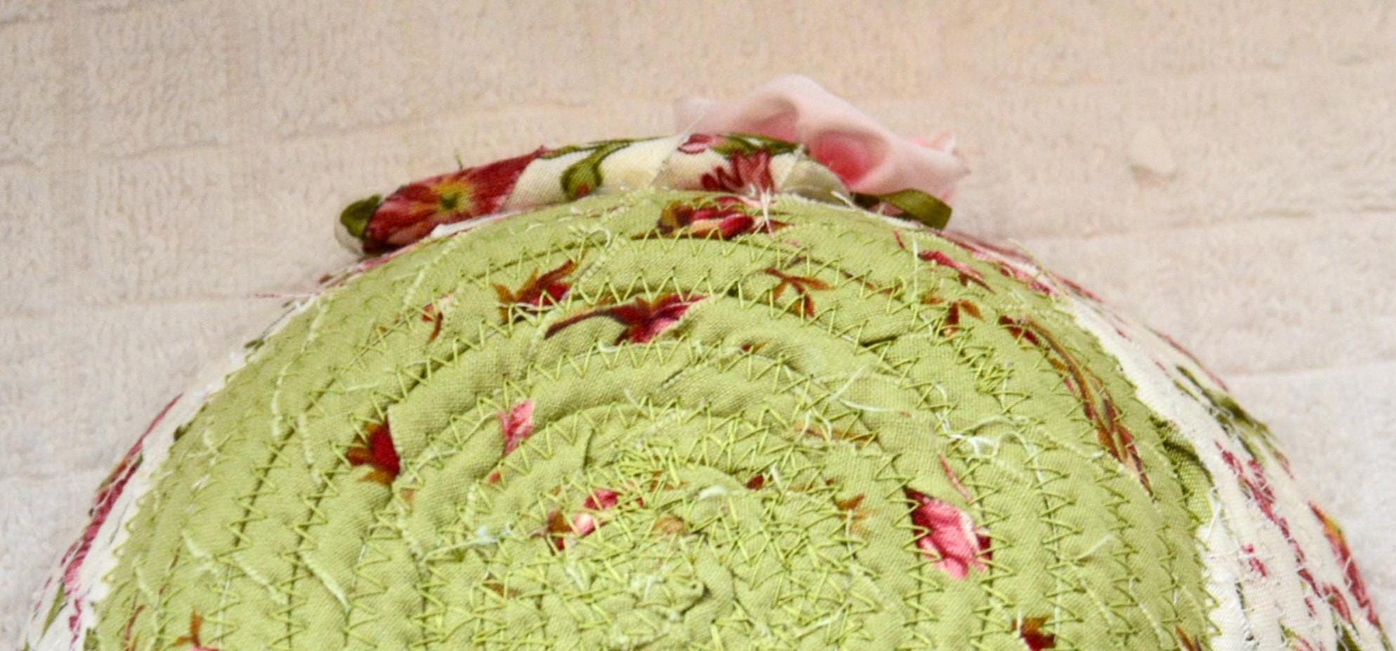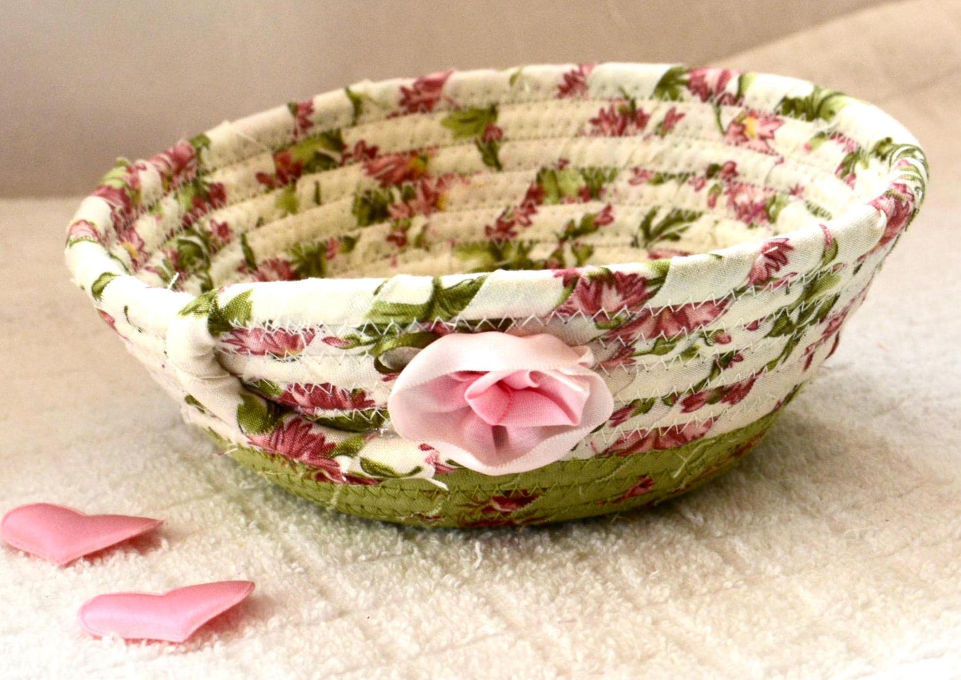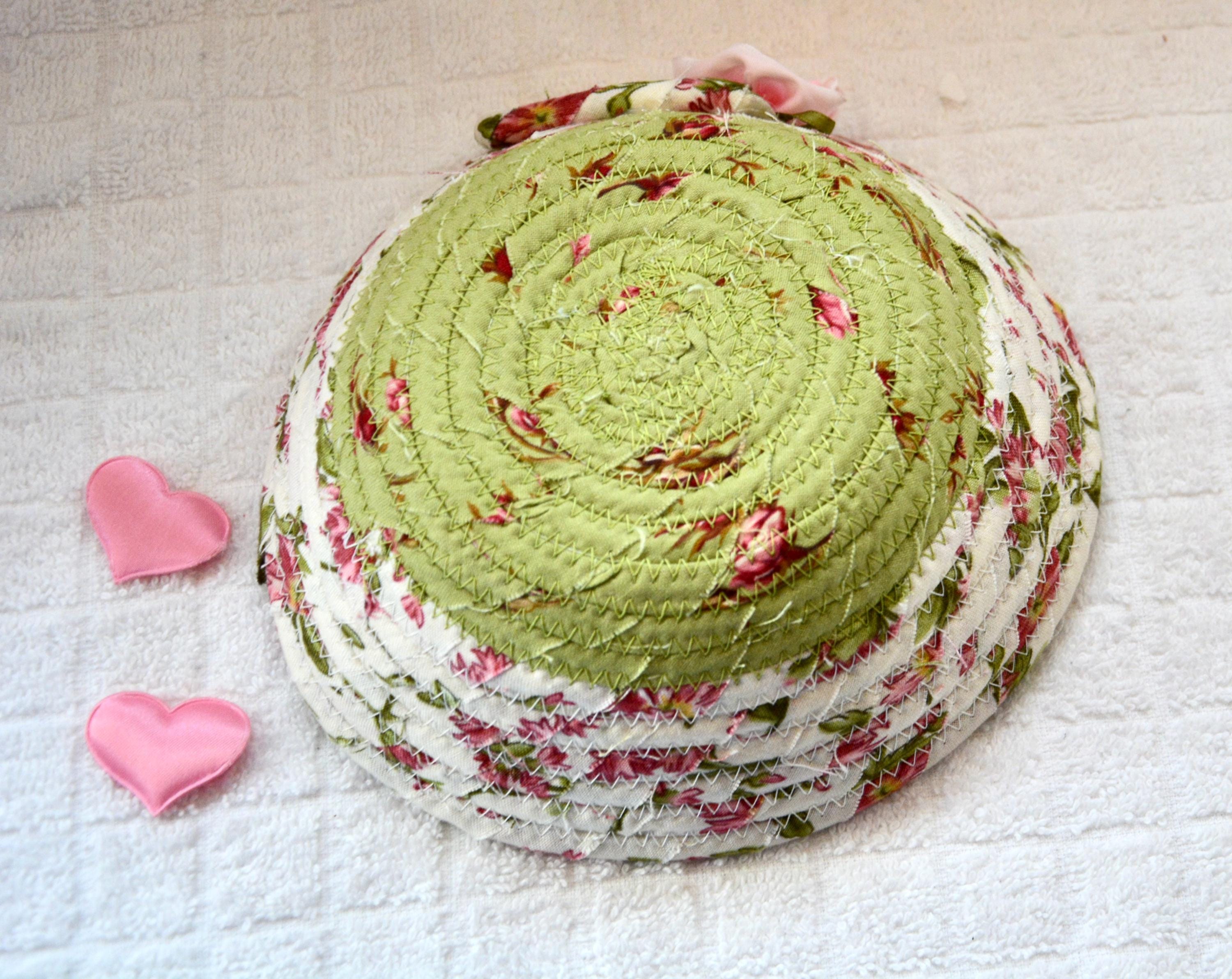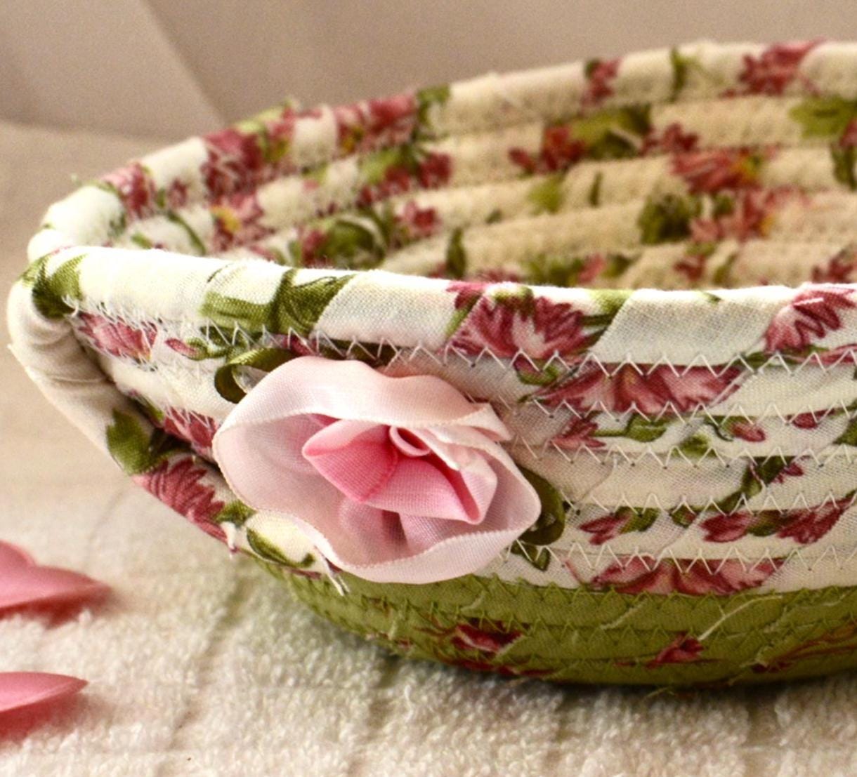 I hand wrapped these wonderful fabrics around cotton line, which I then hand coiled and machine quilted to make it sturdy. I used the raw edge technique with some fray to add texture. Both fabrics are high quality 100% cotton and both show on the inside of this fun basket too! The pretty flower on the basket is included for a nice accent. Please see picture with the pen to help gauge the basket size.