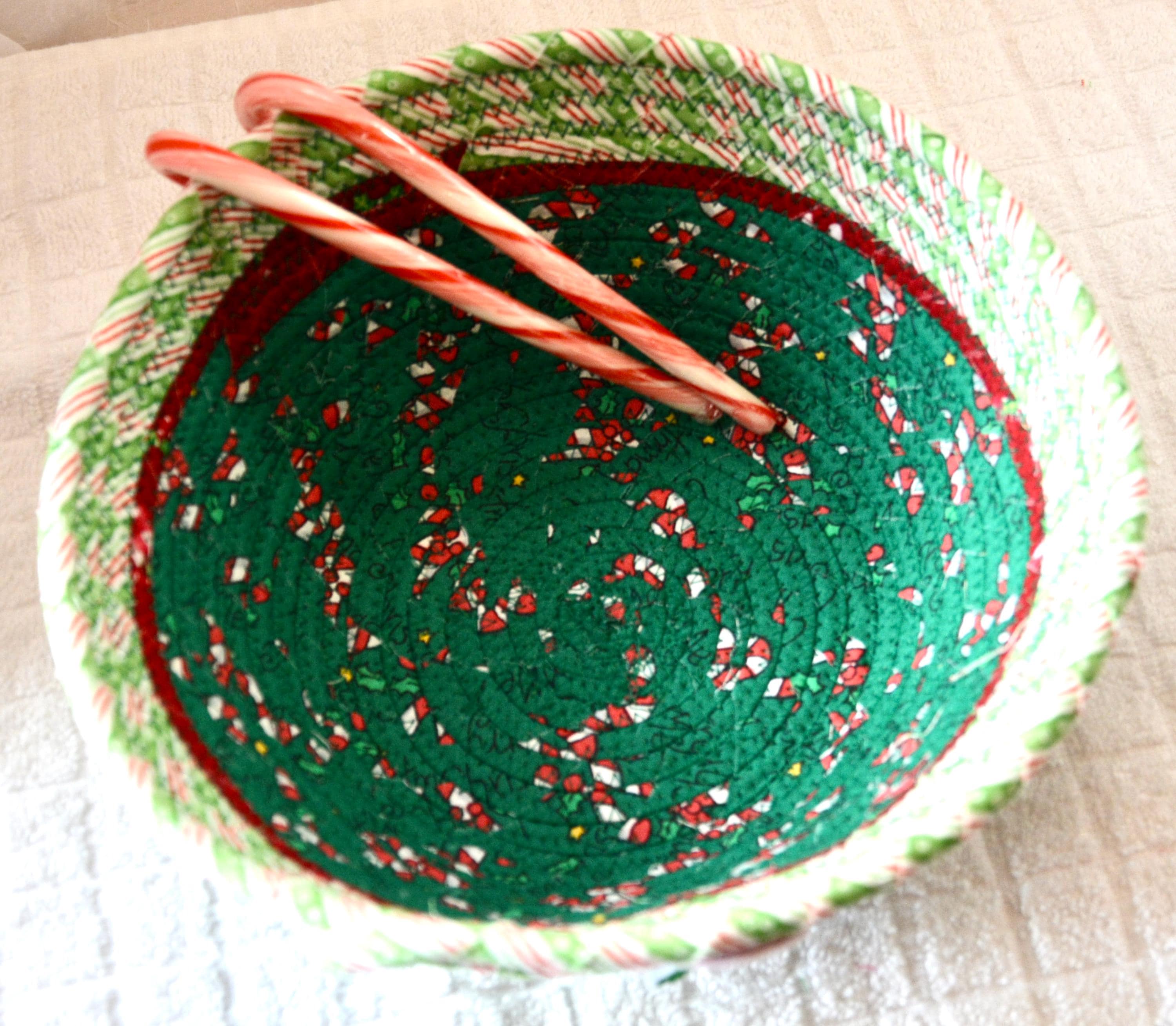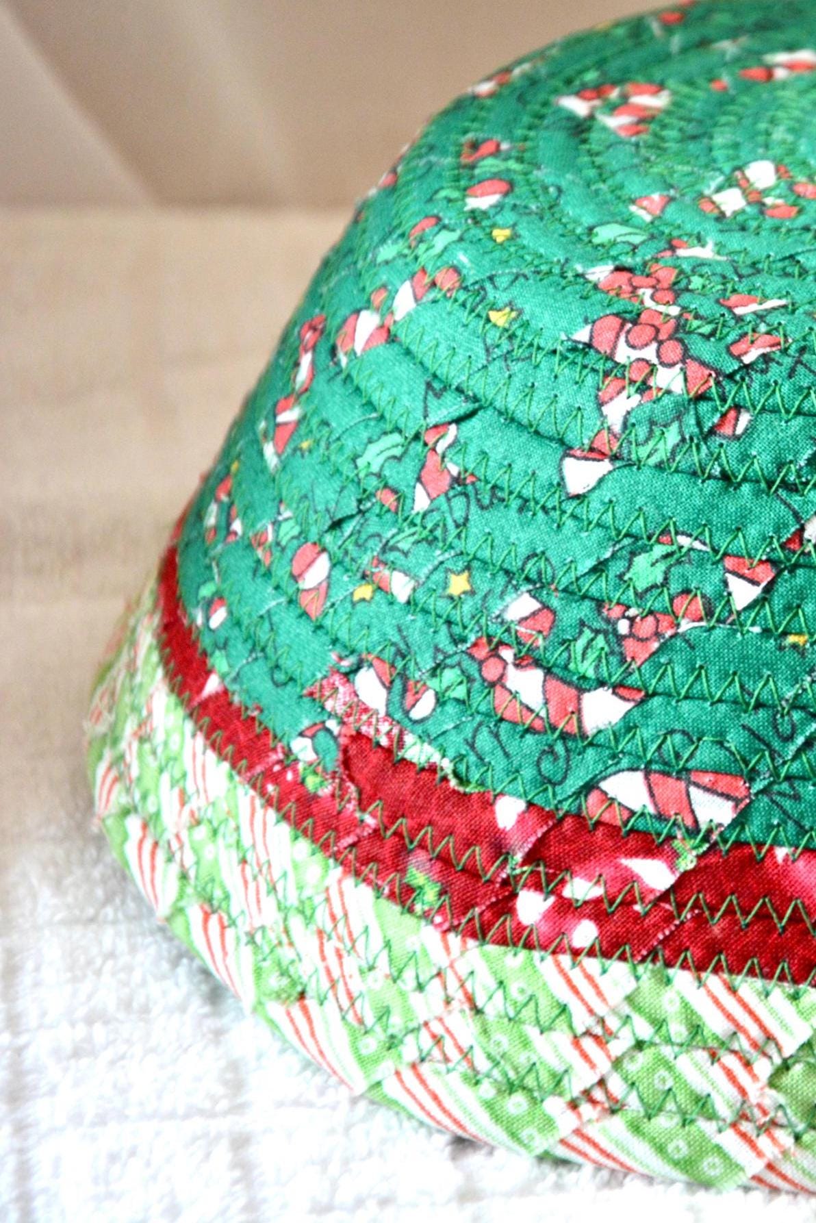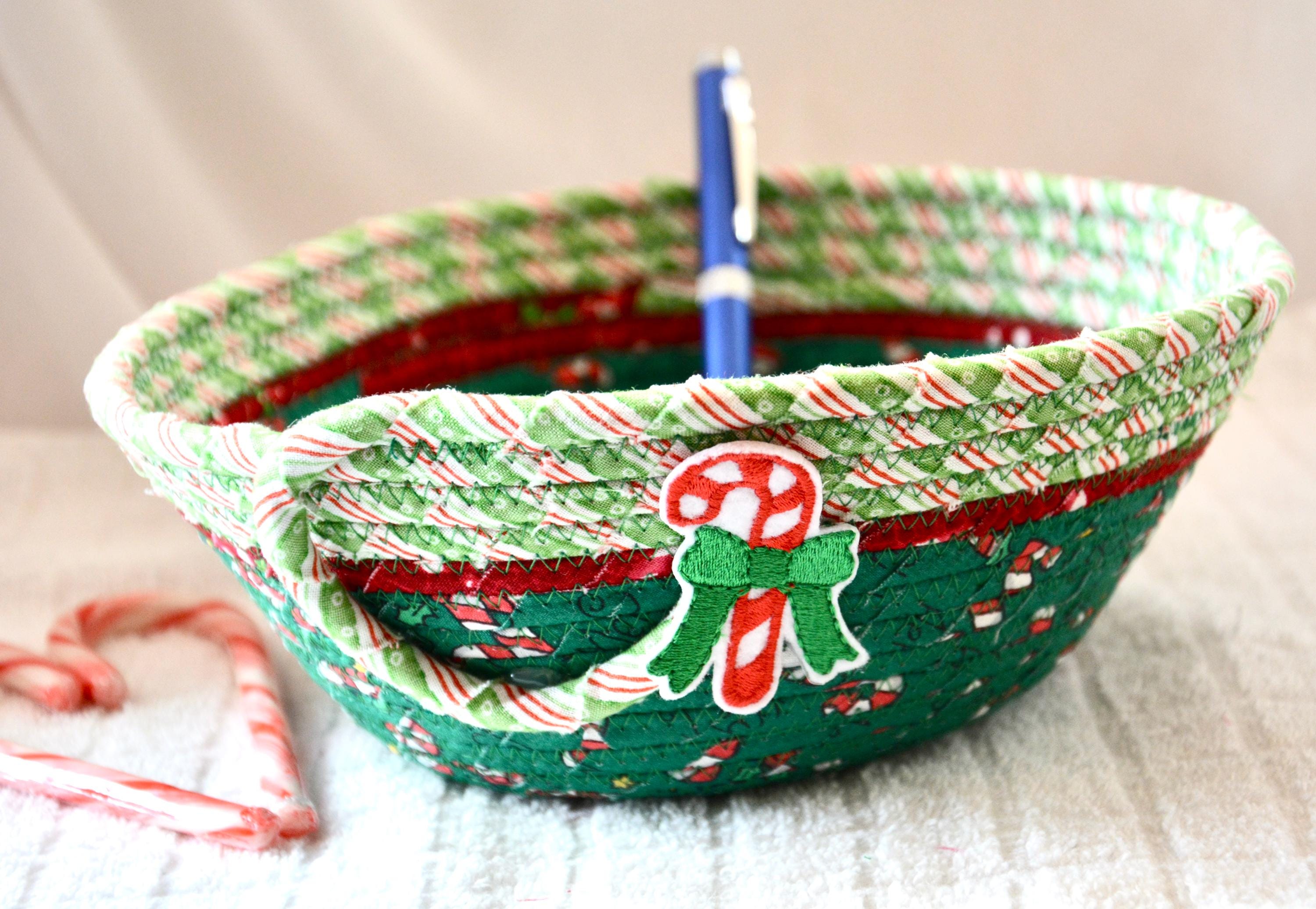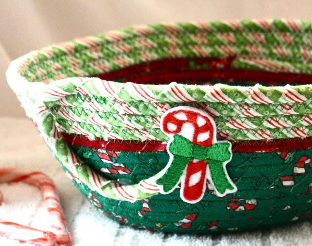 I hand wrapped these high quality Christmas fabrics around cotton line, which I then hand coiled and machine quilted to make it sturdy. I used the raw edge technique with some fray to add a wonderful shabby chic texture. I just love the highlights in both fabrics! So festive! The cute candy cane applique on the basket is included for a nice accent.