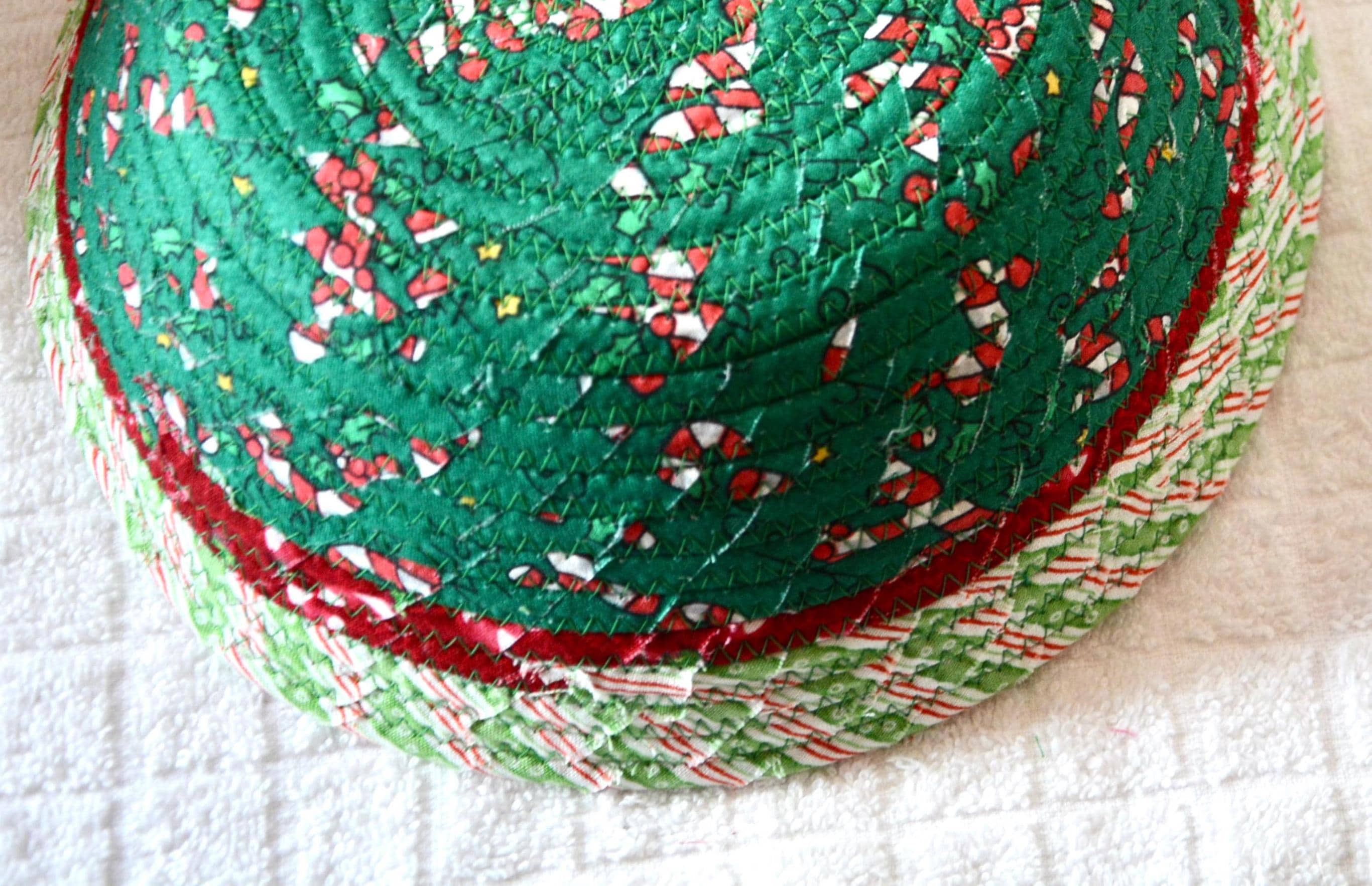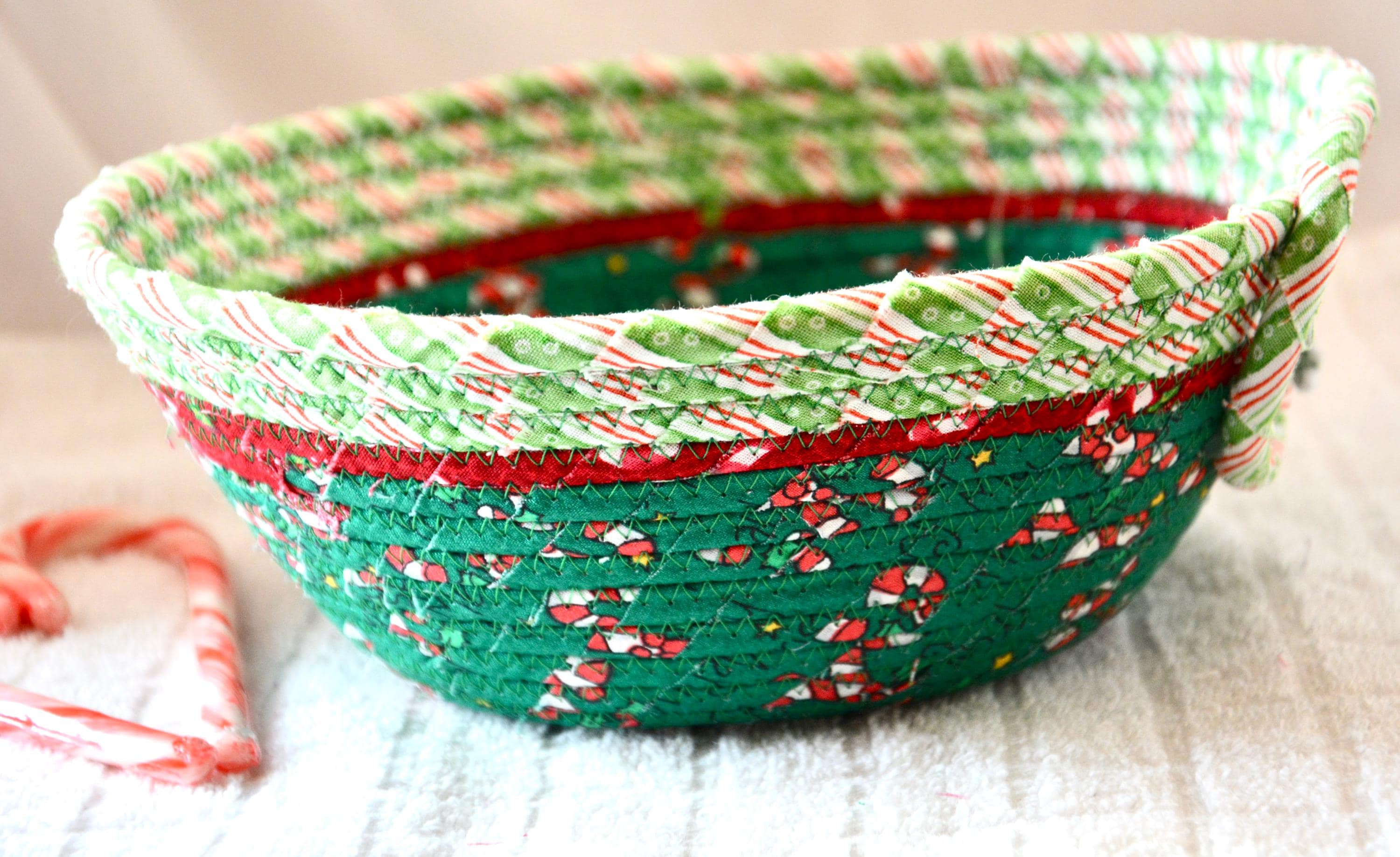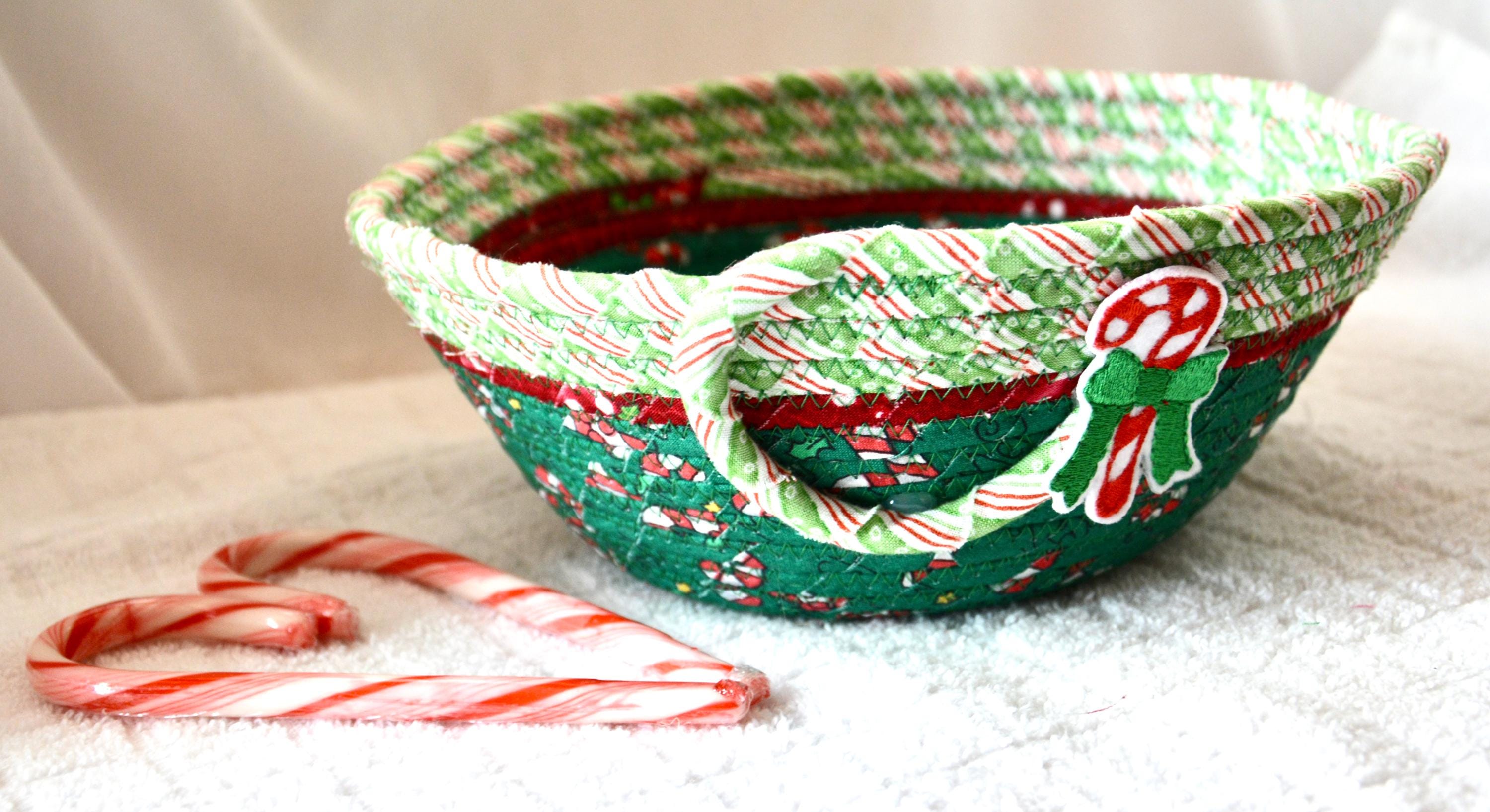 I hand wrapped these high quality Christmas fabrics around cotton line, which I then hand coiled and machine quilted to make it sturdy. I used the raw edge technique with some fray to add a wonderful shabby chic texture. I just love the highlights in both fabrics! So festive! The cute candy cane applique on the basket is included for a nice accent.