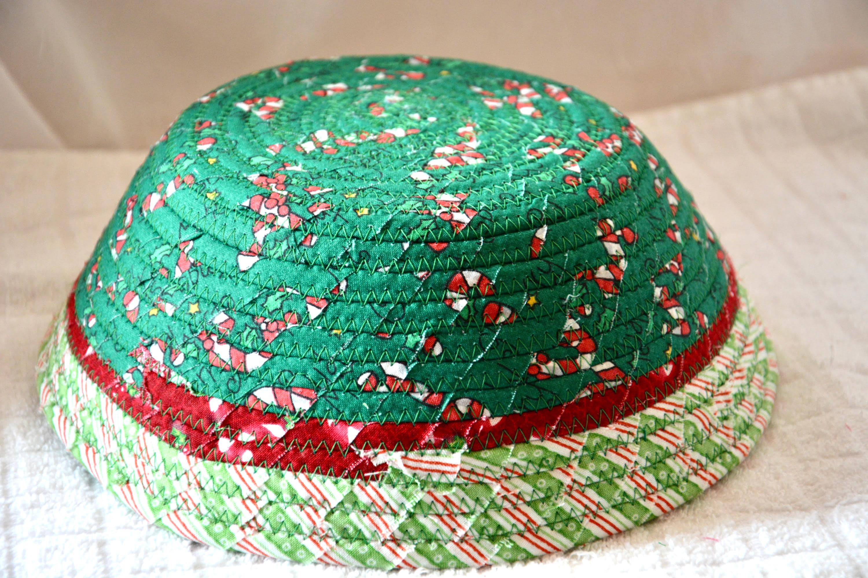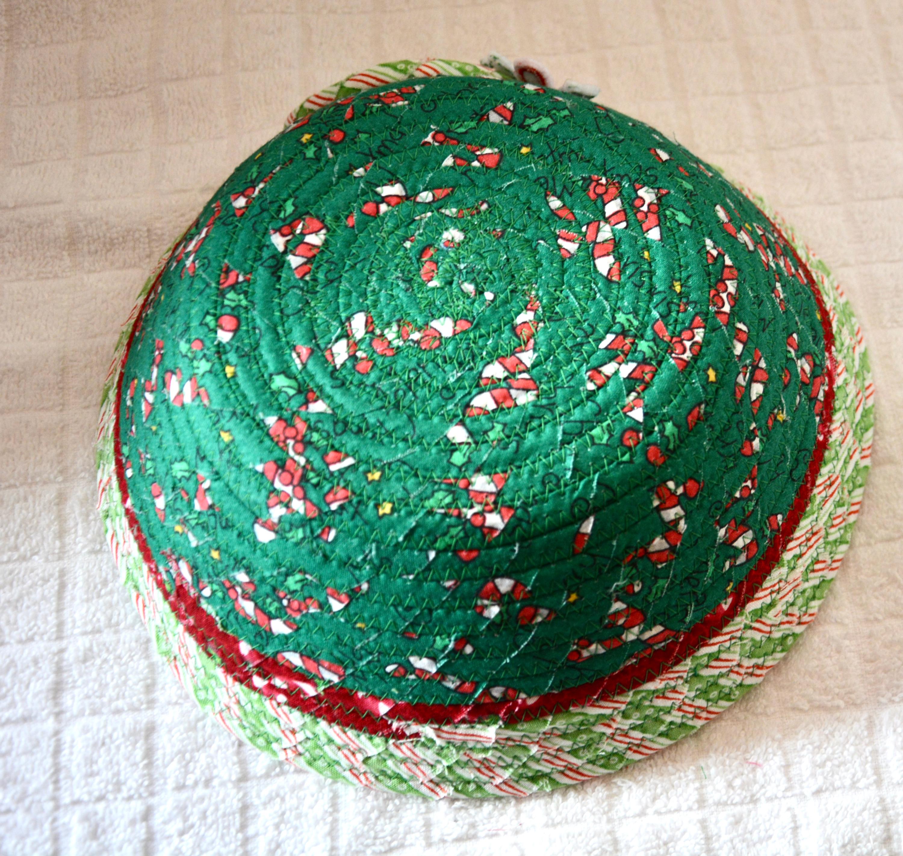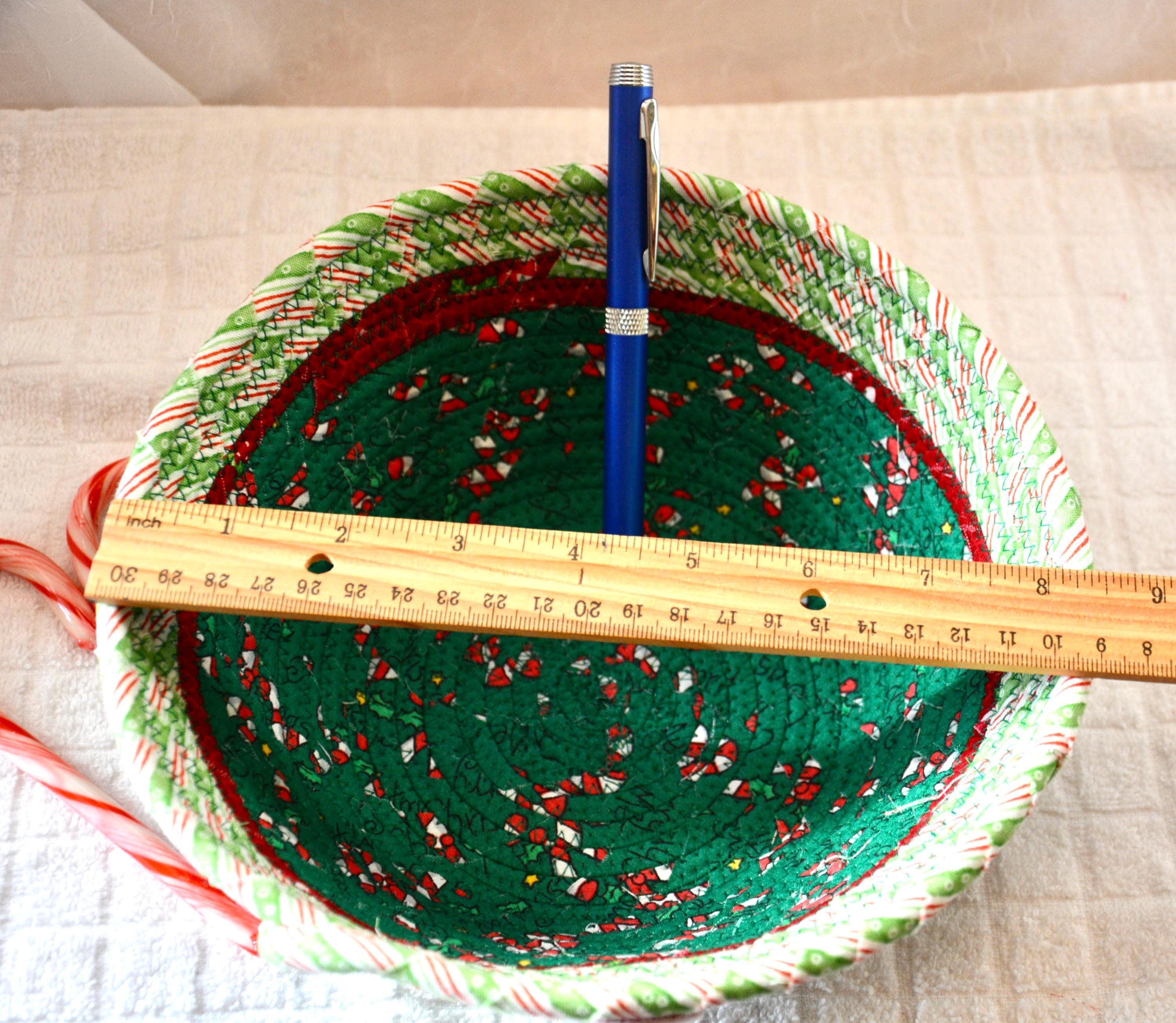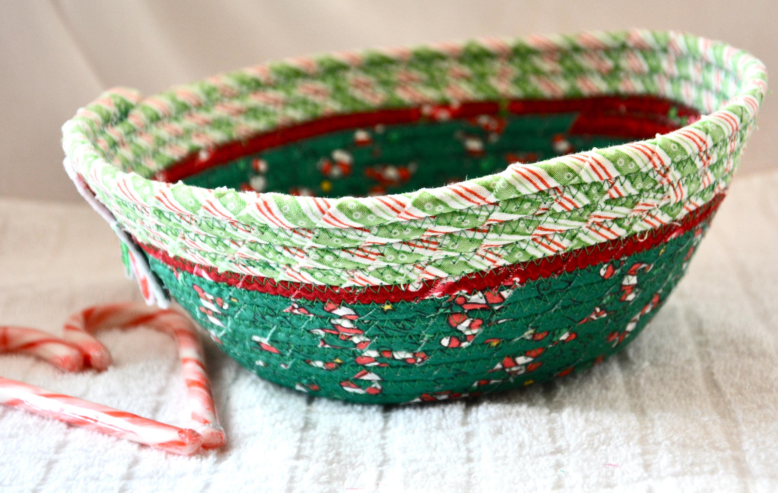 I hand wrapped these high quality Christmas fabrics around cotton line, which I then hand coiled and machine quilted to make it sturdy. I used the raw edge technique with some fray to add a wonderful shabby chic texture. I just love the highlights in both fabrics! So festive! The cute candy cane applique on the basket is included for a nice accent.