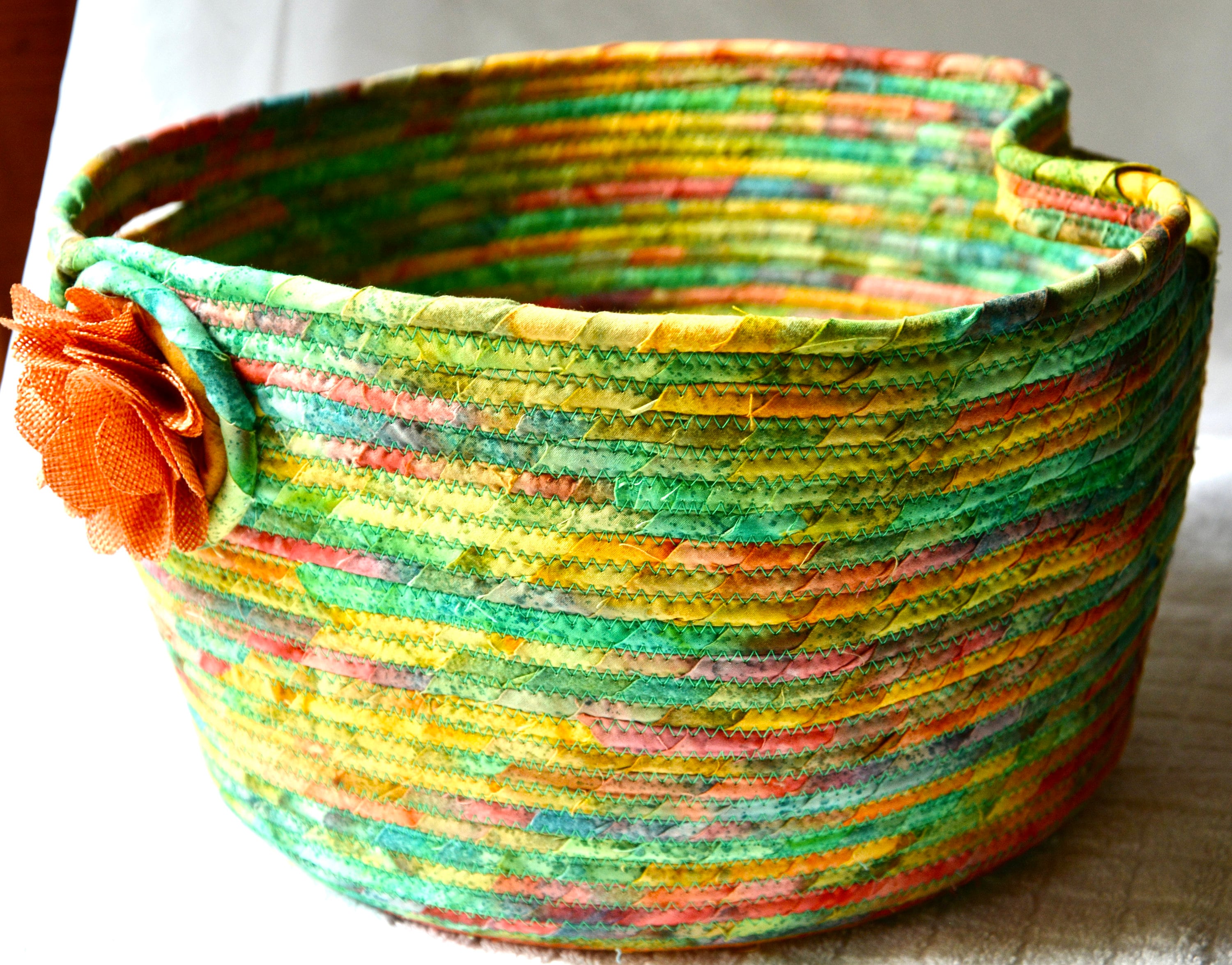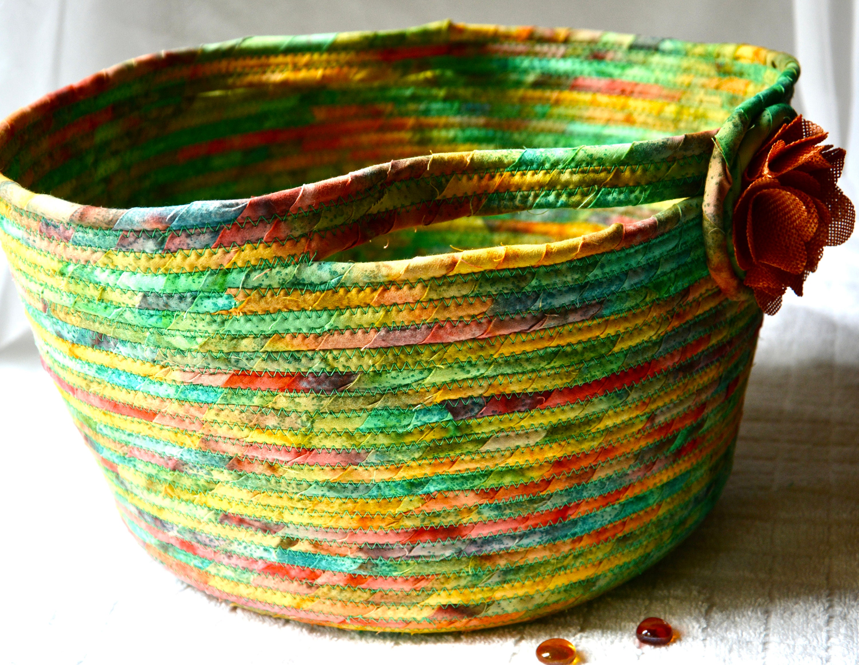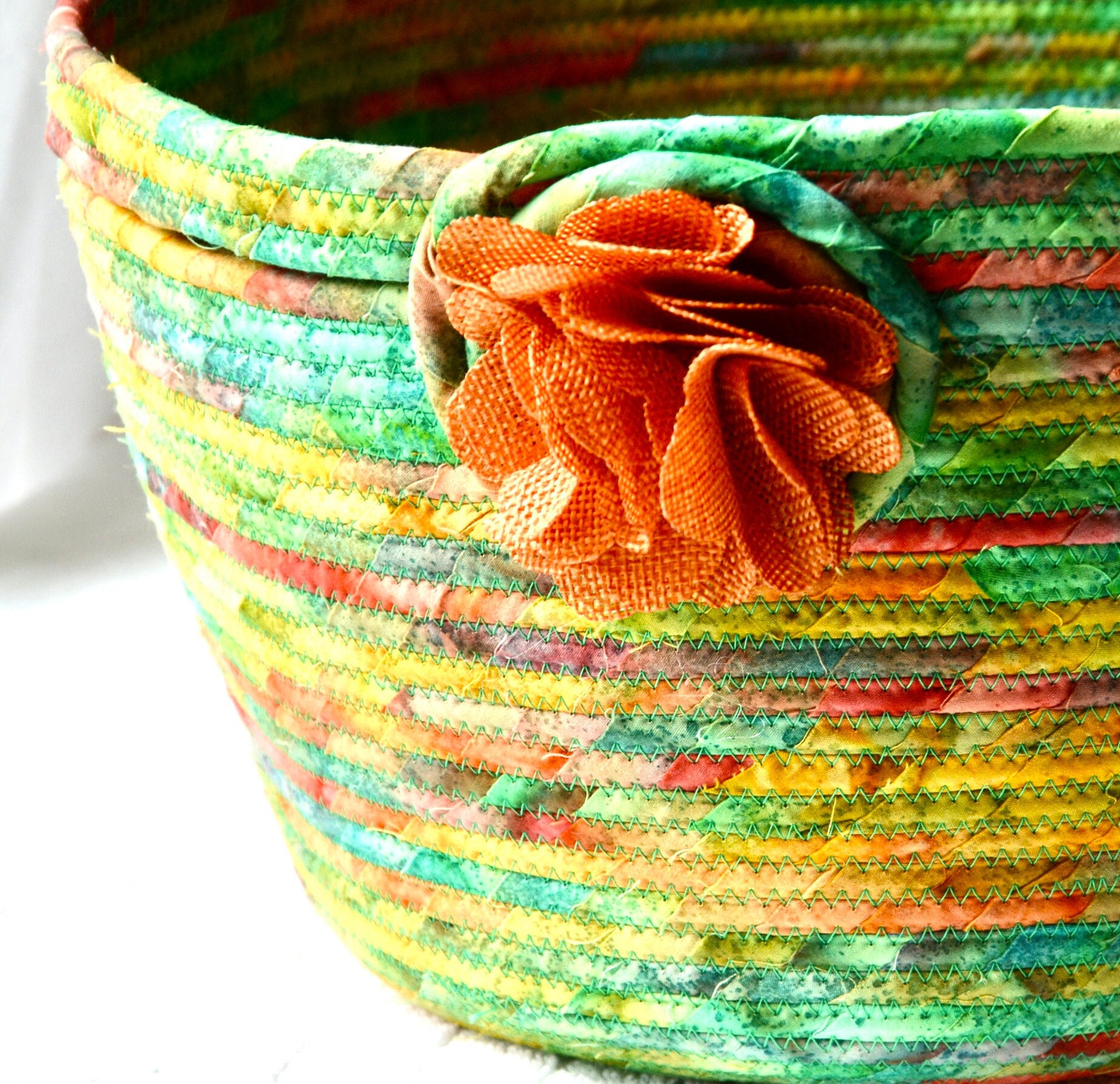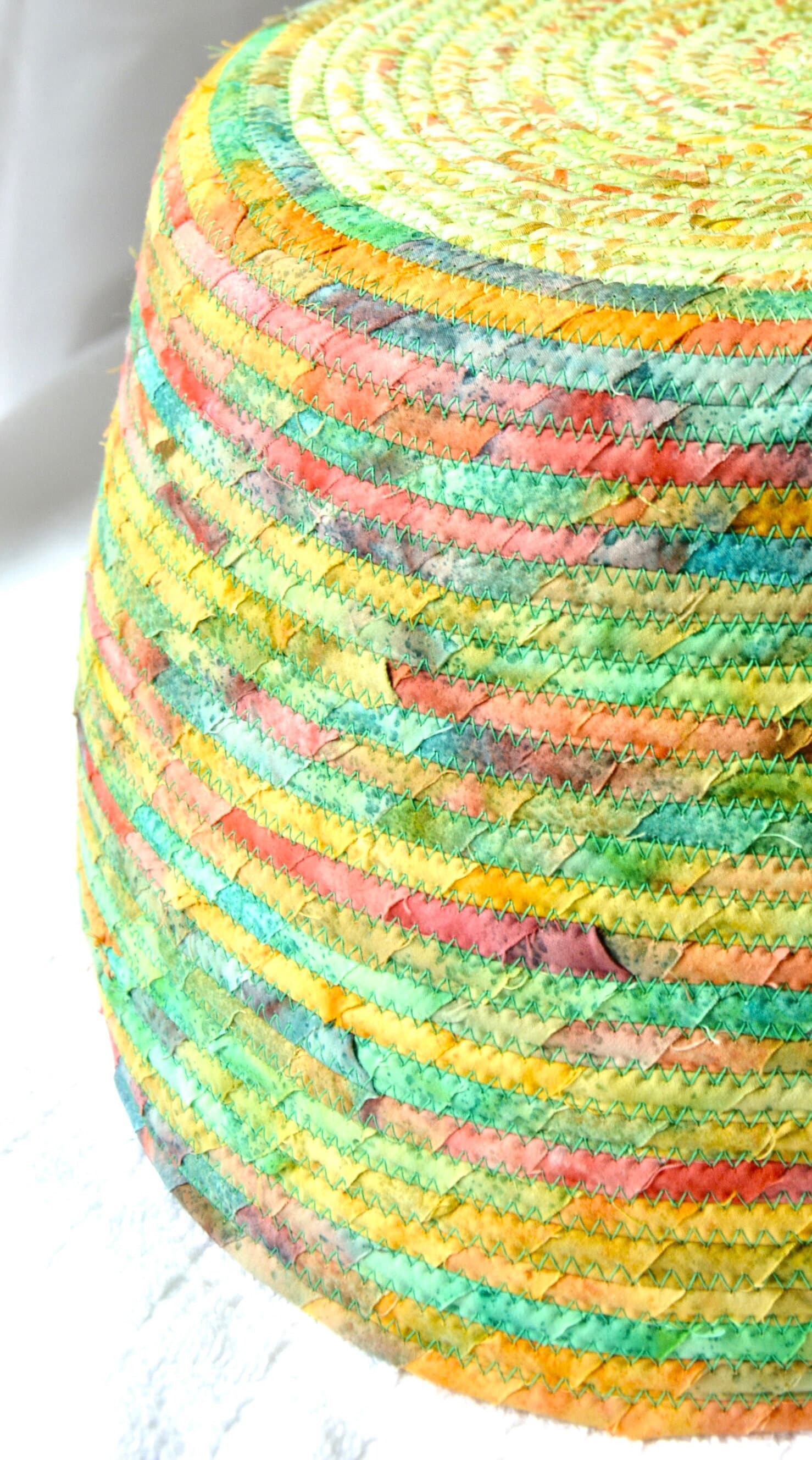 I hand wrapped this wonderful multicolor batik fabric around cotton line, which I then hand coiled and machine quilted to make it sturdy. I used the raw edge technique with some fray to add a great shabby chic texture. This is a high quality 100% cotton fabric and it shows on the inside too!