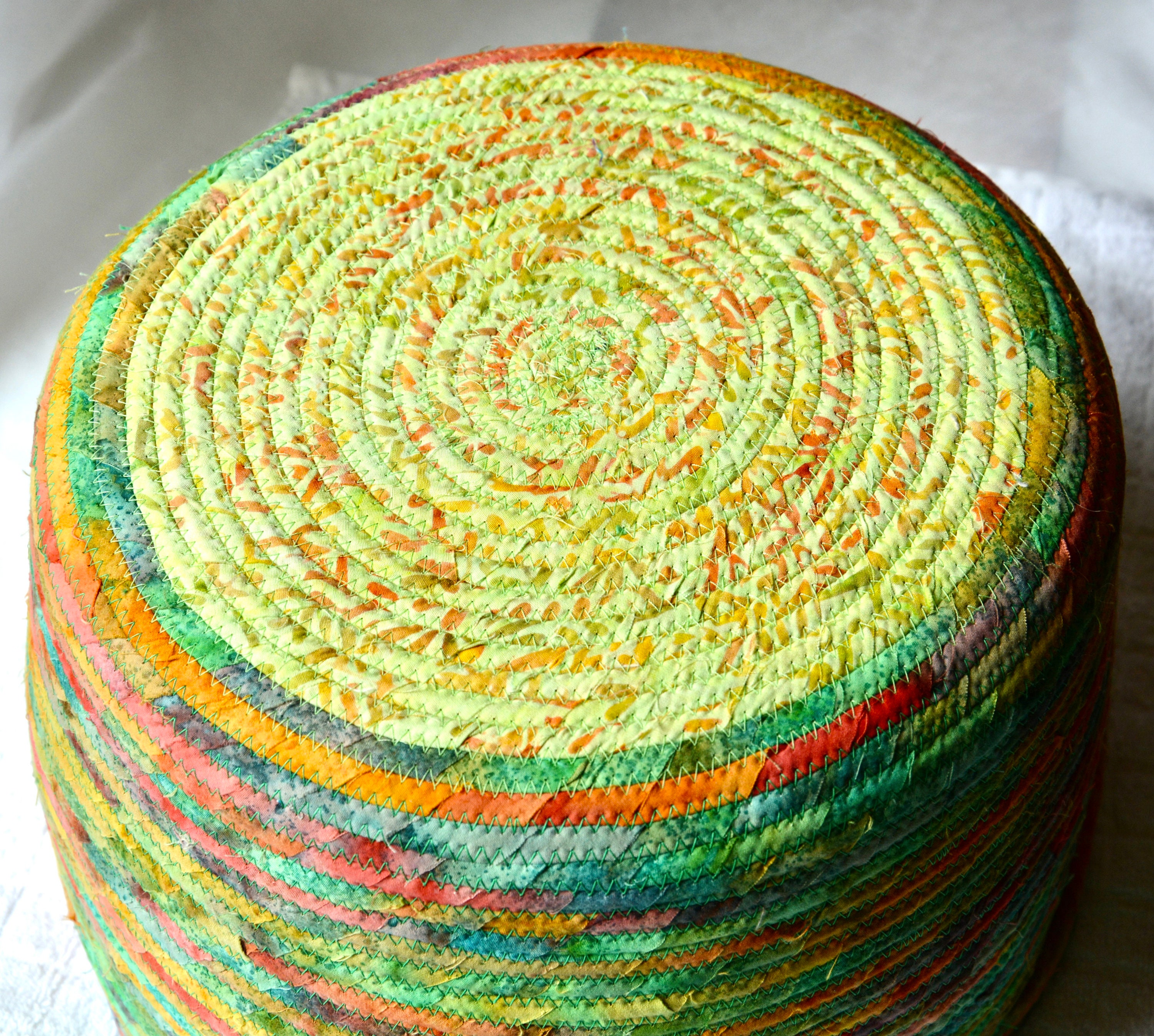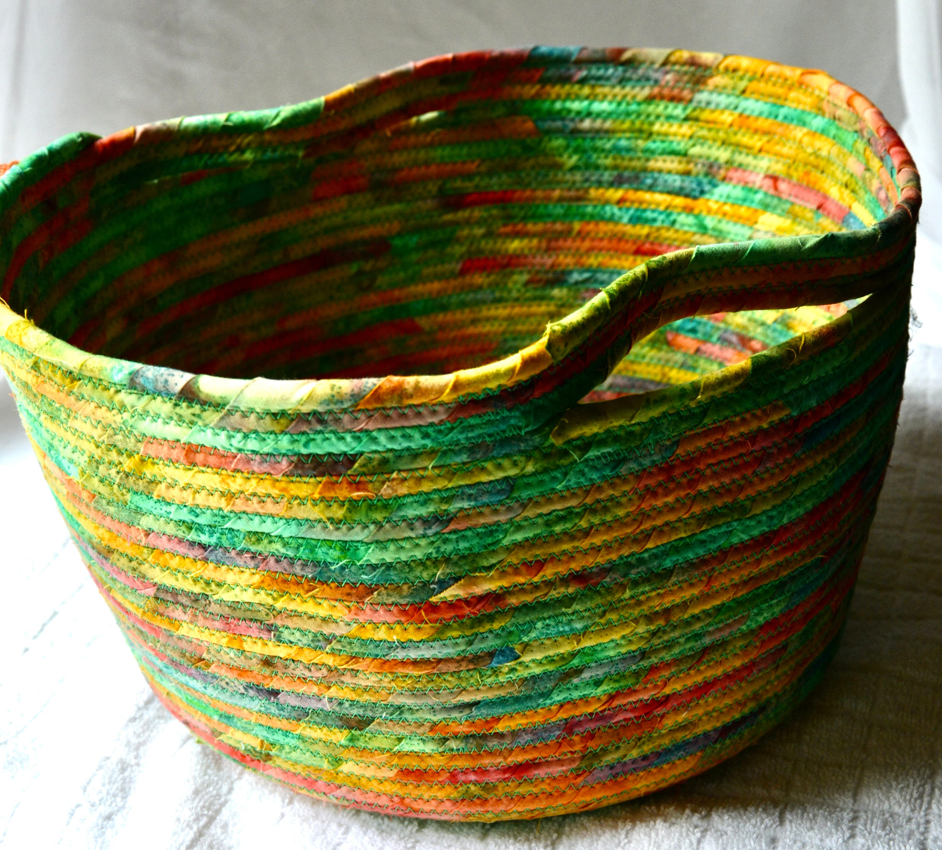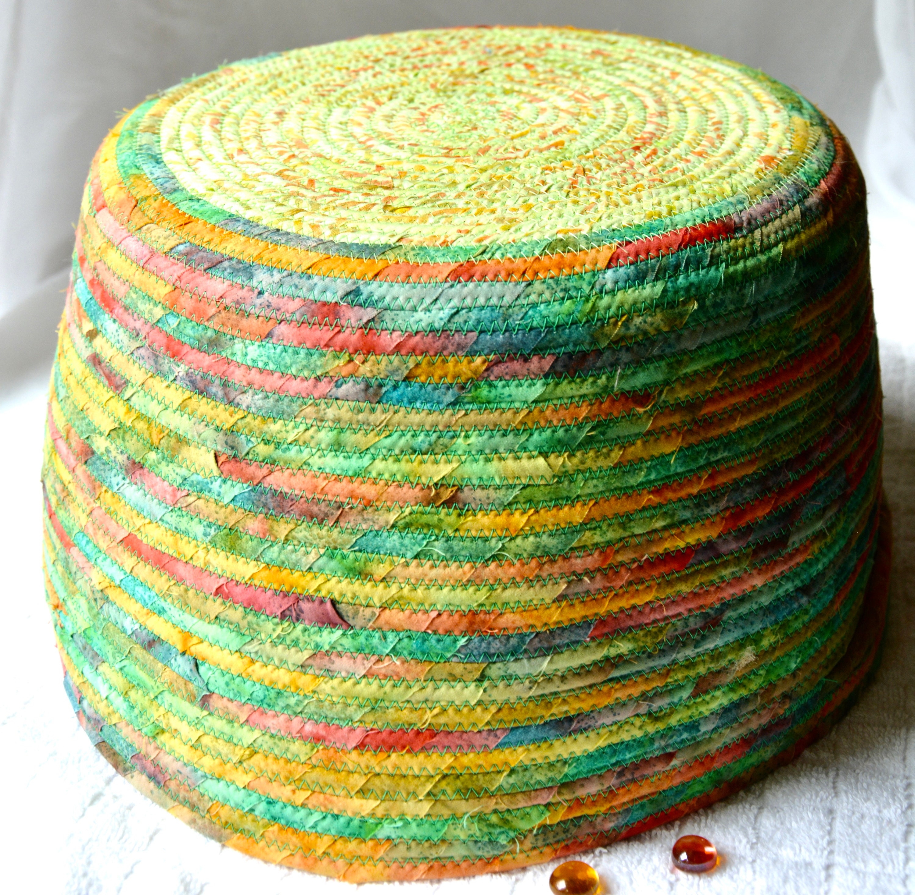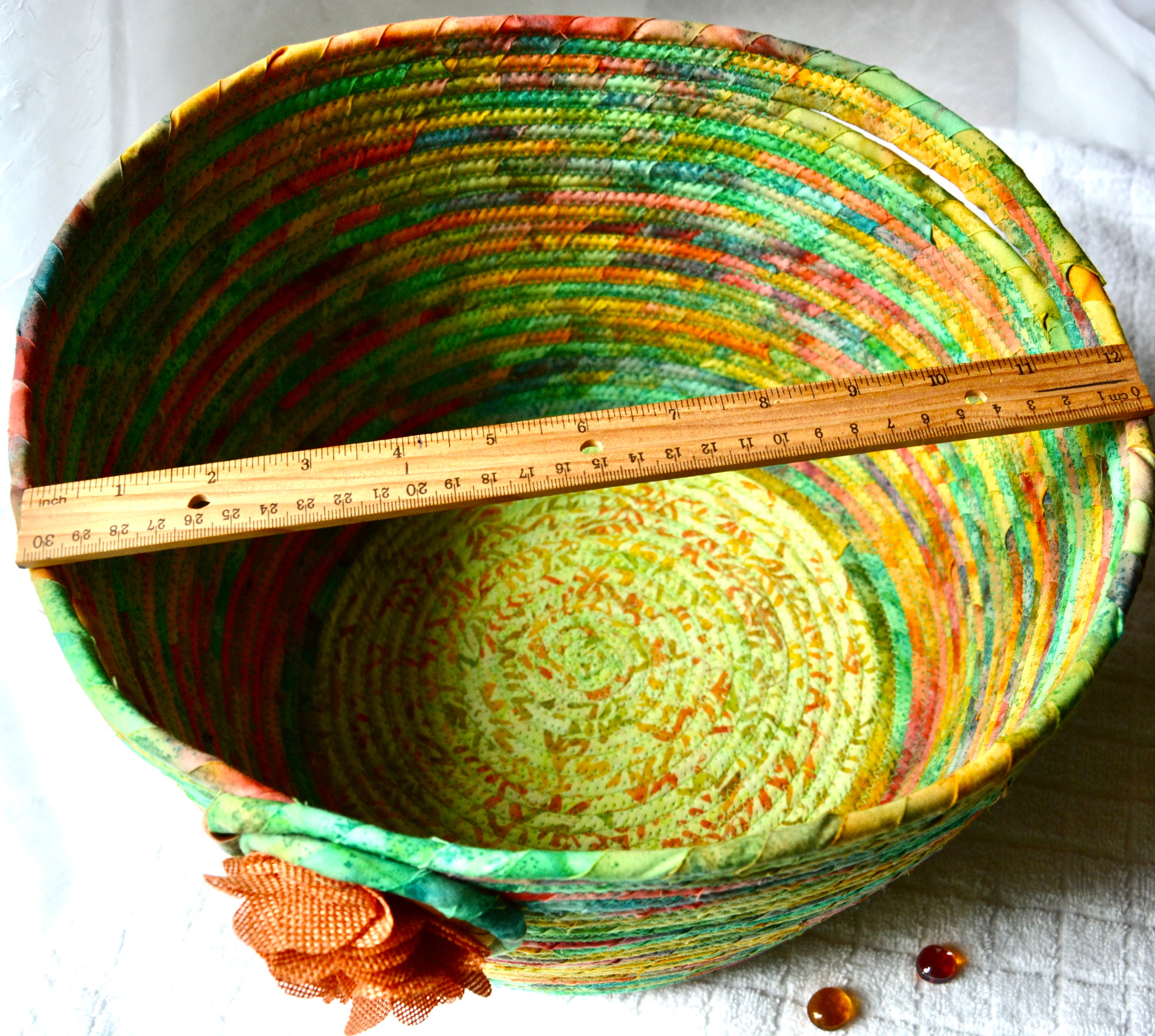 I hand wrapped this wonderful multicolor batik fabric around cotton line, which I then hand coiled and machine quilted to make it sturdy. I used the raw edge technique with some fray to add a great shabby chic texture. This is a high quality 100% cotton fabric and it shows on the inside too!