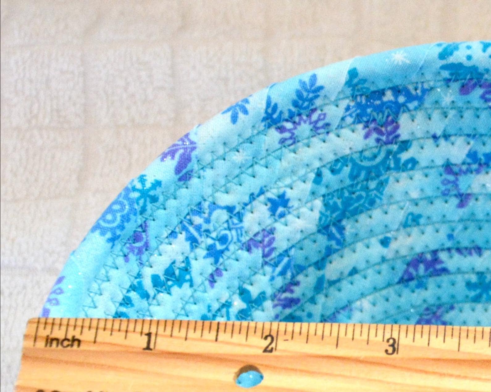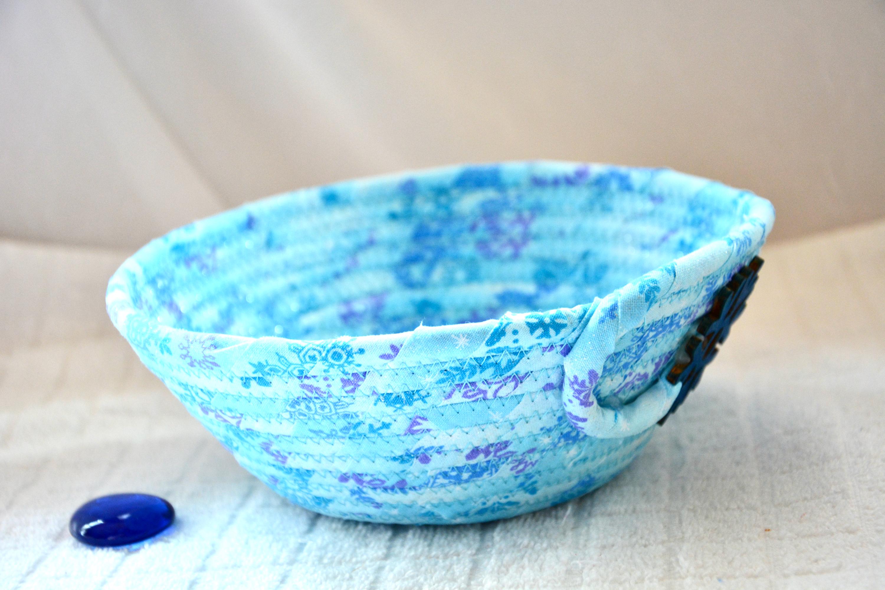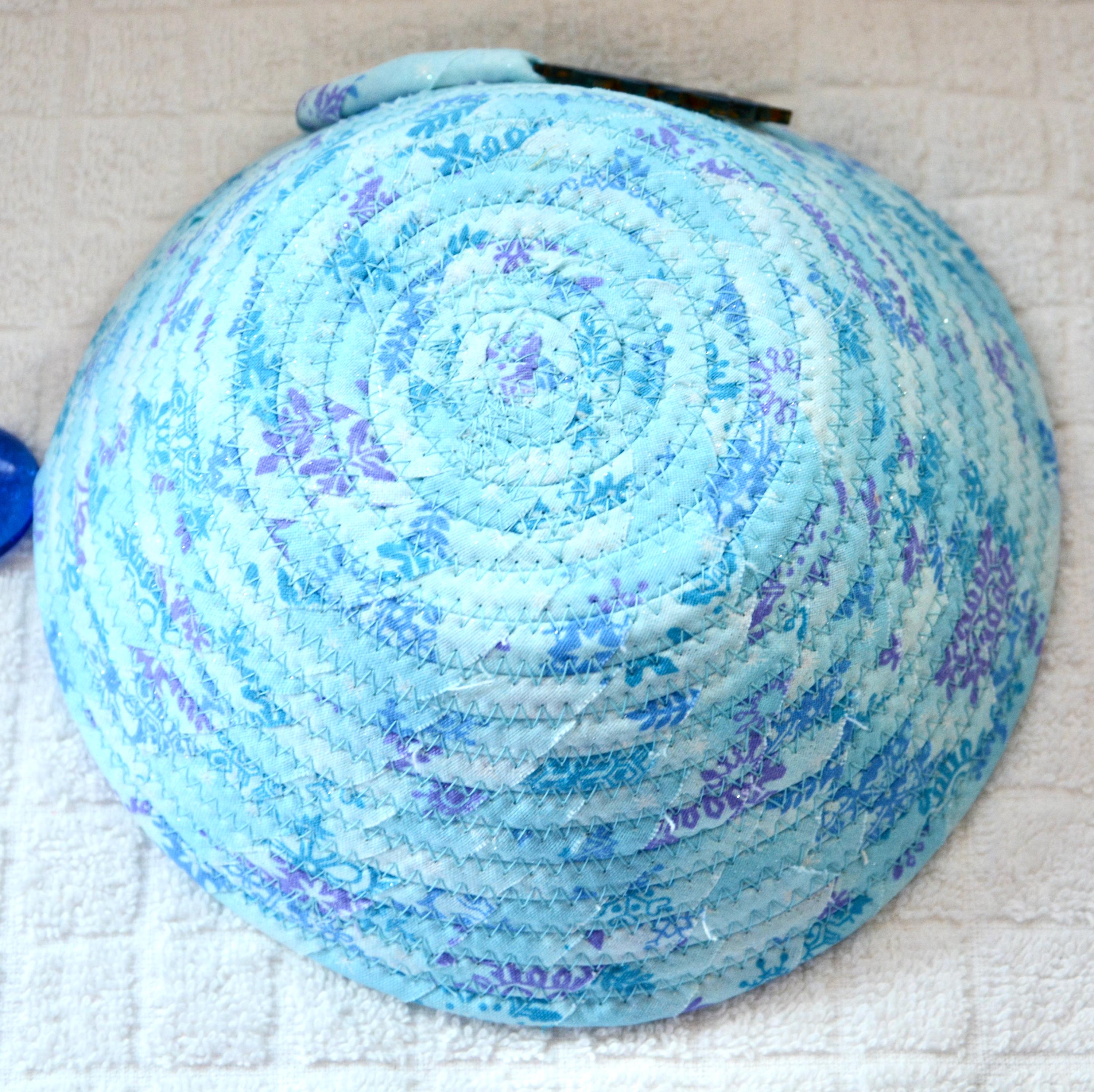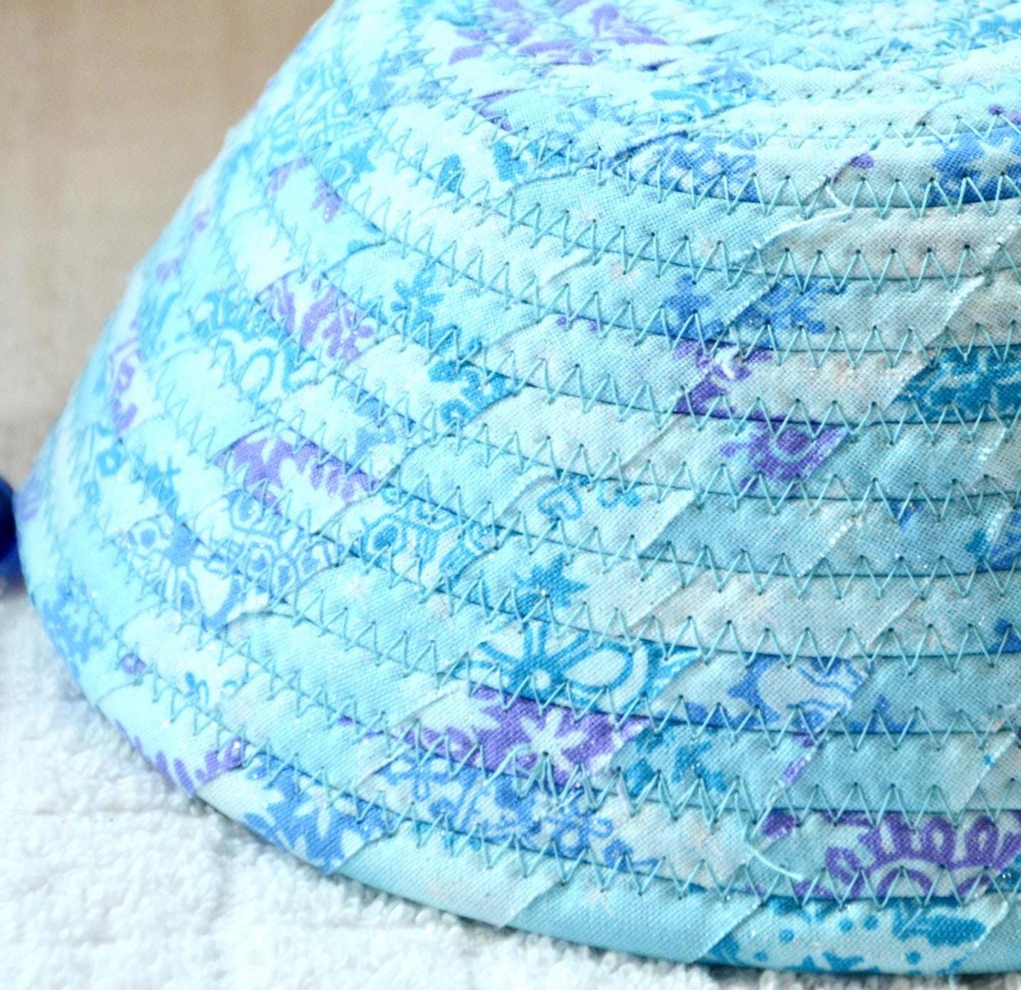 I hand wrapped this wonderful blue fabric around cotton line, which I then hand coiled and machine quilted to make it sturdy. I used the raw edge technique with some fray to add a great shabby chic texture. This is a high quality 100% cotton fabric and it shows on the inside too!