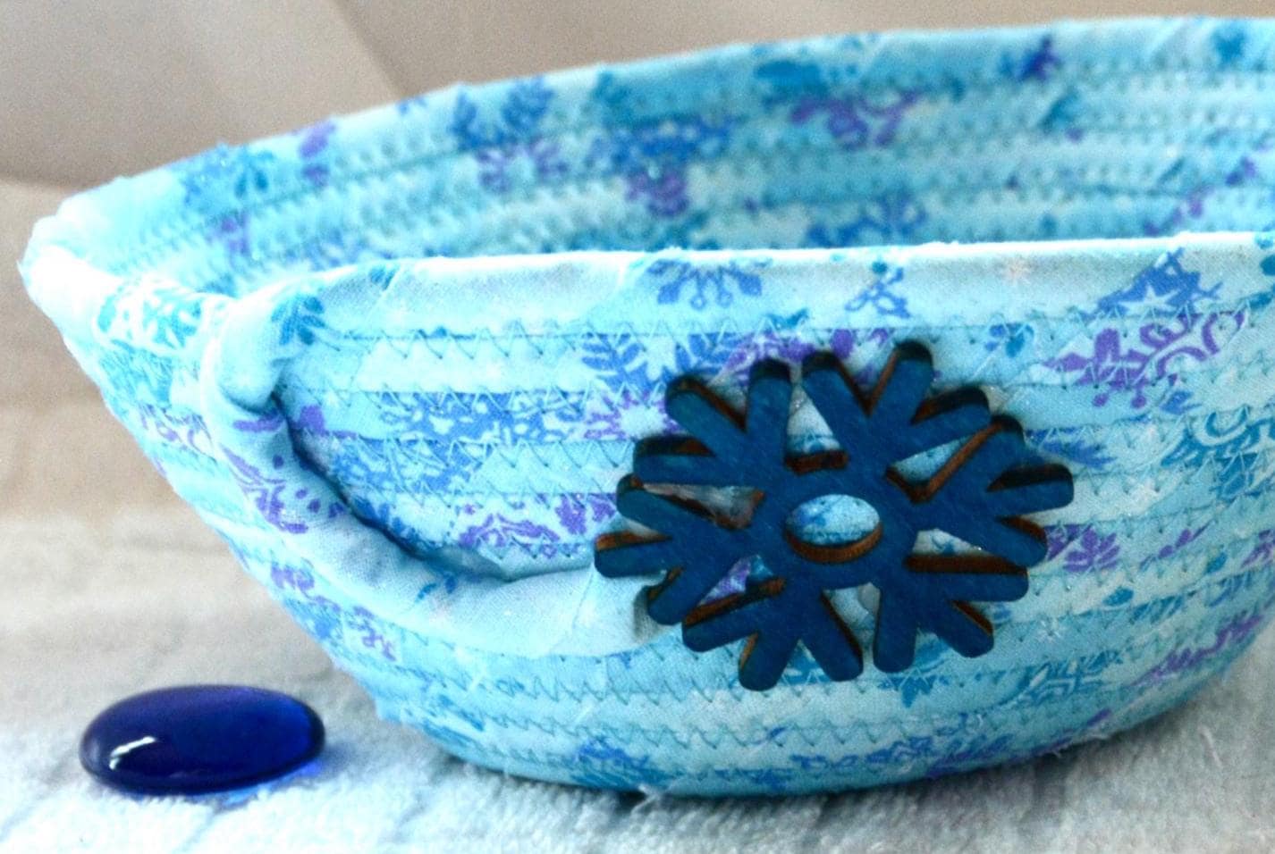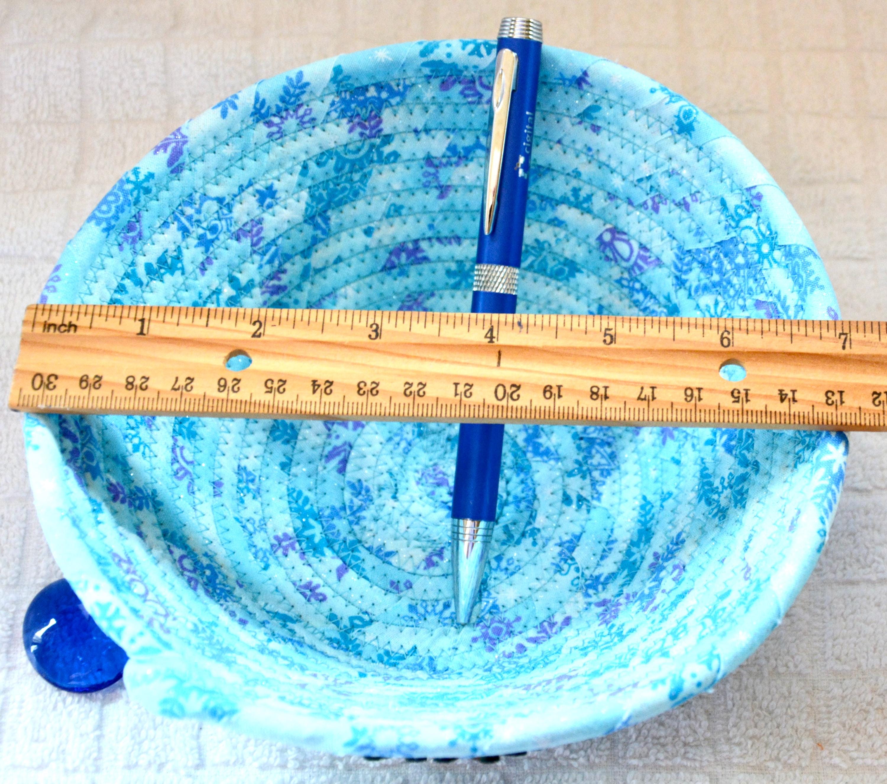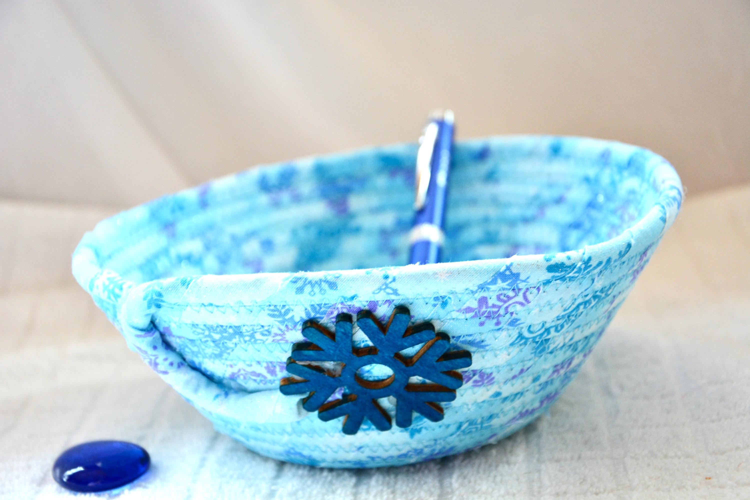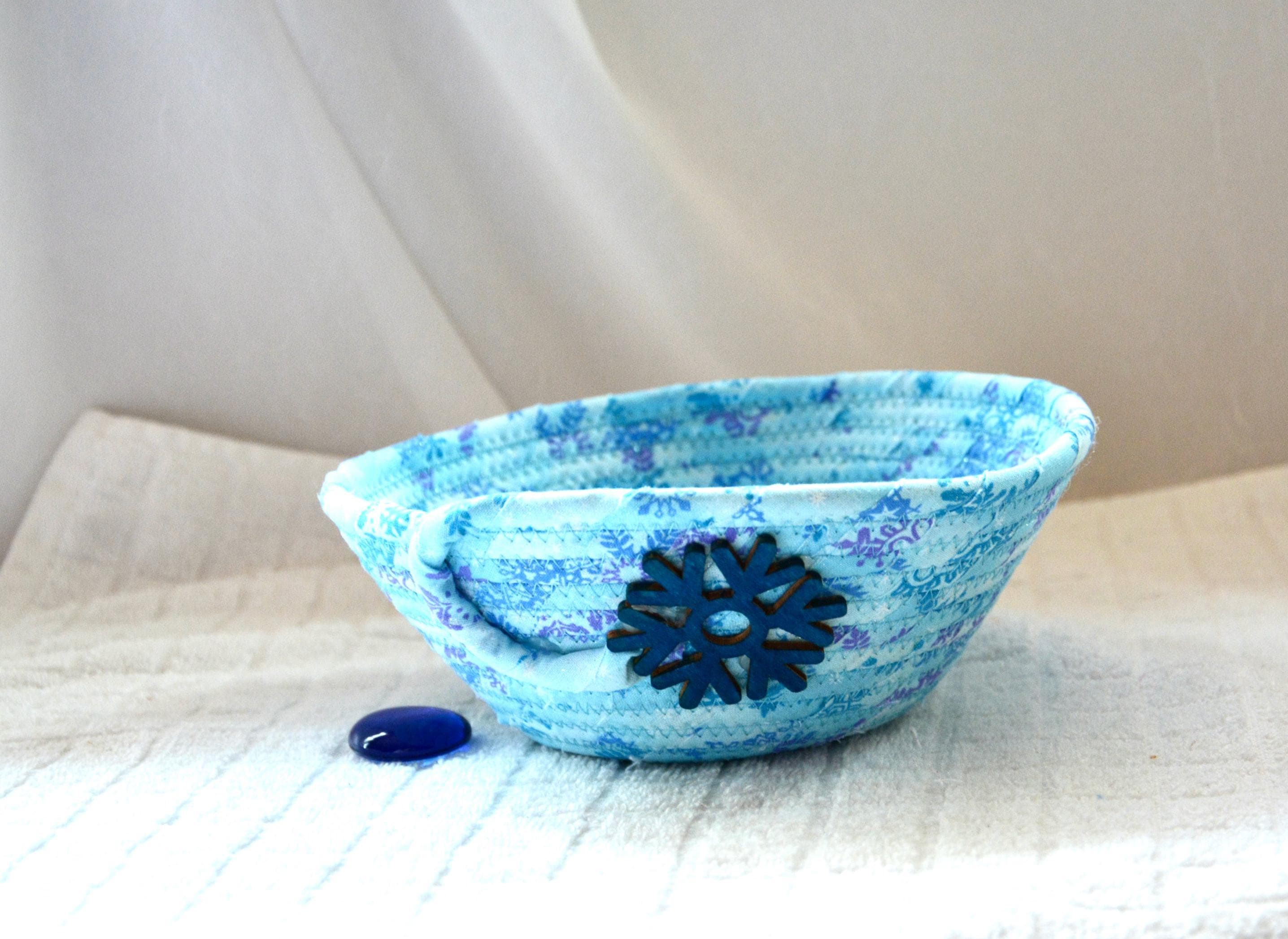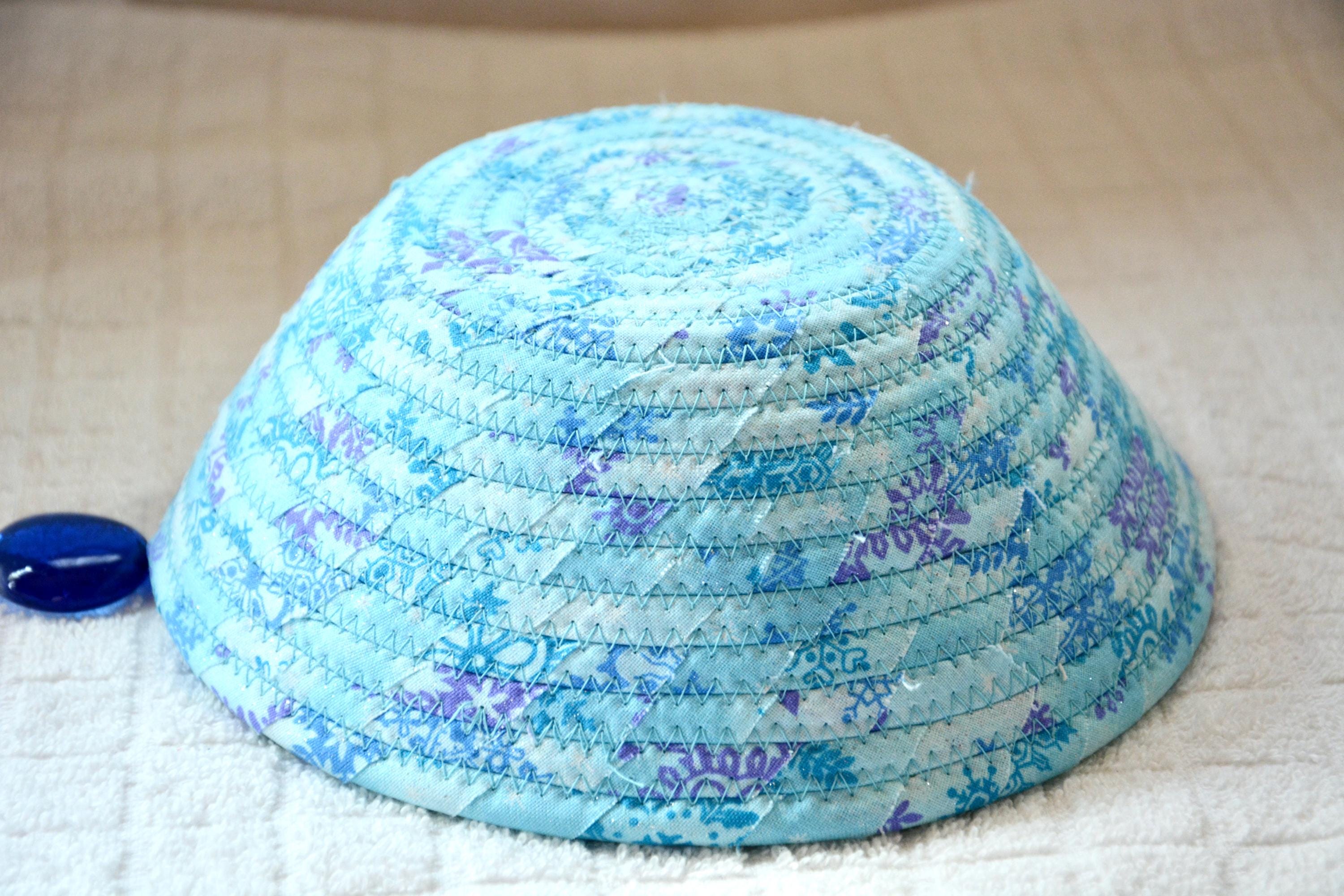 I hand wrapped this wonderful blue fabric around cotton line, which I then hand coiled and machine quilted to make it sturdy. I used the raw edge technique with some fray to add a great shabby chic texture. This is a high quality 100% cotton fabric and it shows on the inside too!