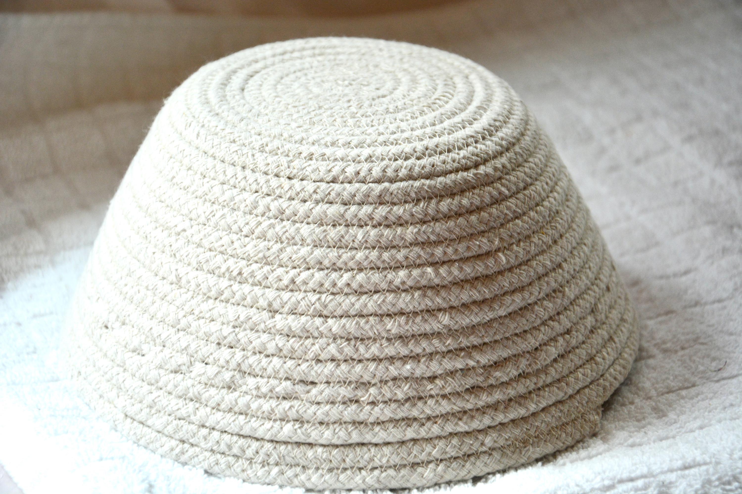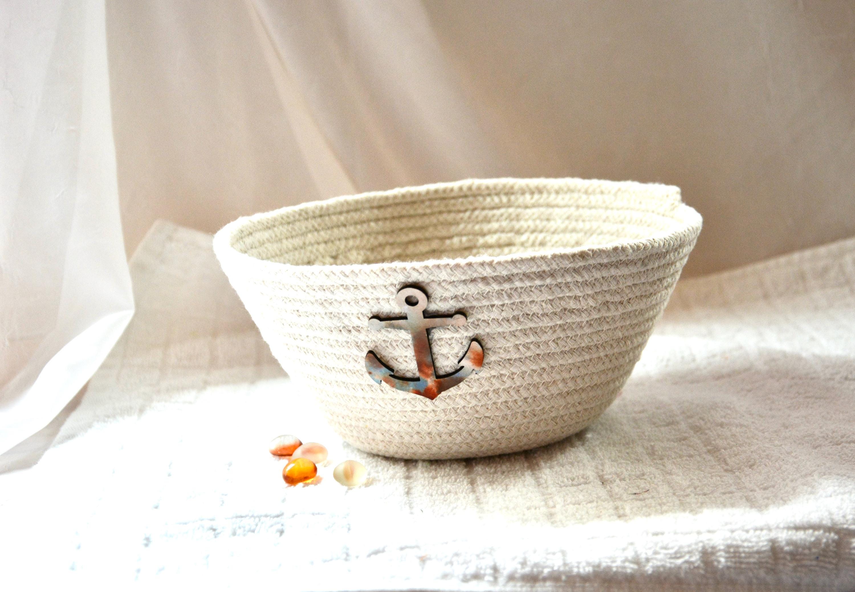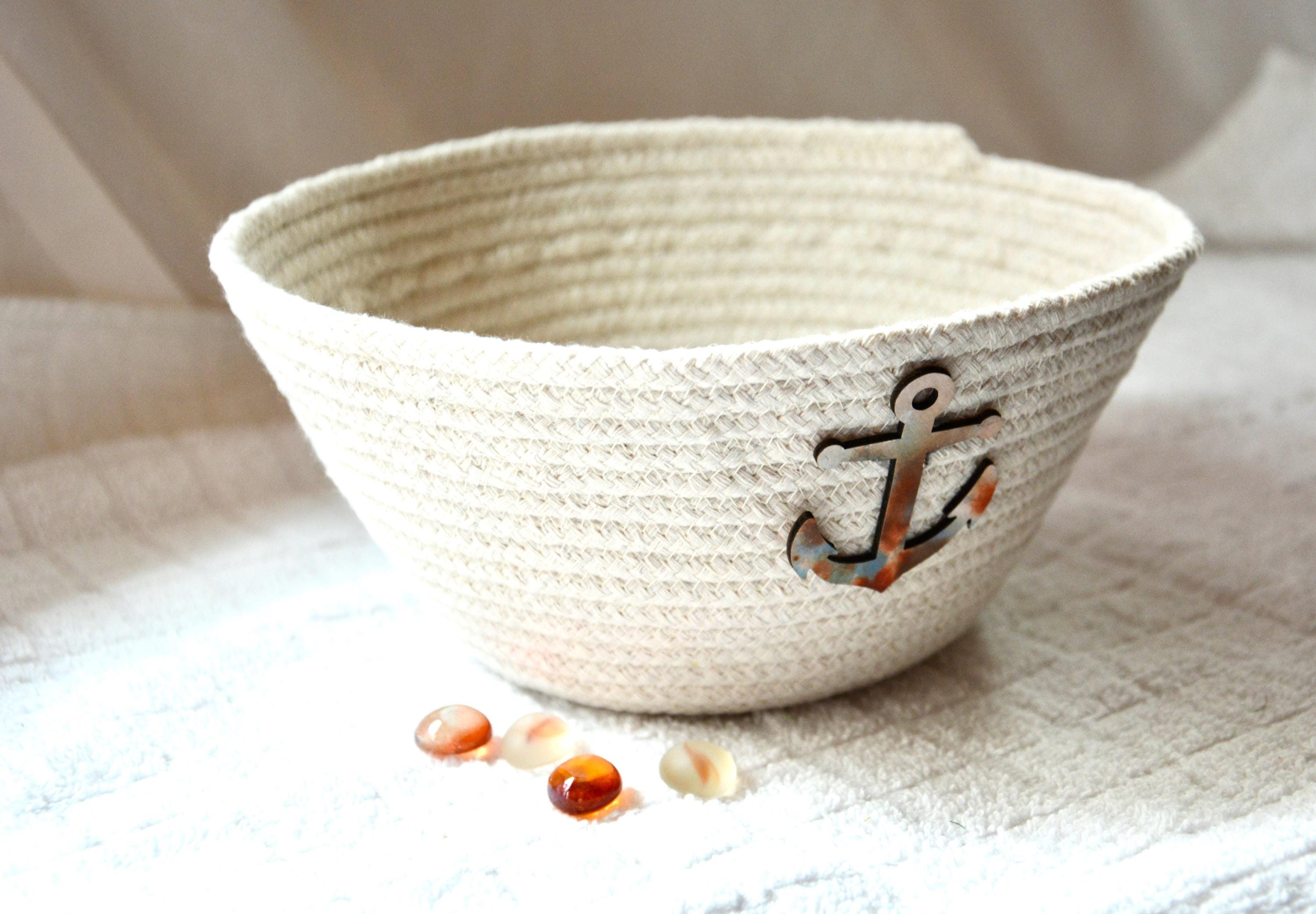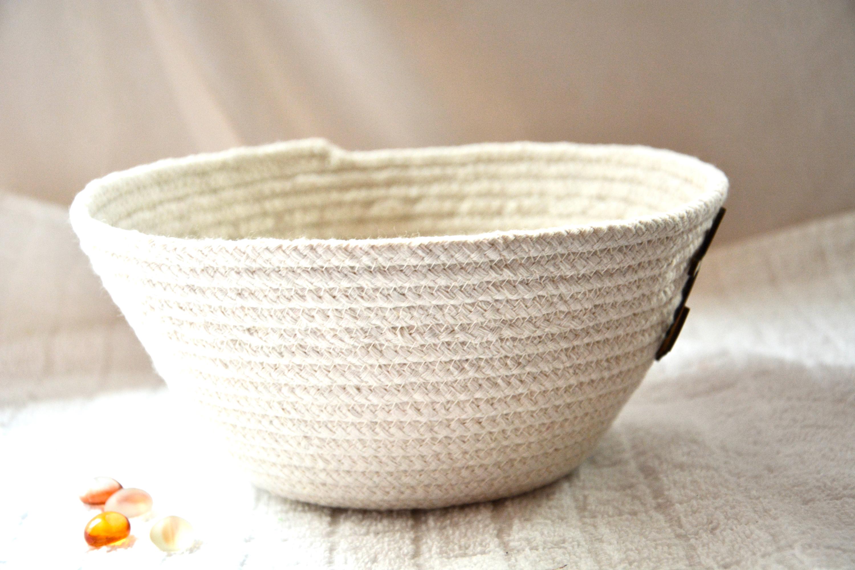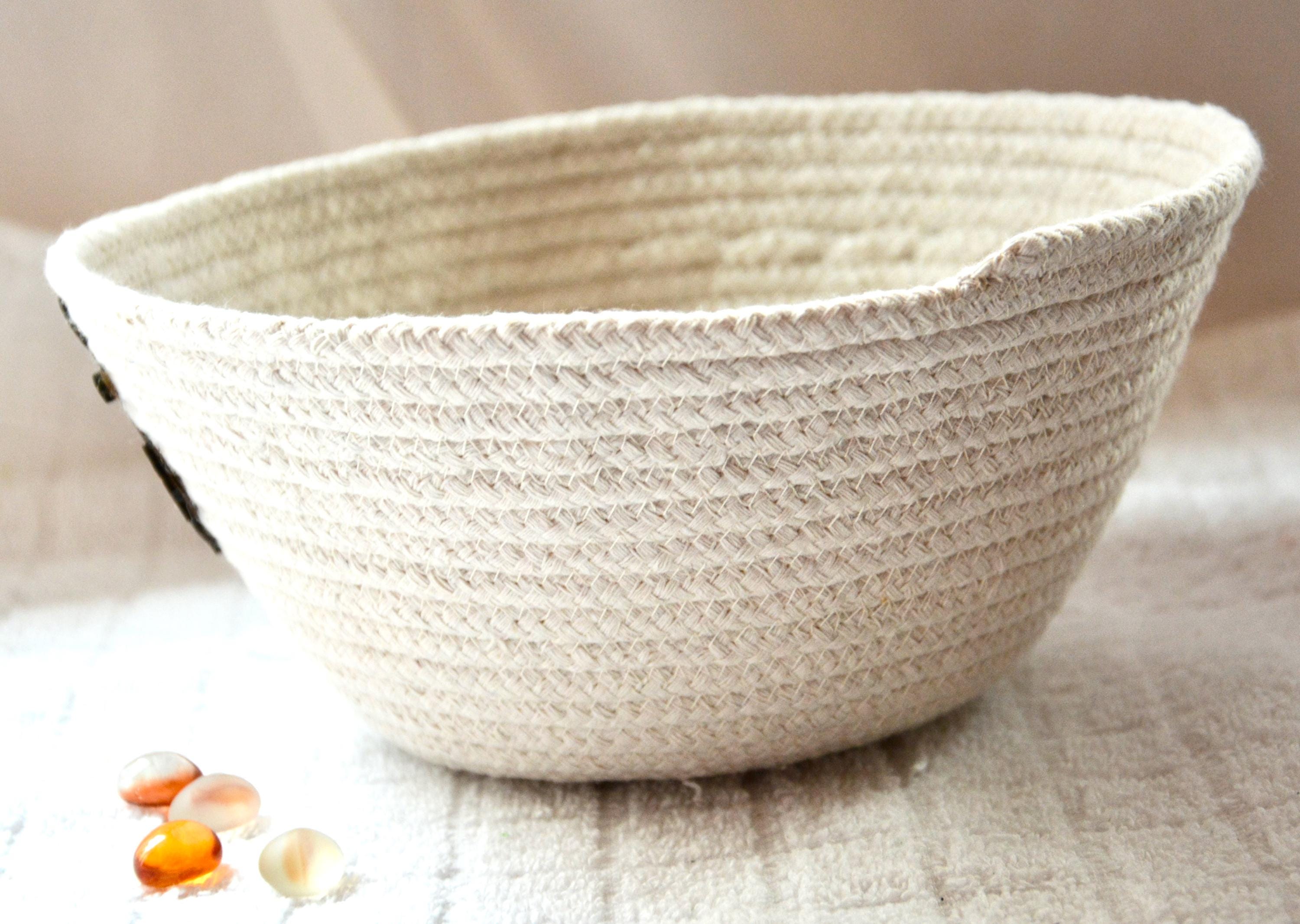 I hand coiled and machine quilted natural line to make this pretty decorative basket. Please note that the rope in this basket has a twisted lumpy area that gives it a unique texture, please see all pictures.