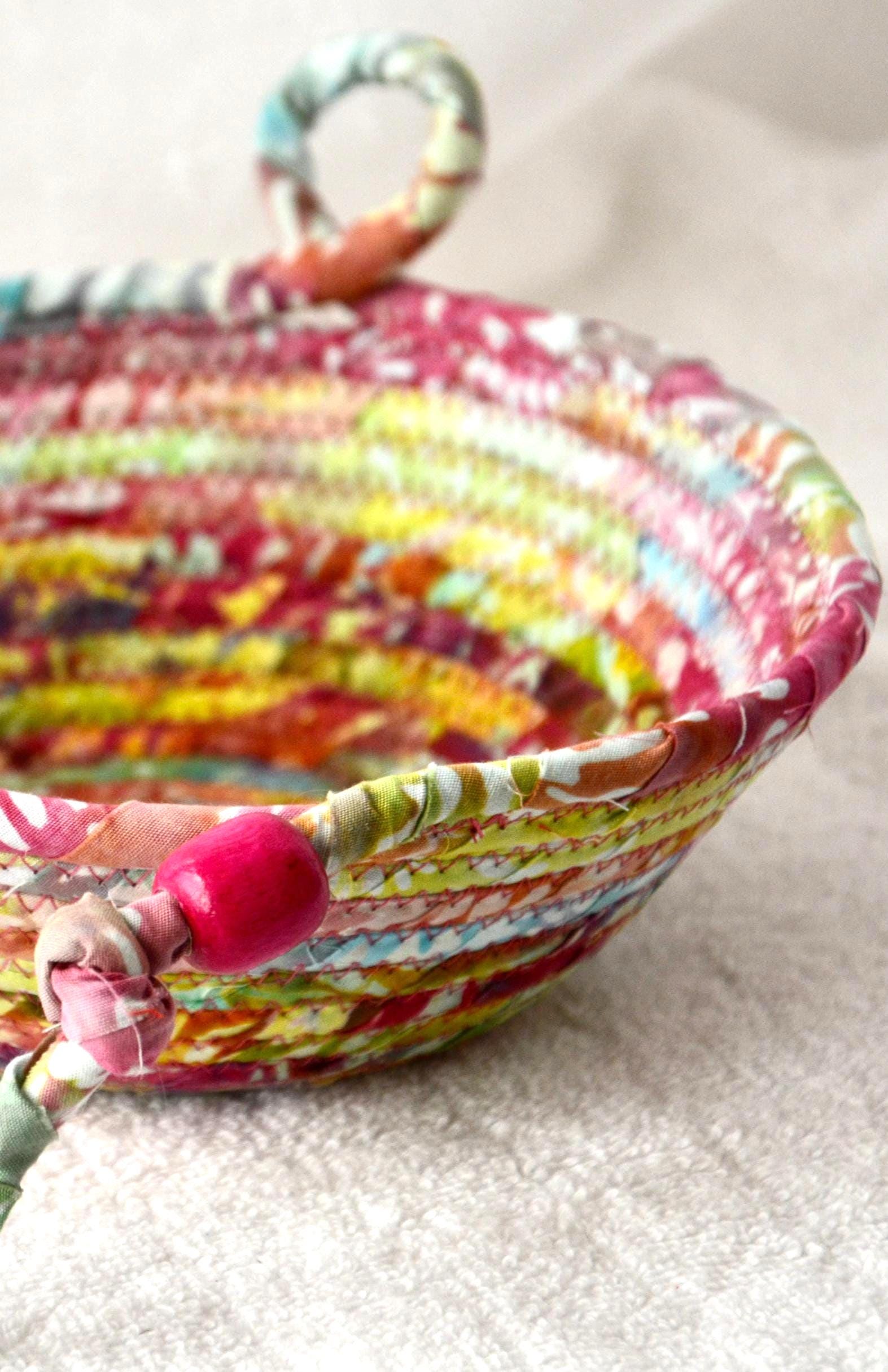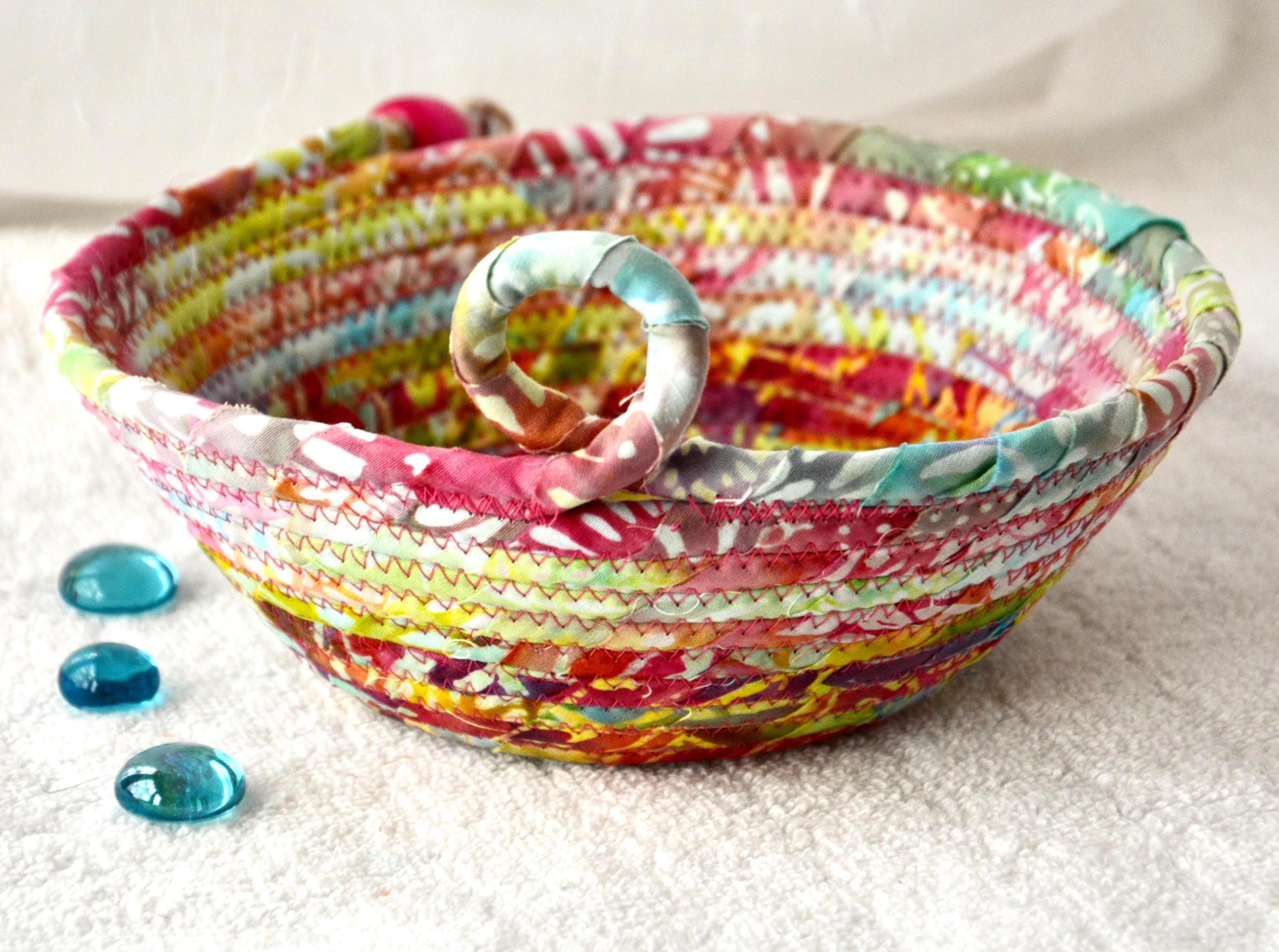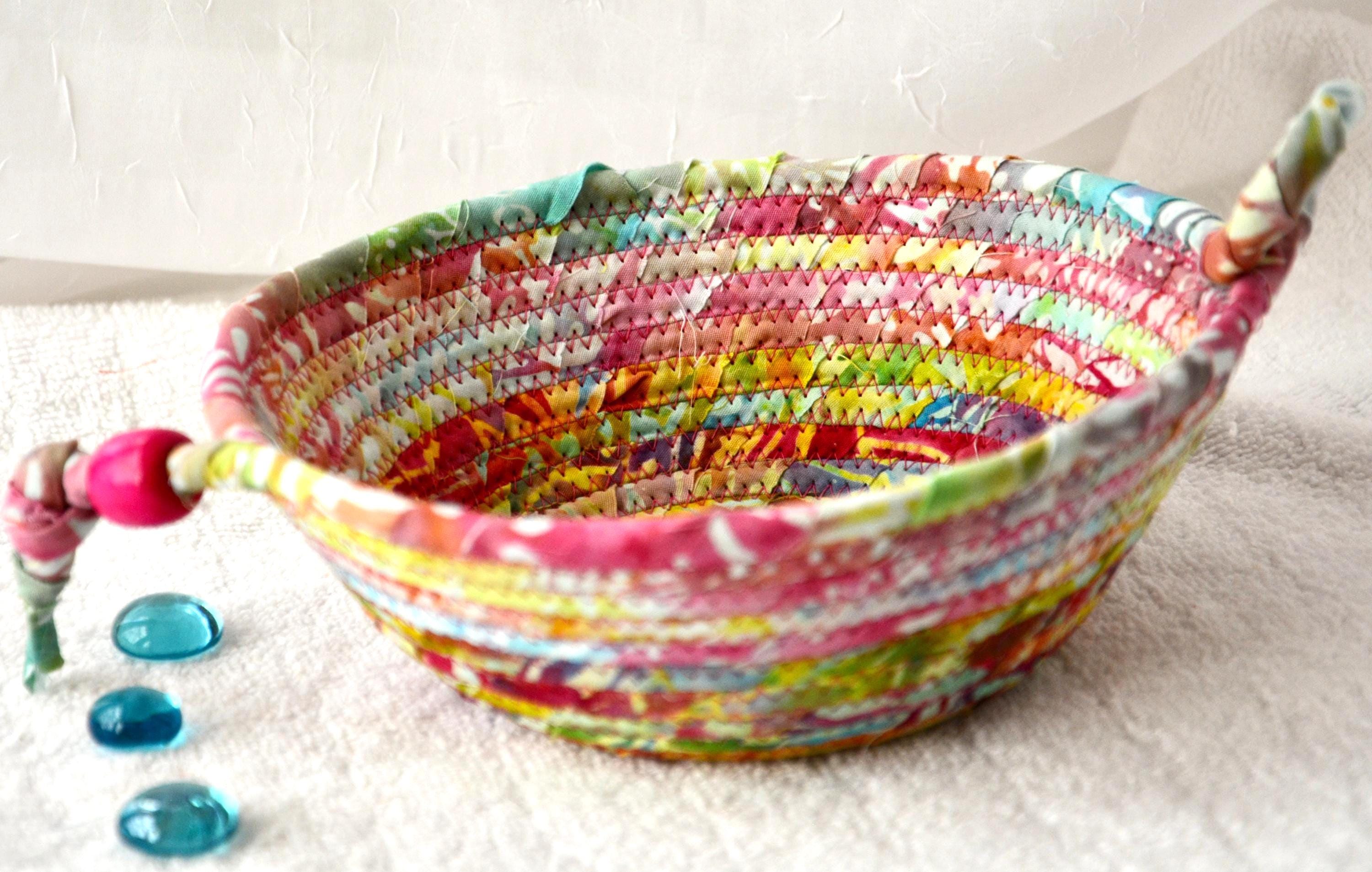 I hand wrapped this unique pink batik fabric around cotton line, which I then hand coiled and machine quilted to make it sturdy. I added a fun red batik fabric to the base for contrast. I used the raw edge technique with some fray for a great shabby chic texture. These fun fabrics are 100% cotton and show on the inside of the basket too!
