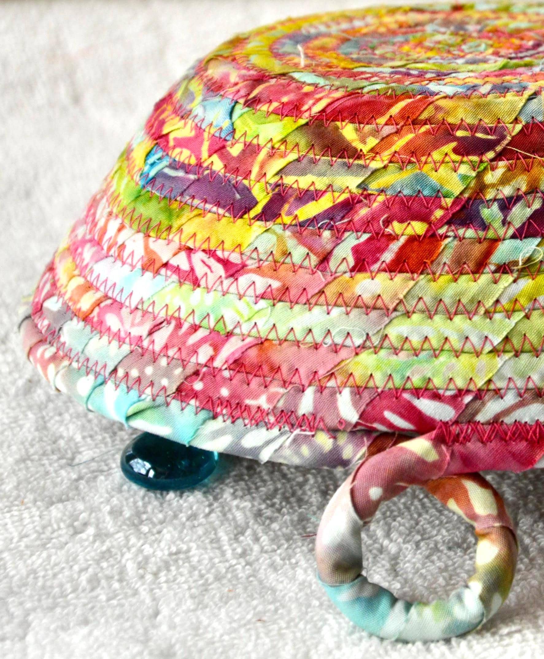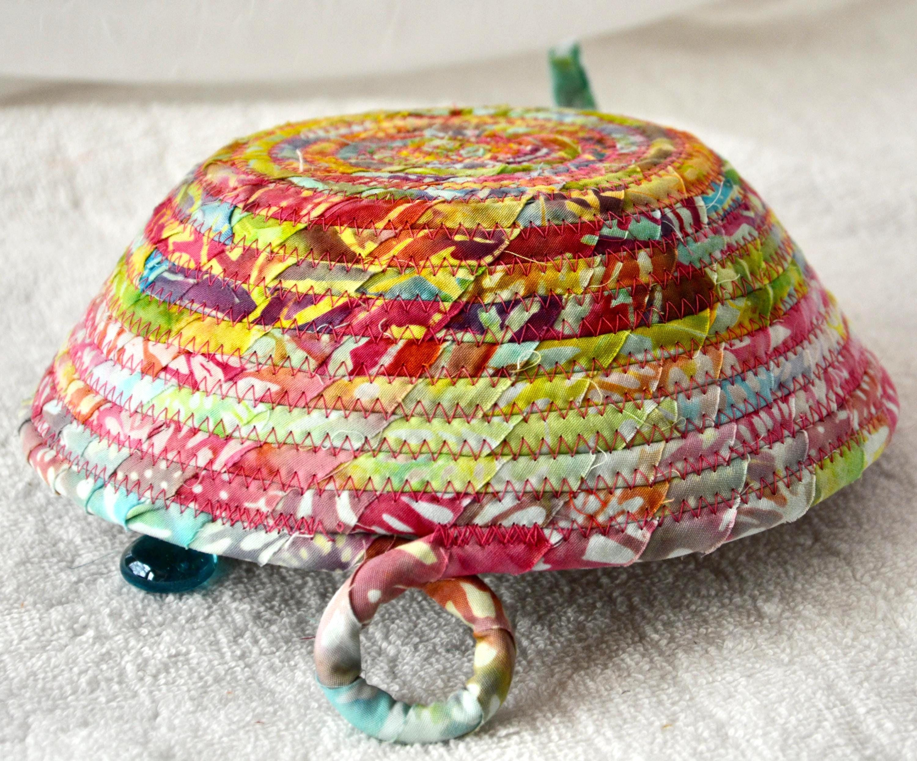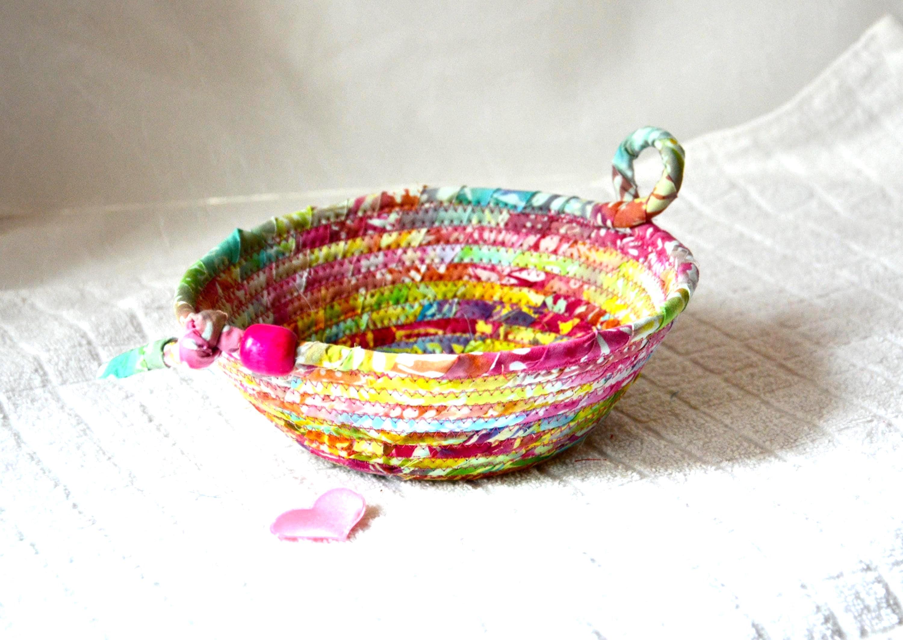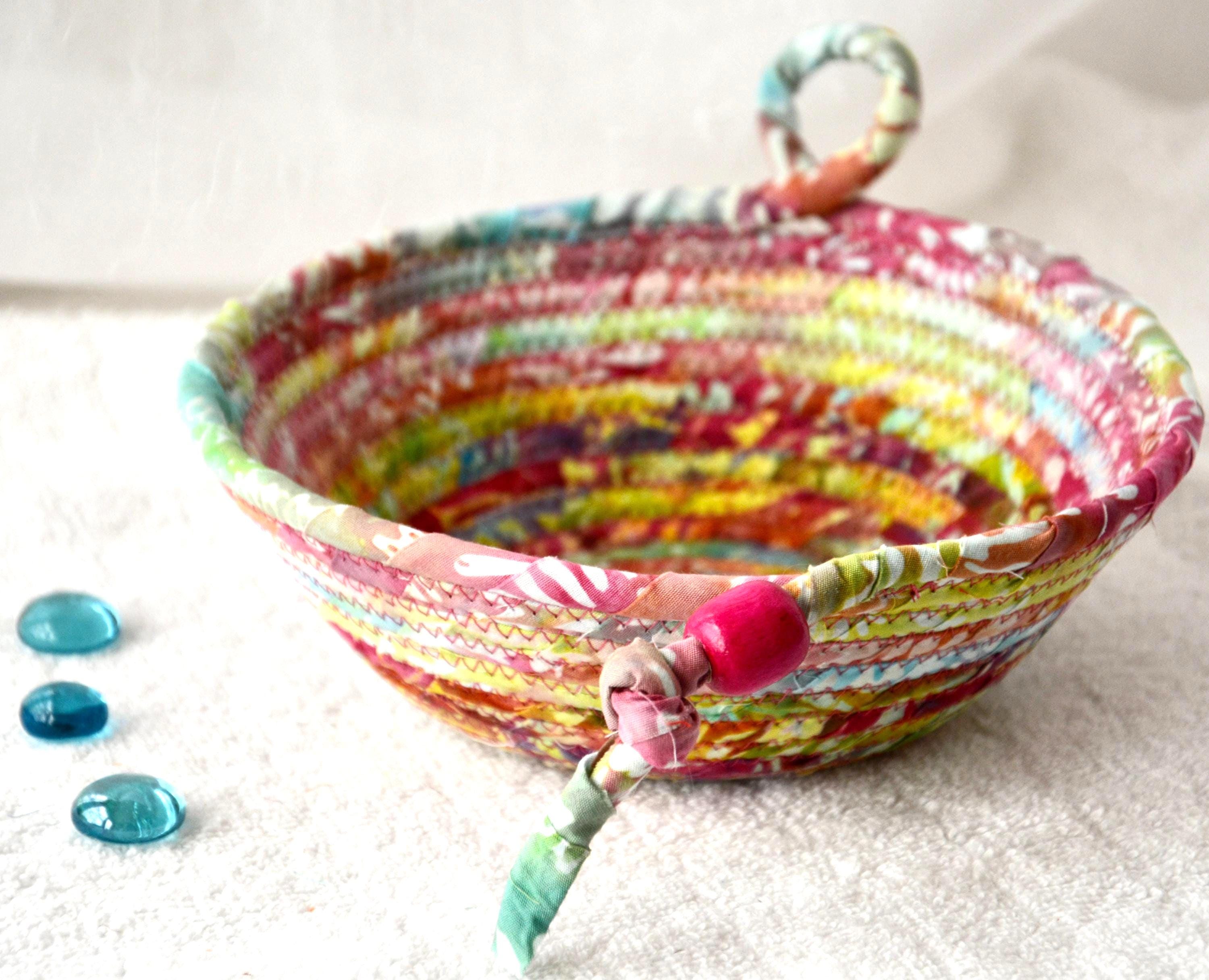 I hand wrapped this unique pink batik fabric around cotton line, which I then hand coiled and machine quilted to make it sturdy. I added a fun red batik fabric to the base for contrast. I used the raw edge technique with some fray for a great shabby chic texture. These fun fabrics are 100% cotton and show on the inside of the basket too!