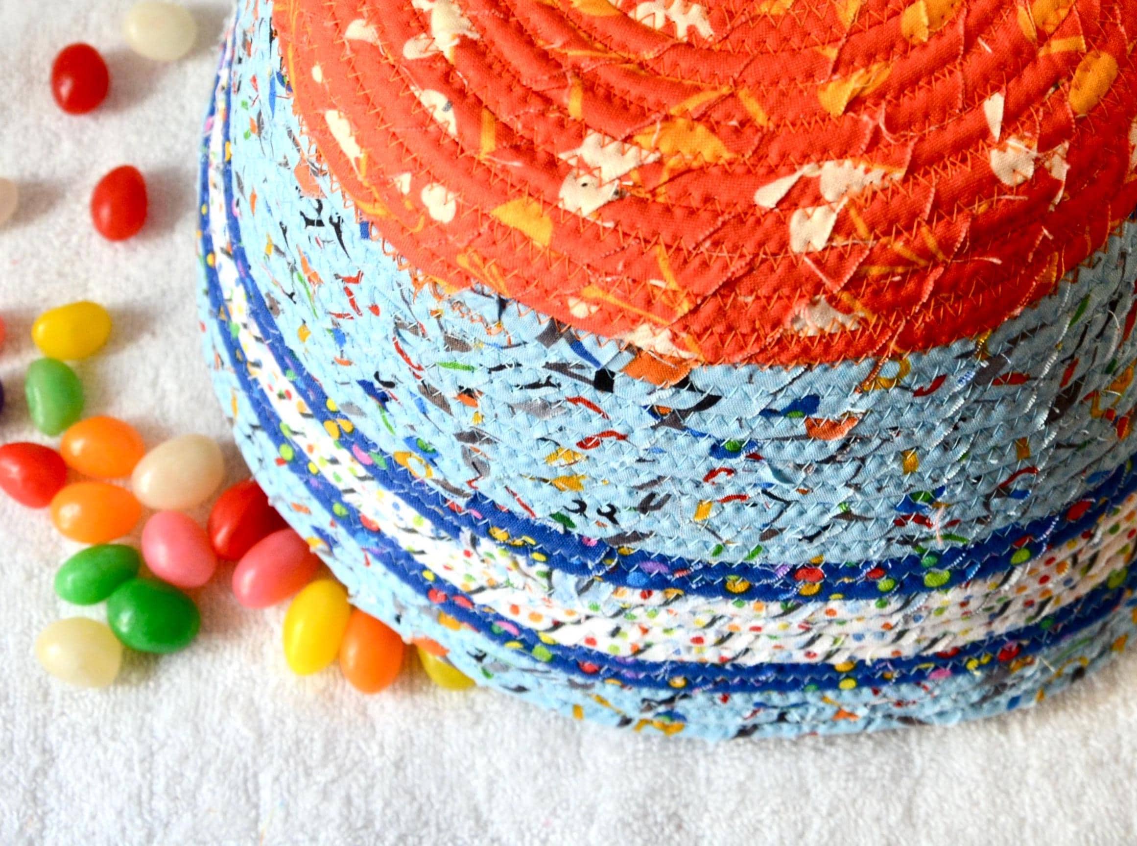 I hand wrapped these fun blue and orange fabrics around cotton line, which I then hand coiled and machine quilted to make it sturdy. I used the raw edge technique with a little fray for a great shabby chic texture. The cute bunny on the basket is included for a nice accent.