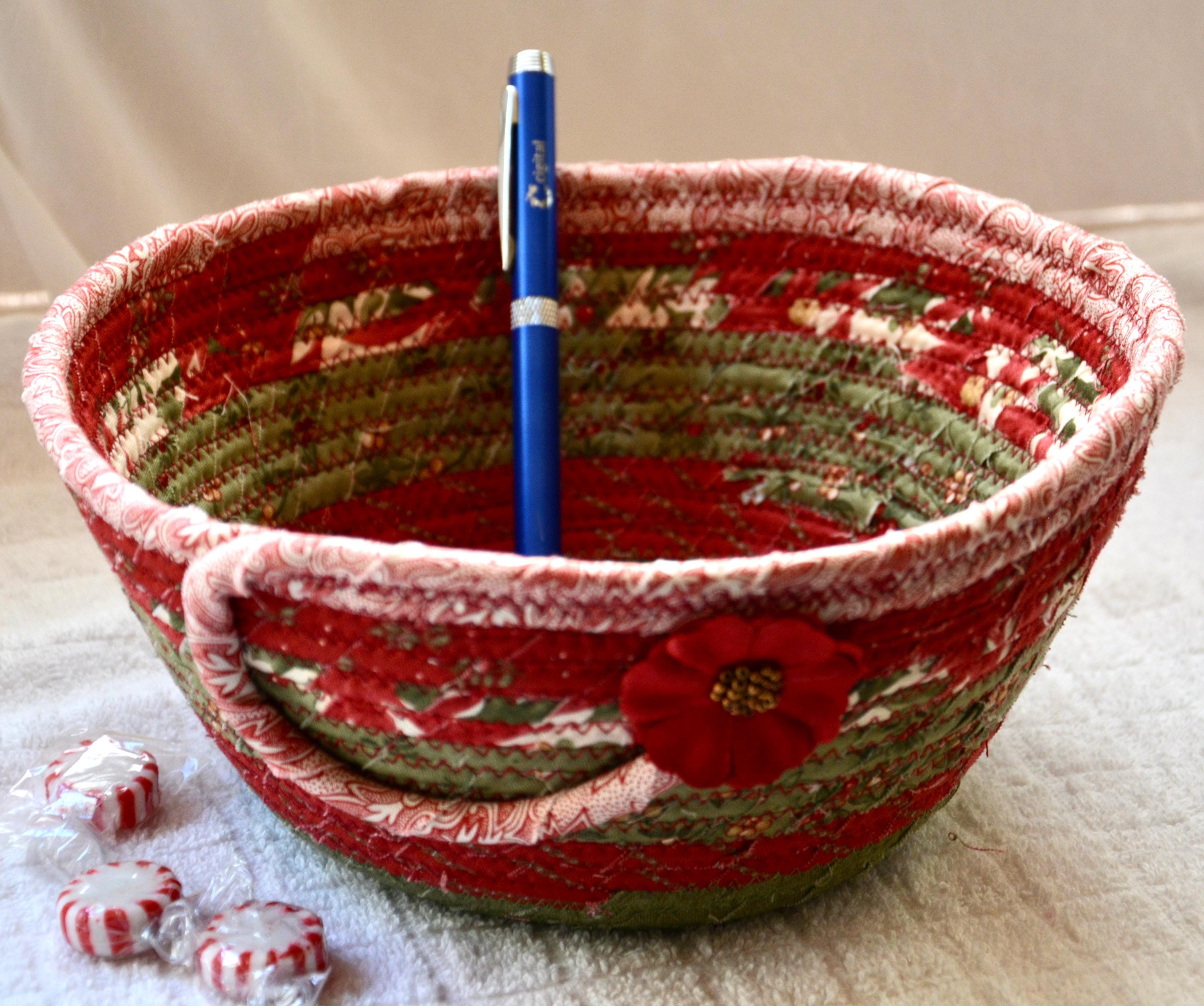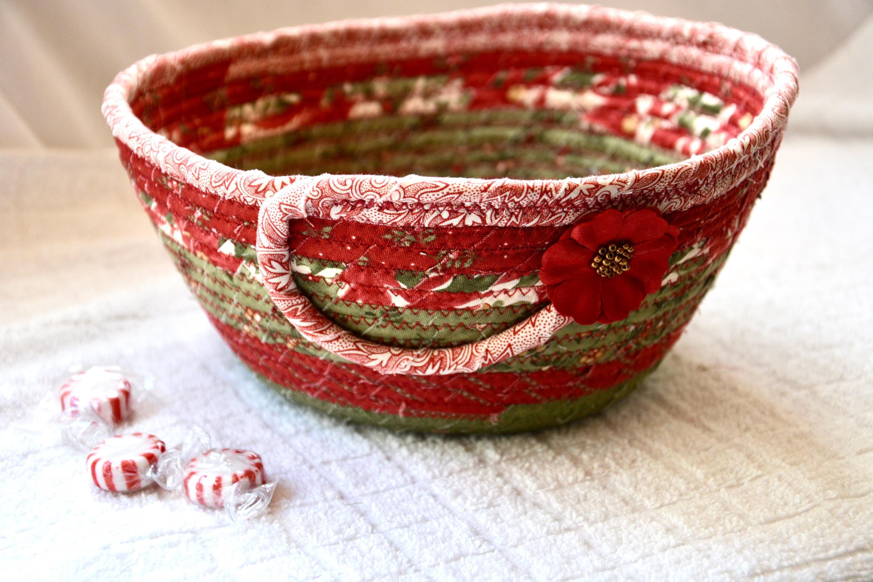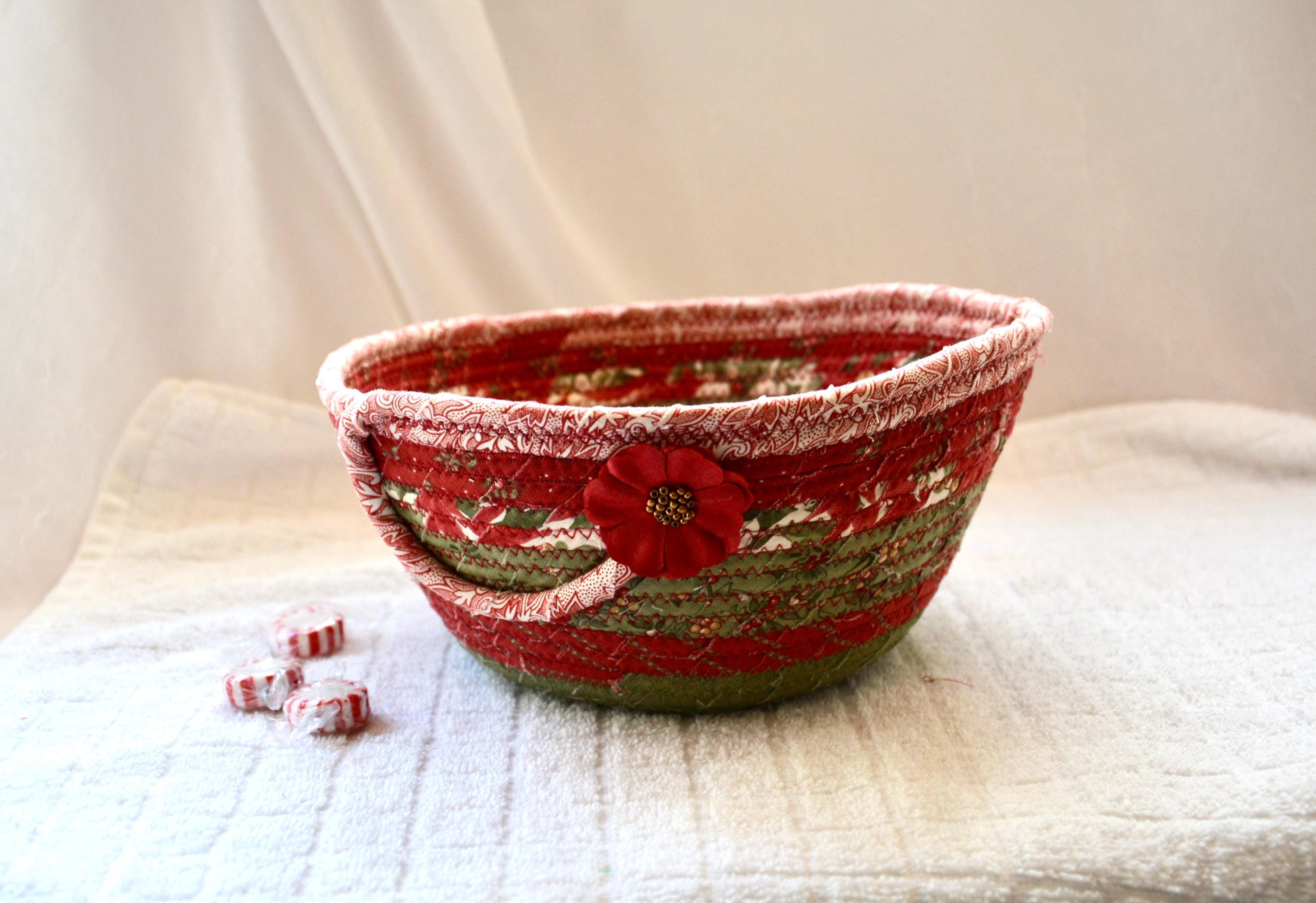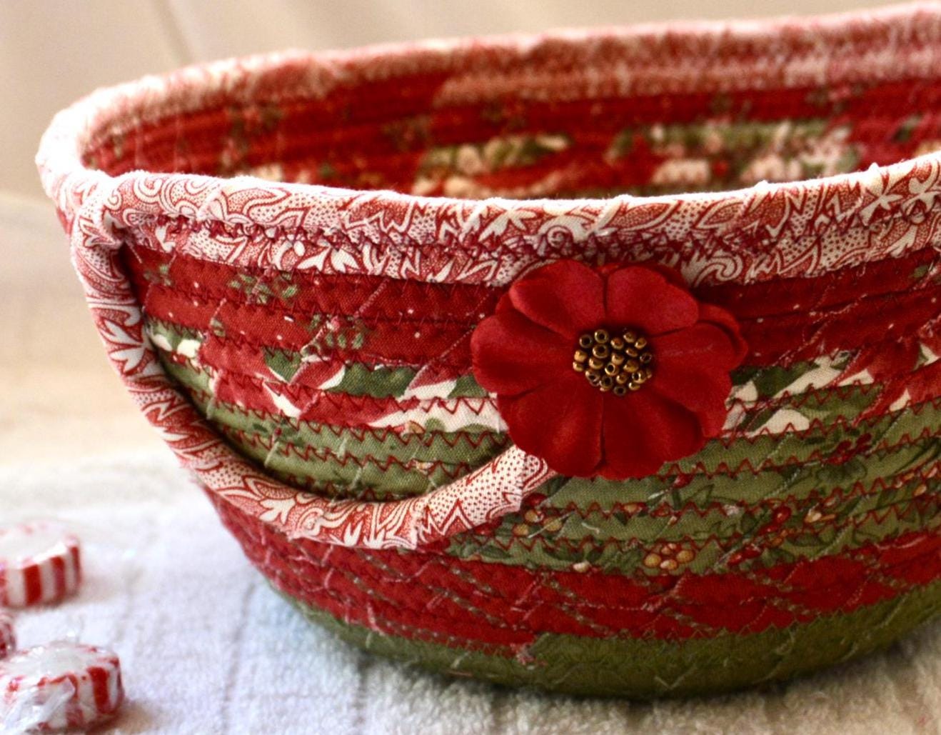 I hand wrapped these high quality MODA Christmas fabrics around cotton line, which I then hand coiled and machine quilted to make it sturdy. I used the raw edge technique with a little fray to add a wonderful shabby chic texture. I just love these pretty MODA red and green fabrics, they have pretty highlights. So festive! The pretty flower on the basket is included for a nice accent.