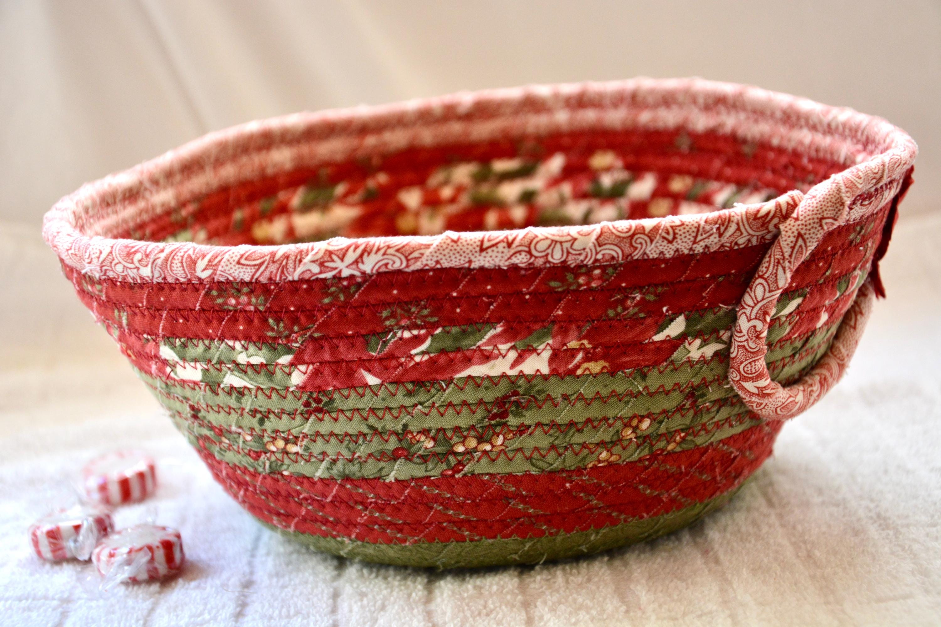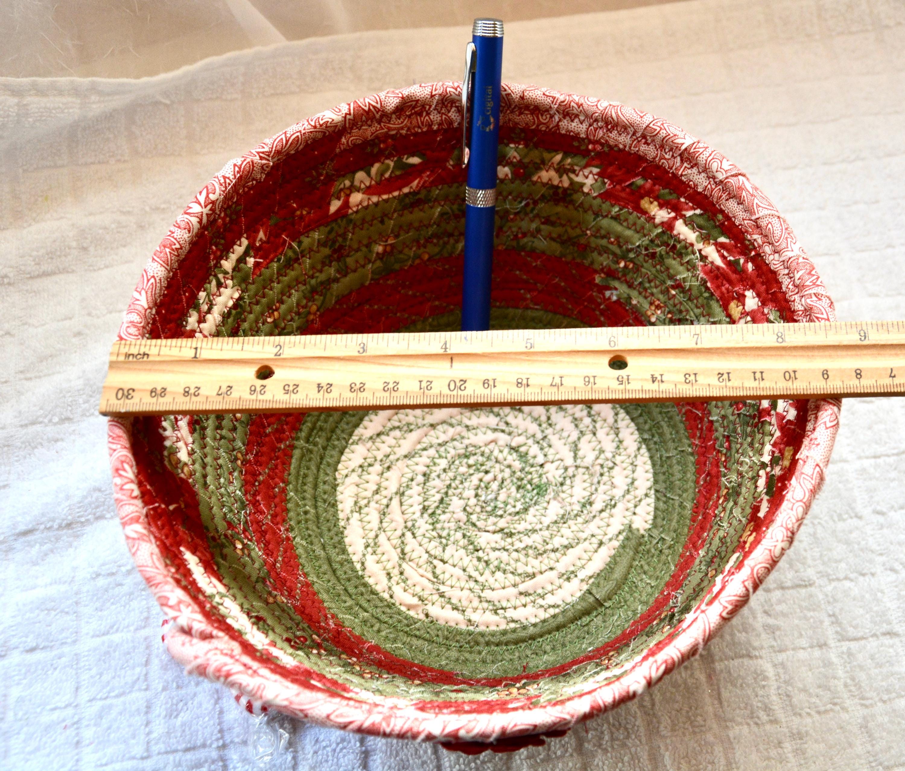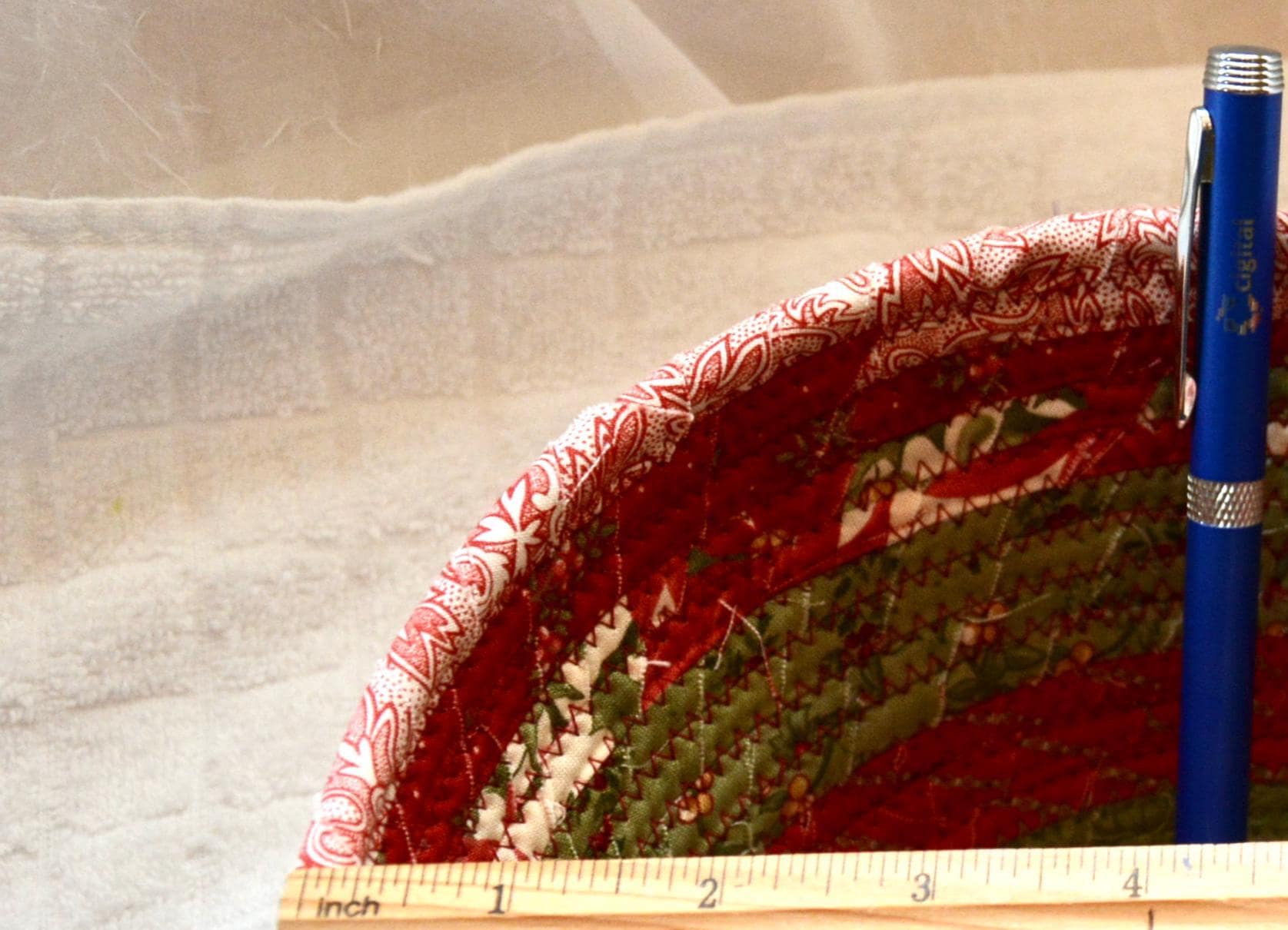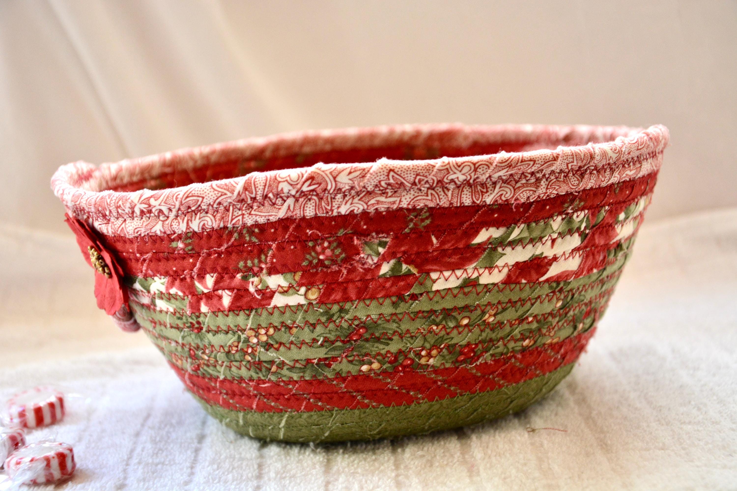 I hand wrapped these high quality MODA Christmas fabrics around cotton line, which I then hand coiled and machine quilted to make it sturdy. I used the raw edge technique with a little fray to add a wonderful shabby chic texture. I just love these pretty MODA red and green fabrics, they have pretty highlights. So festive! The pretty flower on the basket is included for a nice accent.