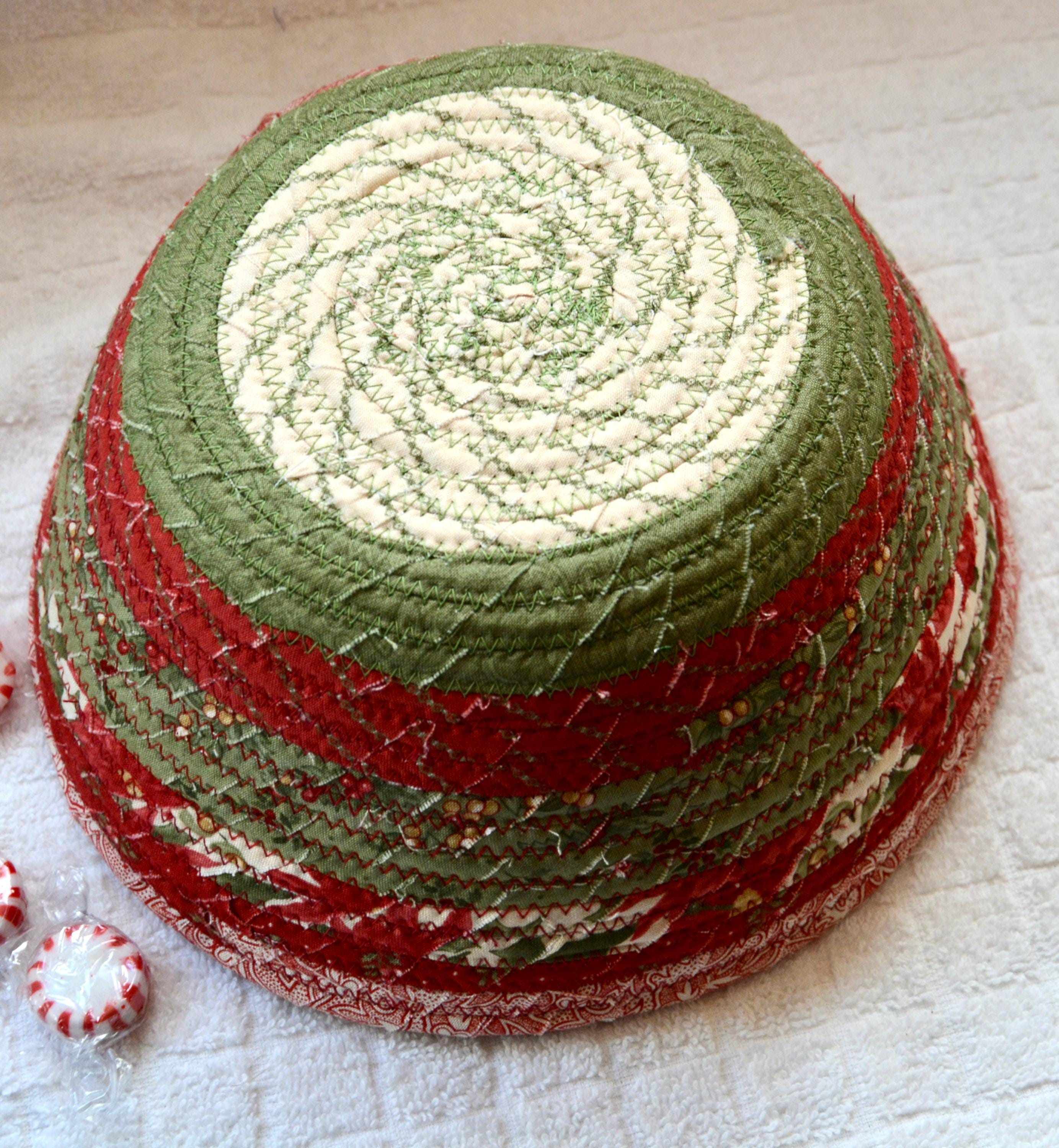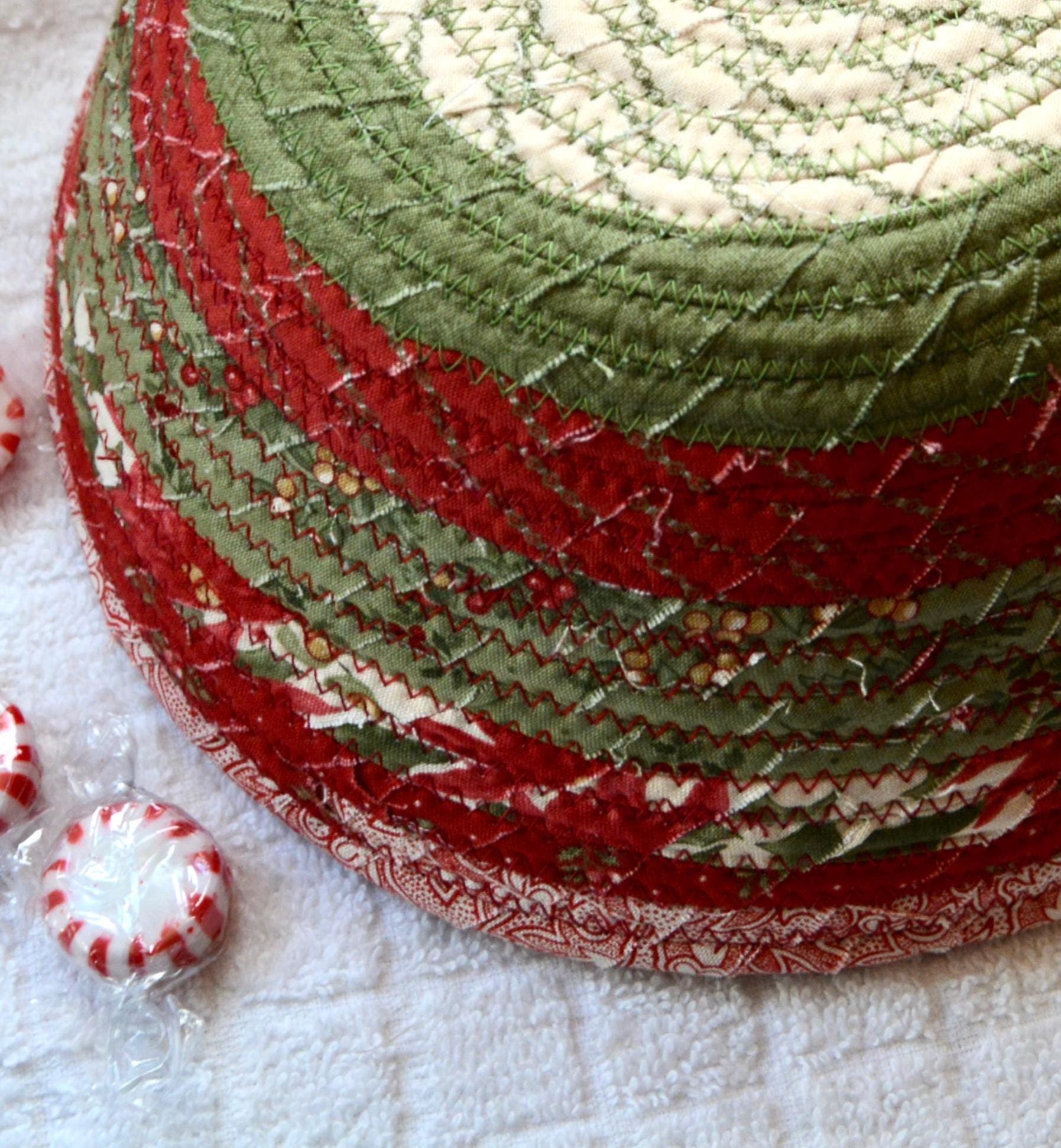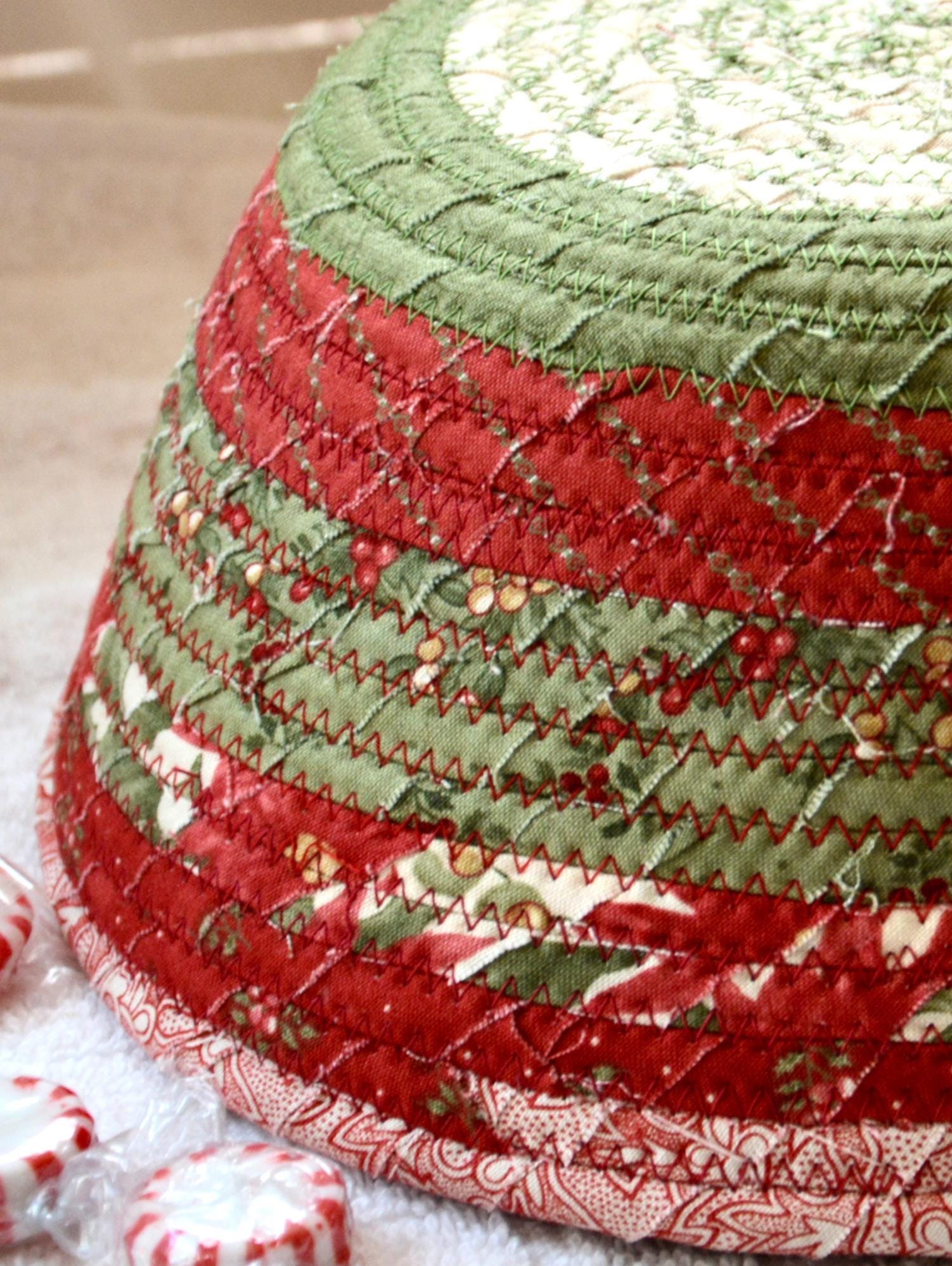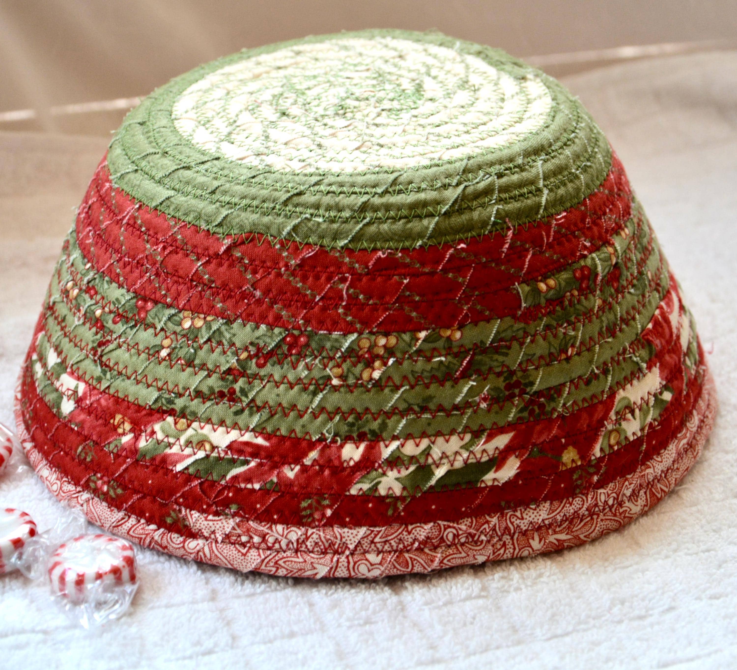 I hand wrapped these high quality MODA Christmas fabrics around cotton line, which I then hand coiled and machine quilted to make it sturdy. I used the raw edge technique with a little fray to add a wonderful shabby chic texture. I just love these pretty MODA red and green fabrics, they have pretty highlights. So festive! The pretty flower on the basket is included for a nice accent.
