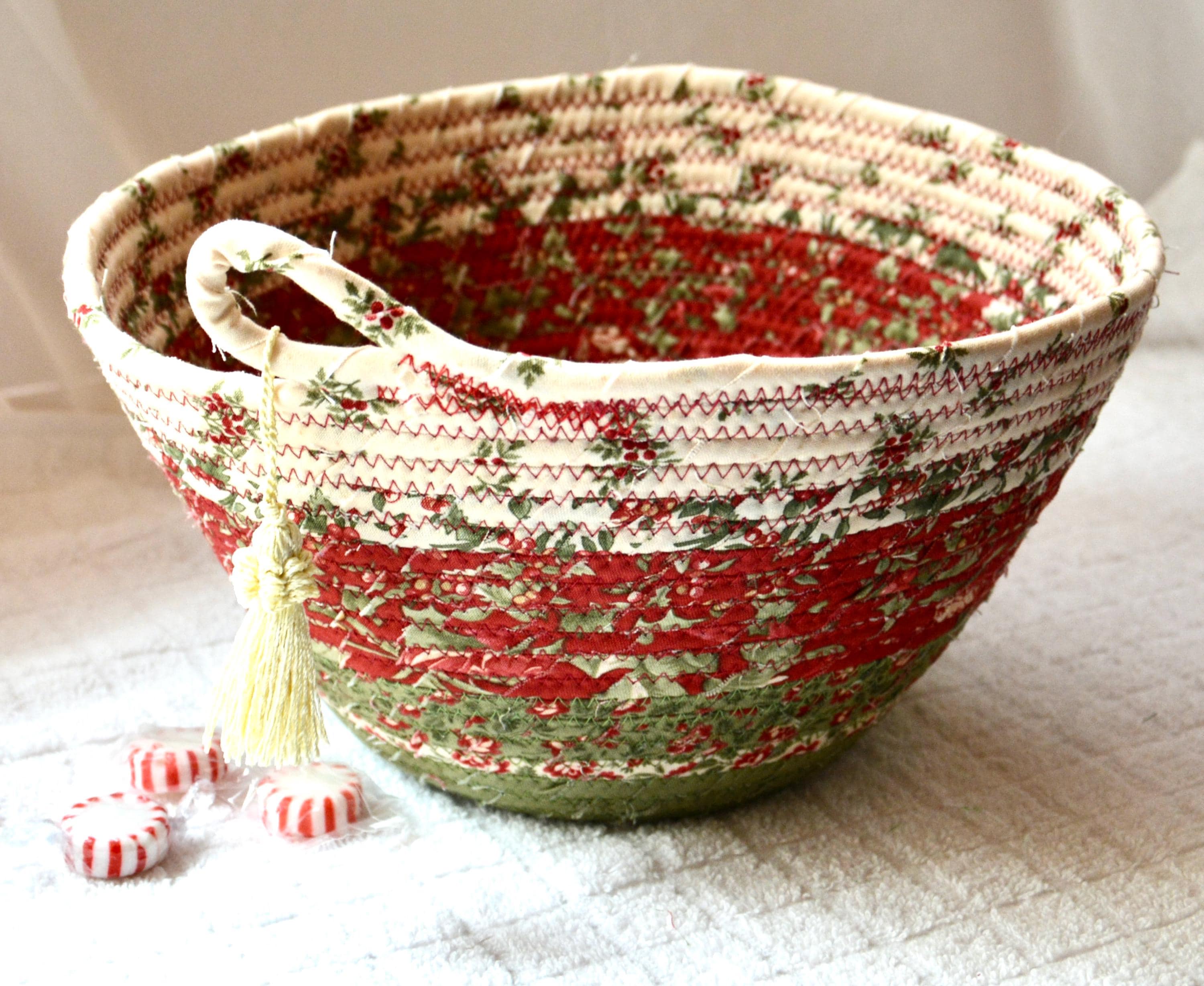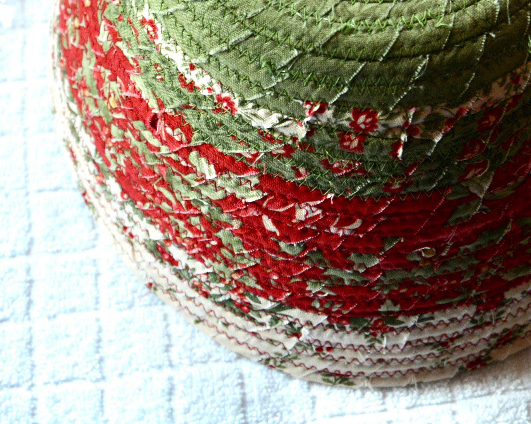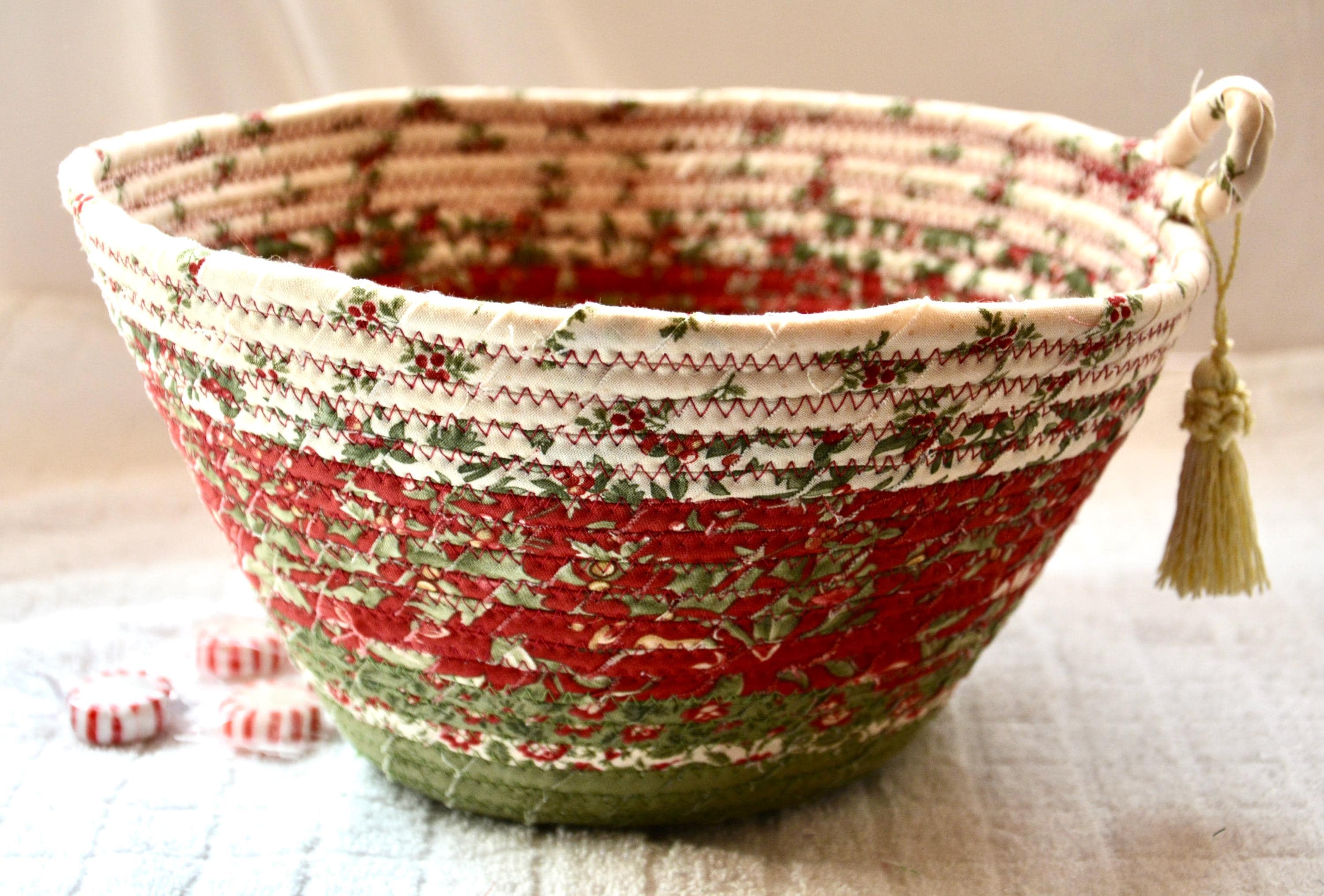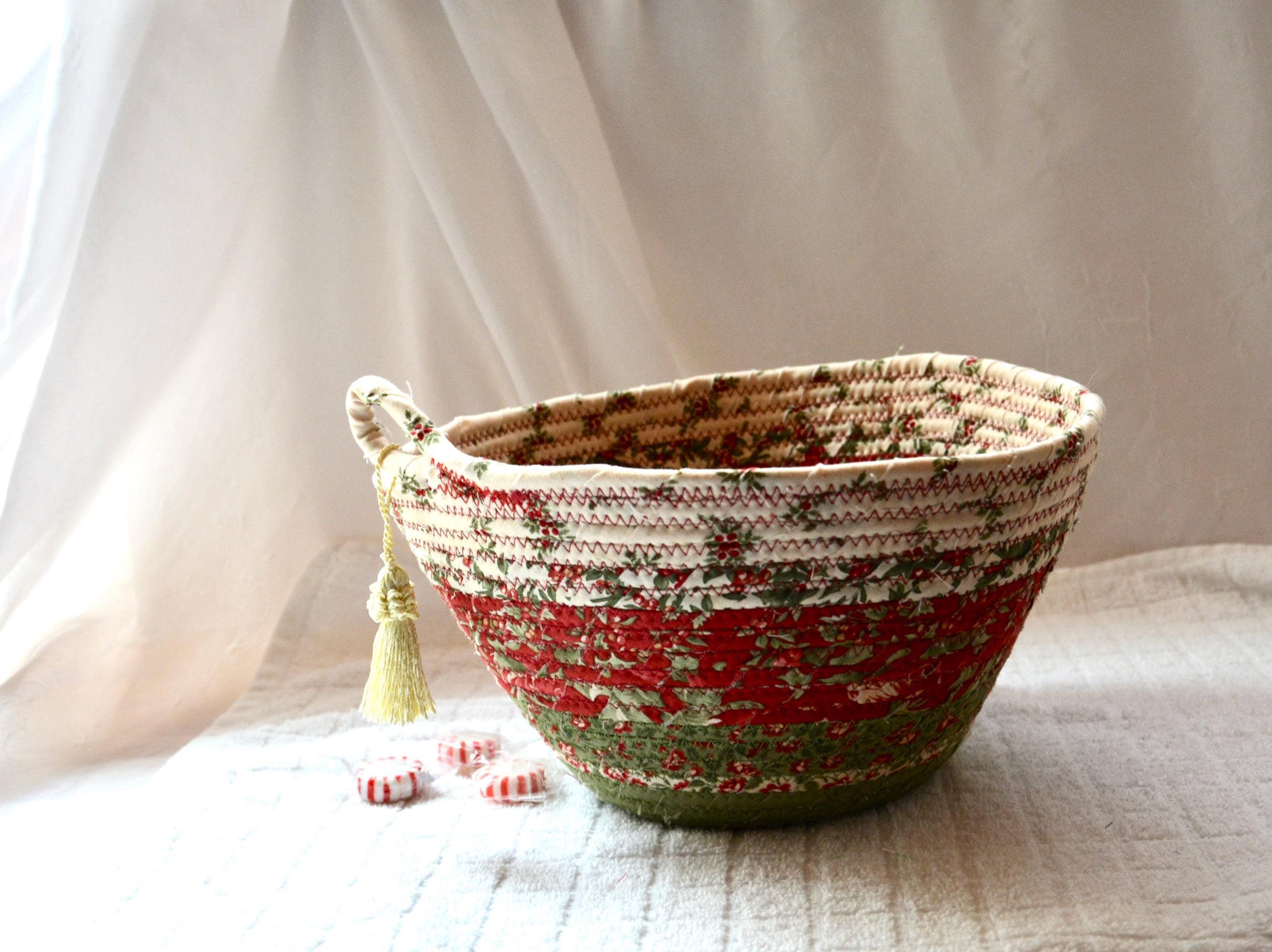 I hand wrapped these high quality MODA Christmas fabrics around cotton line, which I then hand coiled and machine quilted to make it sturdy. I used the raw edge technique with a little fray to add a wonderful shabby chic texture. I just love these pretty MODA red and green fabrics, they have pretty highlights. So festive! The pretty tassel on the basket is included for a nice accent.