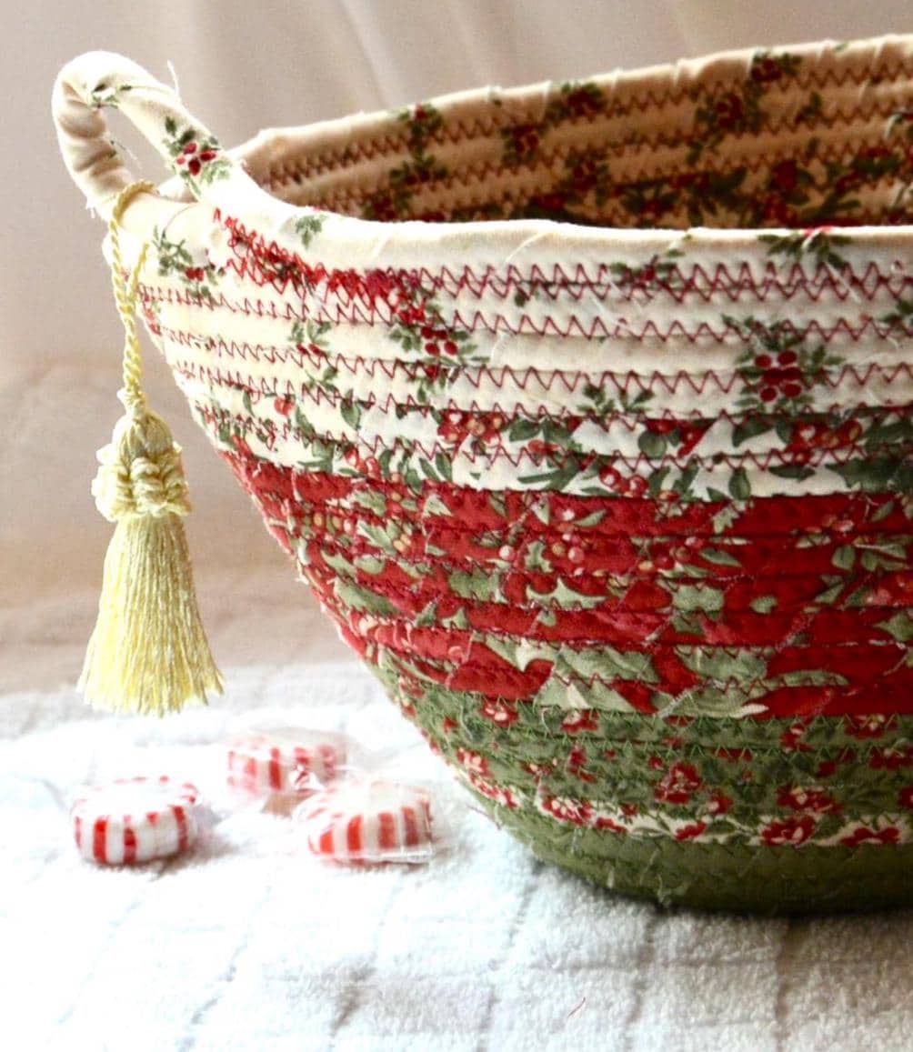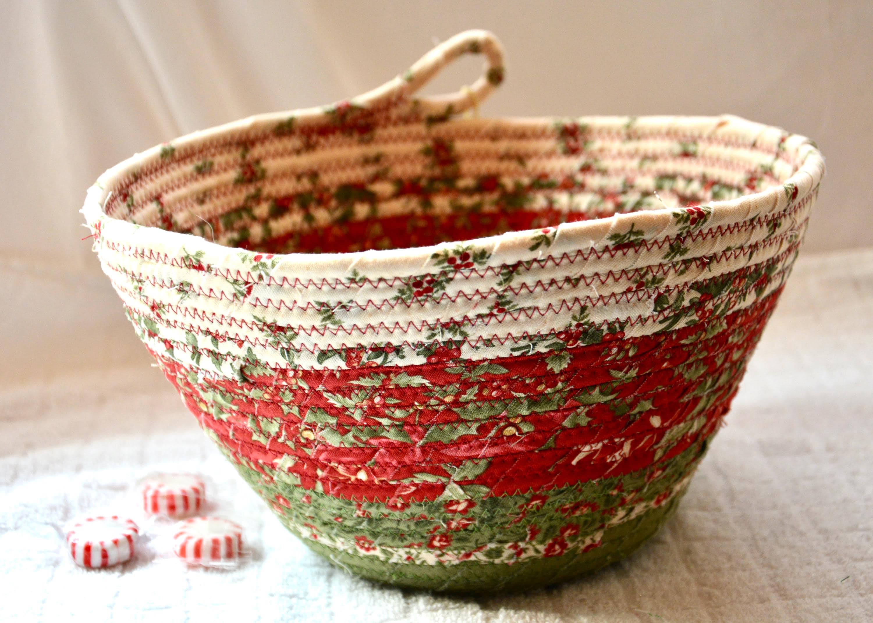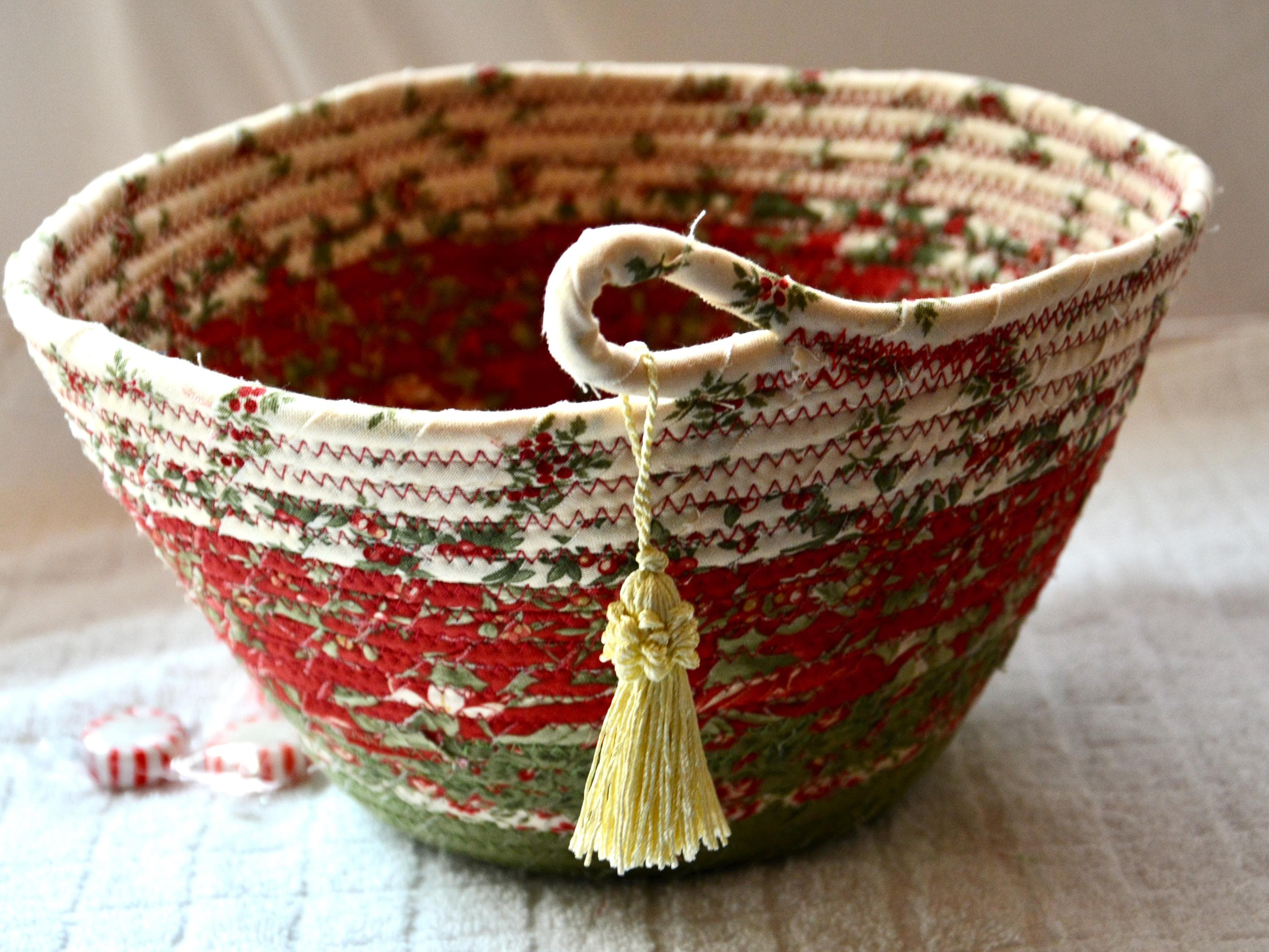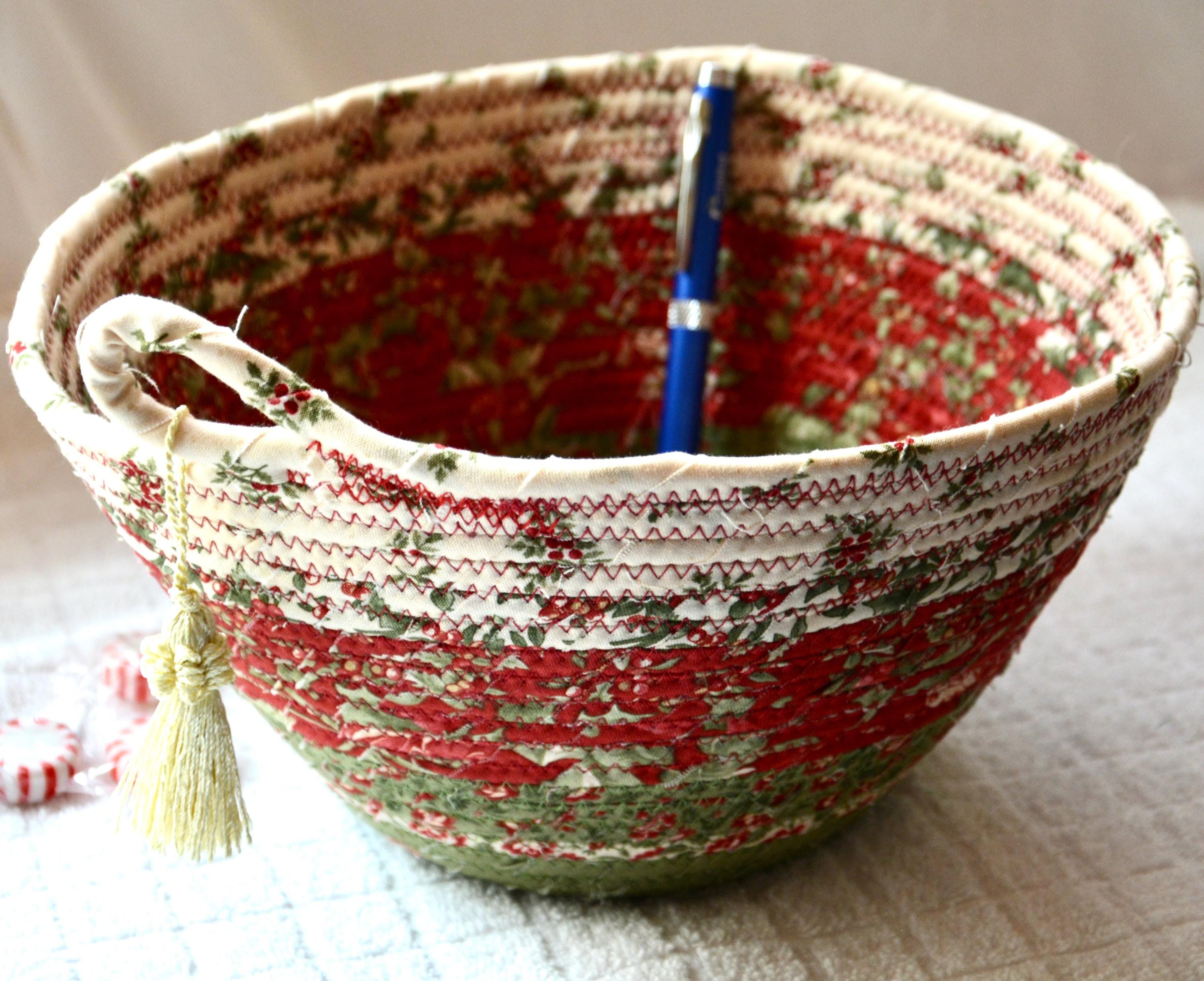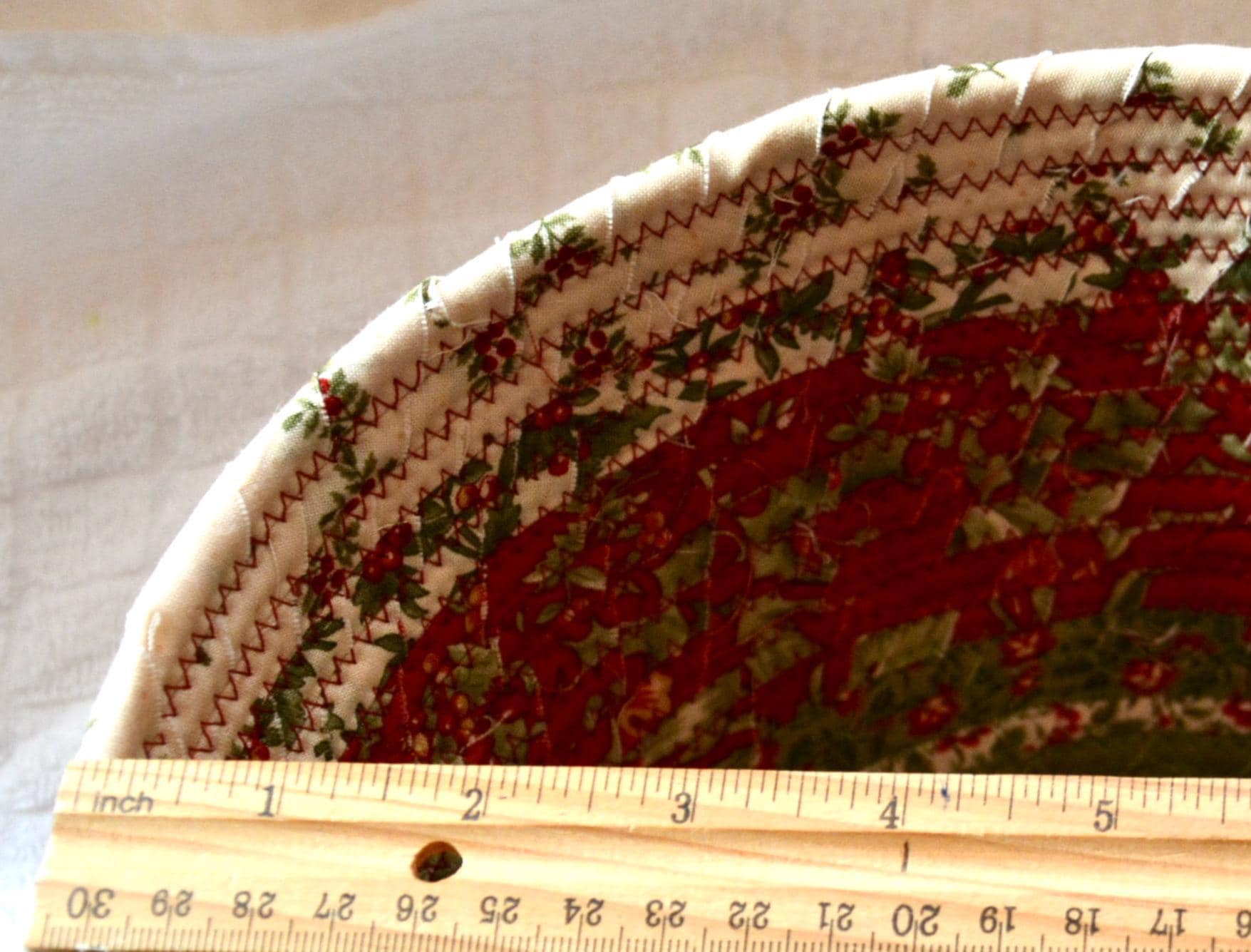 I hand wrapped these high quality MODA Christmas fabrics around cotton line, which I then hand coiled and machine quilted to make it sturdy. I used the raw edge technique with a little fray to add a wonderful shabby chic texture. I just love these pretty MODA red and green fabrics, they have pretty highlights. So festive! The pretty tassel on the basket is included for a nice accent.