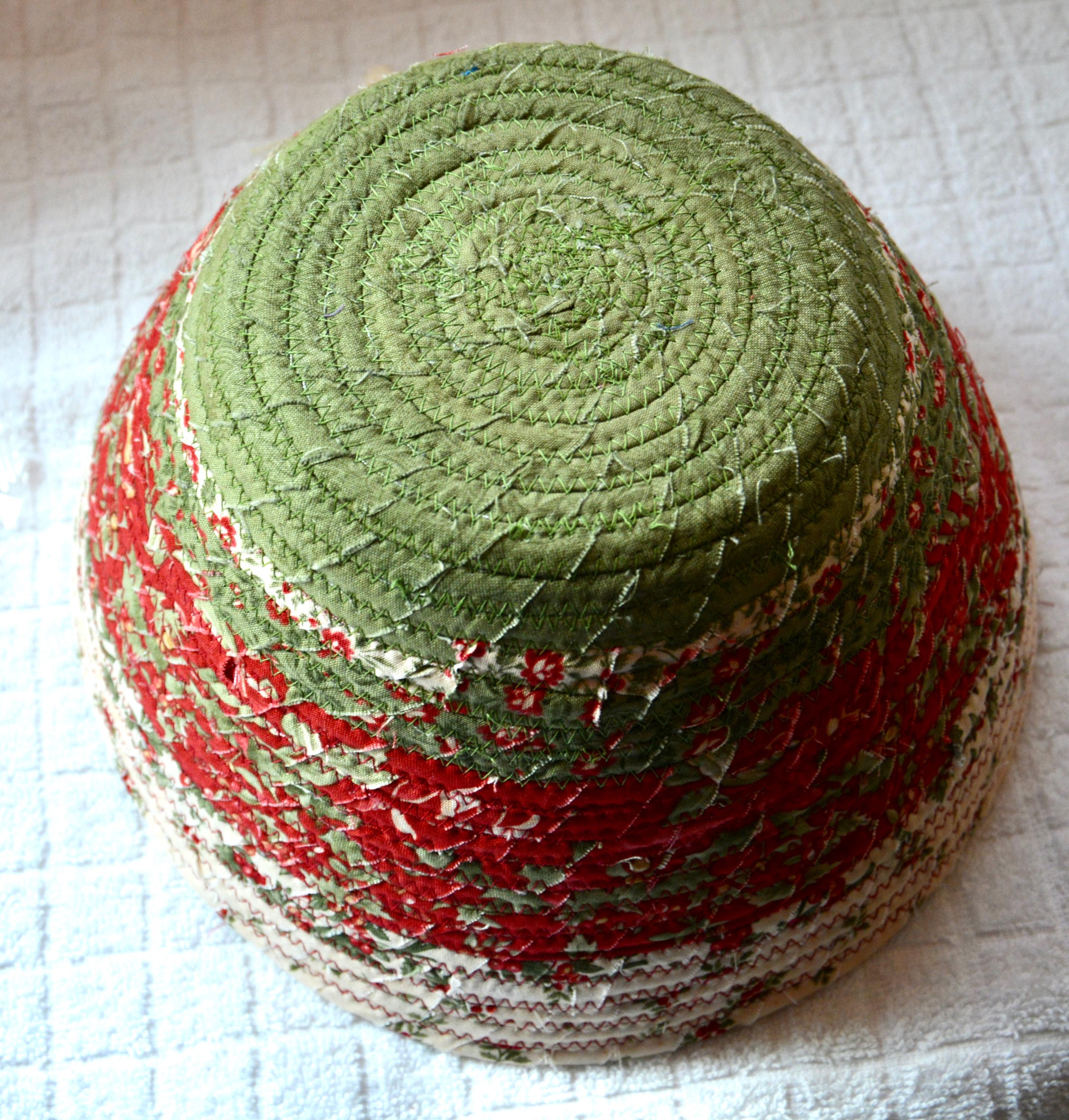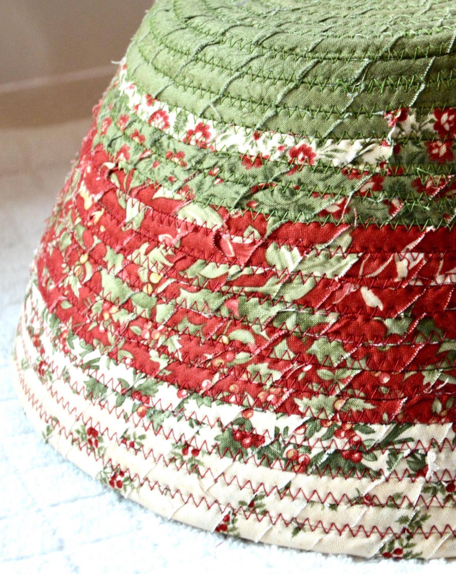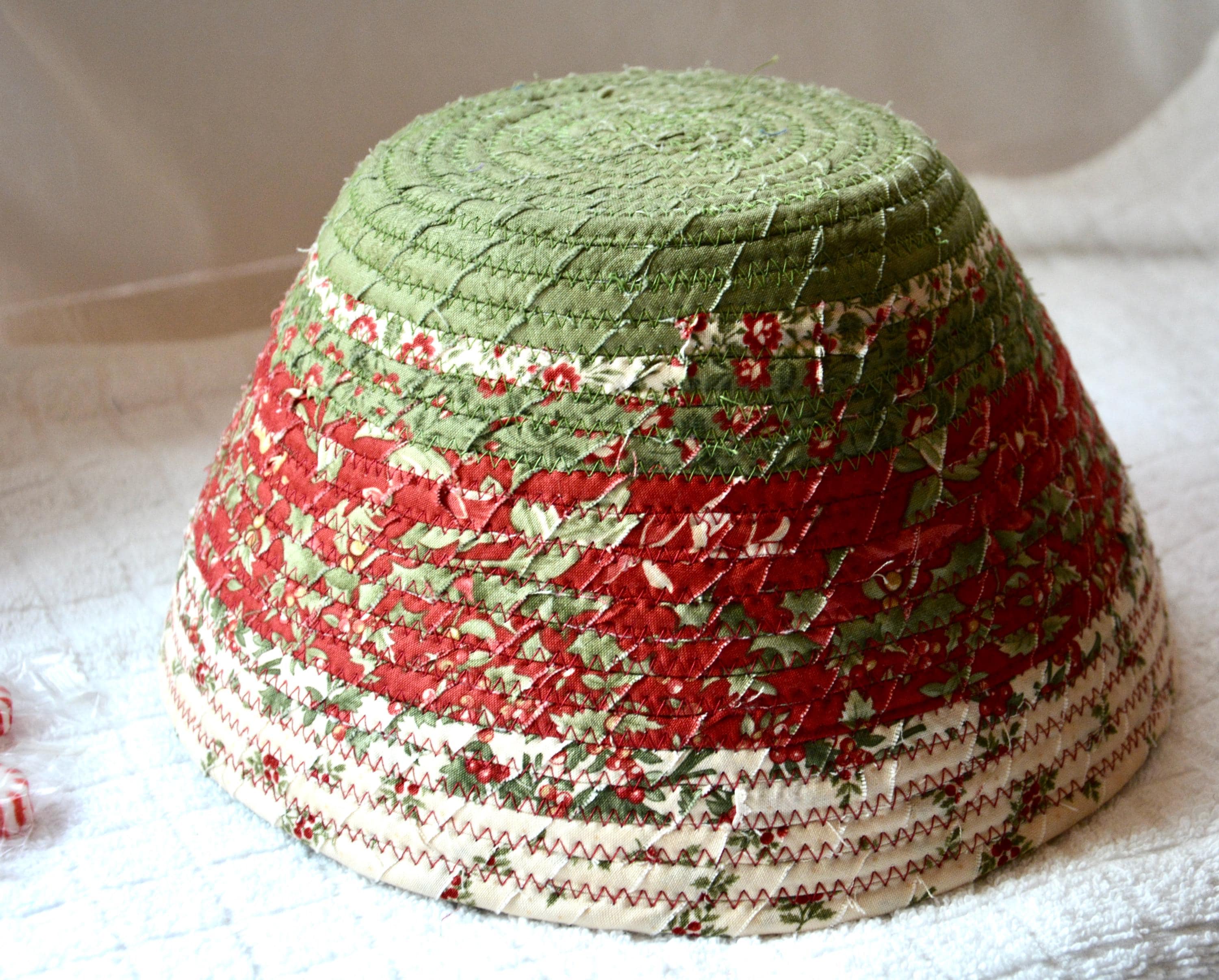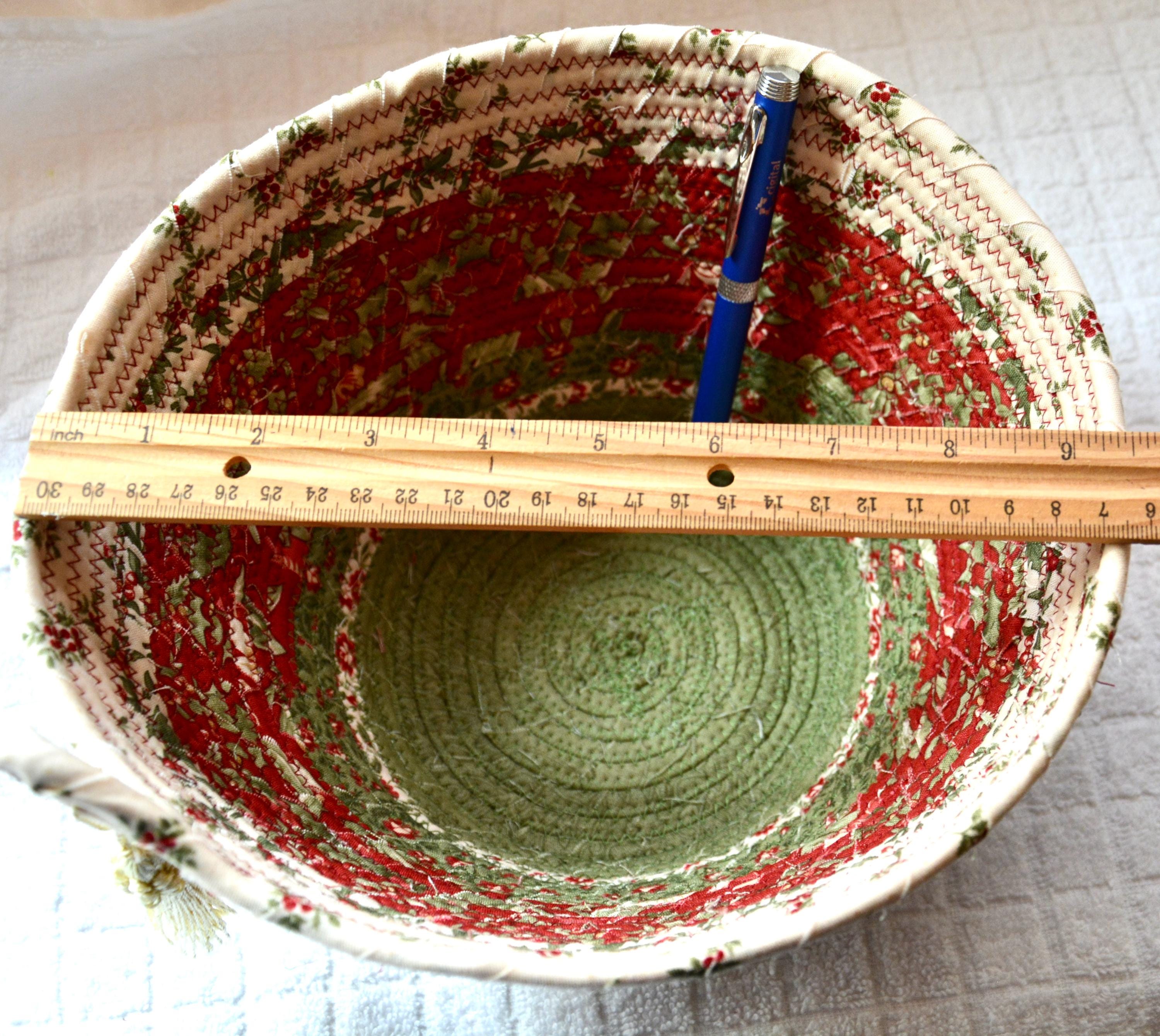 I hand wrapped these high quality MODA Christmas fabrics around cotton line, which I then hand coiled and machine quilted to make it sturdy. I used the raw edge technique with a little fray to add a wonderful shabby chic texture. I just love these pretty MODA red and green fabrics, they have pretty highlights. So festive! The pretty tassel on the basket is included for a nice accent.
