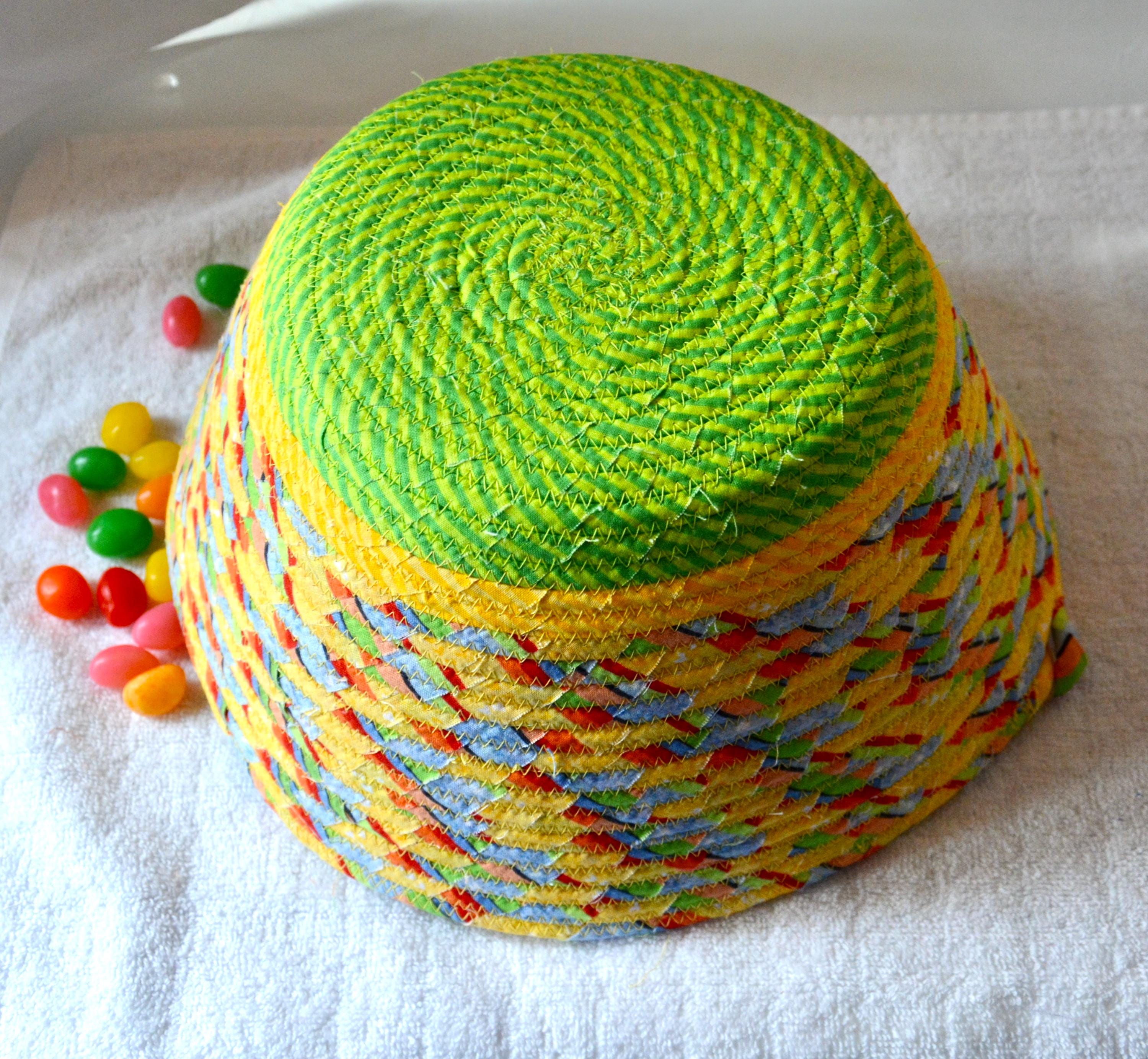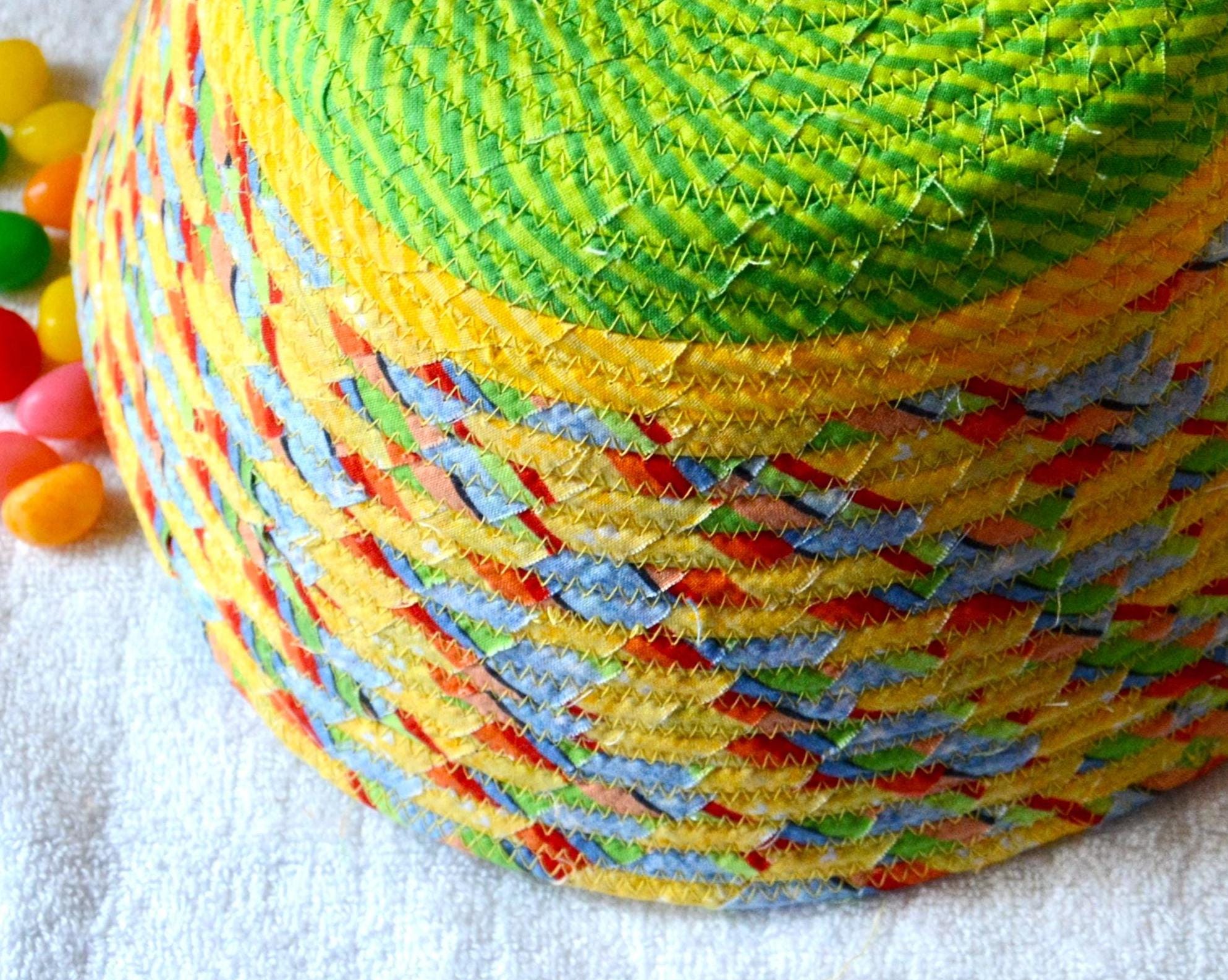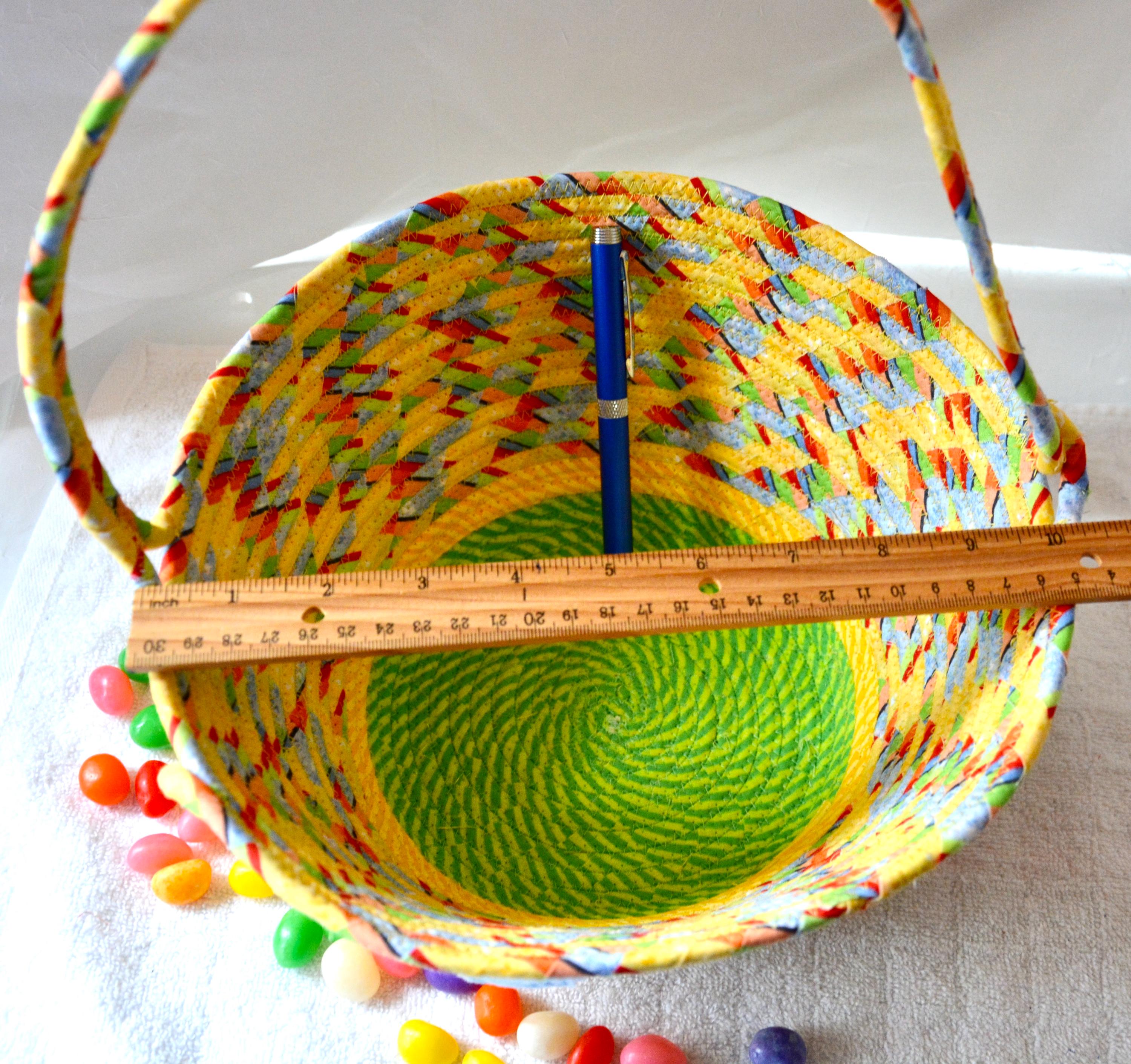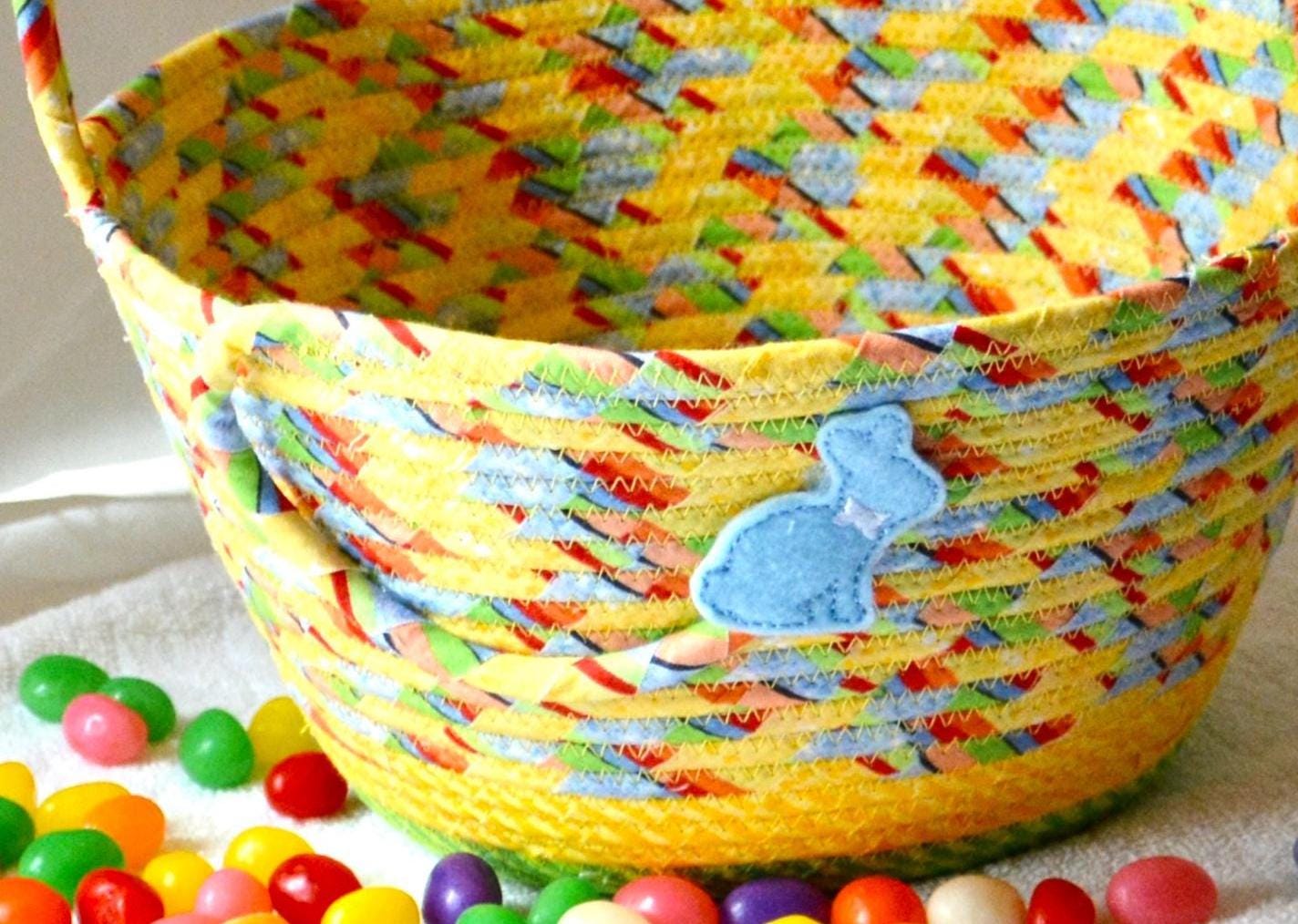 I hand wrapped this fun yellow fabric around cotton line, which I then hand coiled and machine quilted to make it sturdy. I used the raw edge technique with a little fray for a great shabby chic texture. This fun yellow fabric has great orange and yellow highlights! I added a colorful green base fabric for contrast. The cute bunny on the basket is included for a nice accent.