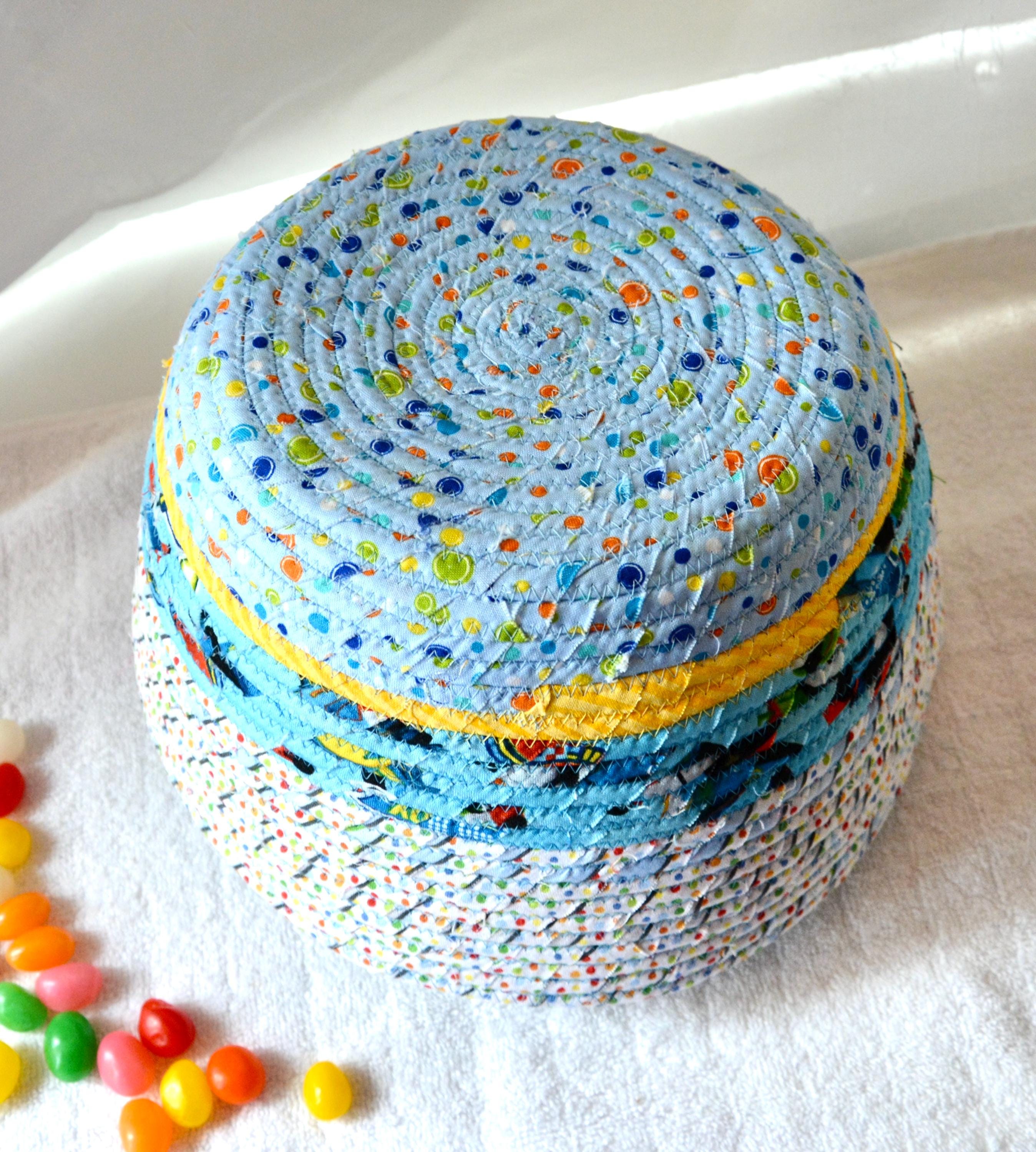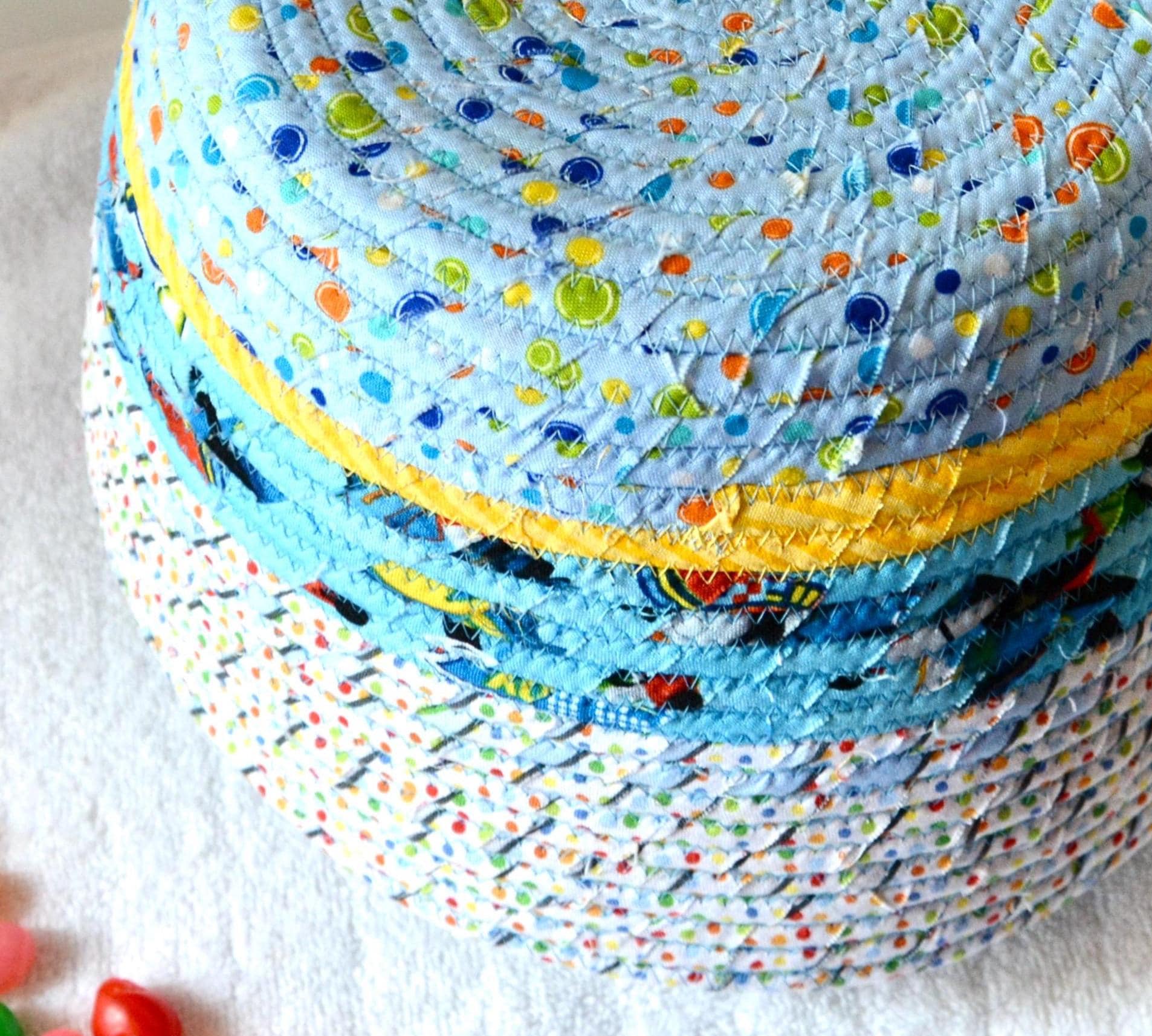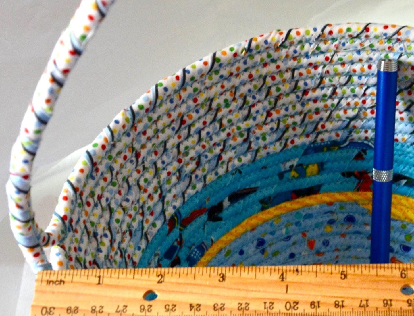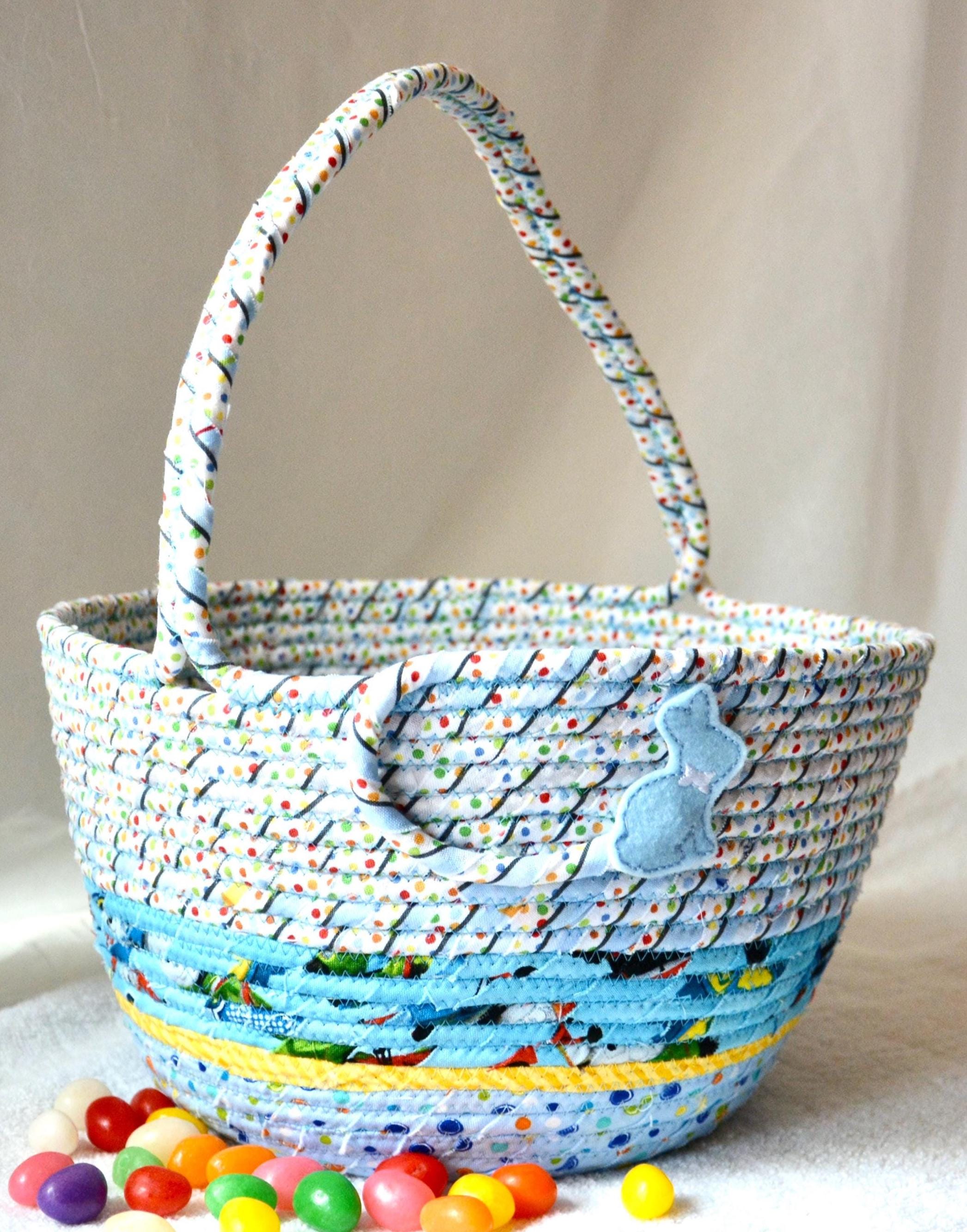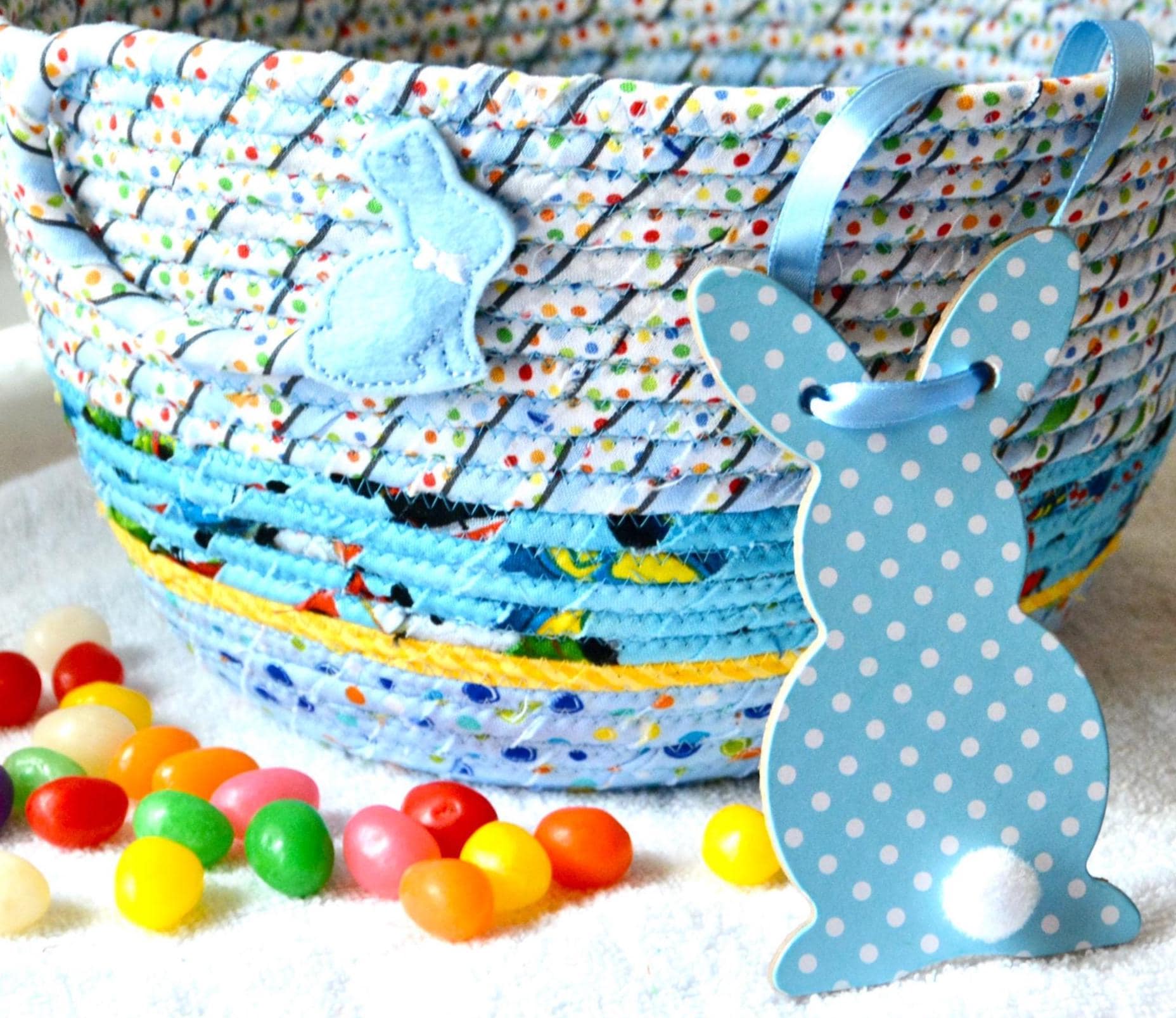 I hand wrapped these fun blue and yellow fabrics around cotton line, which I then hand coiled and machine quilted to make it sturdy. I used the raw edge technique with a little fray for a great shabby chic texture. The cute bunny on the basket is included for a nice accent.