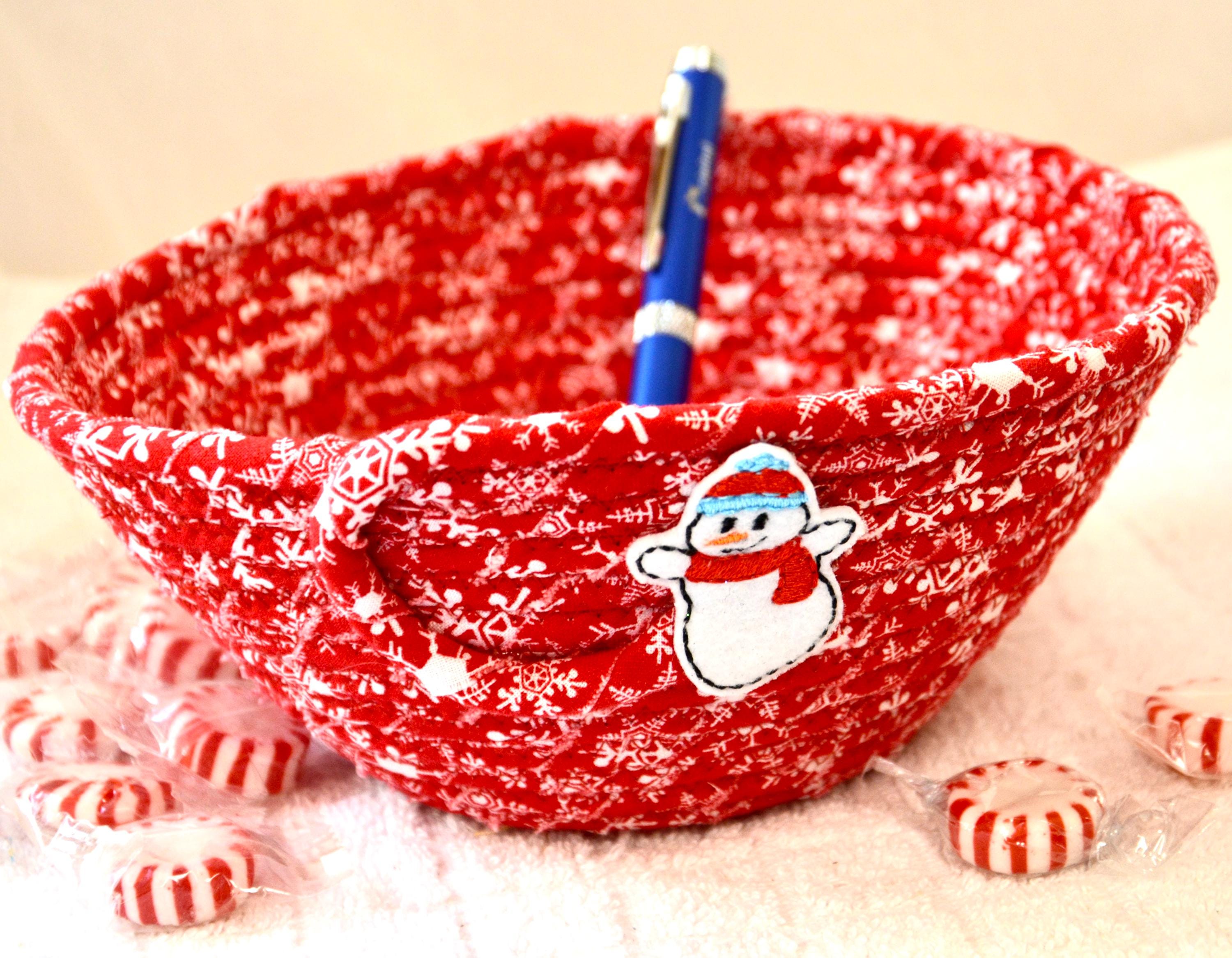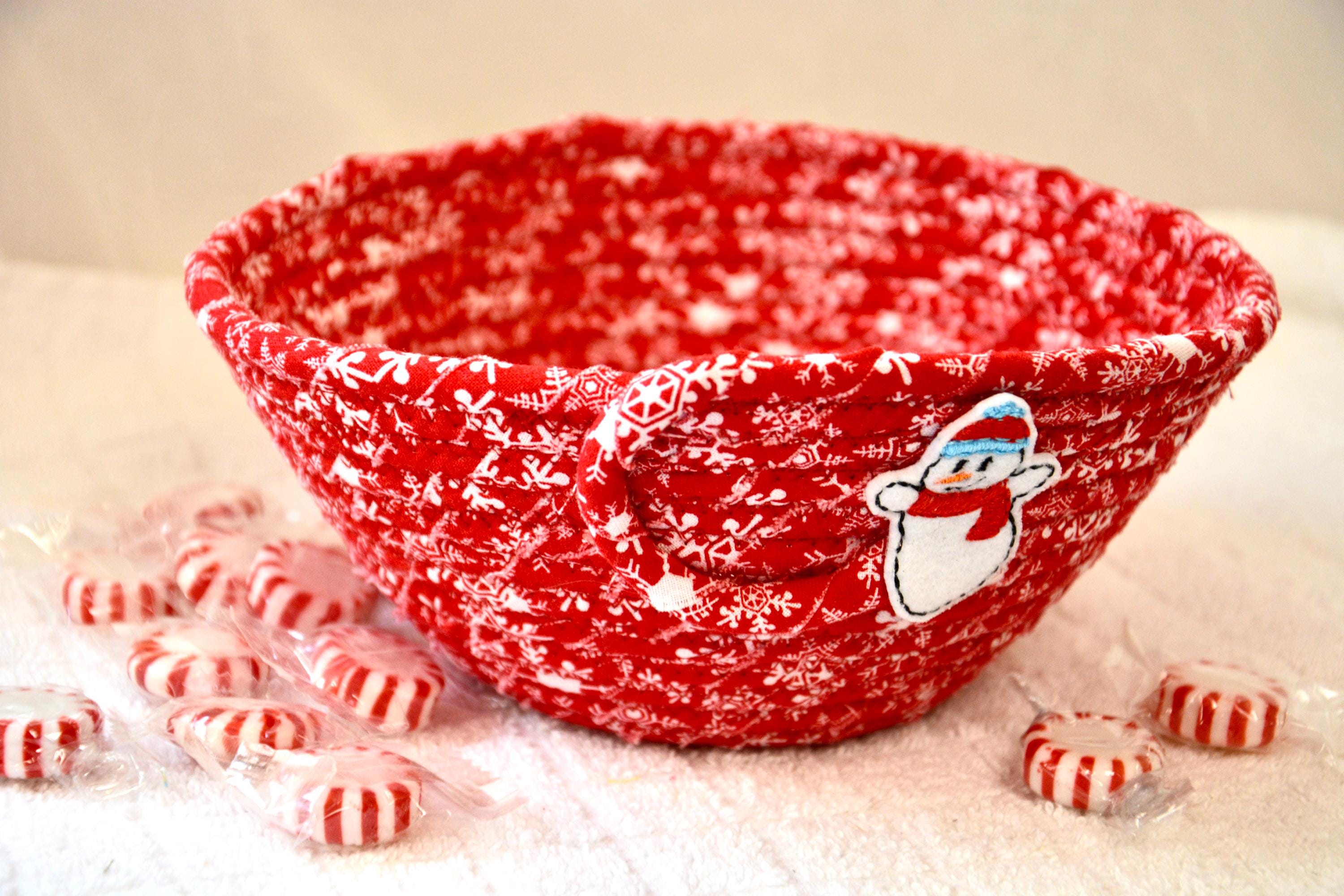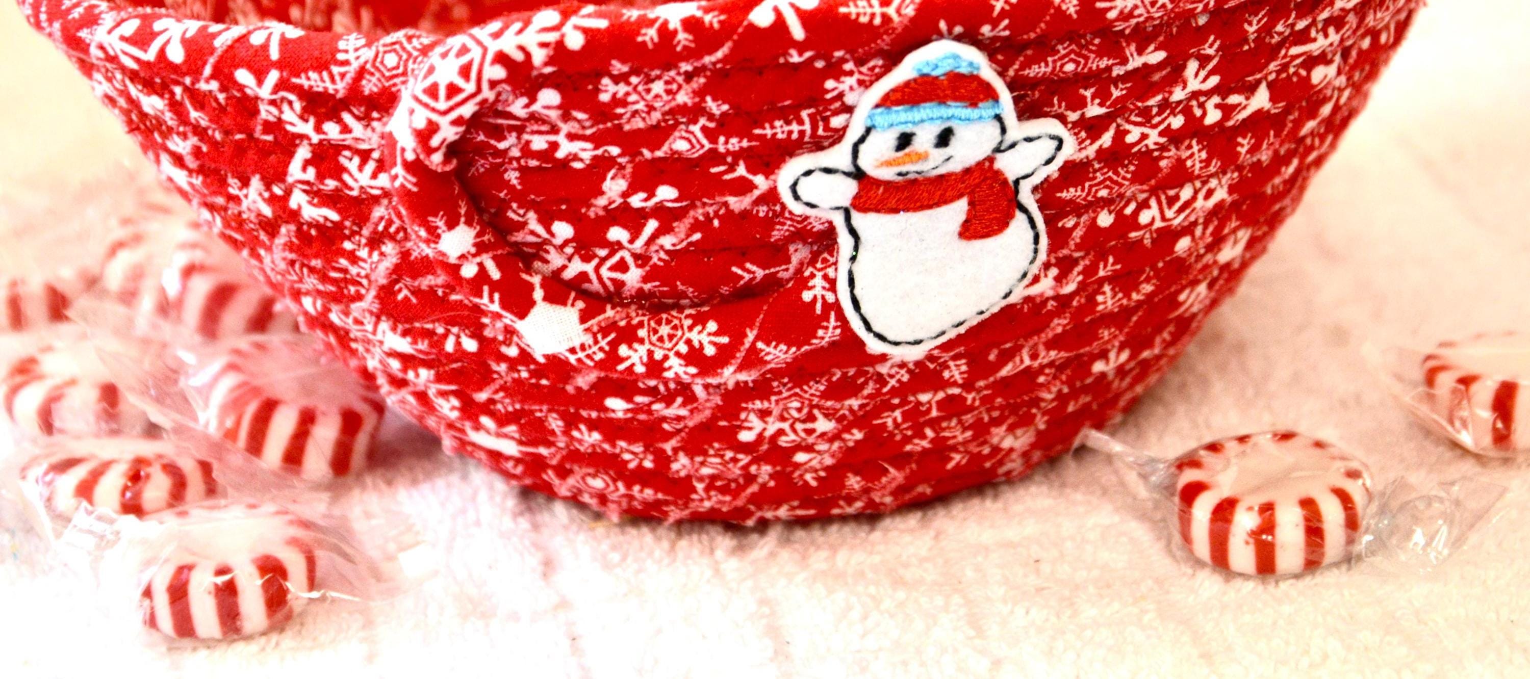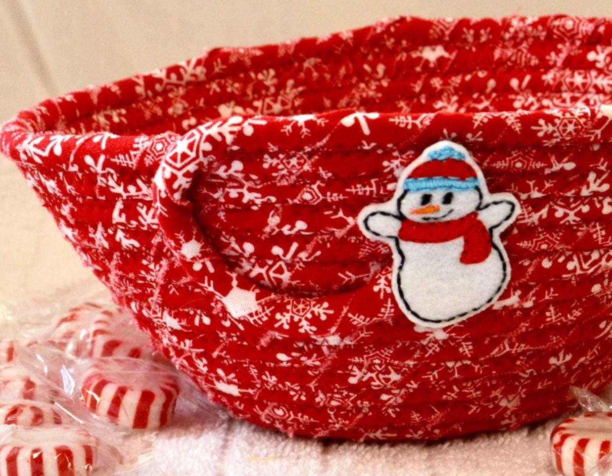 I hand wrapped this high quality fabric around cotton line, which I then hand coiled and machine quilted to make it sturdy. I used the raw edge technique with some fray to add a wonderful shabby chic texture. The cute snowman on the basket is included for a nice accent.
