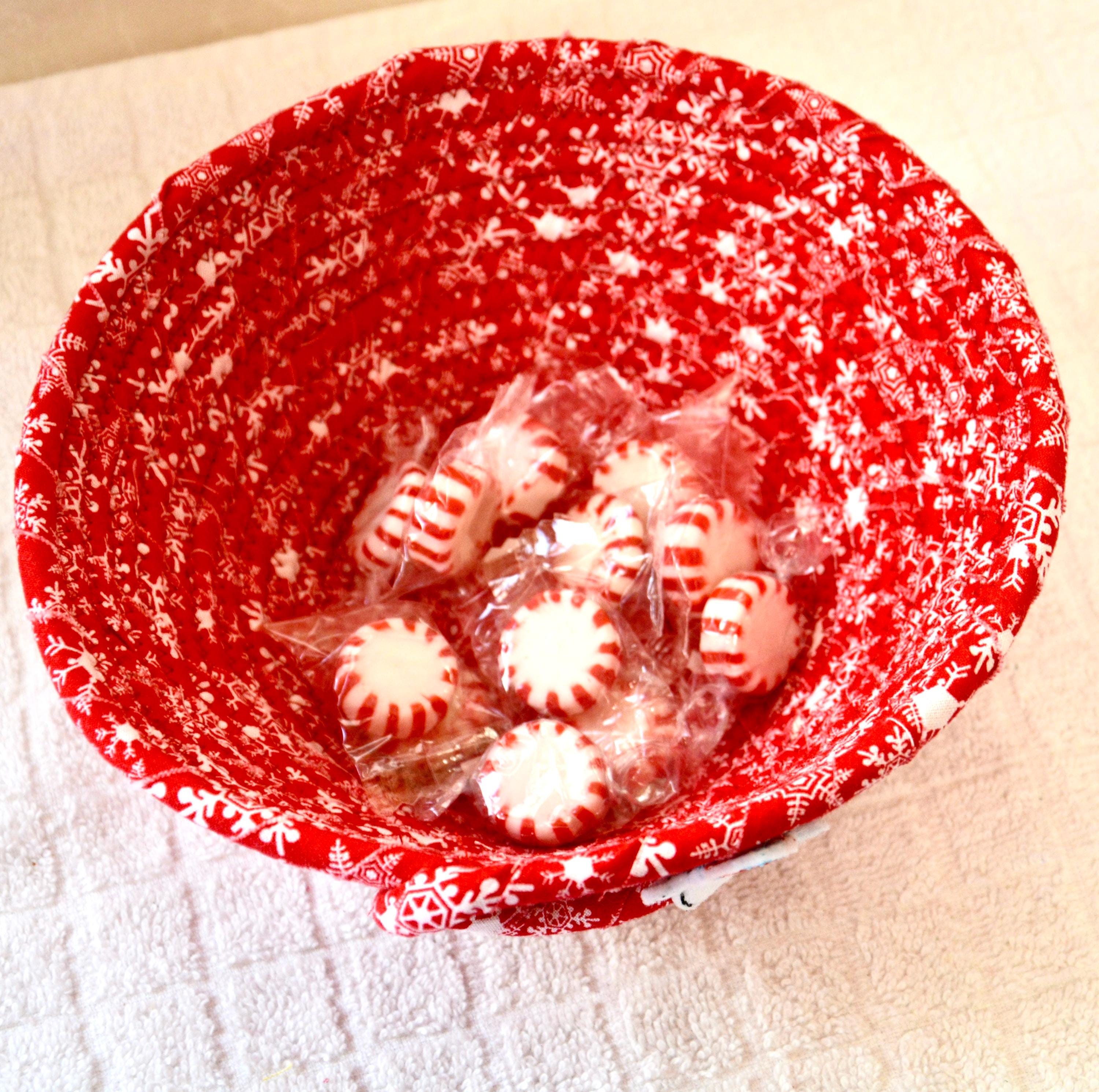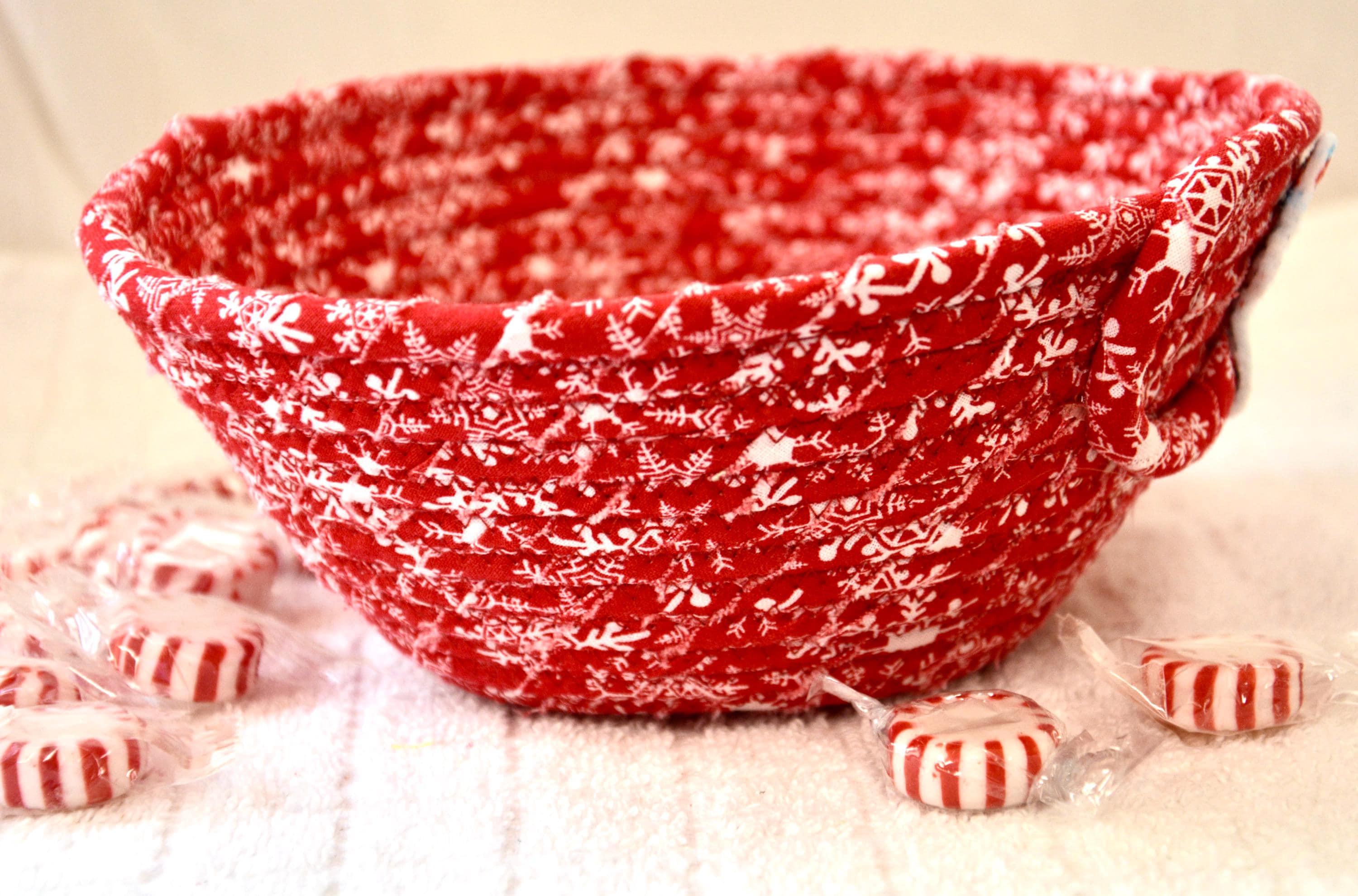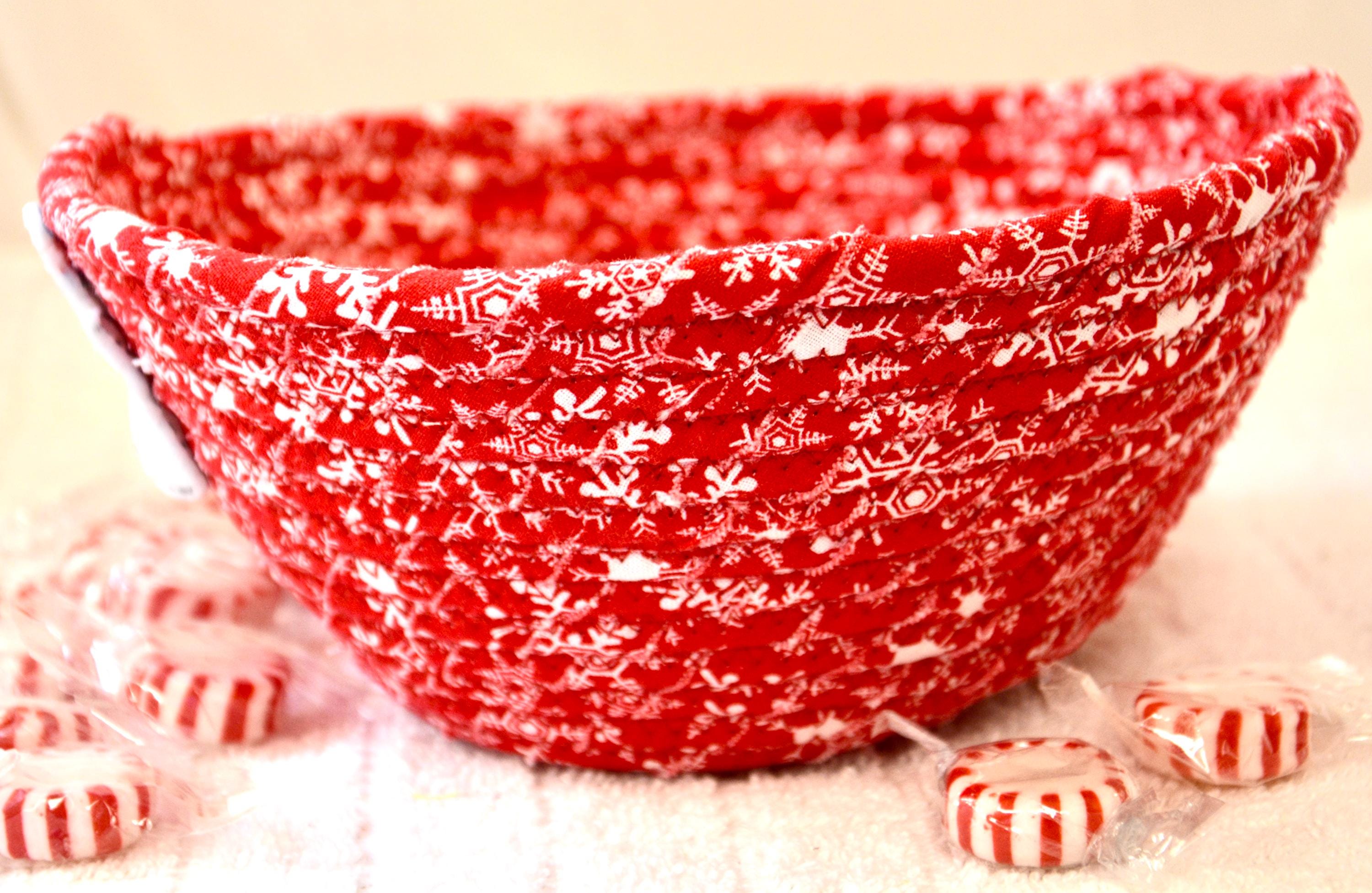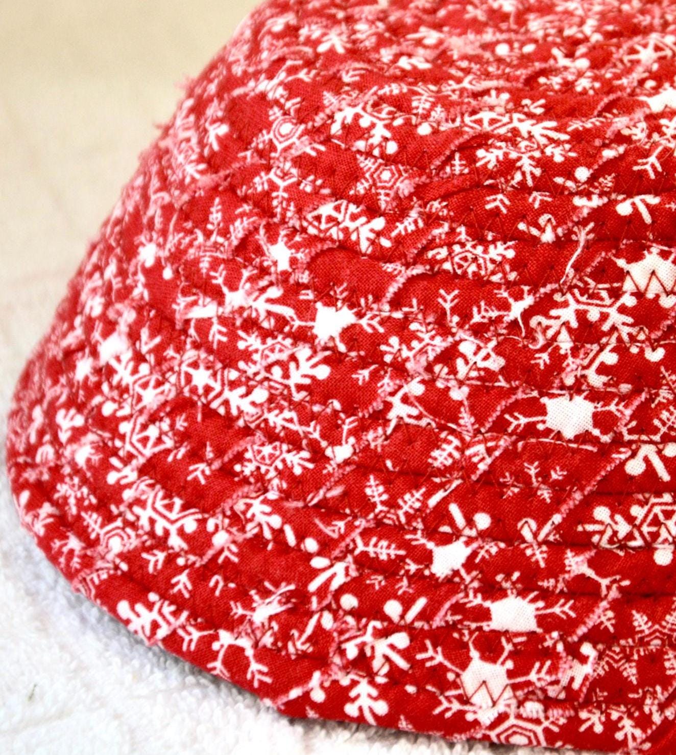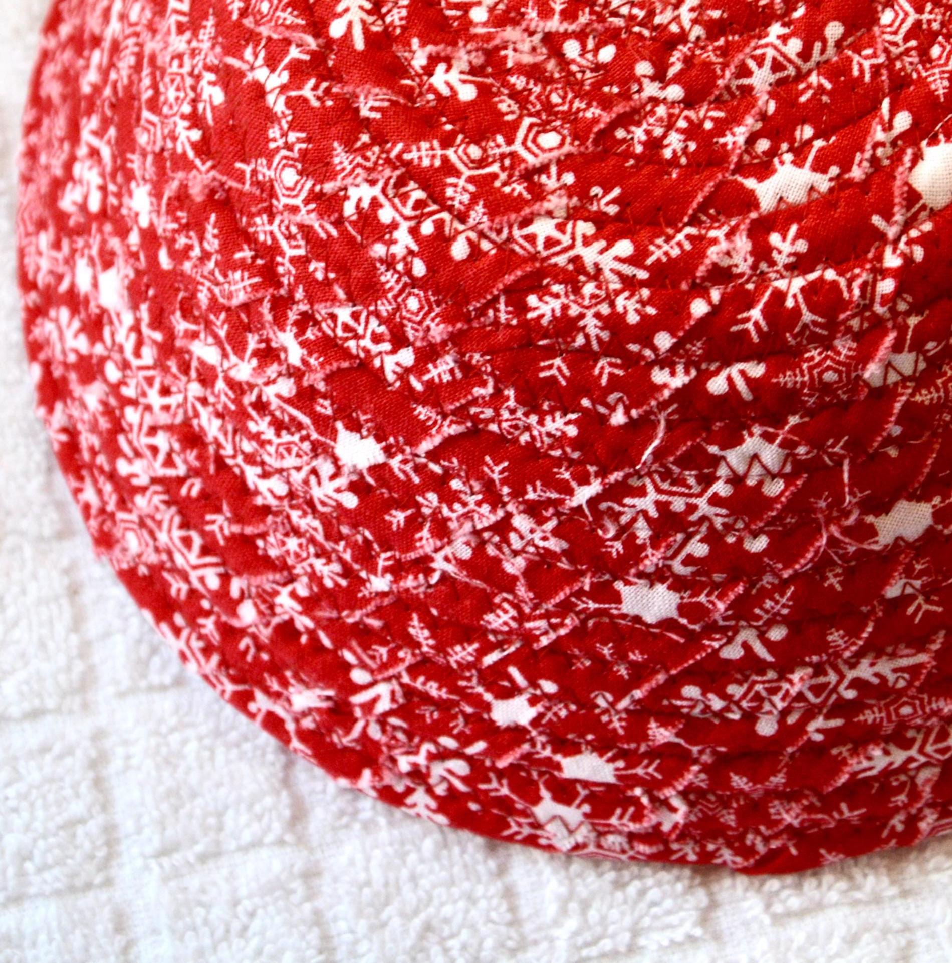 I hand wrapped this high quality fabric around cotton line, which I then hand coiled and machine quilted to make it sturdy. I used the raw edge technique with some fray to add a wonderful shabby chic texture. The cute snowman on the basket is included for a nice accent.